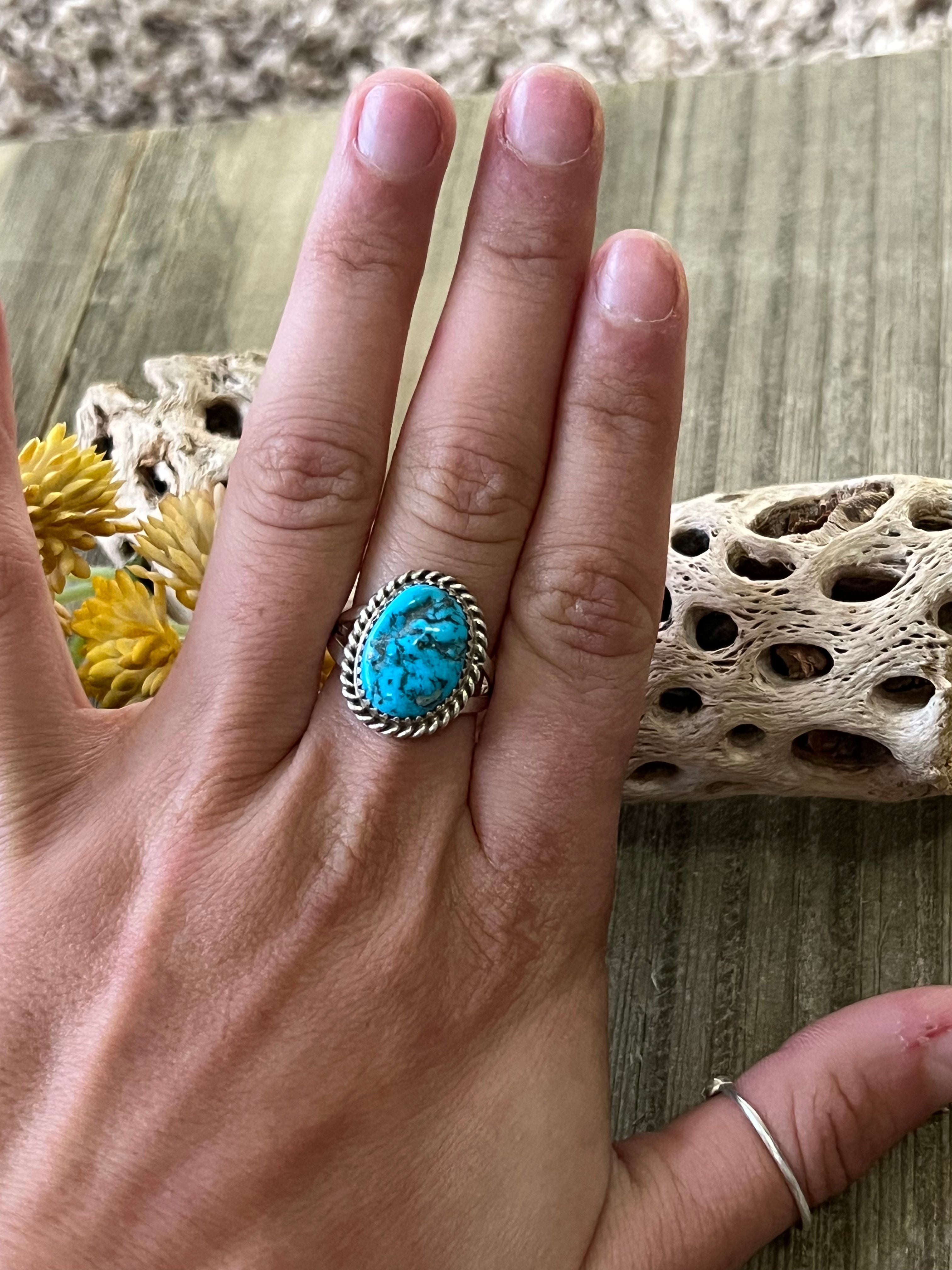 Navajo Made Kingman Turquoise & Sterling Silver Ring Size 8. It measures 3/4 of an inch long and 1/2 of an inch wide. Signed by artist and stamped sterling silver.
