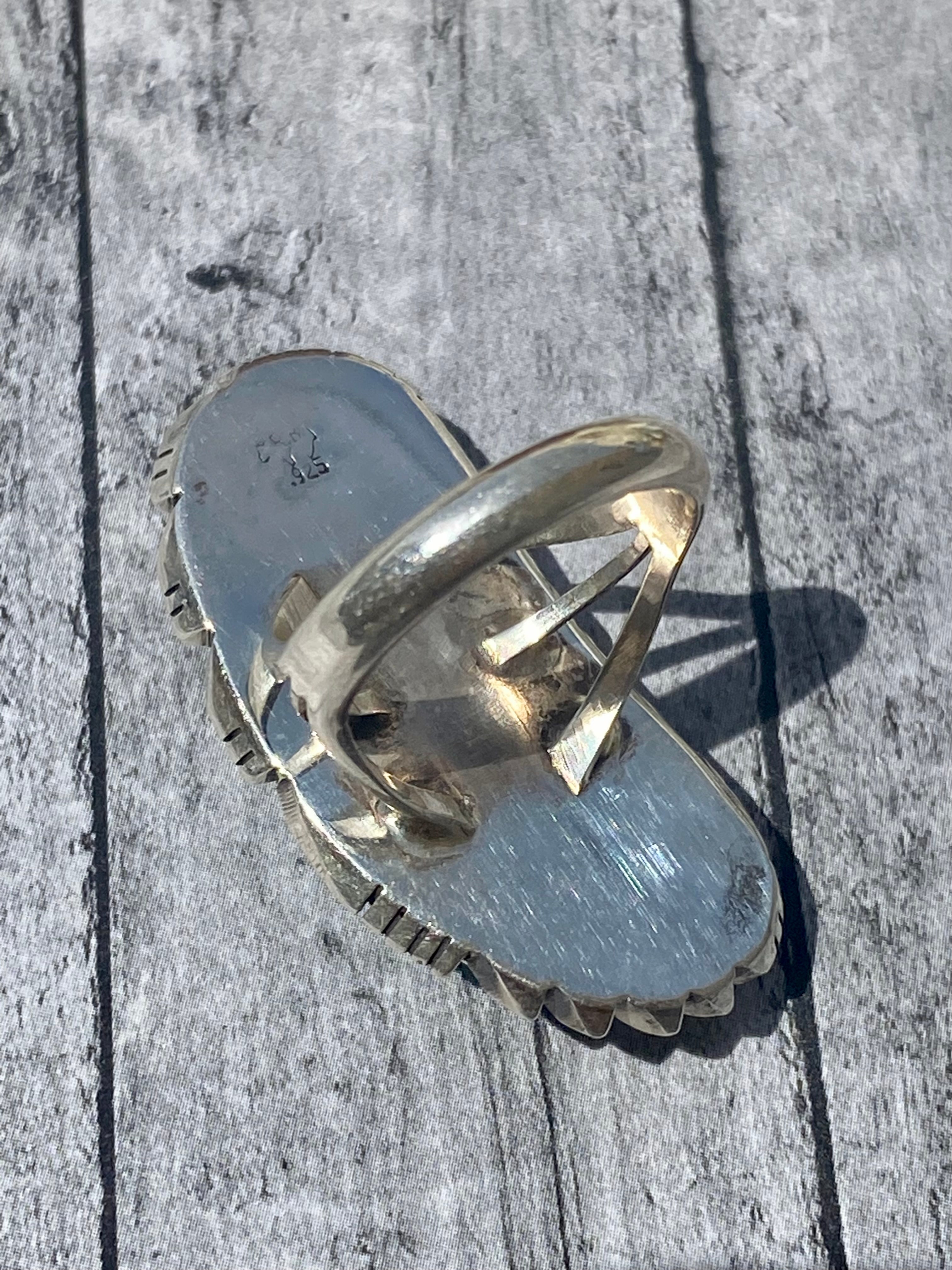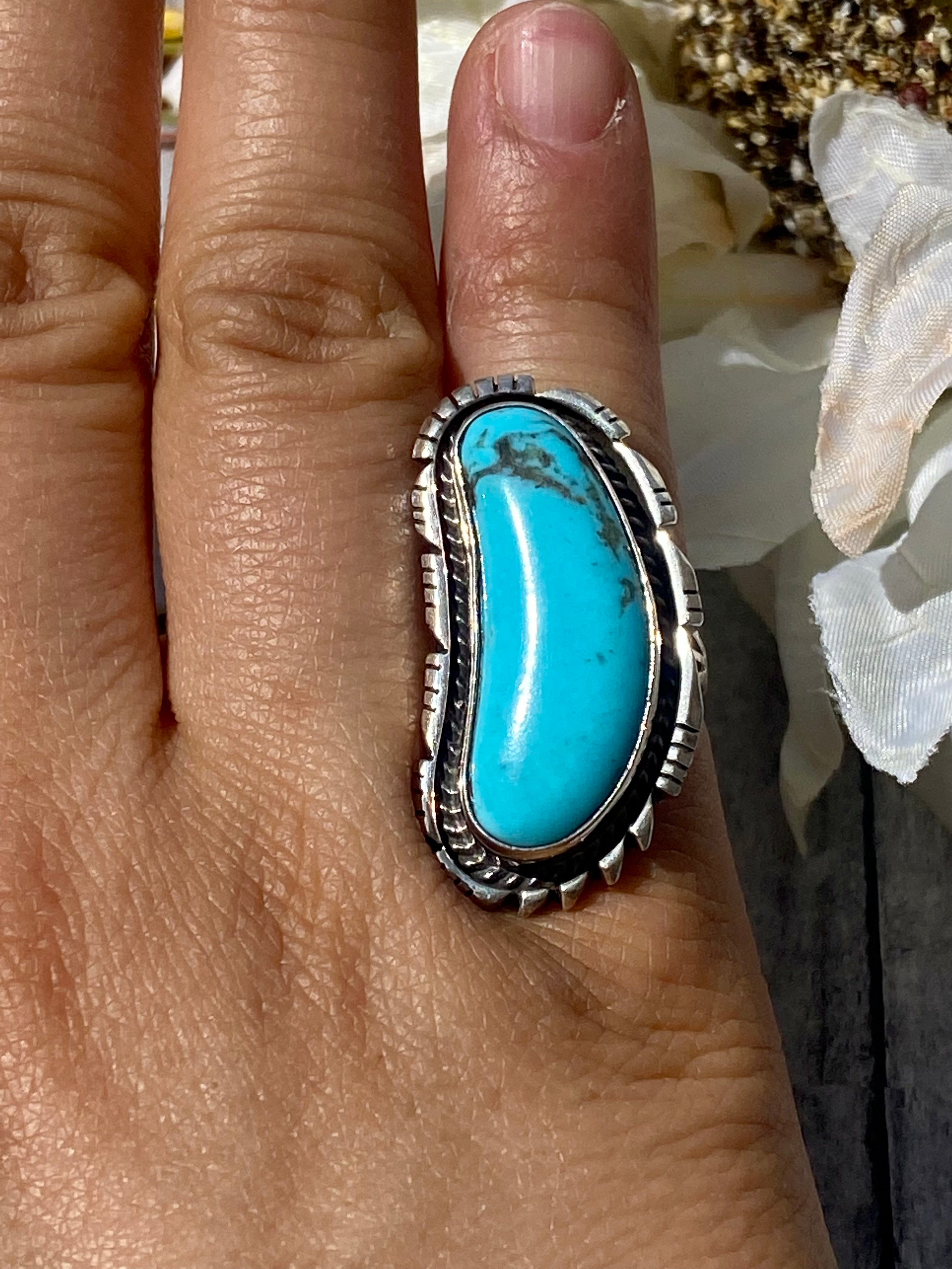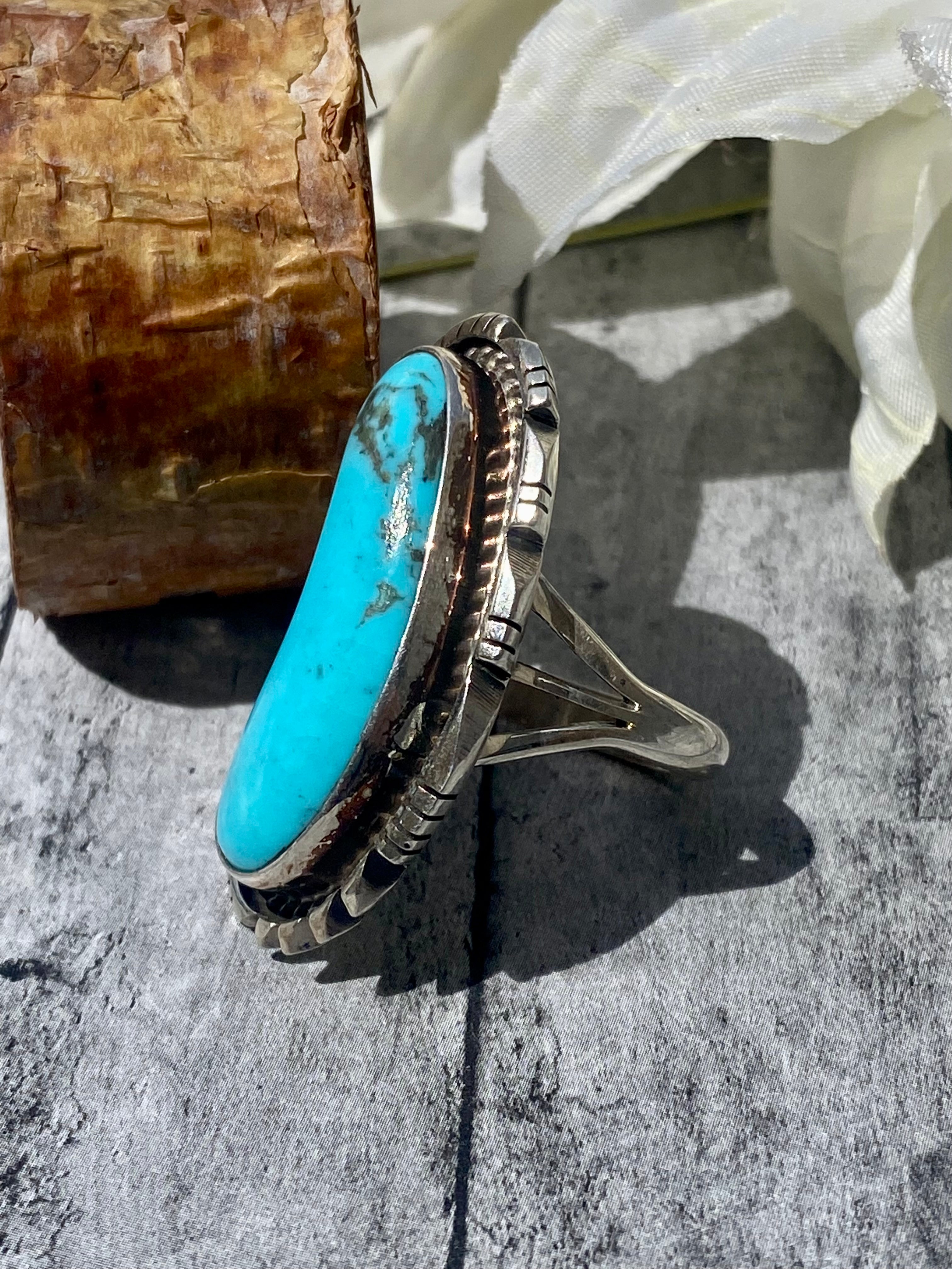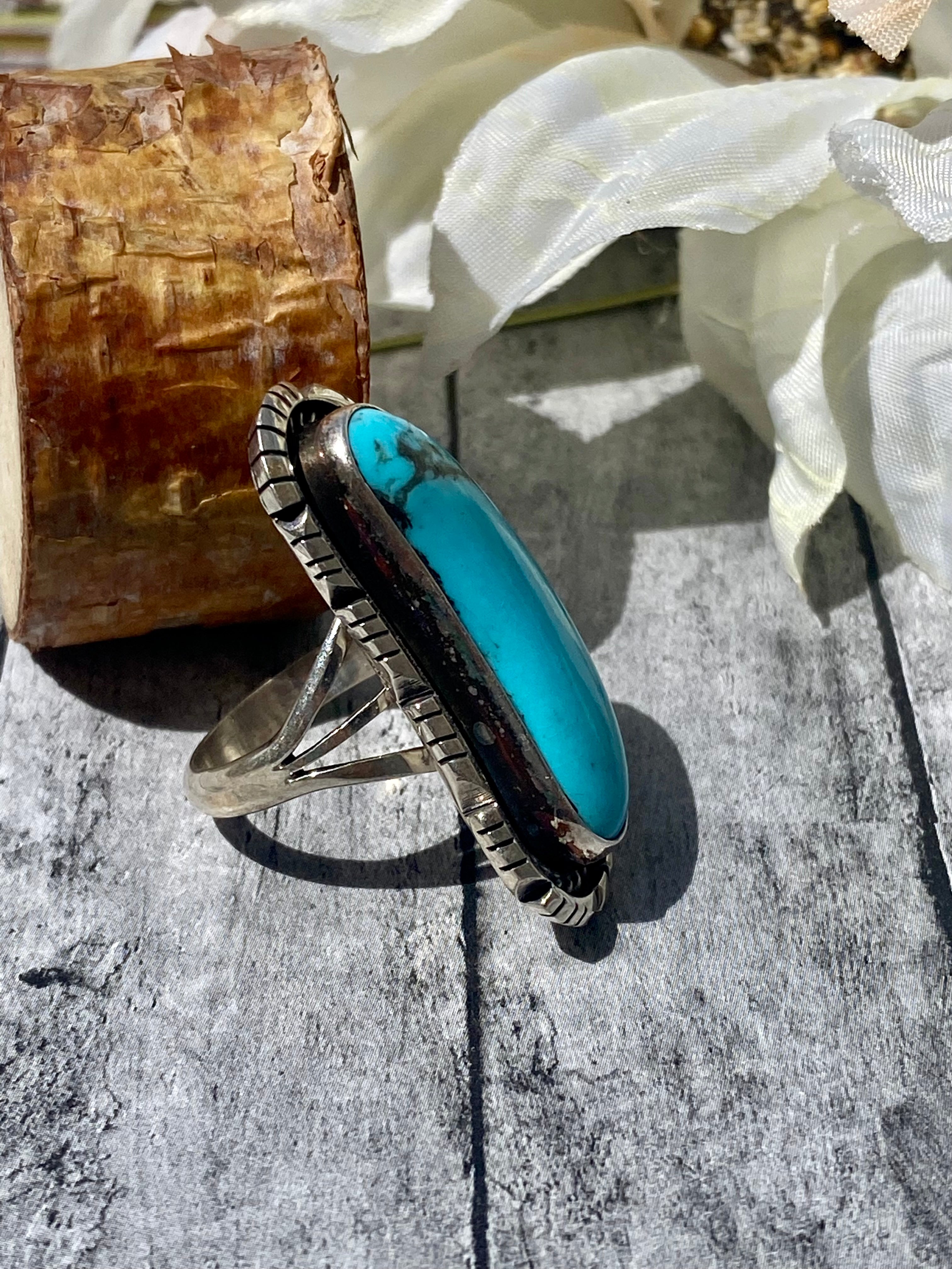 Navajo Made Kingman Turquoise & Sterling Silver Ring Size 5.75. It measures 1 3/8 inches long and just over 5/8 of an inch wide. Signed by the artist and stamped sterling silver.