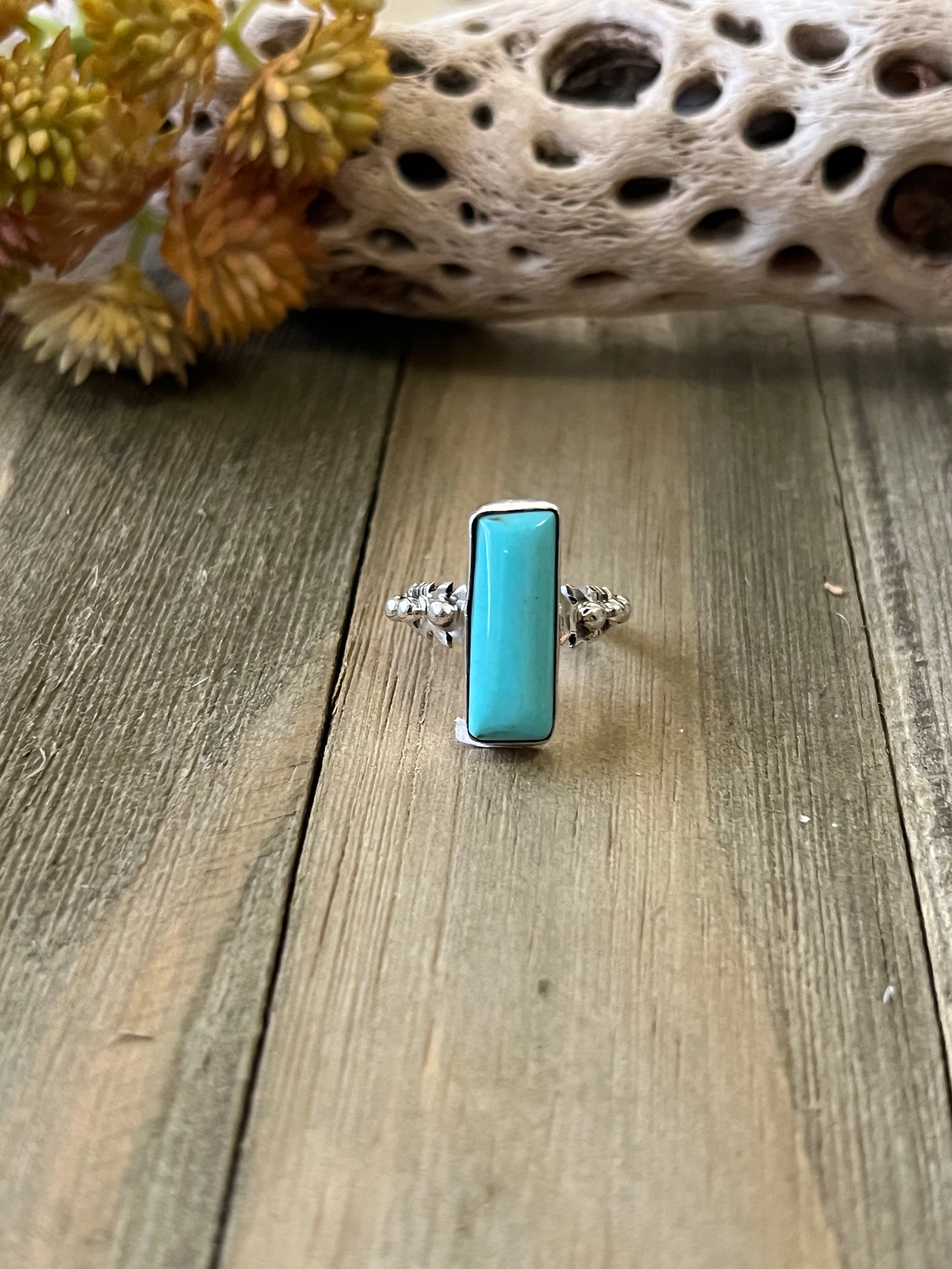 Navajo Made Kingman Turquoise & Sterling Silver Ring Size 5.75. It measures just over 3/4 of an inch long and just over 1/4 of an inch wide. Signed by artist and stamped sterling silver.
