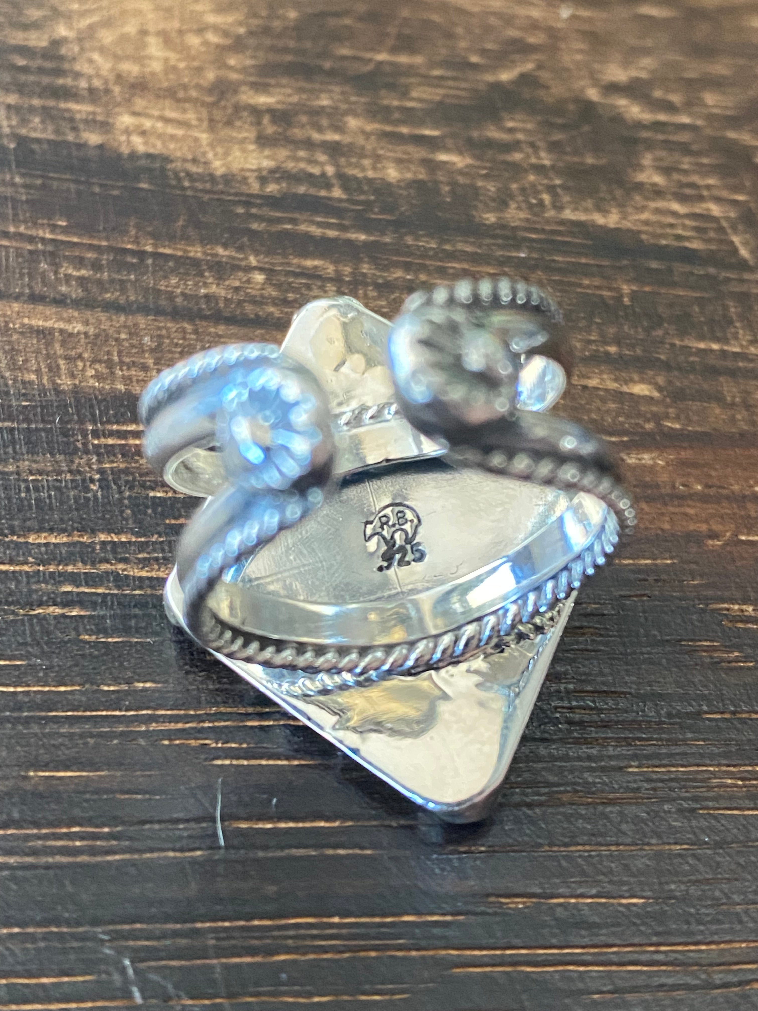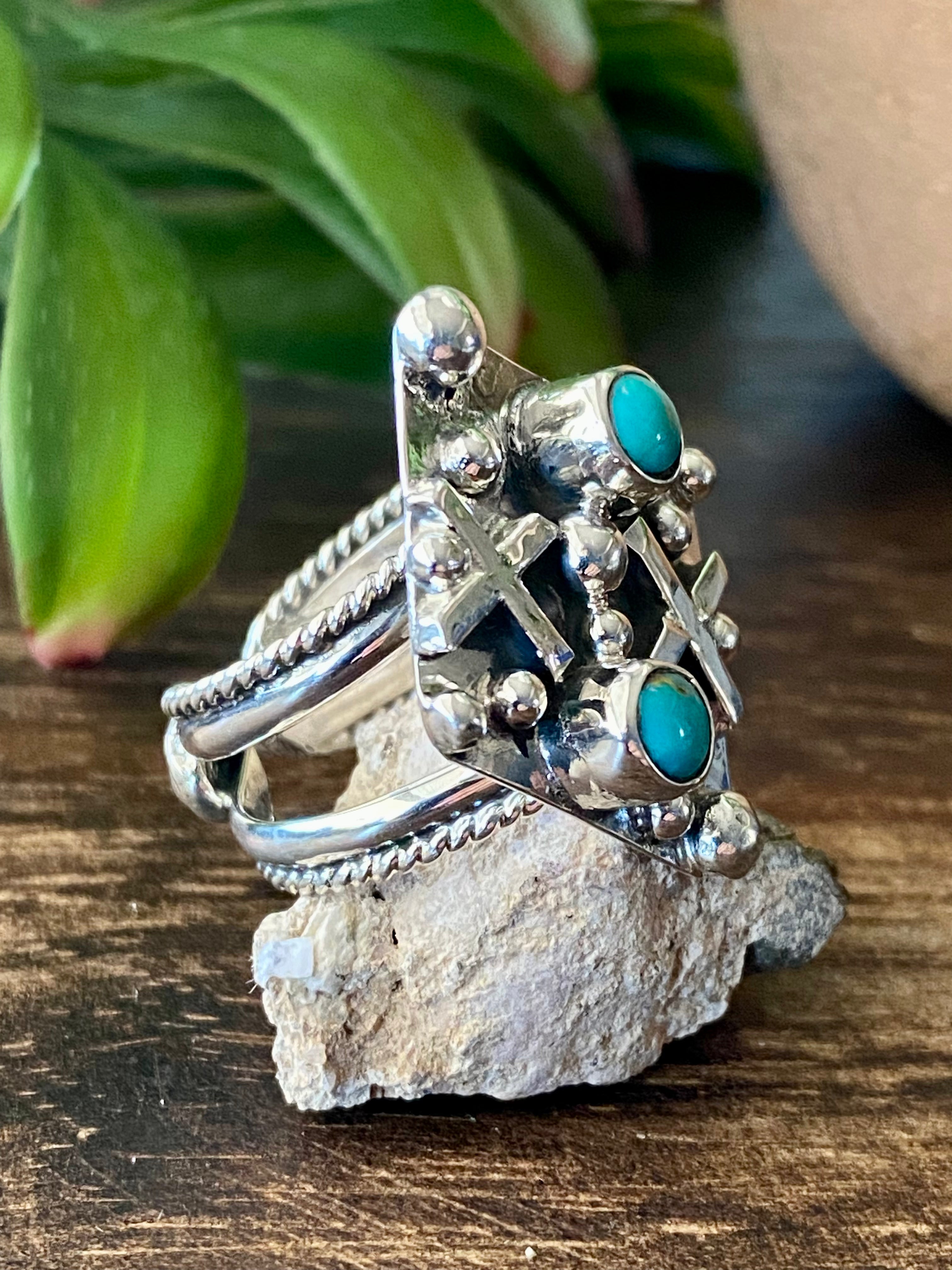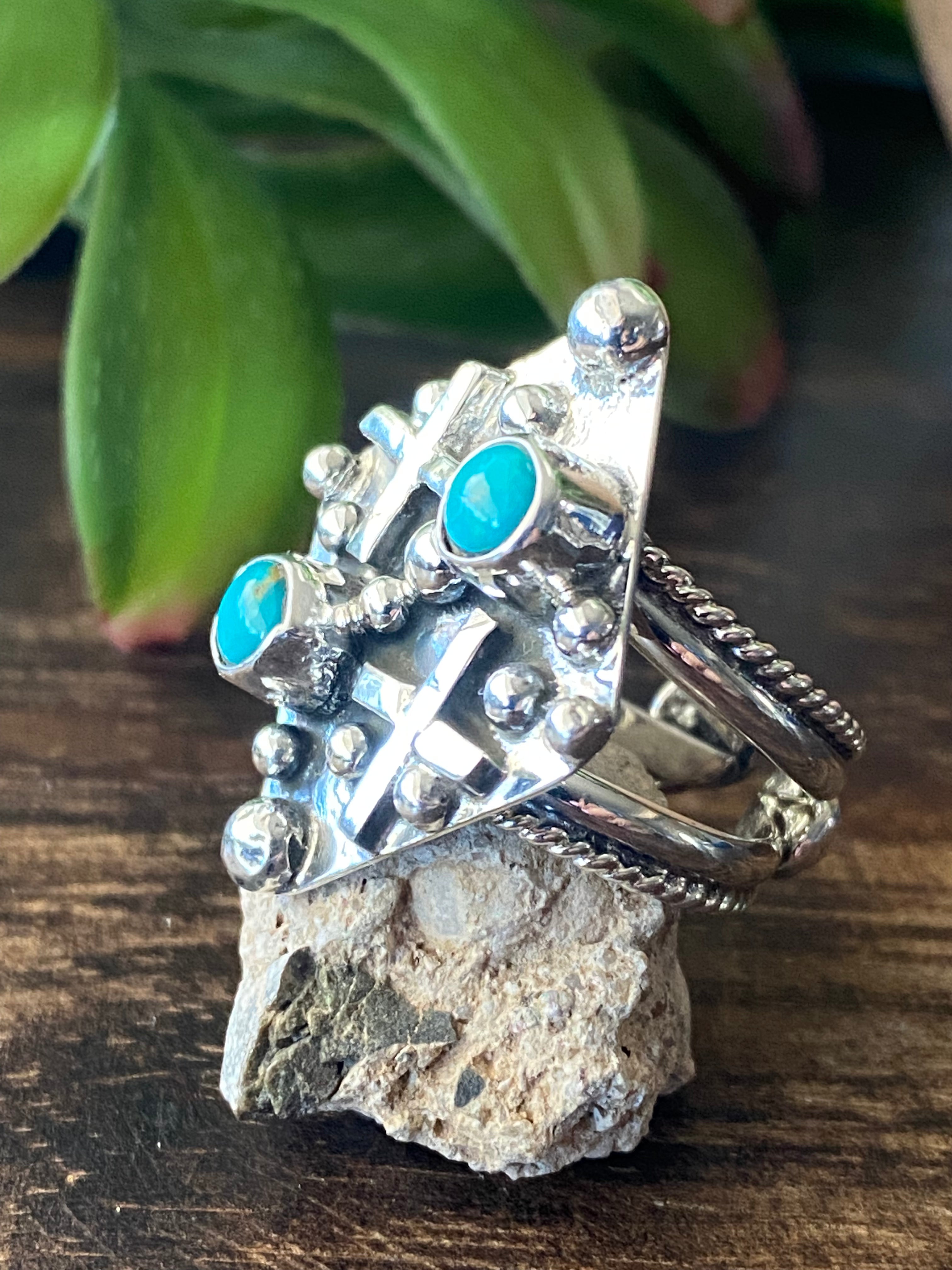 Navajo Made Kingman Turquoise & Sterling Silver Adjustable Ring. It measures 1 1/8 inches long and 1 inch wide. Signed by the artist and stamped sterling silver. Stones will differ due to natural stones.