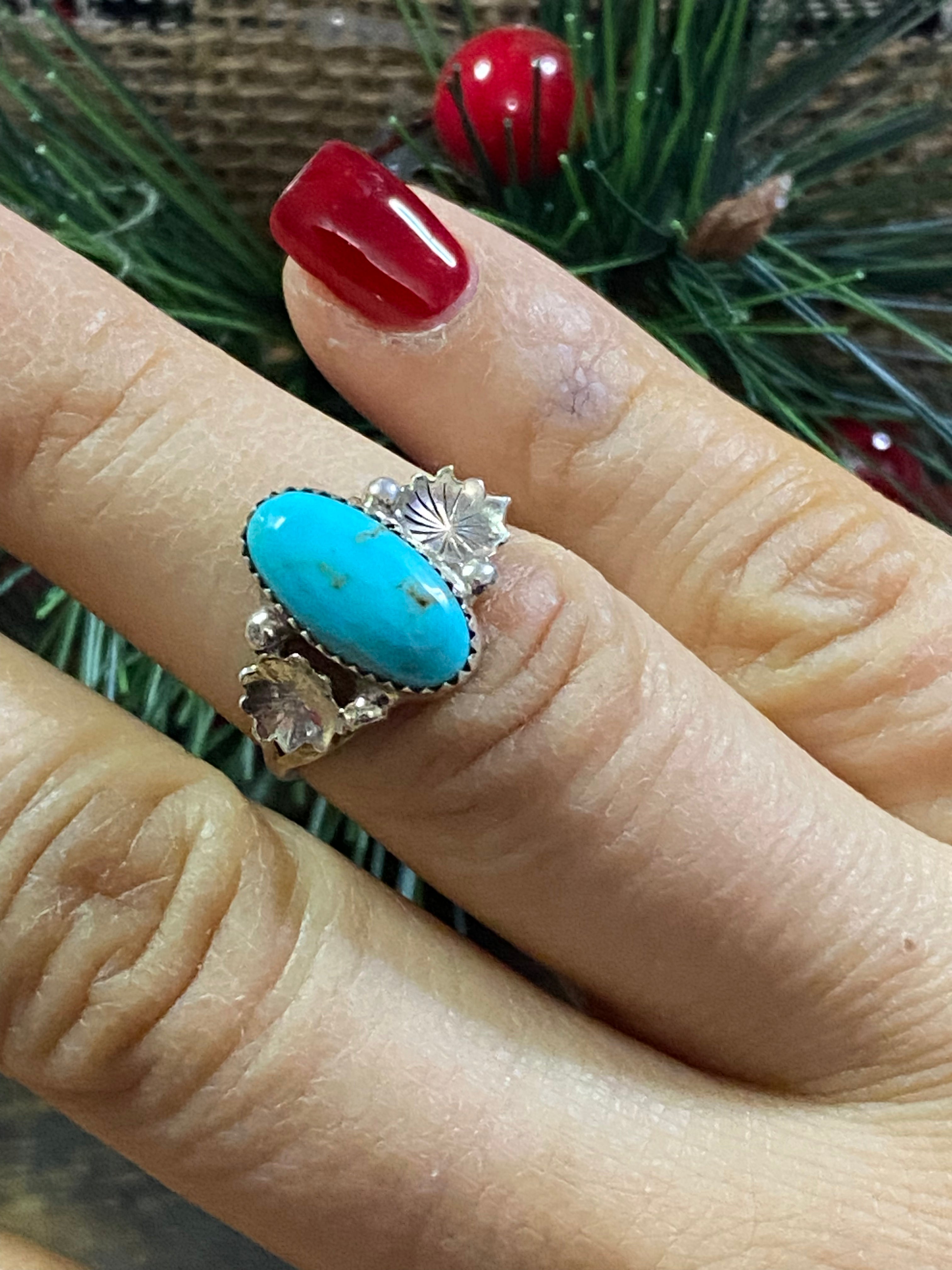 Navajo Made Kingman Turquoise & Sterling Silver Ring Size 7.5. It measures just over 1/2 of an inch long and 5/8 of an inch wide. Stamped sterling silver.