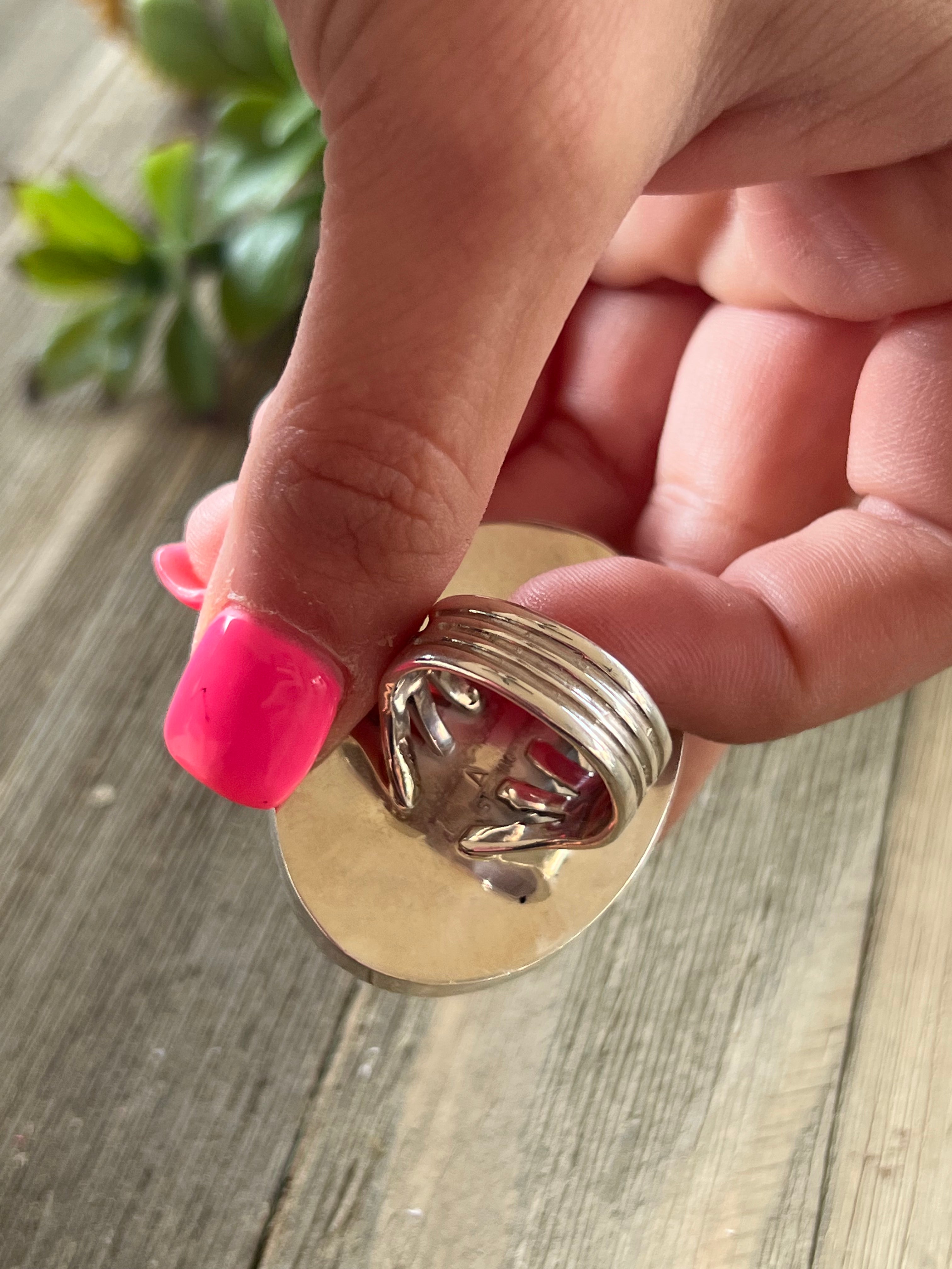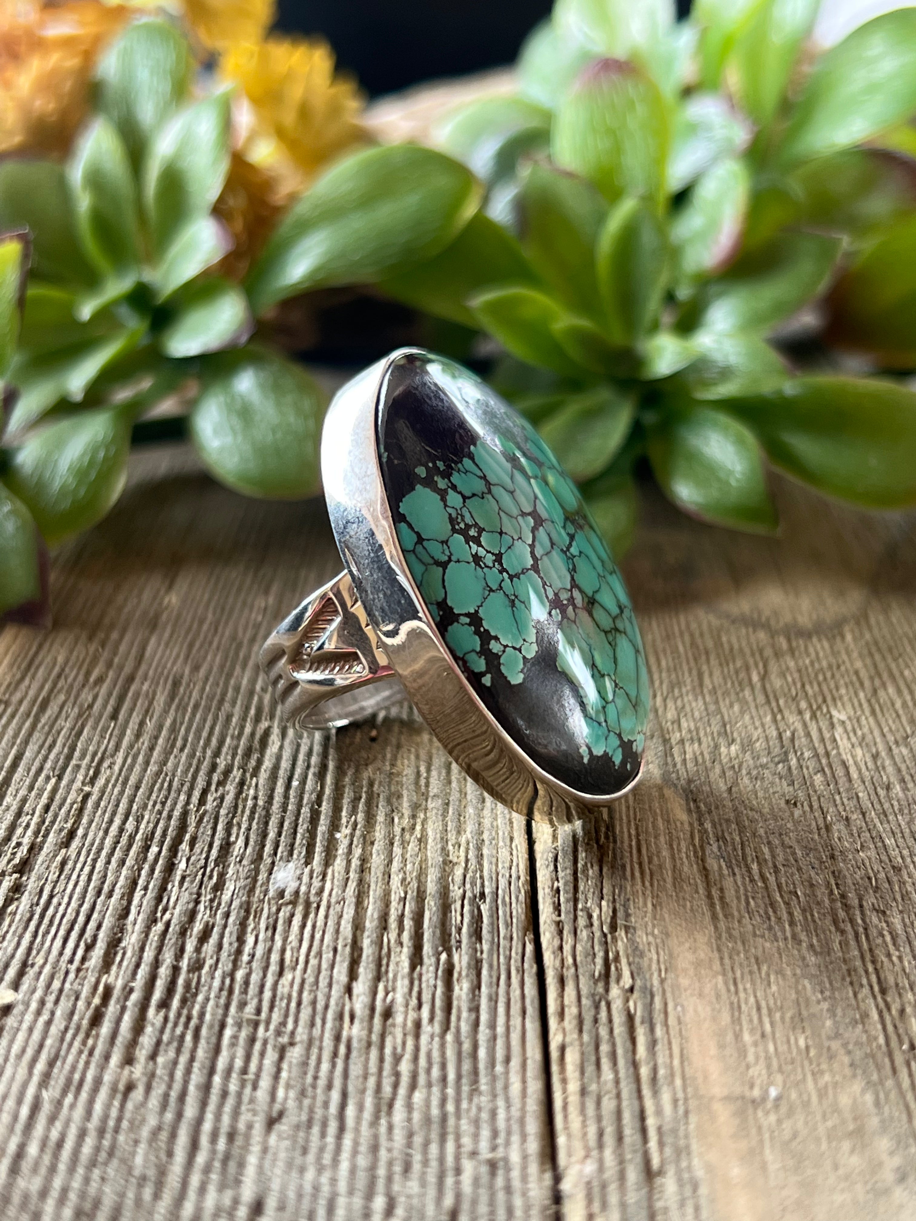 Navajo Made Kingman Turquoise & Sterling Silver Ring Size 7.75. It measures 1 5/8 inches long and 1 1/8 inches wide. Signed by artist and stamped sterling silver.