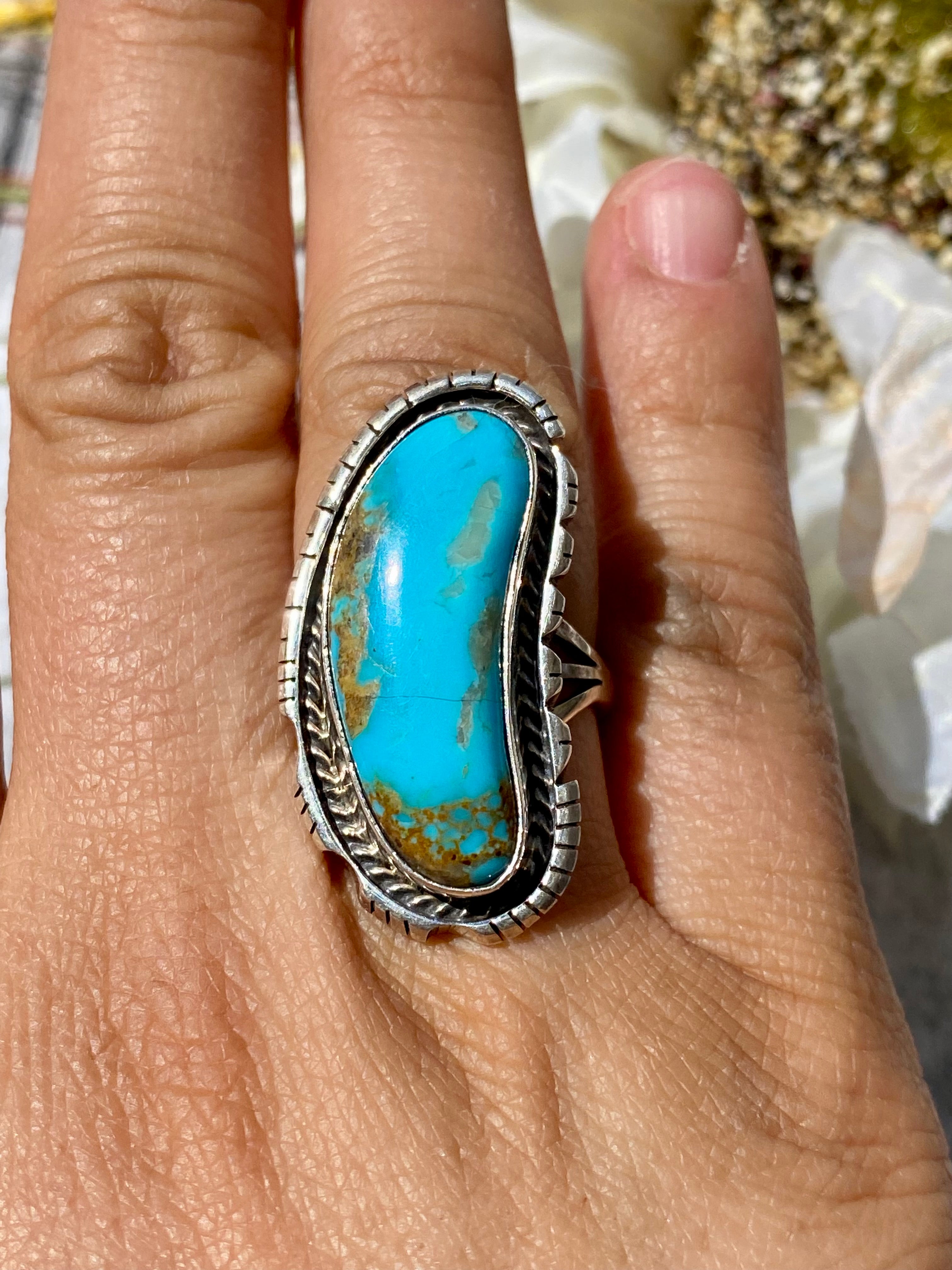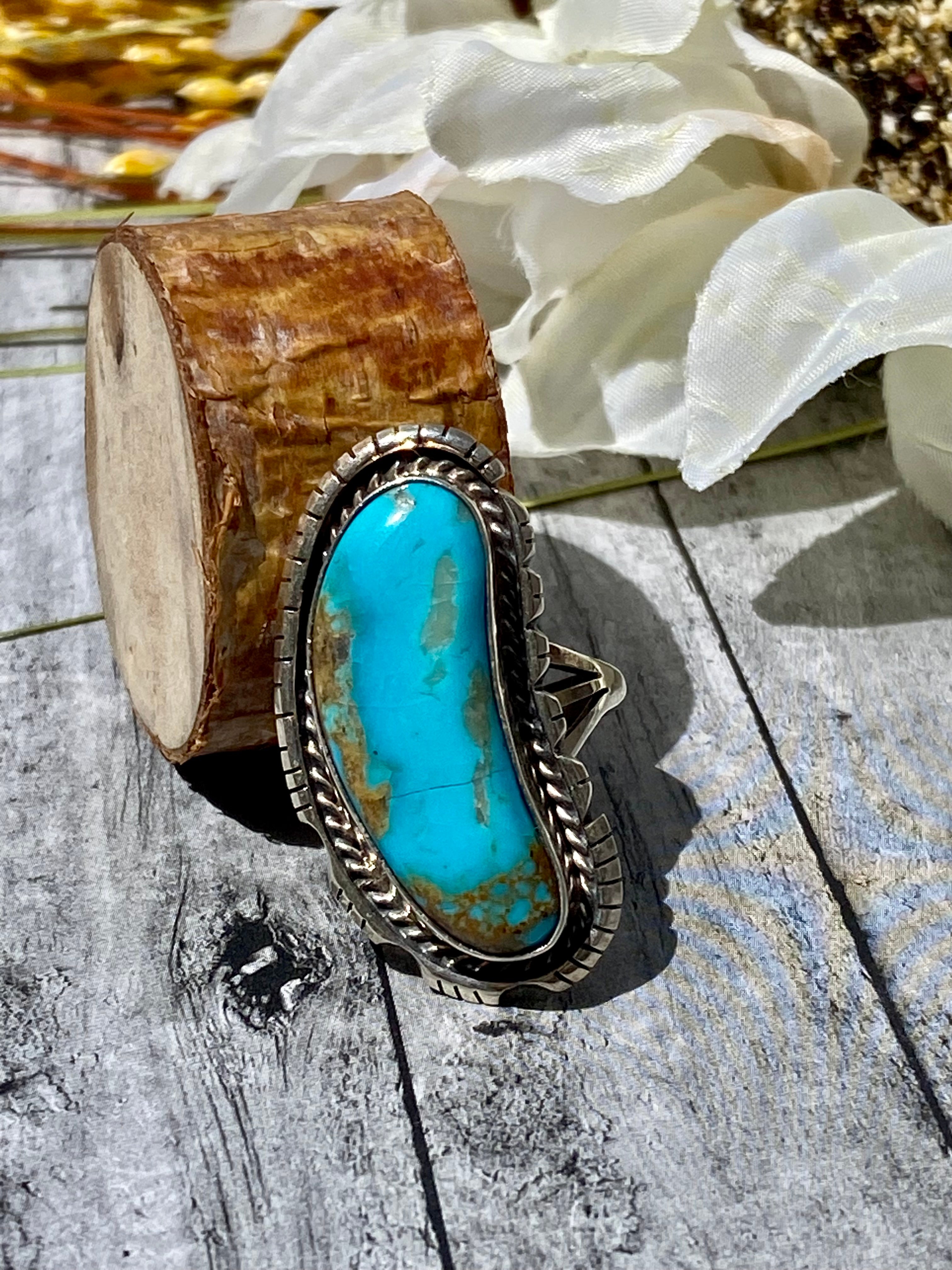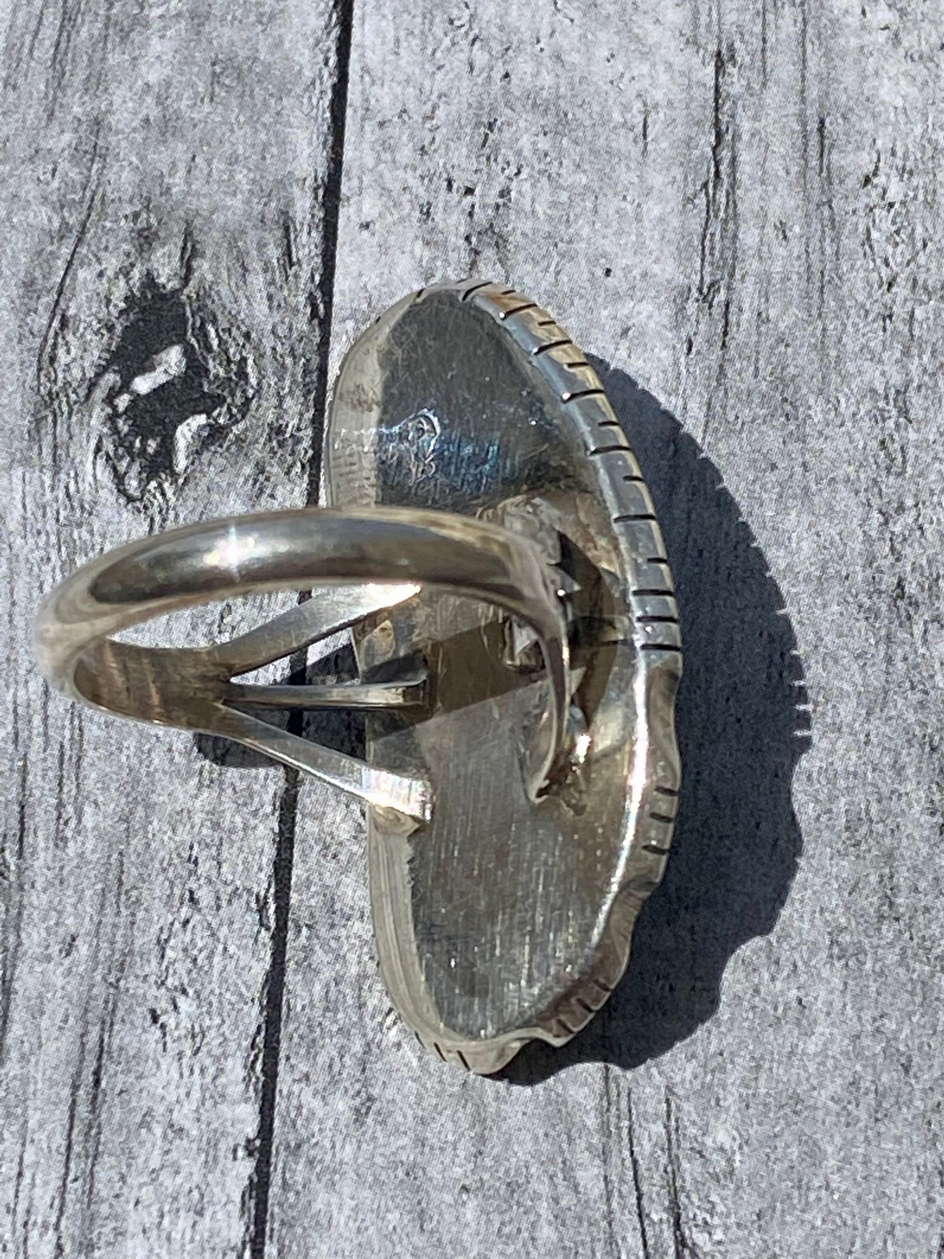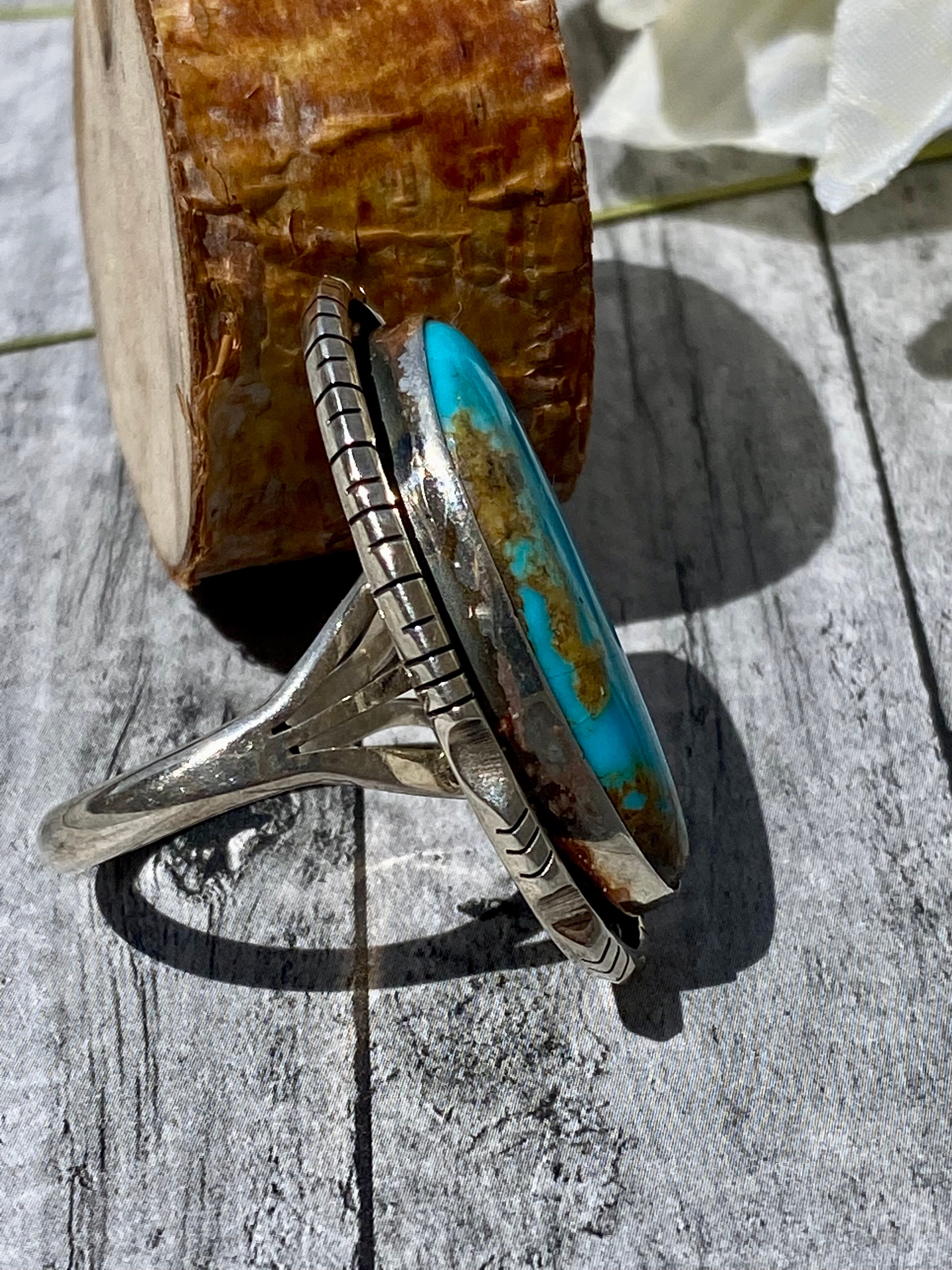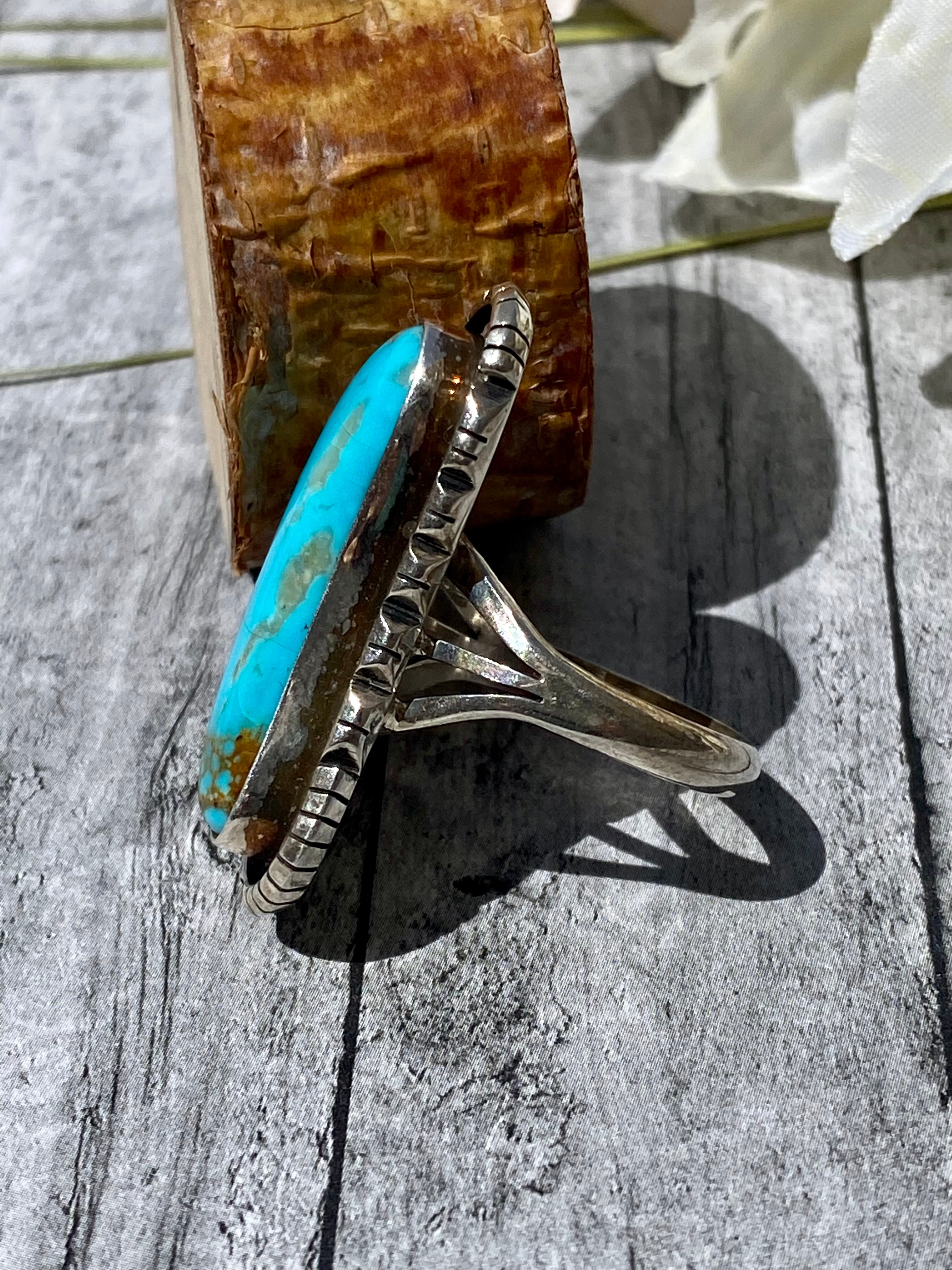 Navajo Made Kingman Turquoise & Sterling Silver Ring Size 8.5. It measures 1 3/8 inches long and just over 5/8 of an inch wide. Signed by the artist and stamped sterling silver.