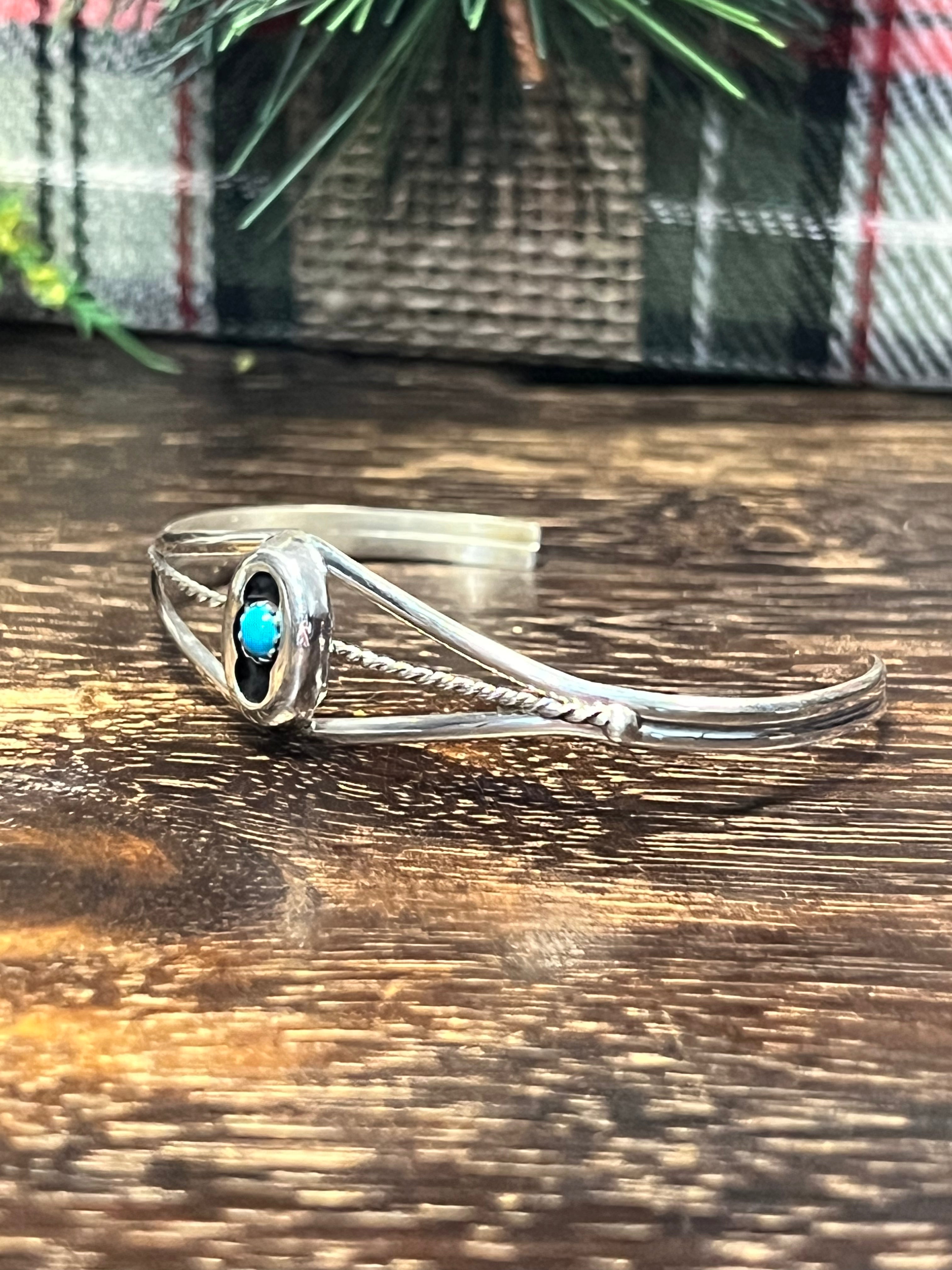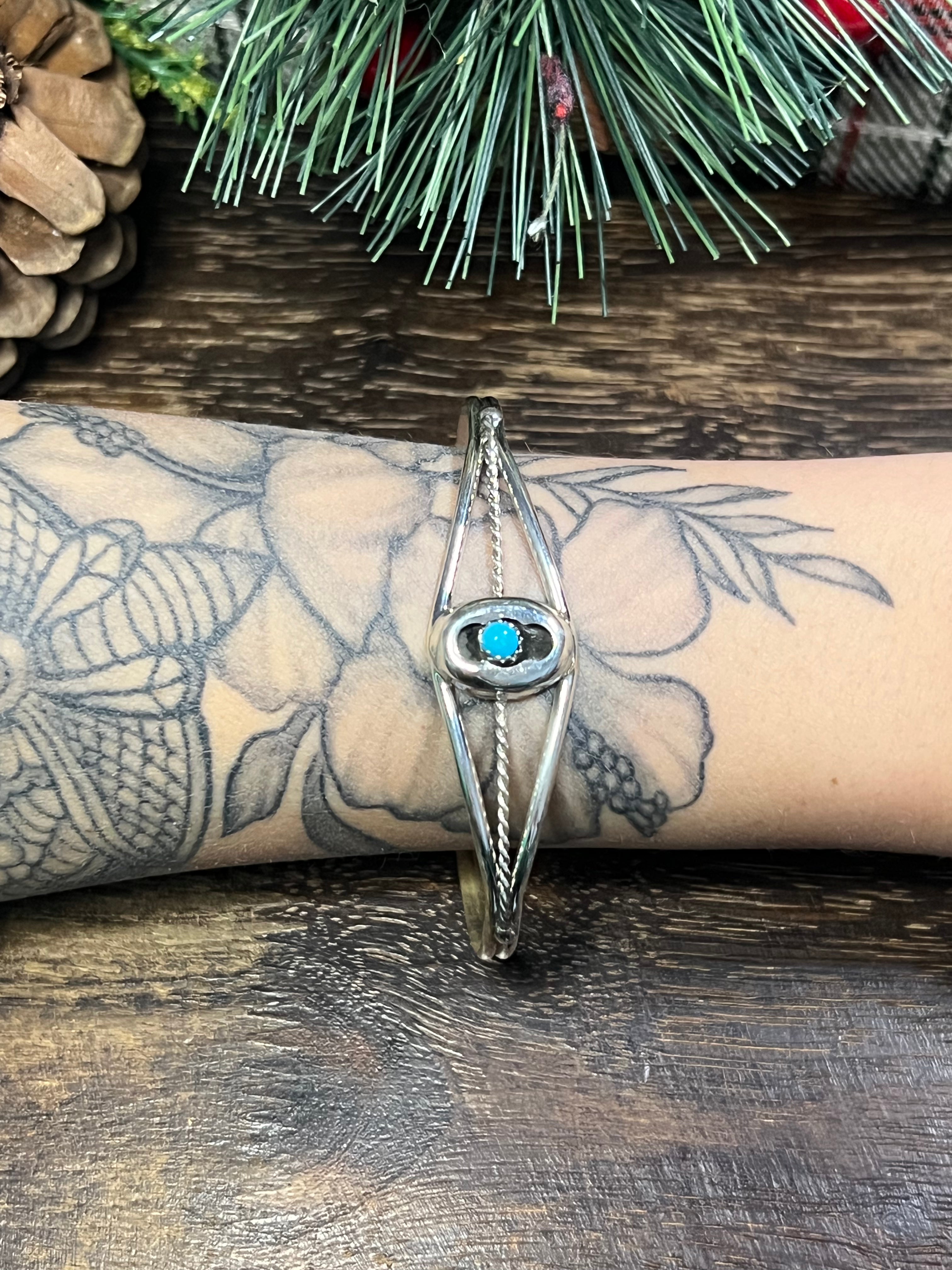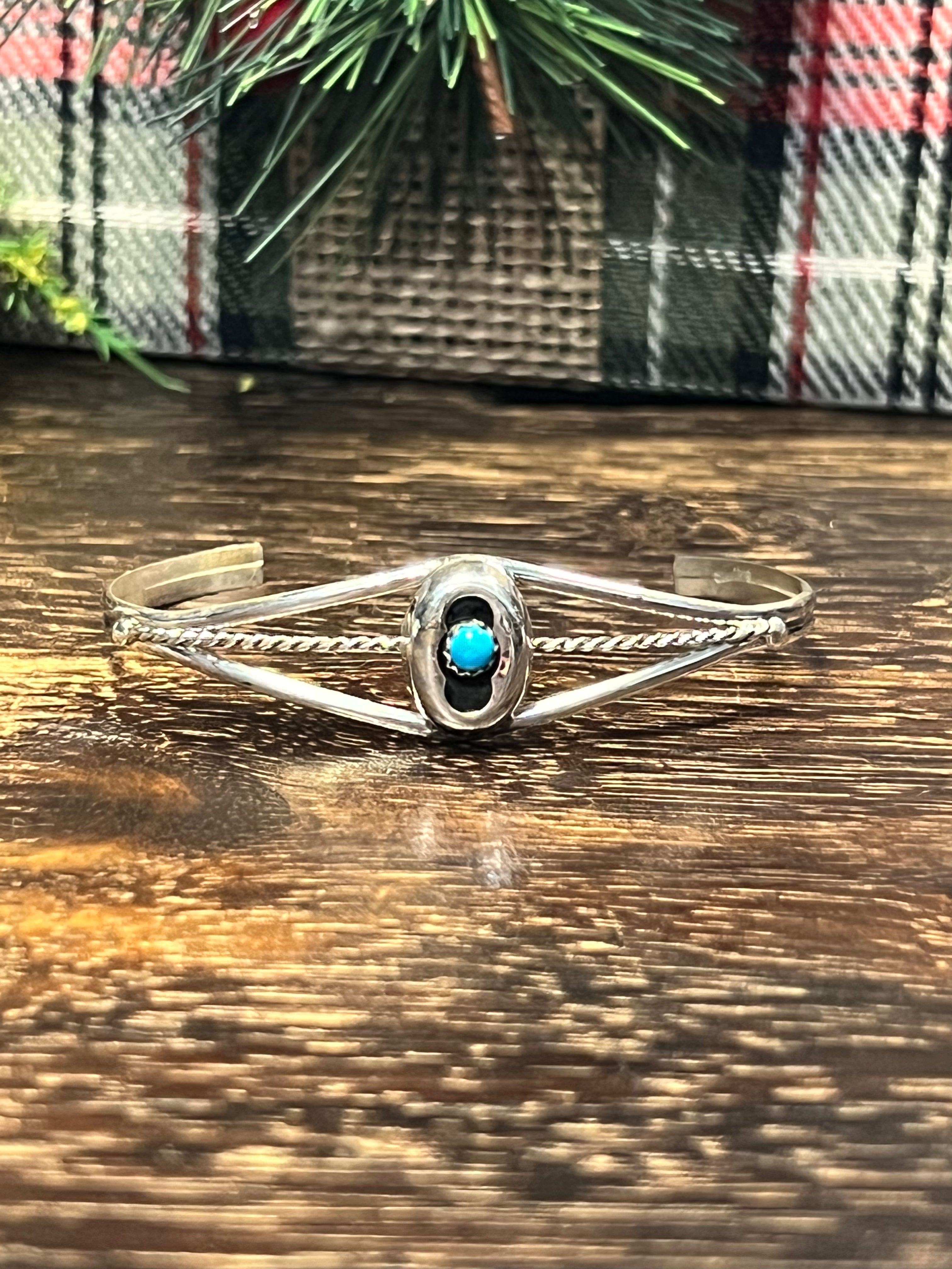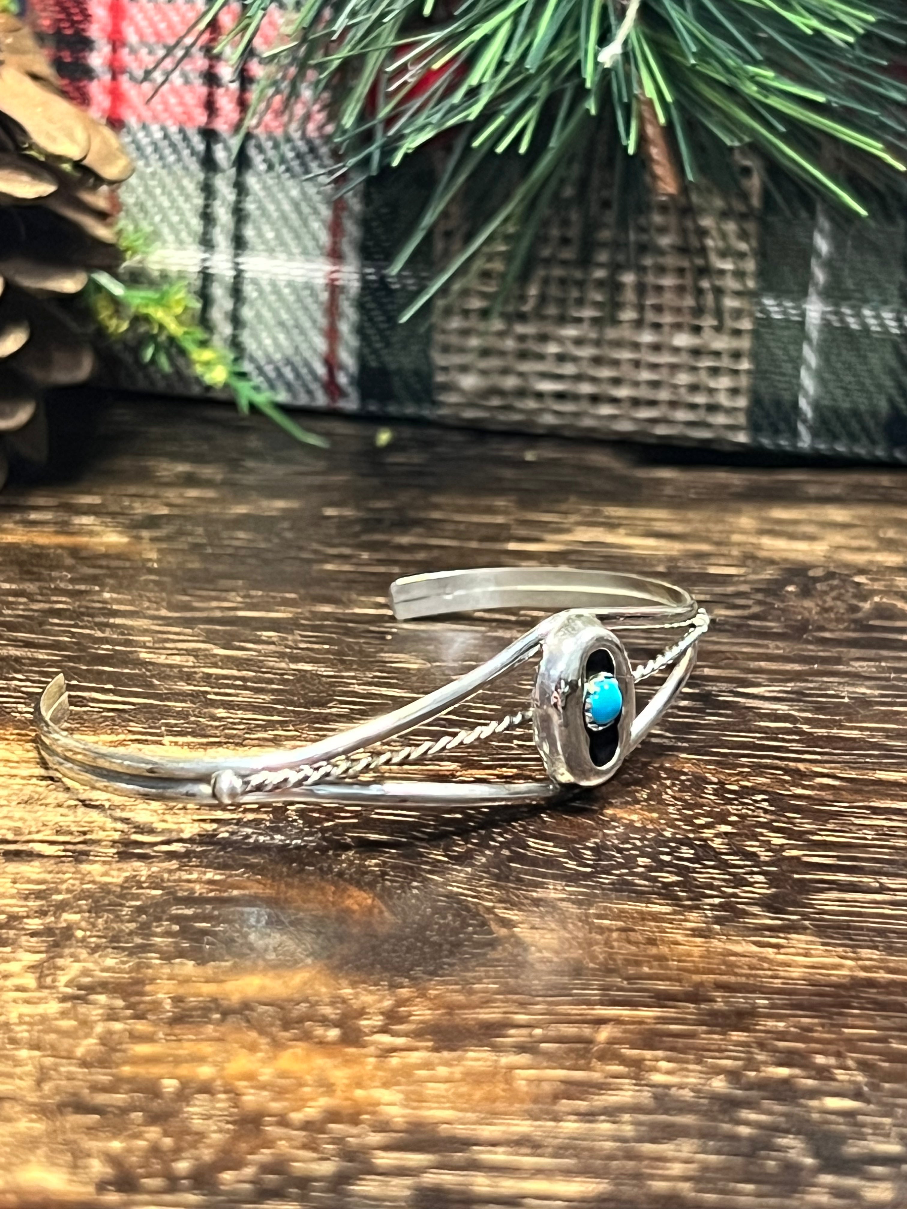 Navajo Made Kingman Turquoise & Sterling Silver Shadowbox Cuff Bracelet. It measures just over 1/2 of an inch wide with an inside circumference of 5 1/4 inches and a gap of just under 1 3/4 inches. Signed by the artist and stamped sterling silver.