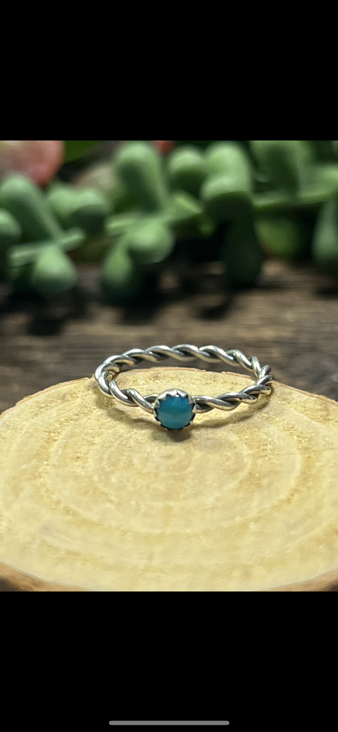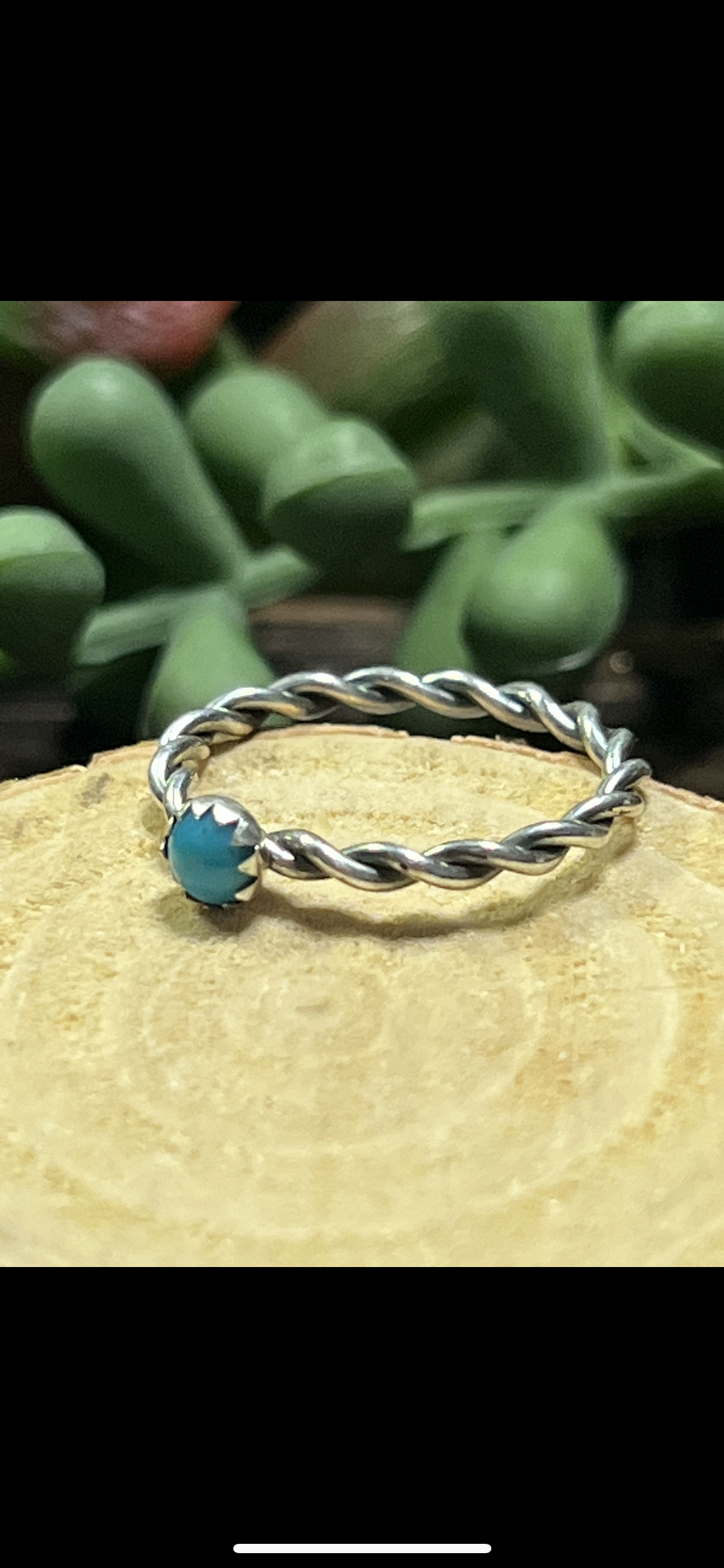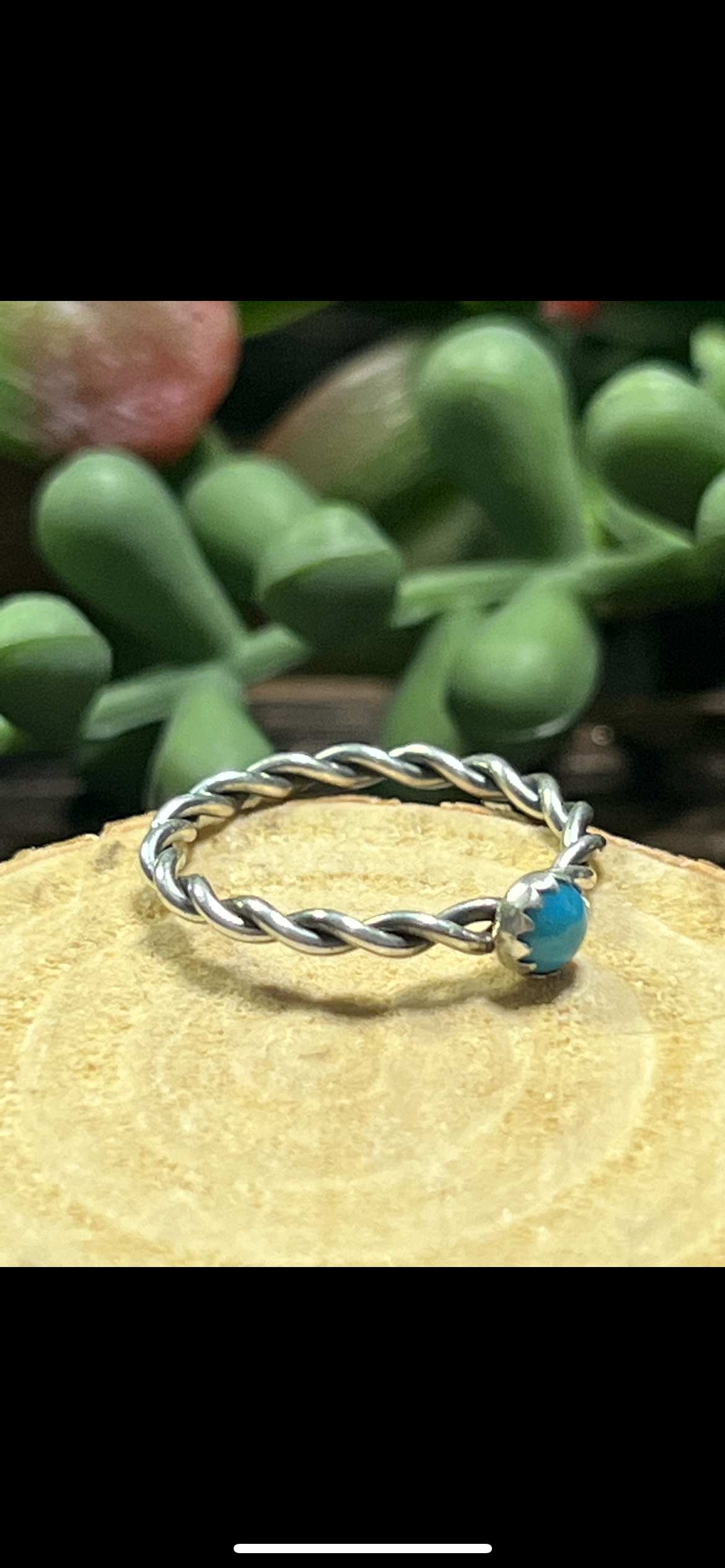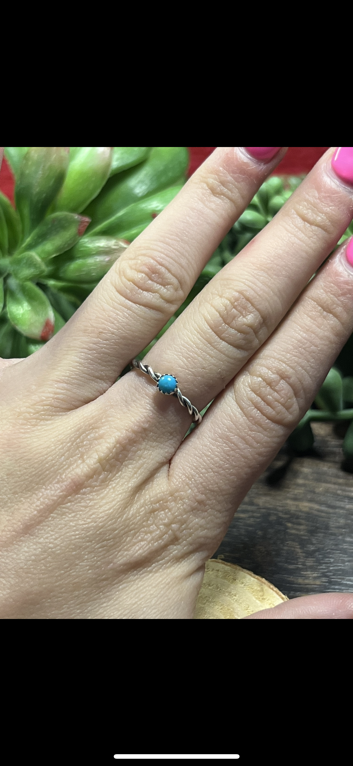 Navajo Made Kingman Turquoise & Sterling Silver Stacker Ring. It measures just over 1/8 inch long and just over 1/8 of an inch wide. Stones will differ due to natural stone.
