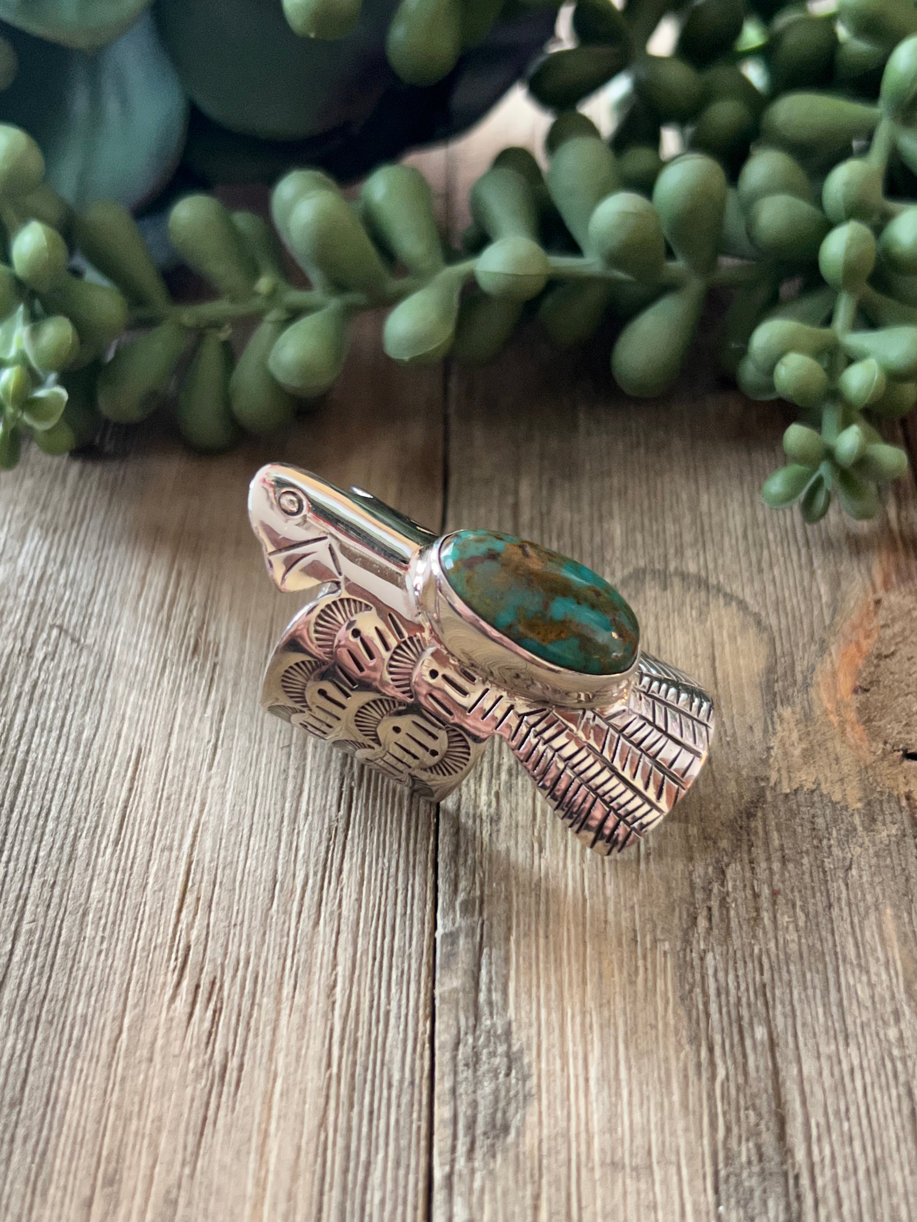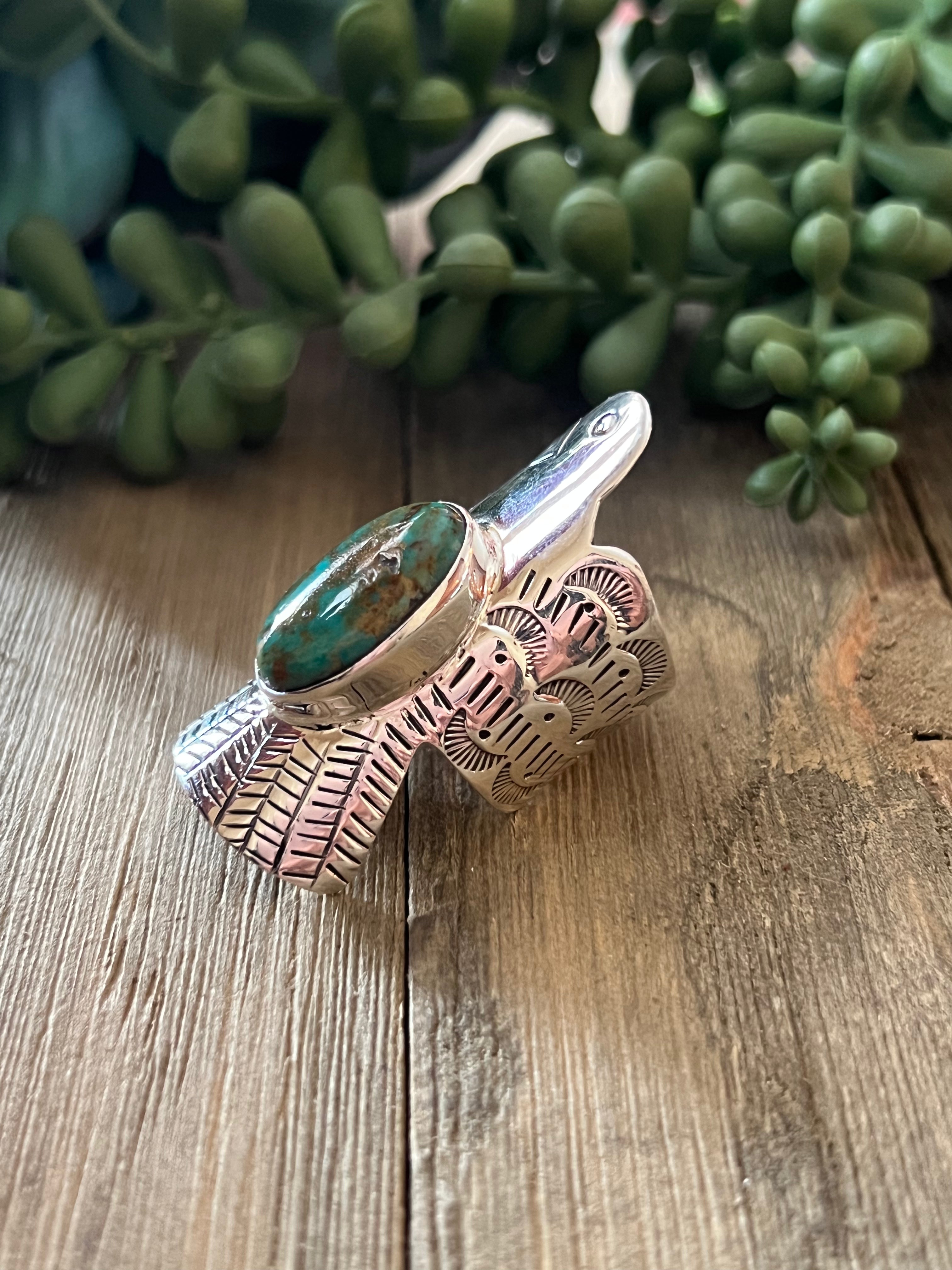 Navajo Made Kingman Turquoise & Sterling Silver Thunderbird Ring Size 8.5