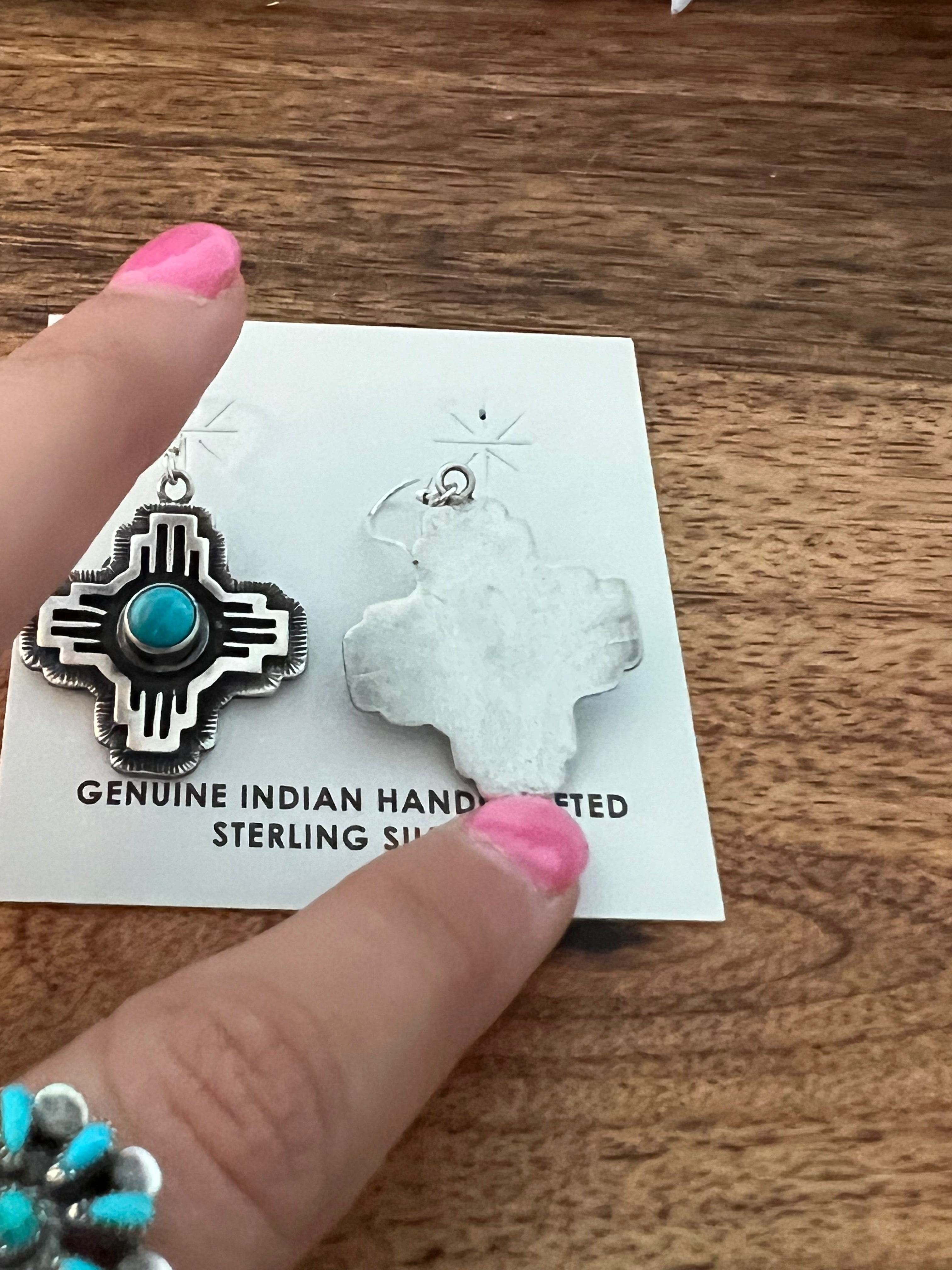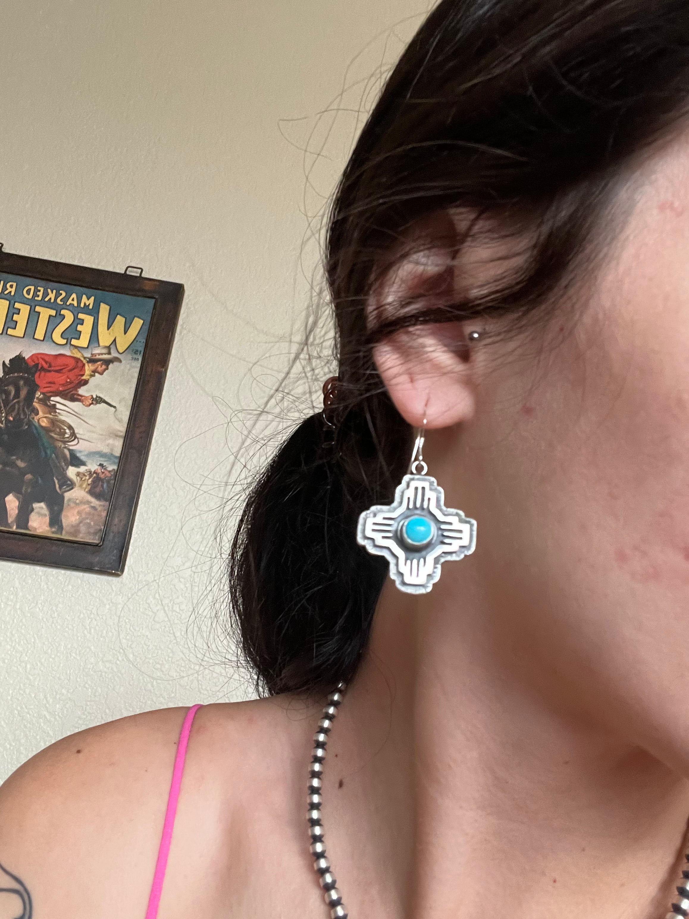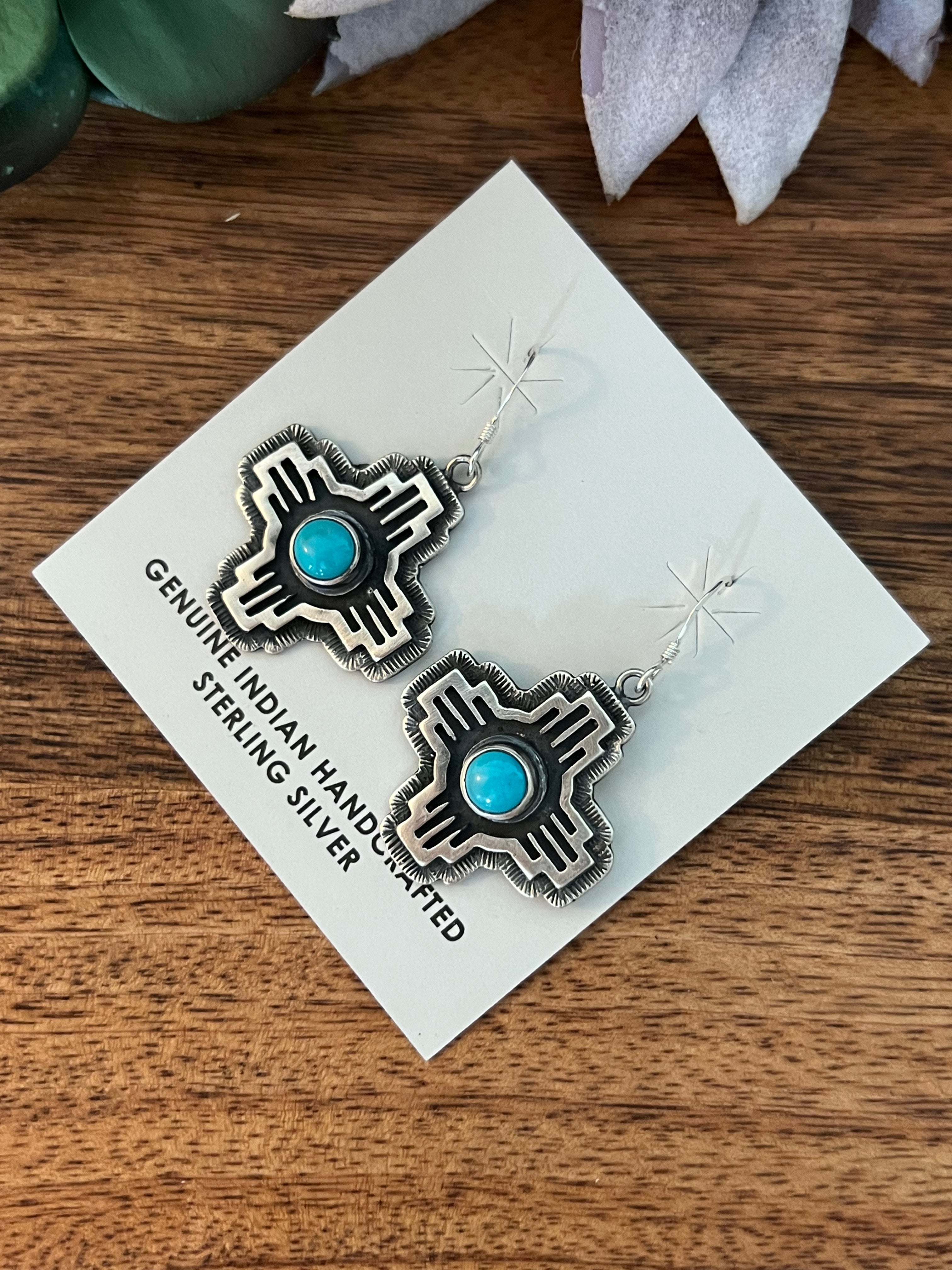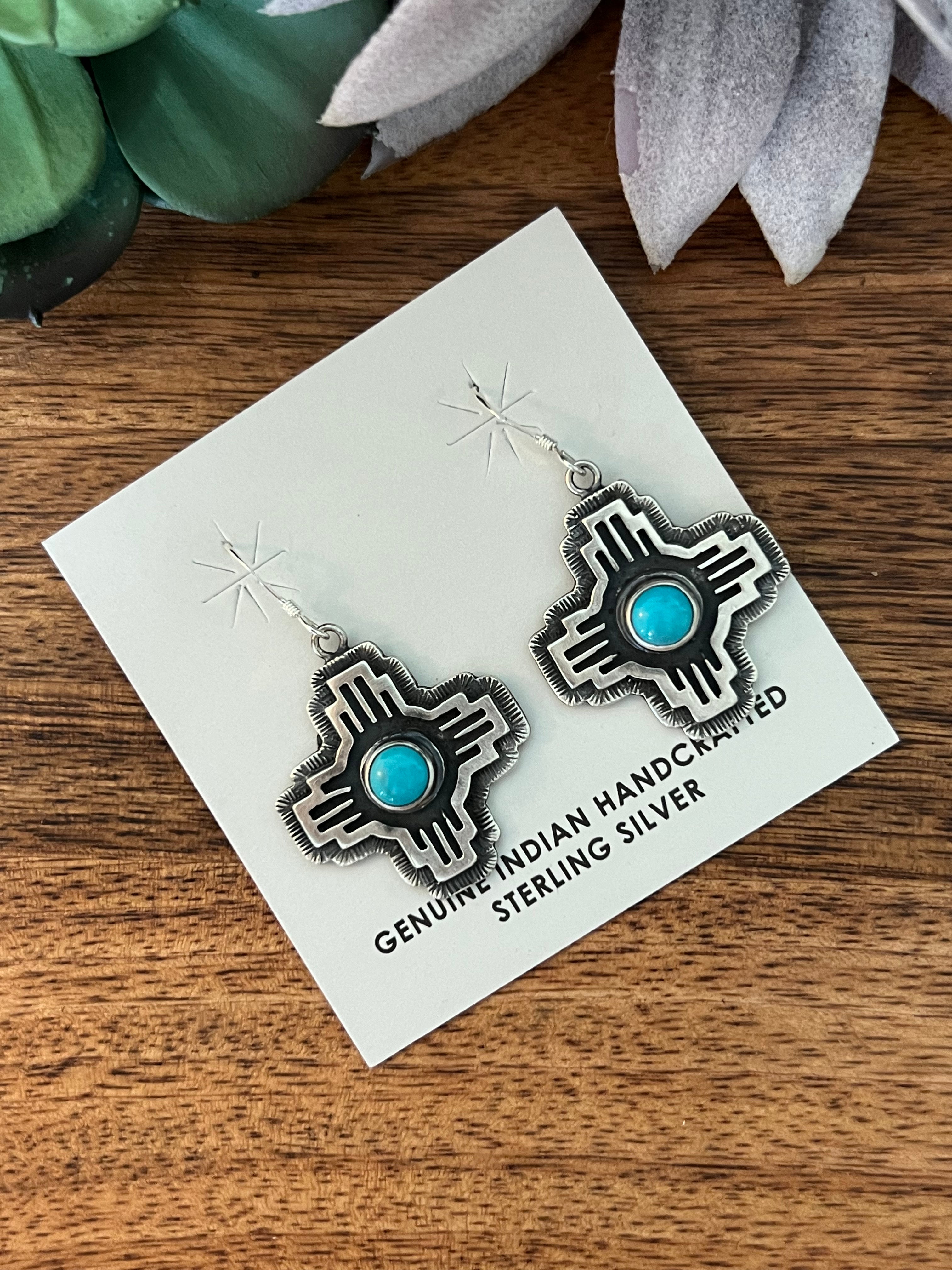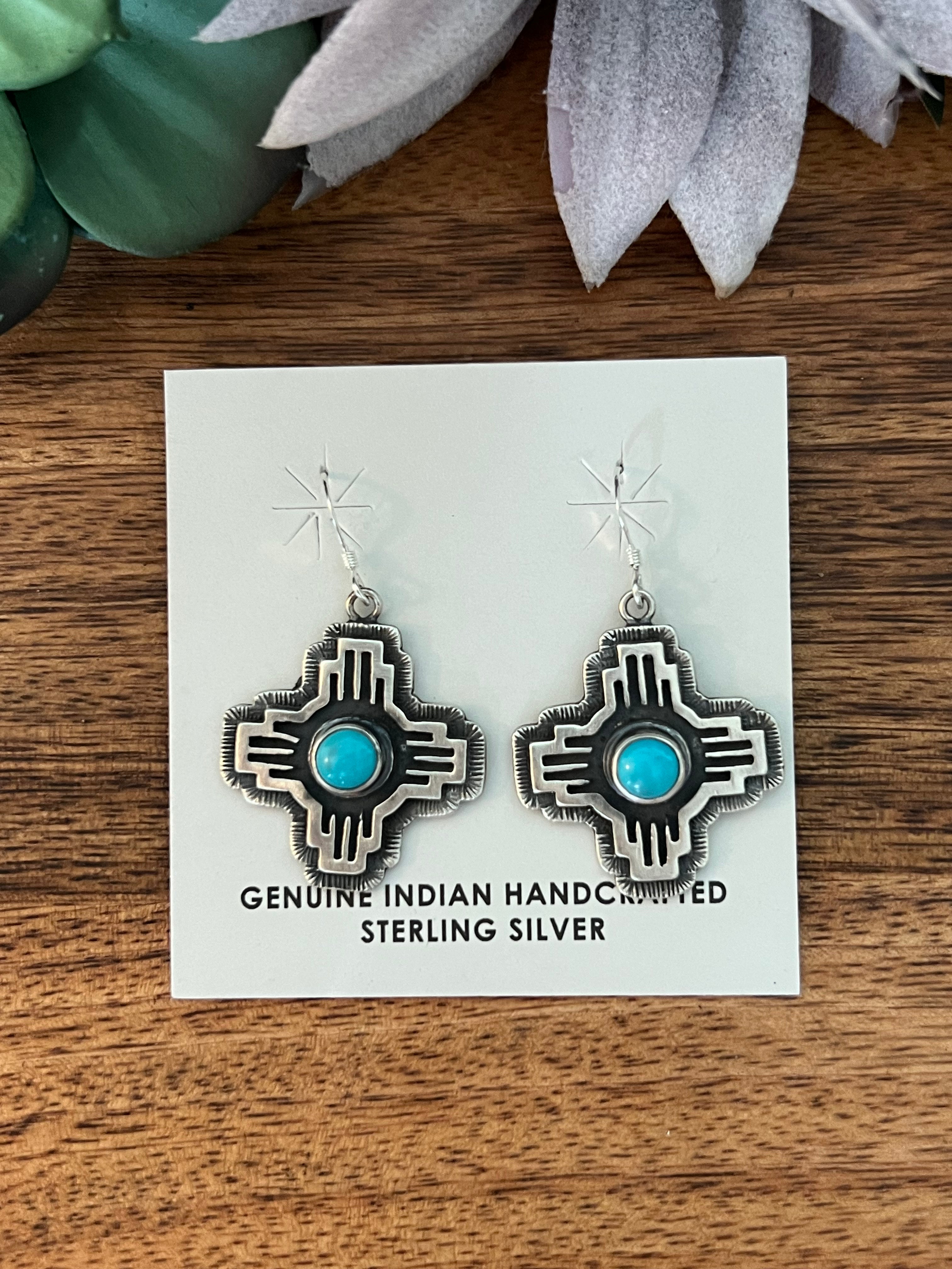 Navajo Made Kingman Turquoise & Sterling Silver Zia Dangle Earrings