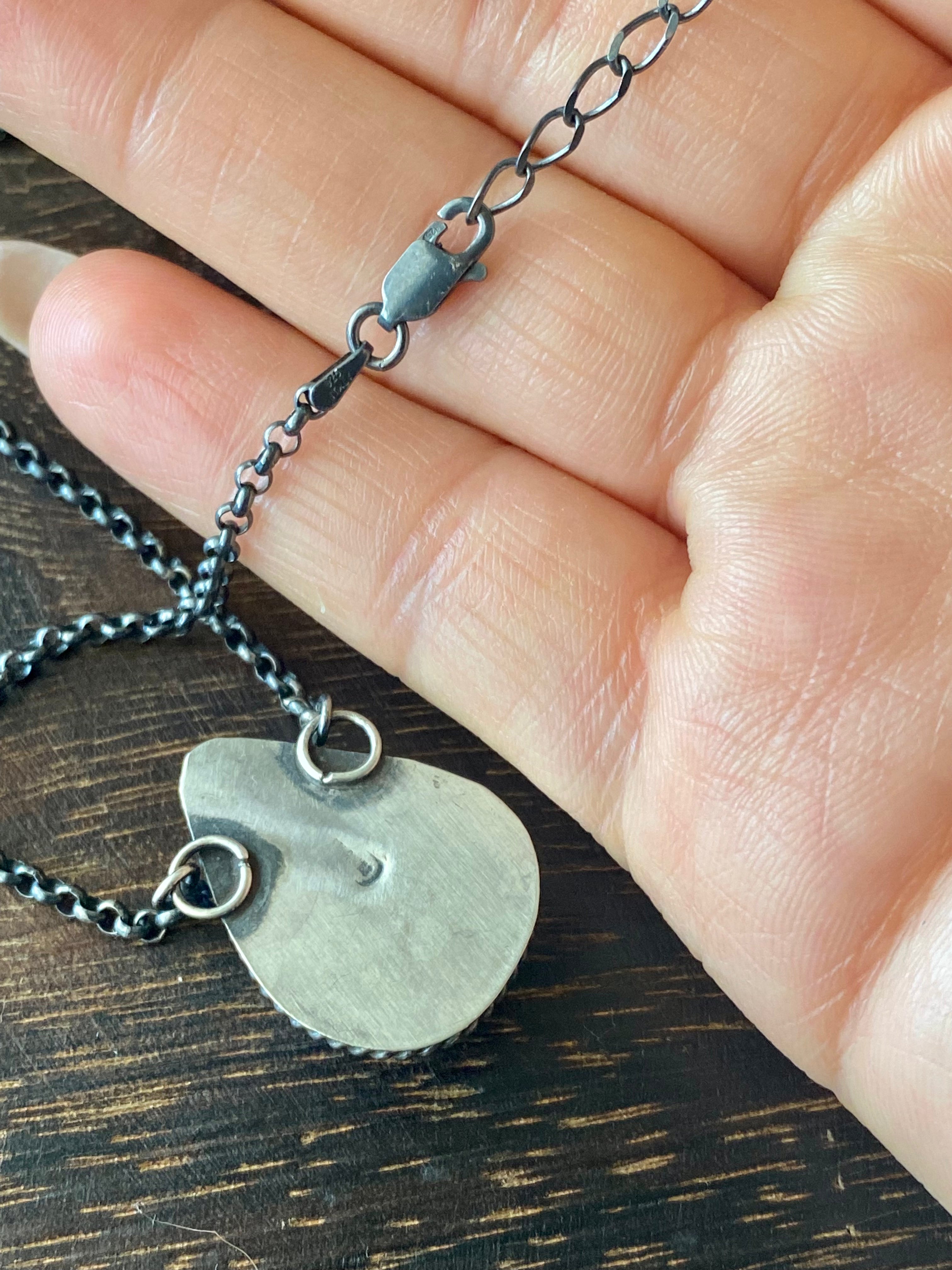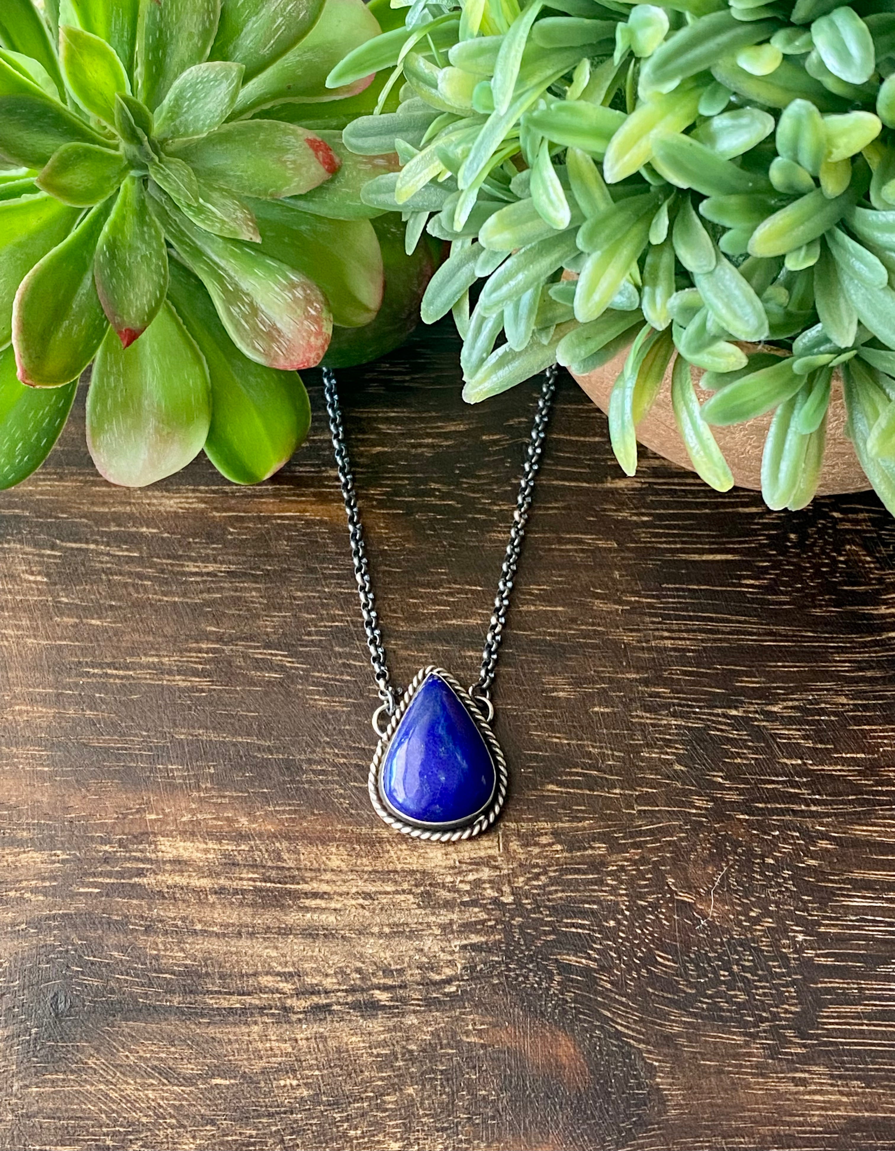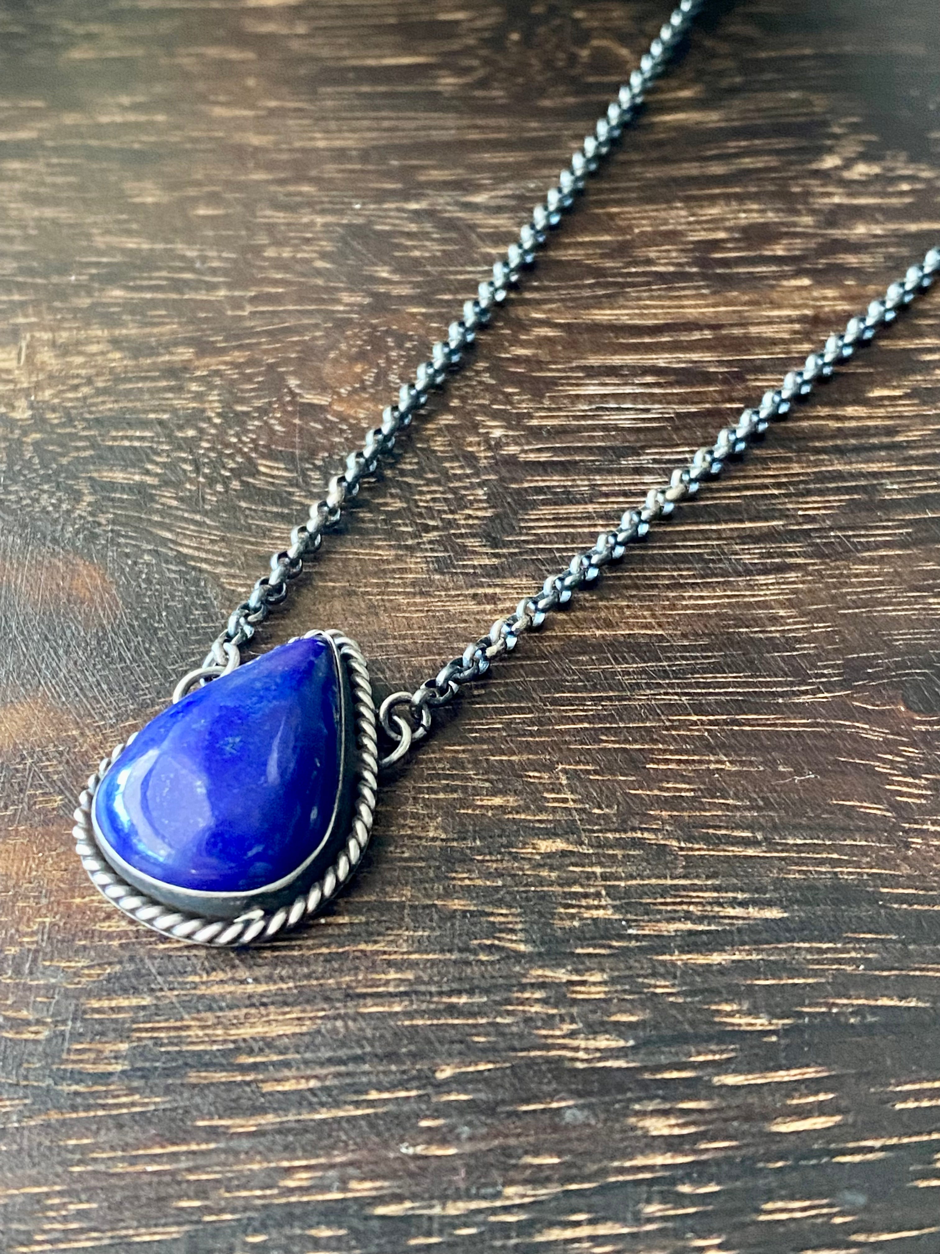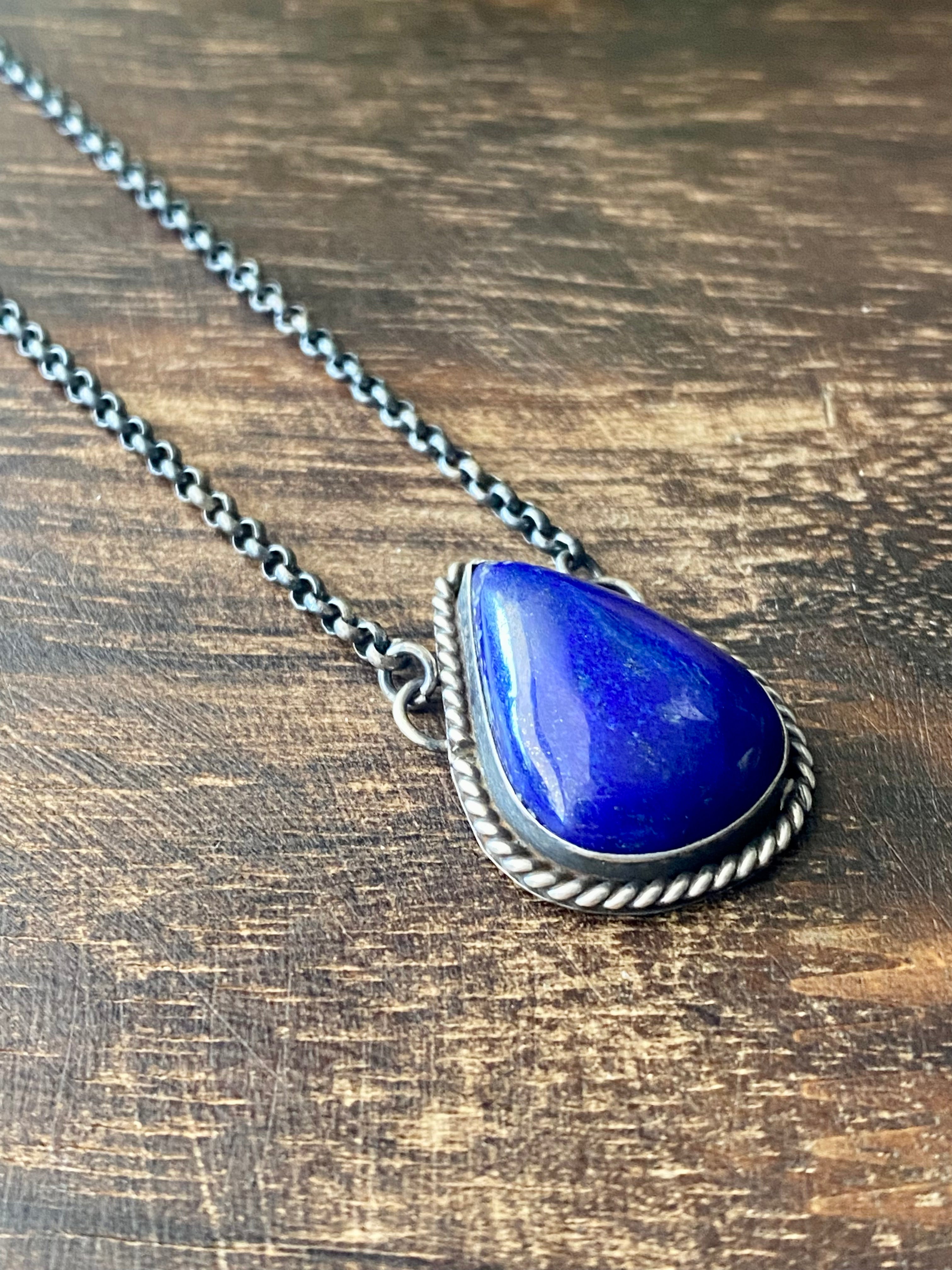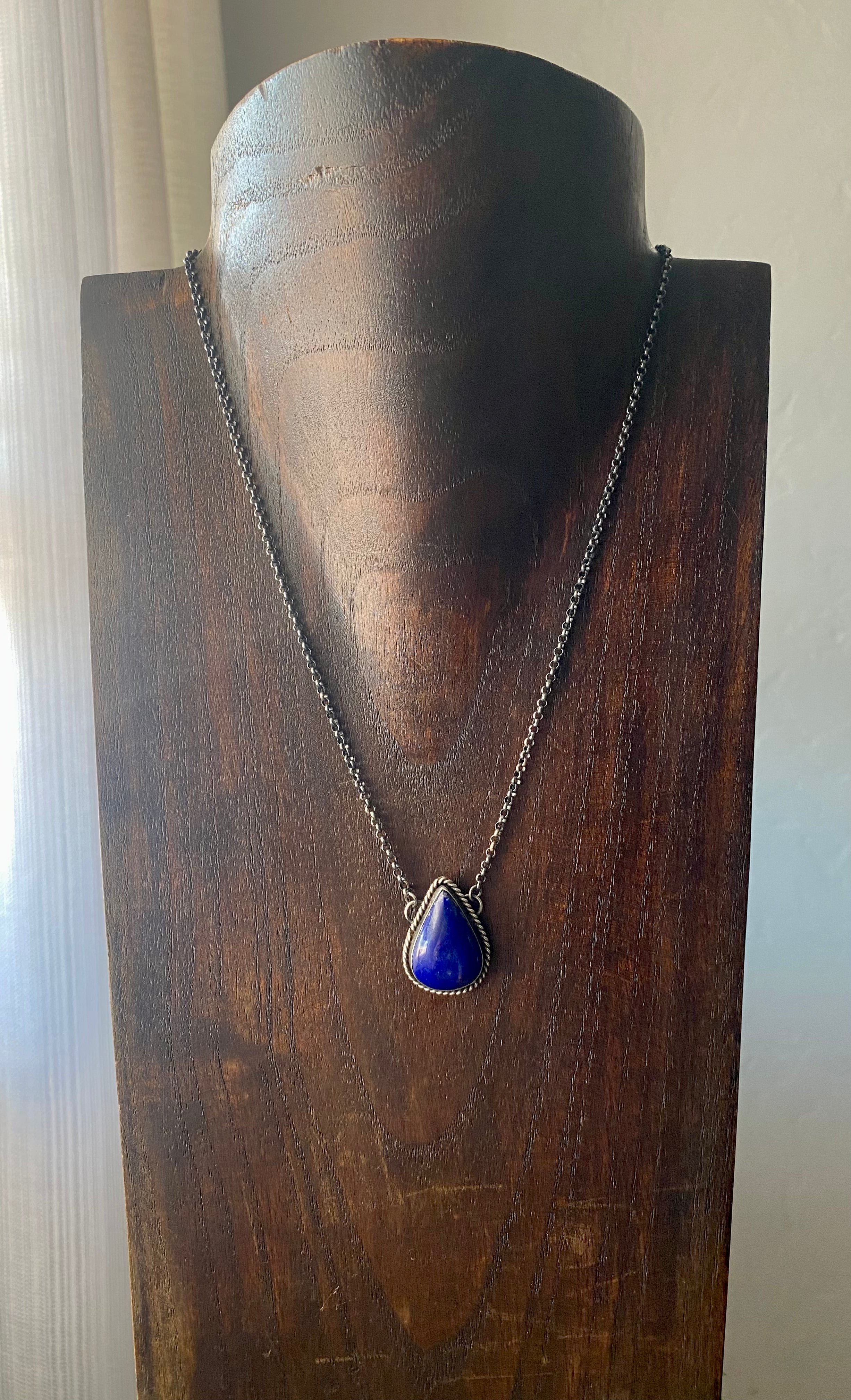 Navajo Made Lapis & Sterling Silver Necklace. It measures just under 20 inches long with hang but can adjust down to just under 18 inches long. Stamped sterling silver.