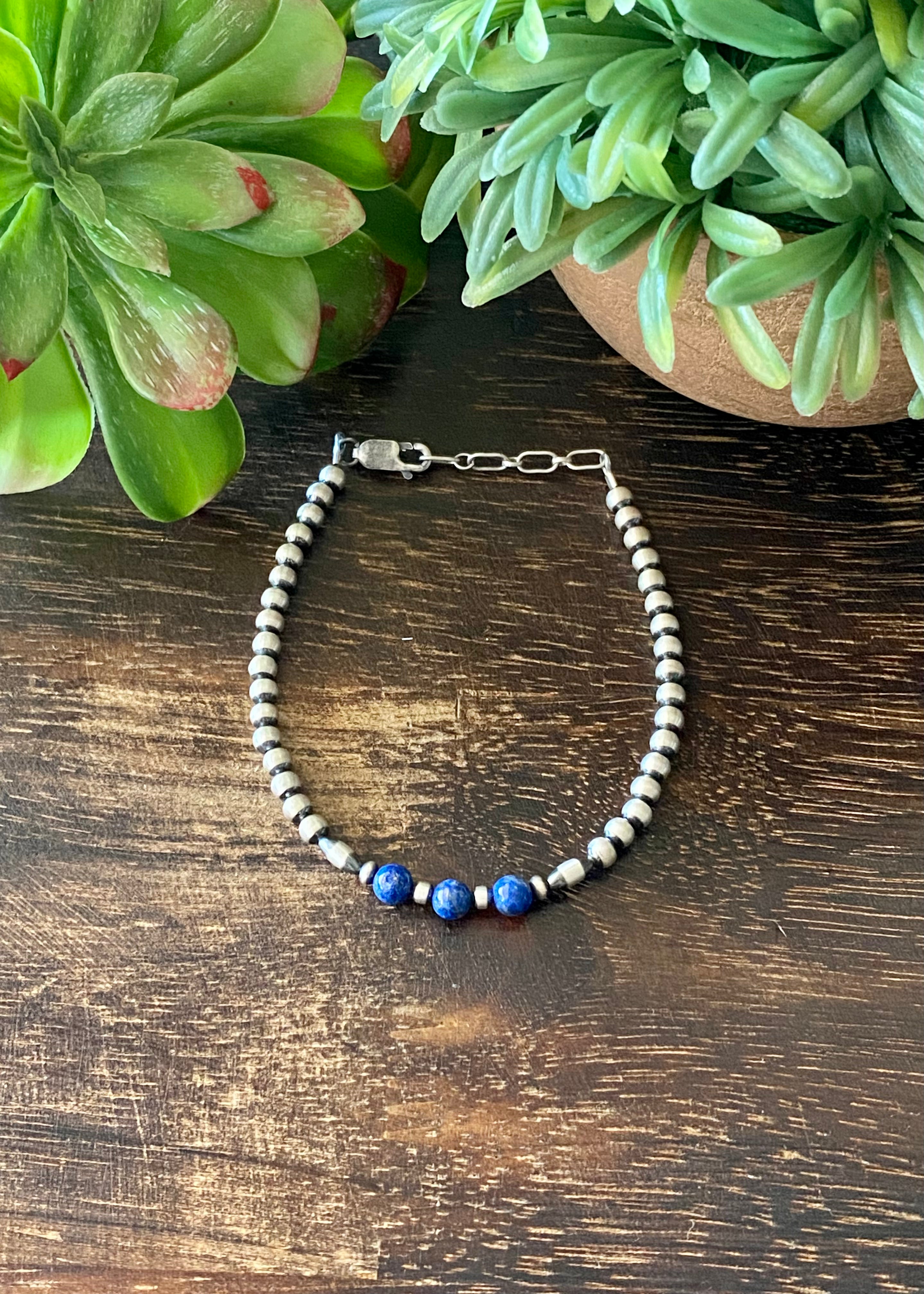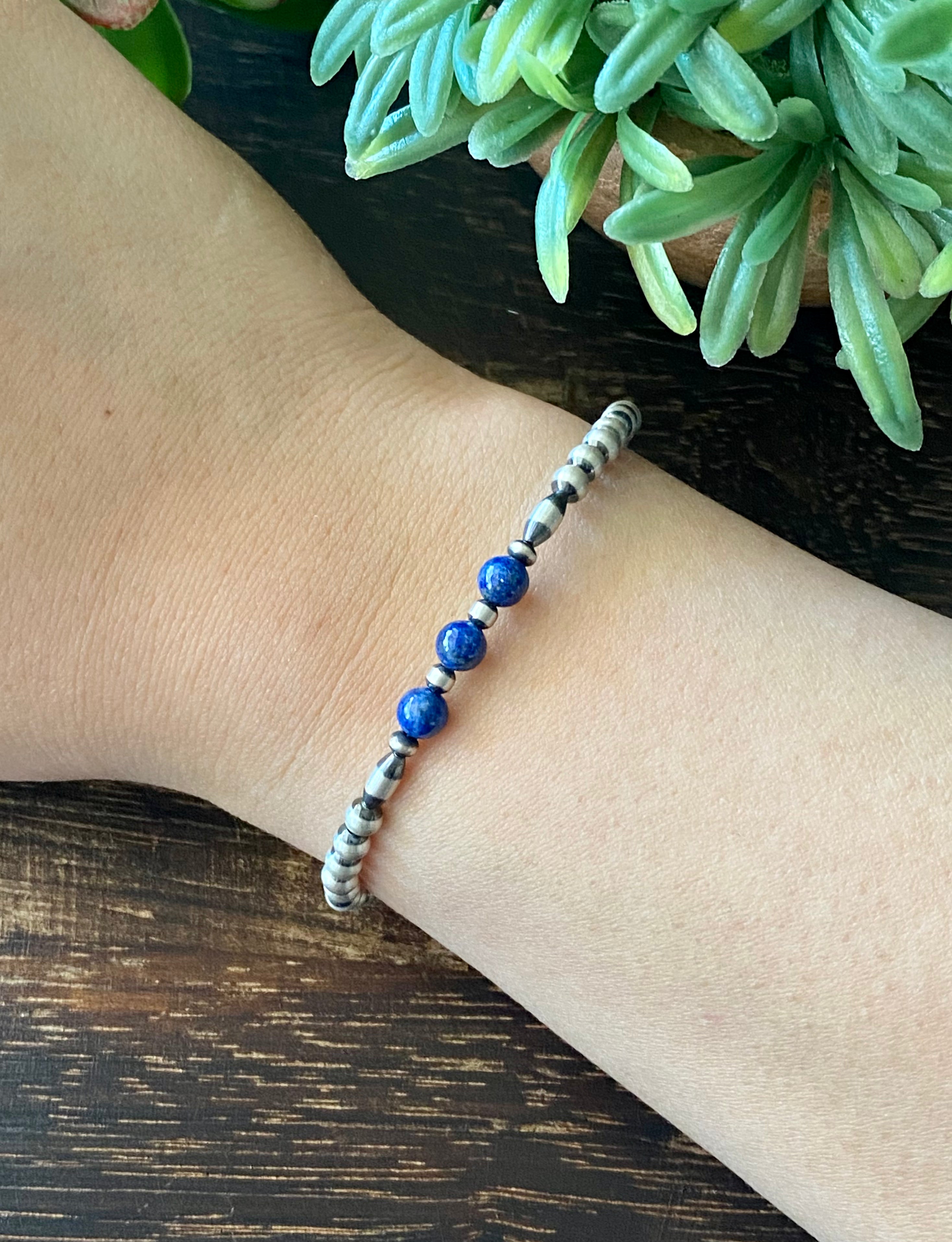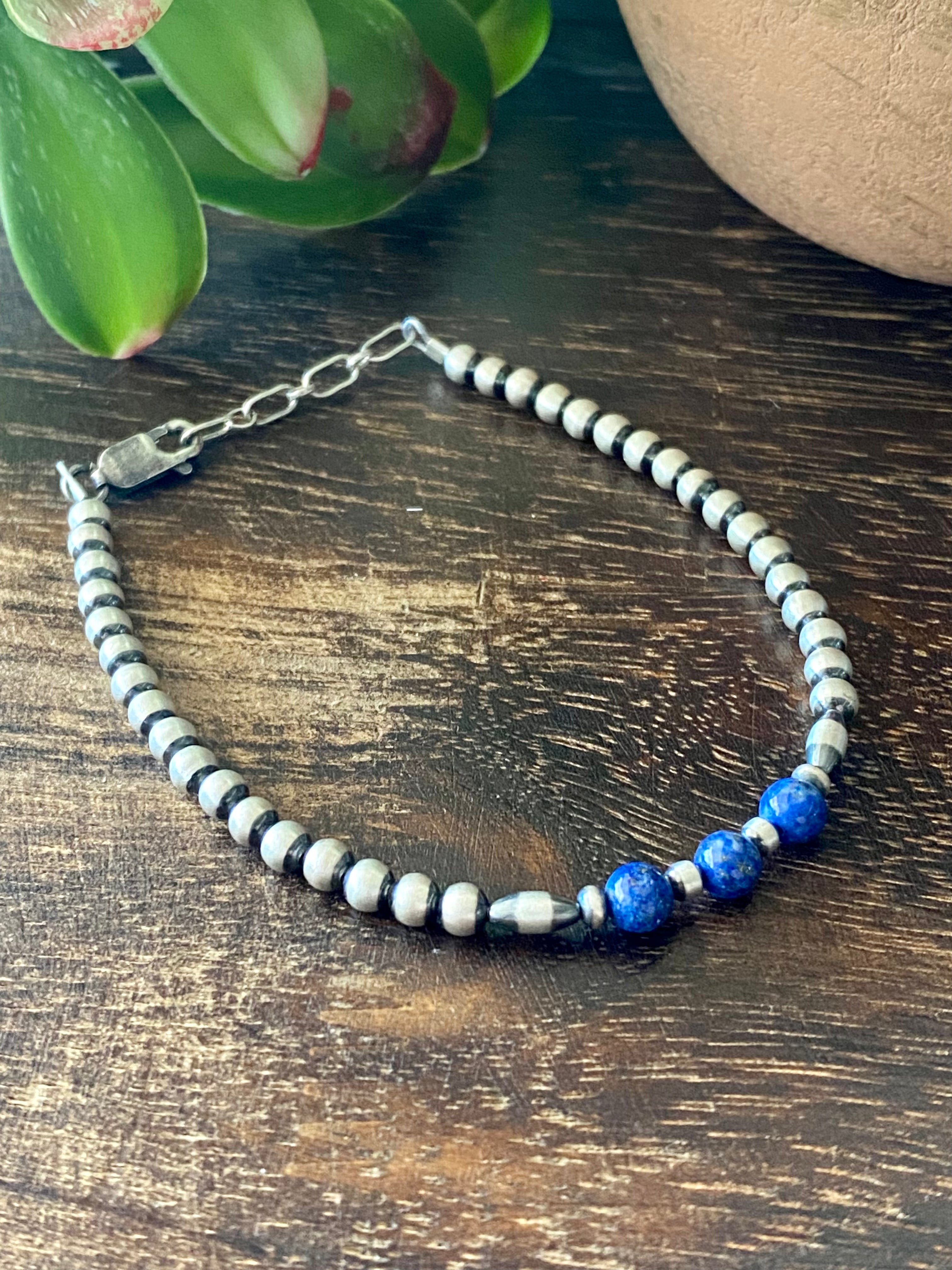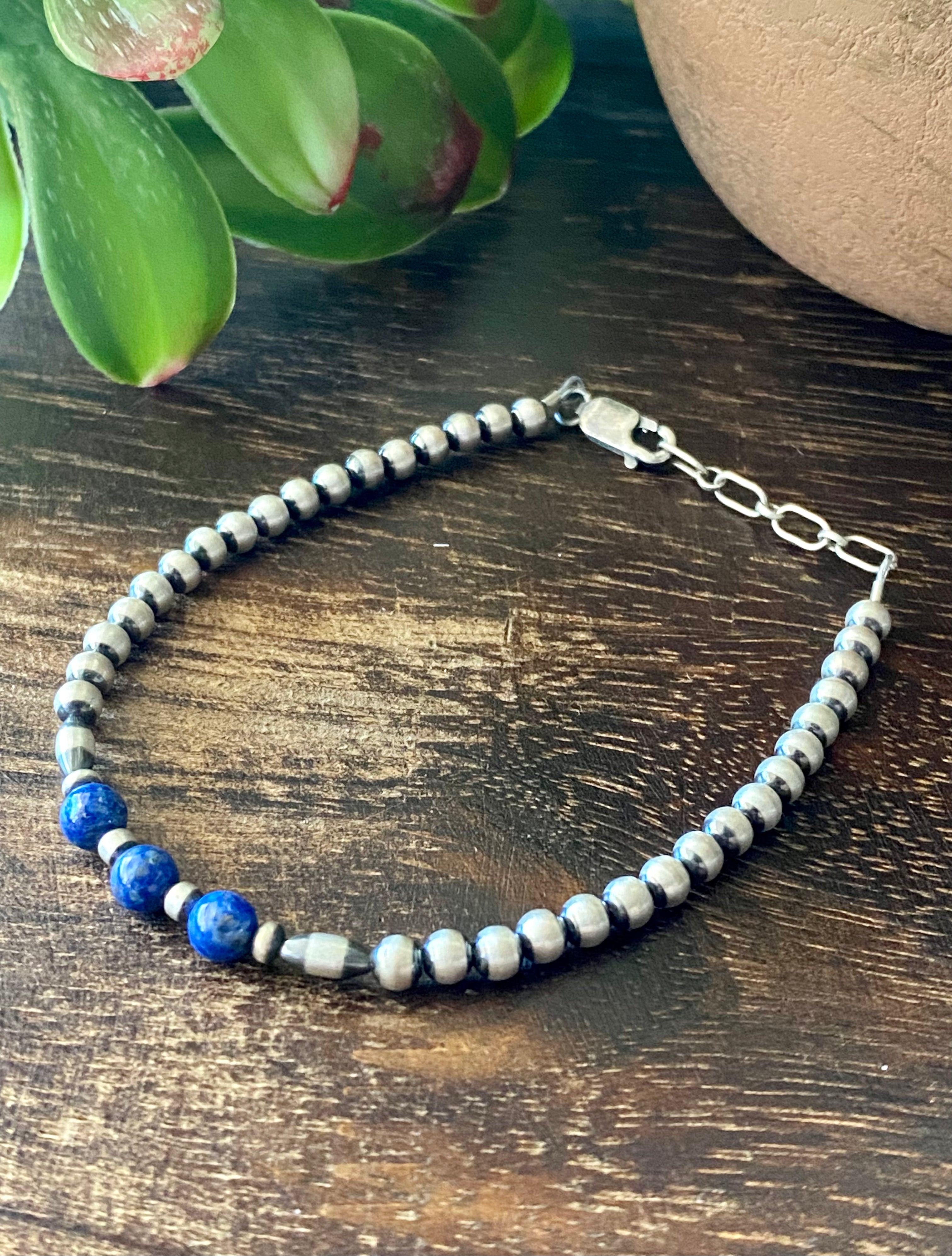 Navajo Made Lapis & Sterling Silver Pearl Bracelet. It measures 8 1/4 inches long but can adjust down to 7 1/2 inches. Stones may differ due to natural stones.