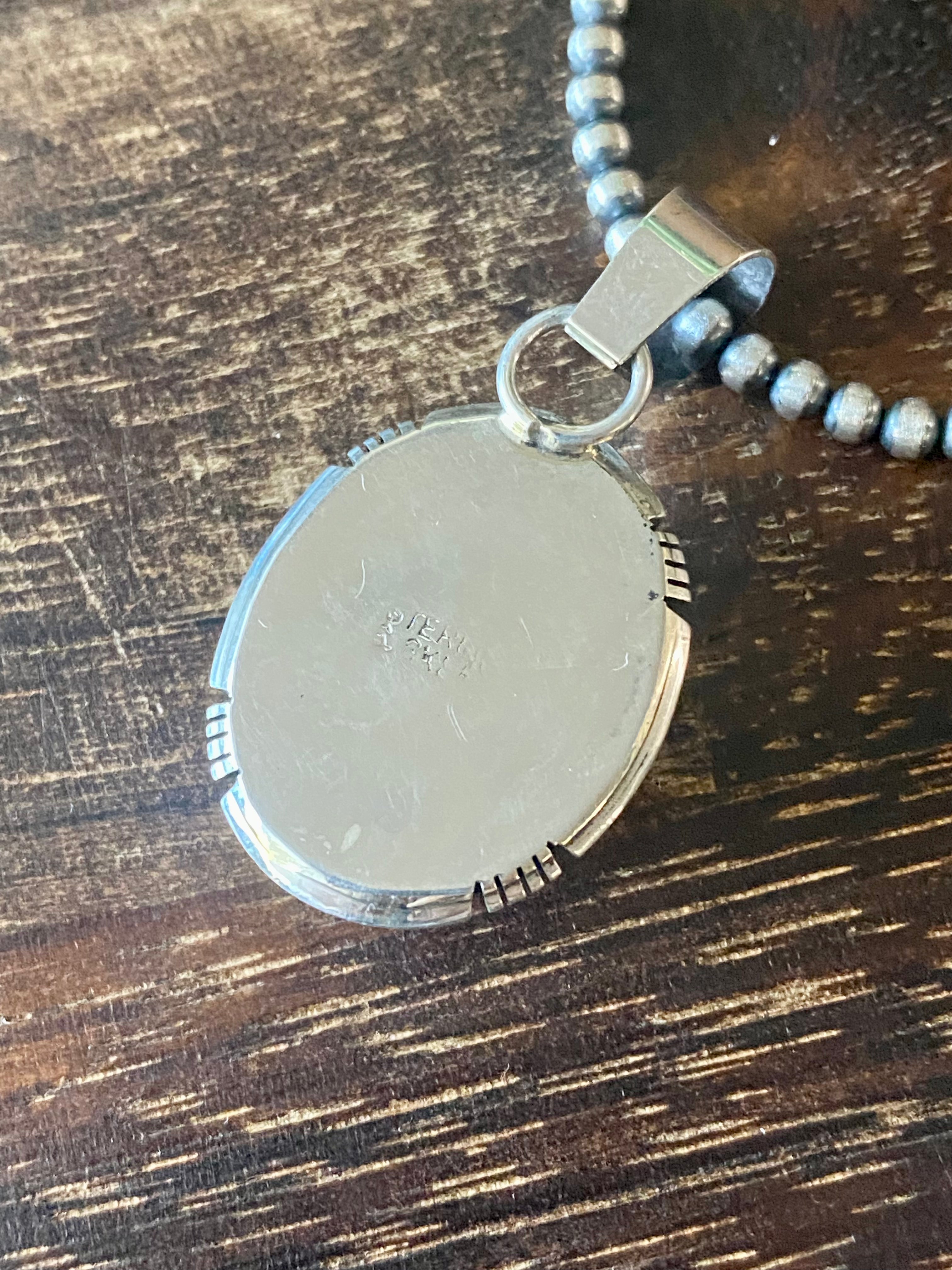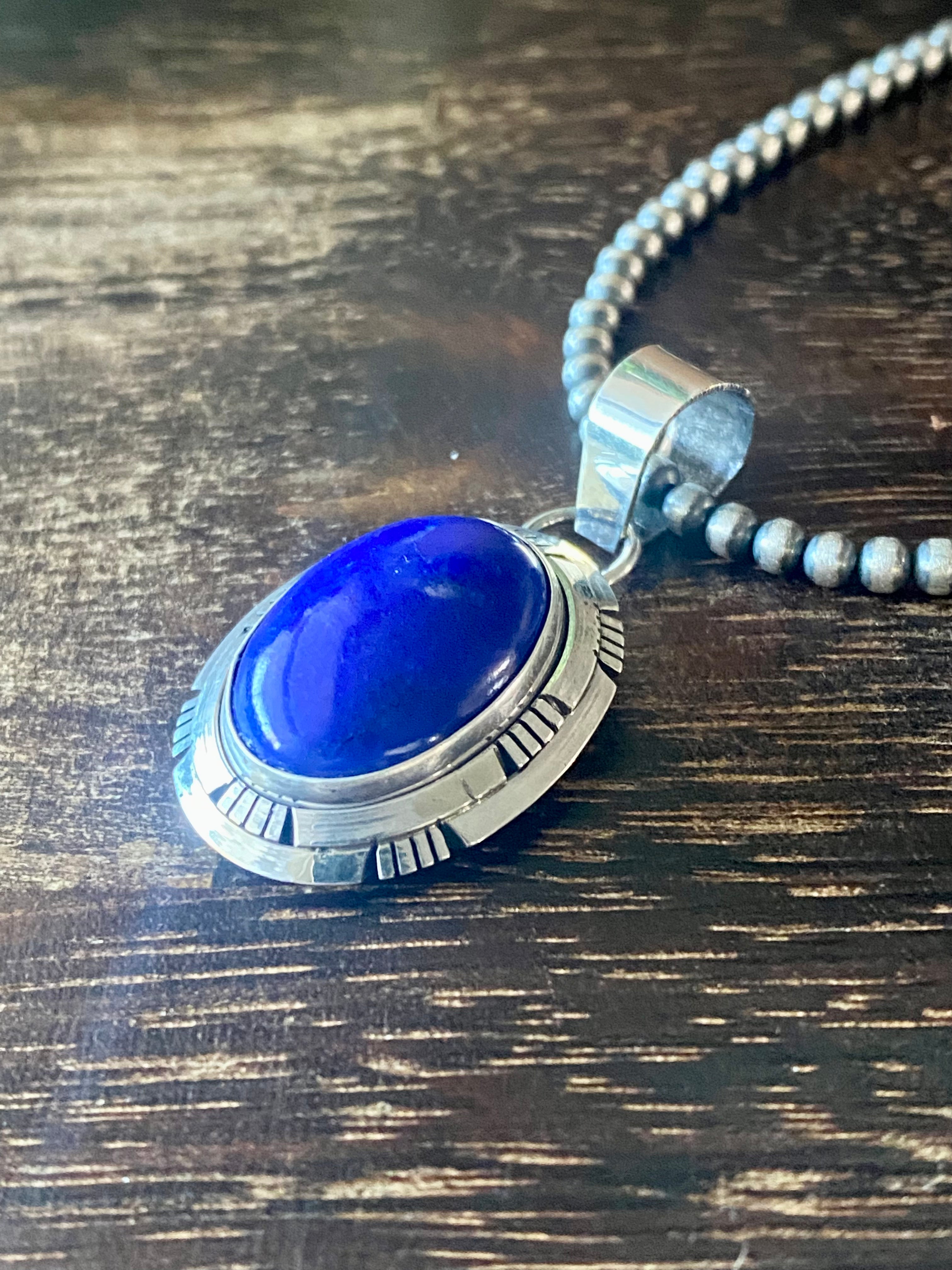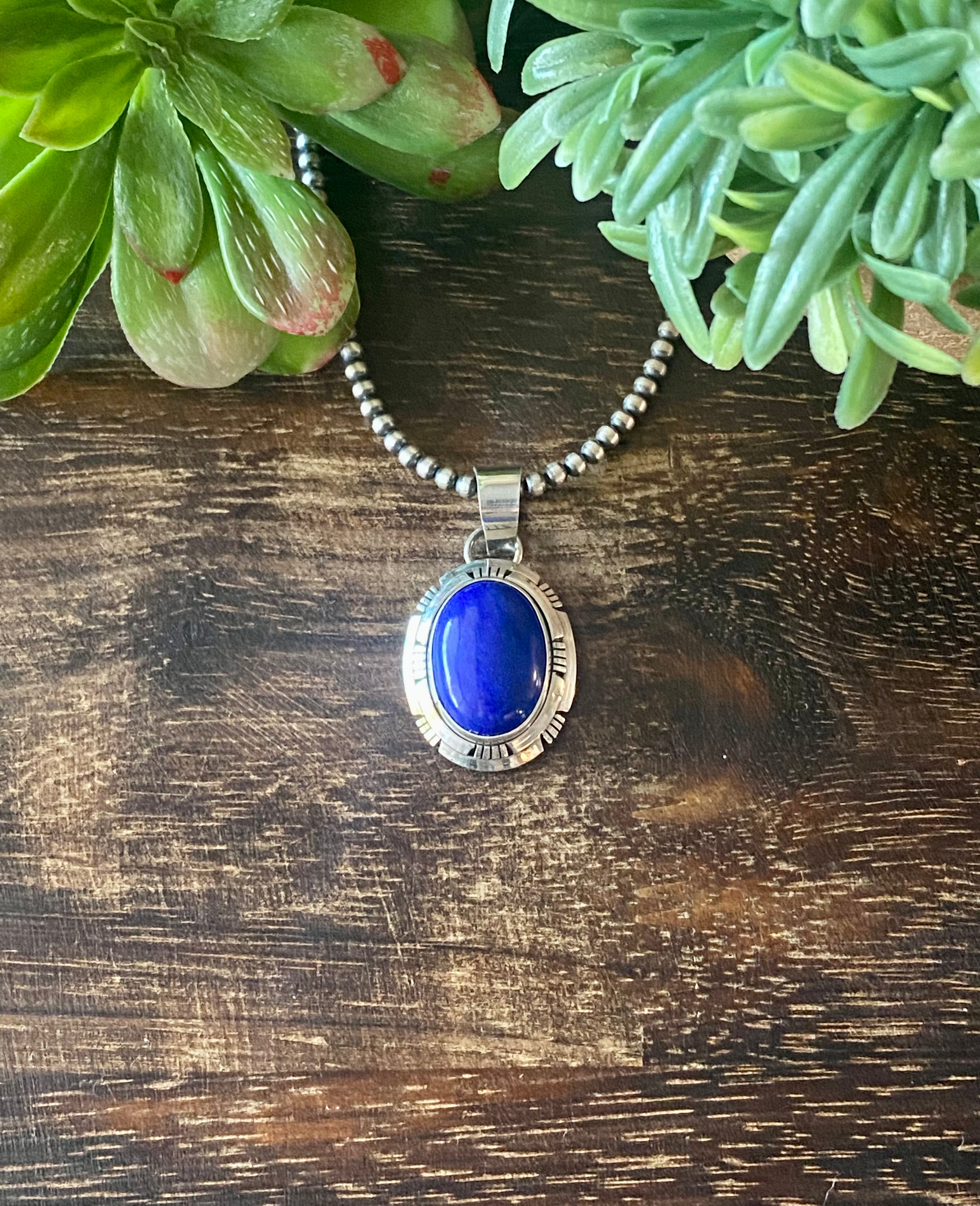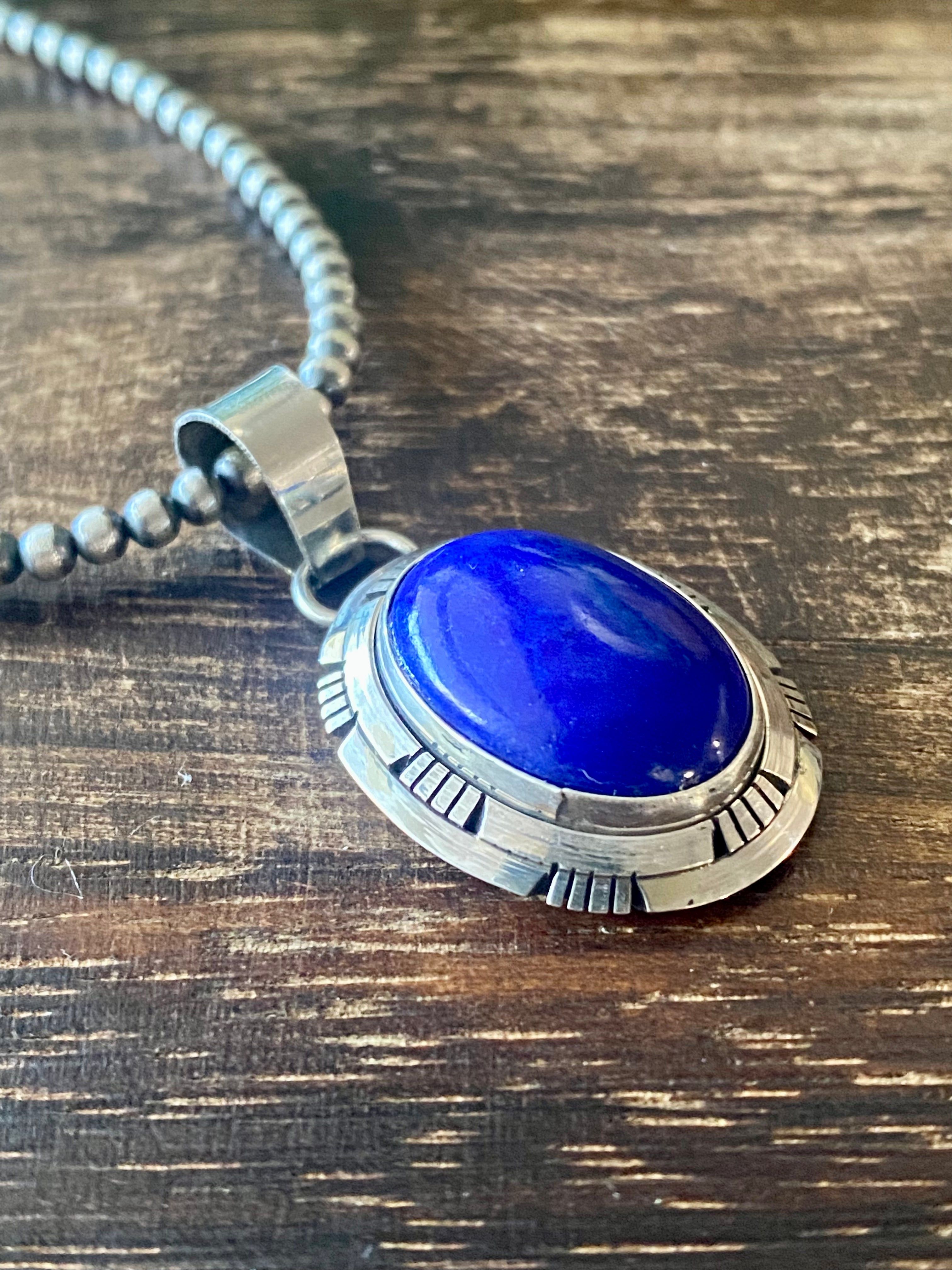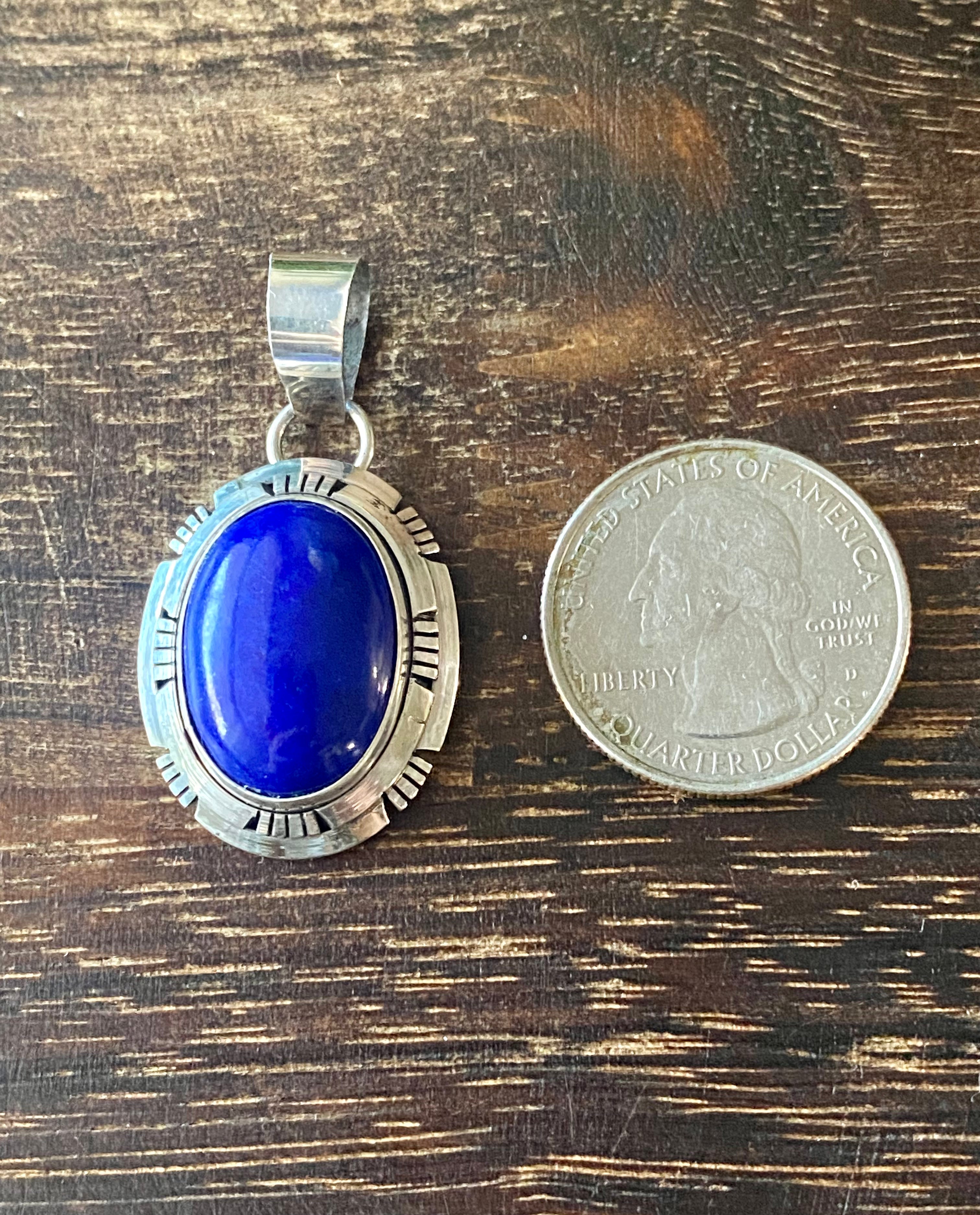 Navajo Made Lapis & Sterling Silver Pendant. It measures 1 5/8 inches long and 7/8 of an inch wide. Stones will differ due to natural stones. Pendant Only!! Signed by the artist and stamped sterling silver.