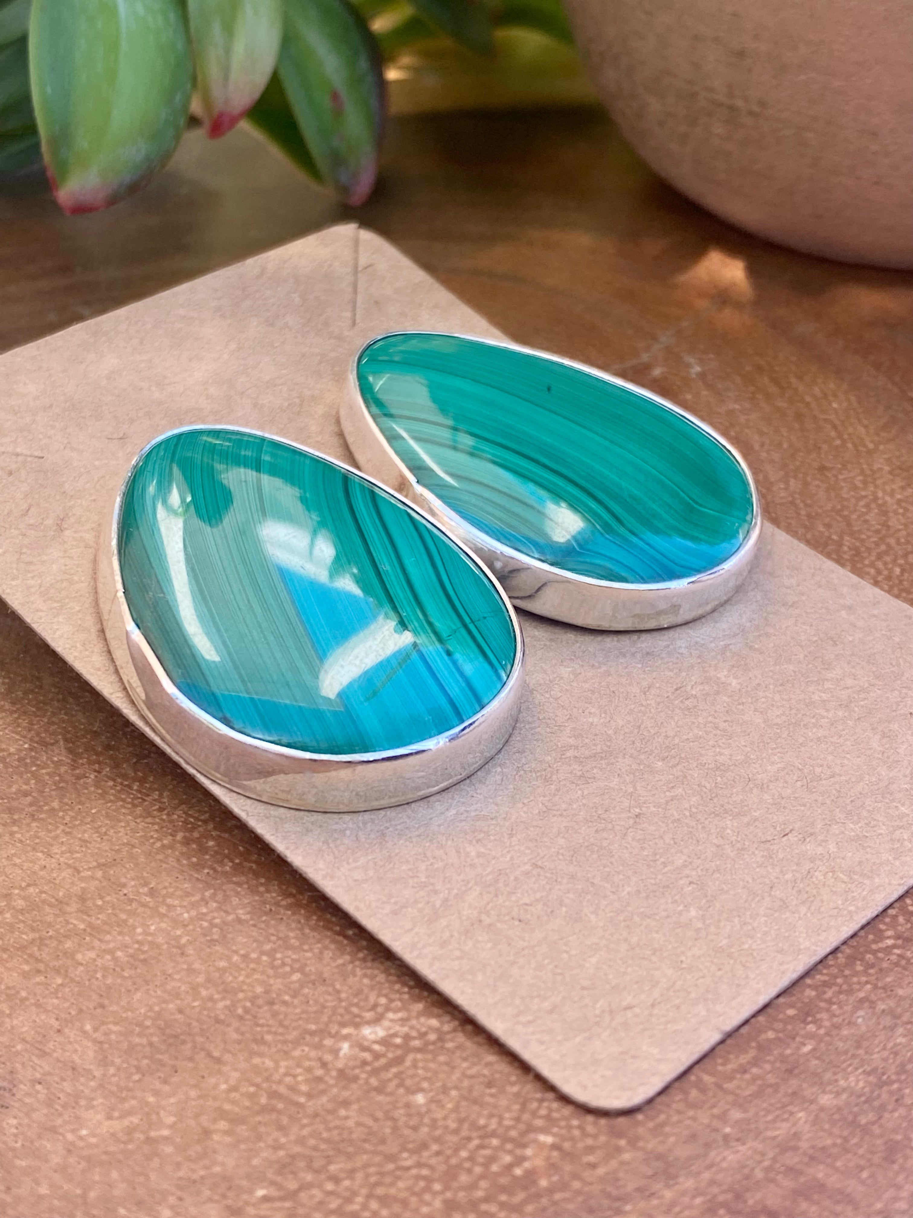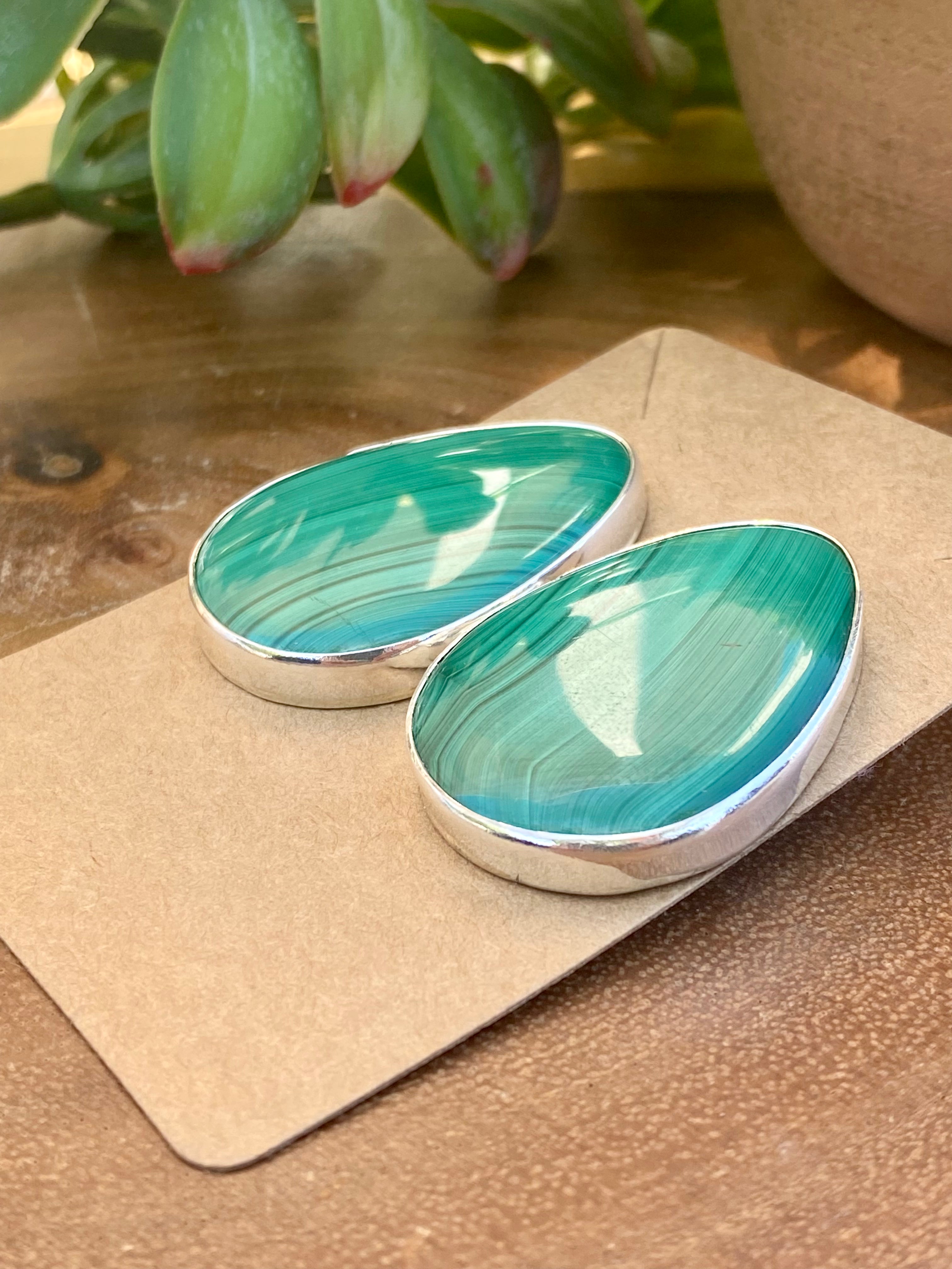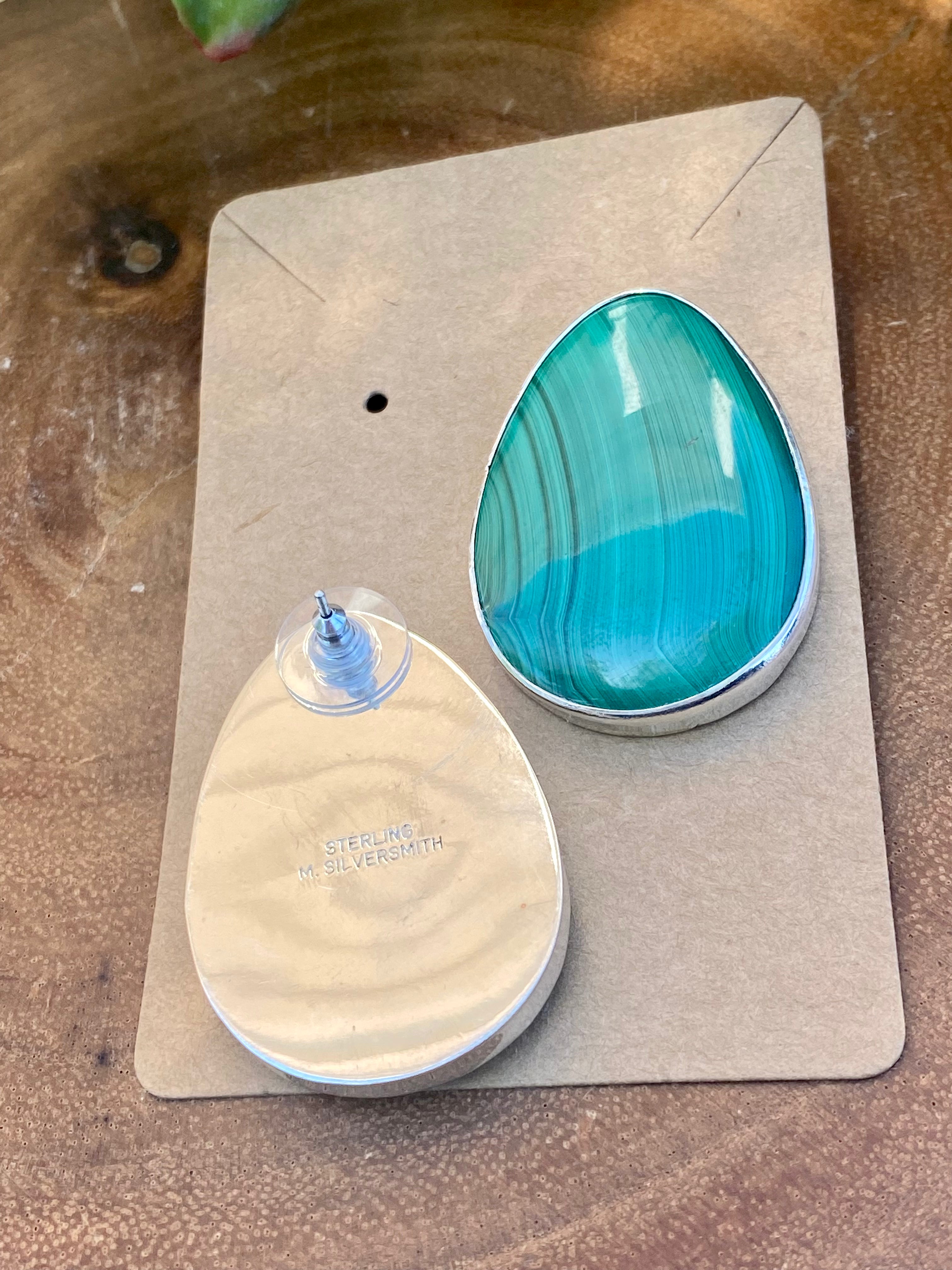 Navajo Made Malachite & Sterling Silver Post Dangle Earrings. They measure 1 5/8 inches long and just over 1 1/8 inches wide. Signed by the artist and stamped sterling silver. They are just gorgeous!!