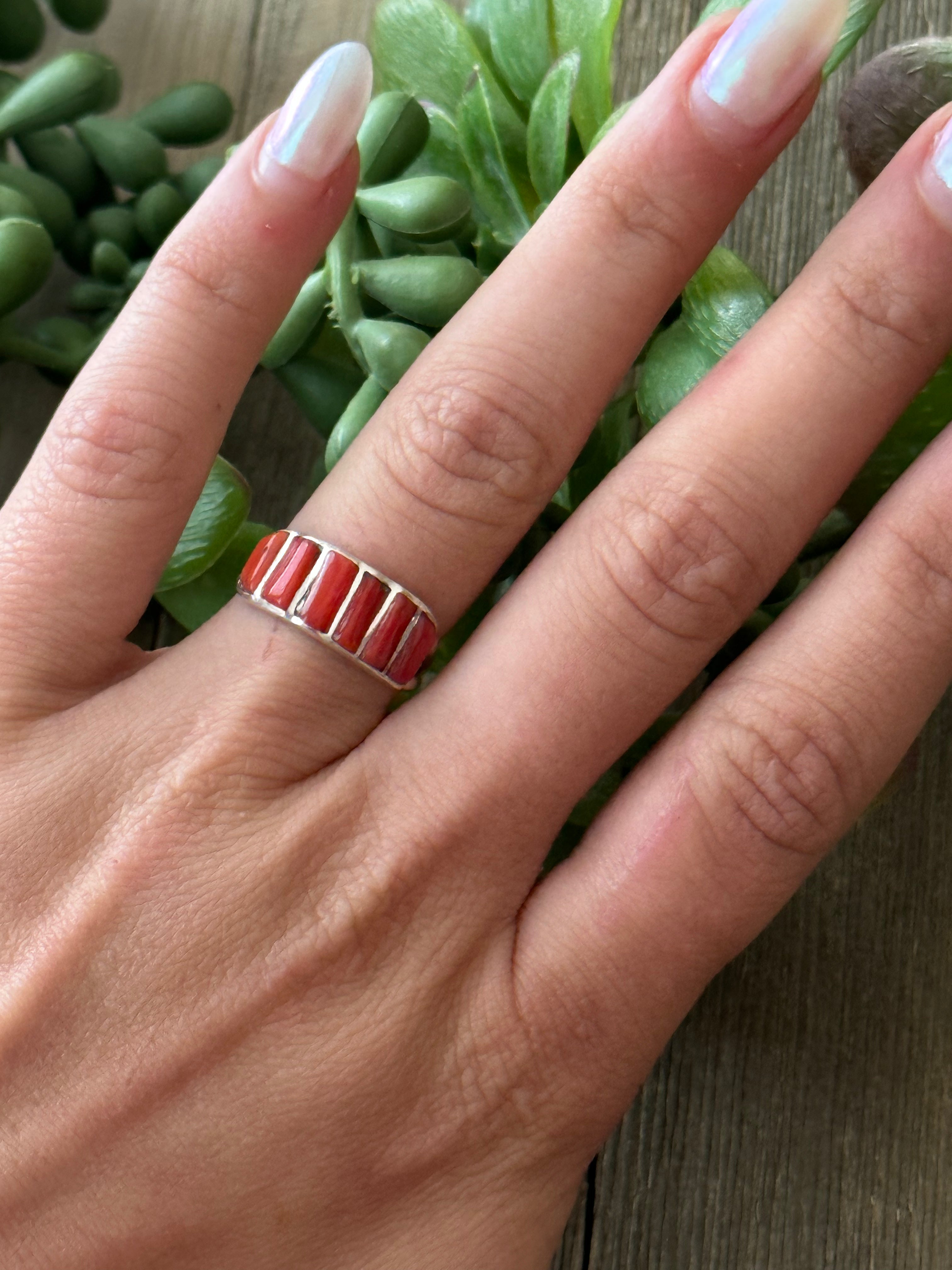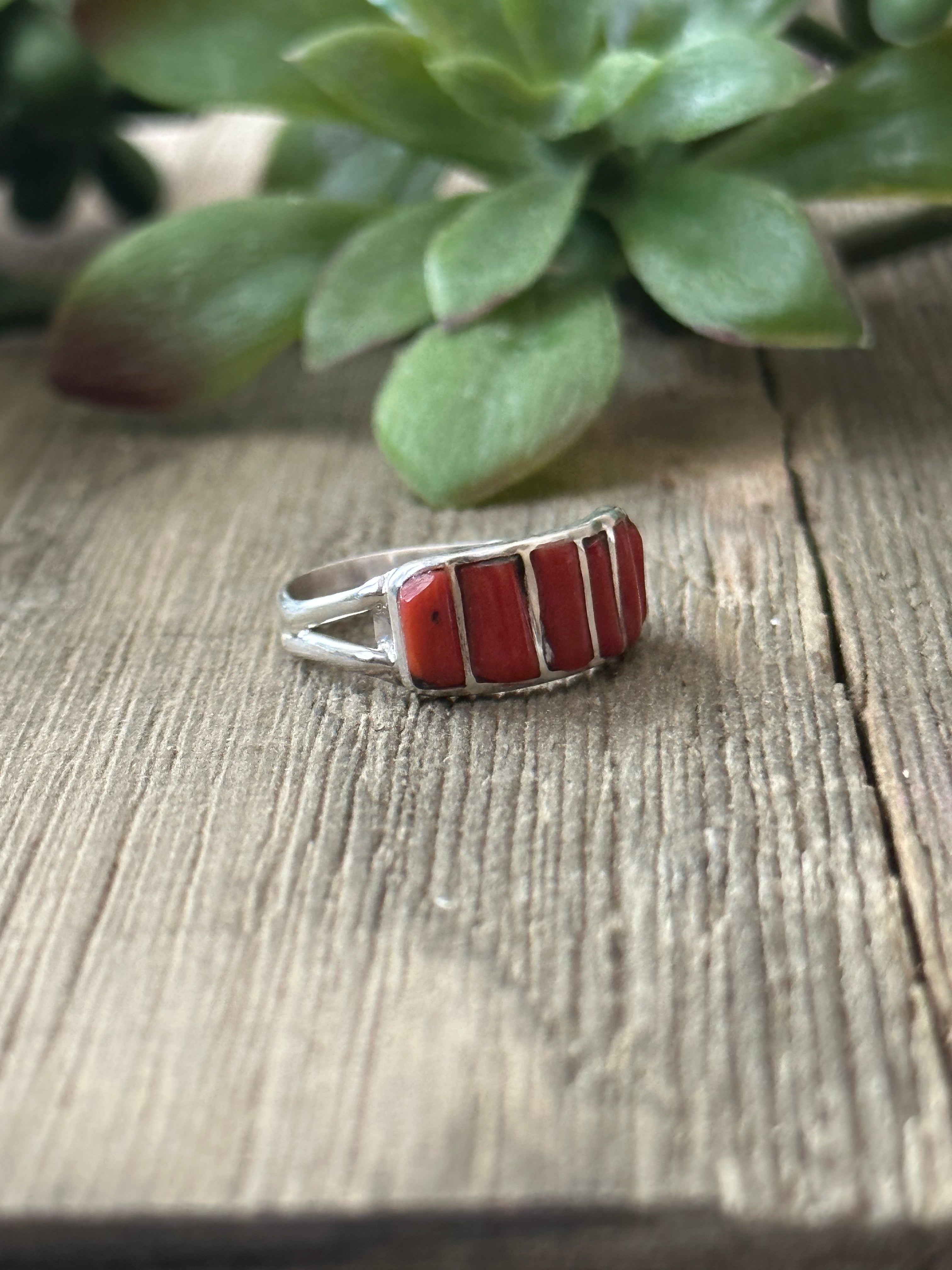 Navajo Made Mediterranean Coral & Sterling Silver Ring. It measures 3/8 of an inch long. Signed by artist and stamped sterling silver.