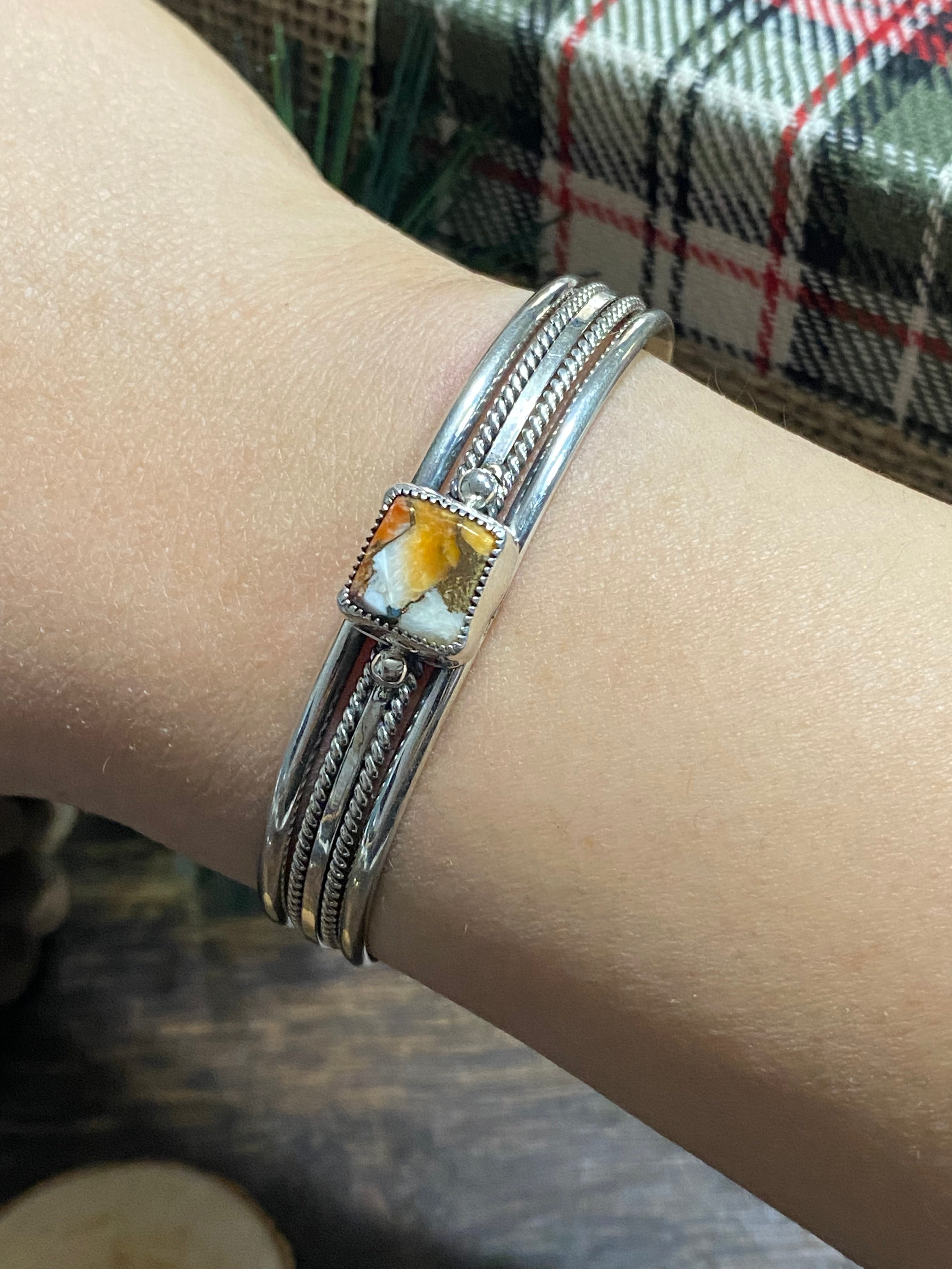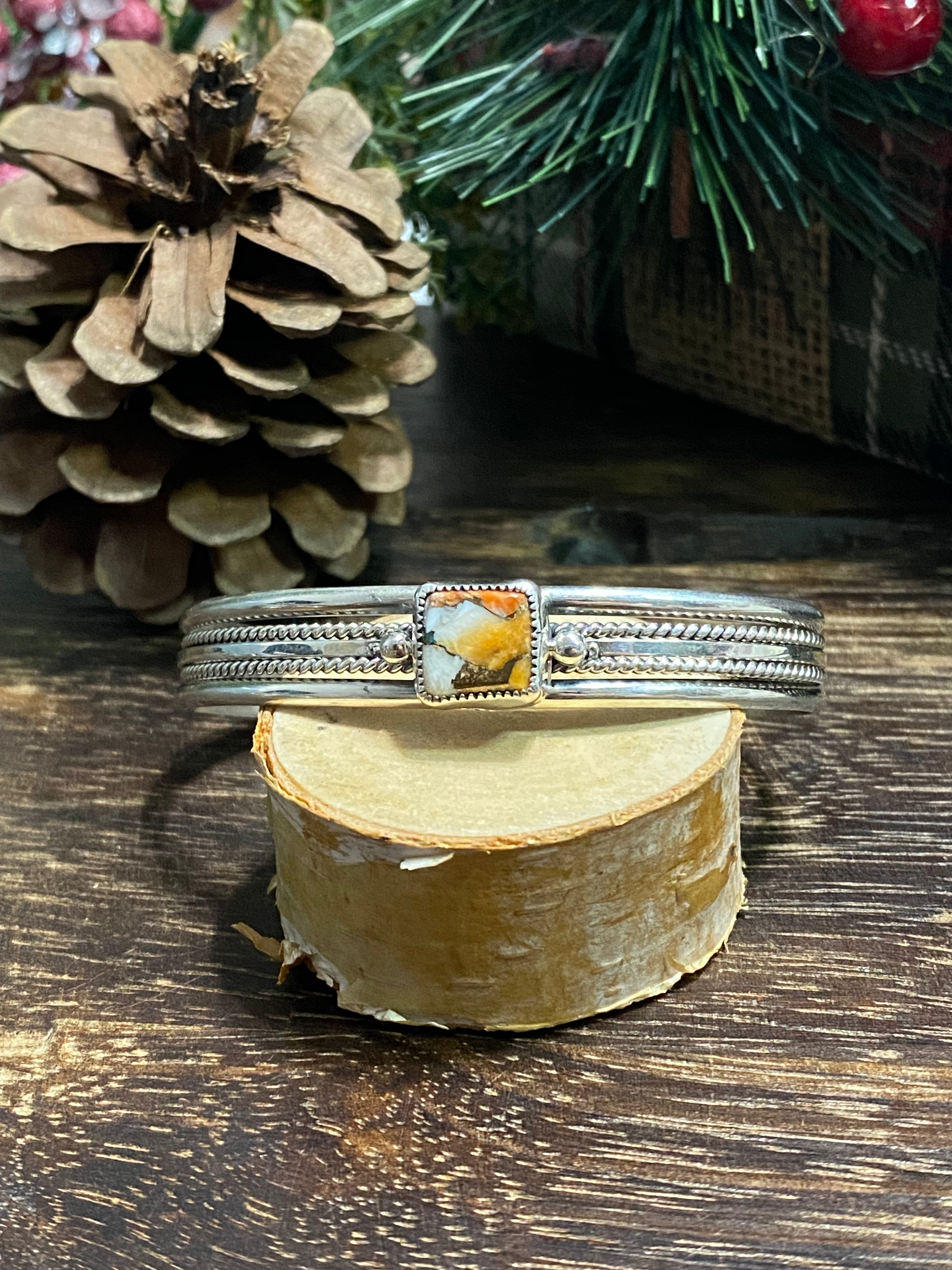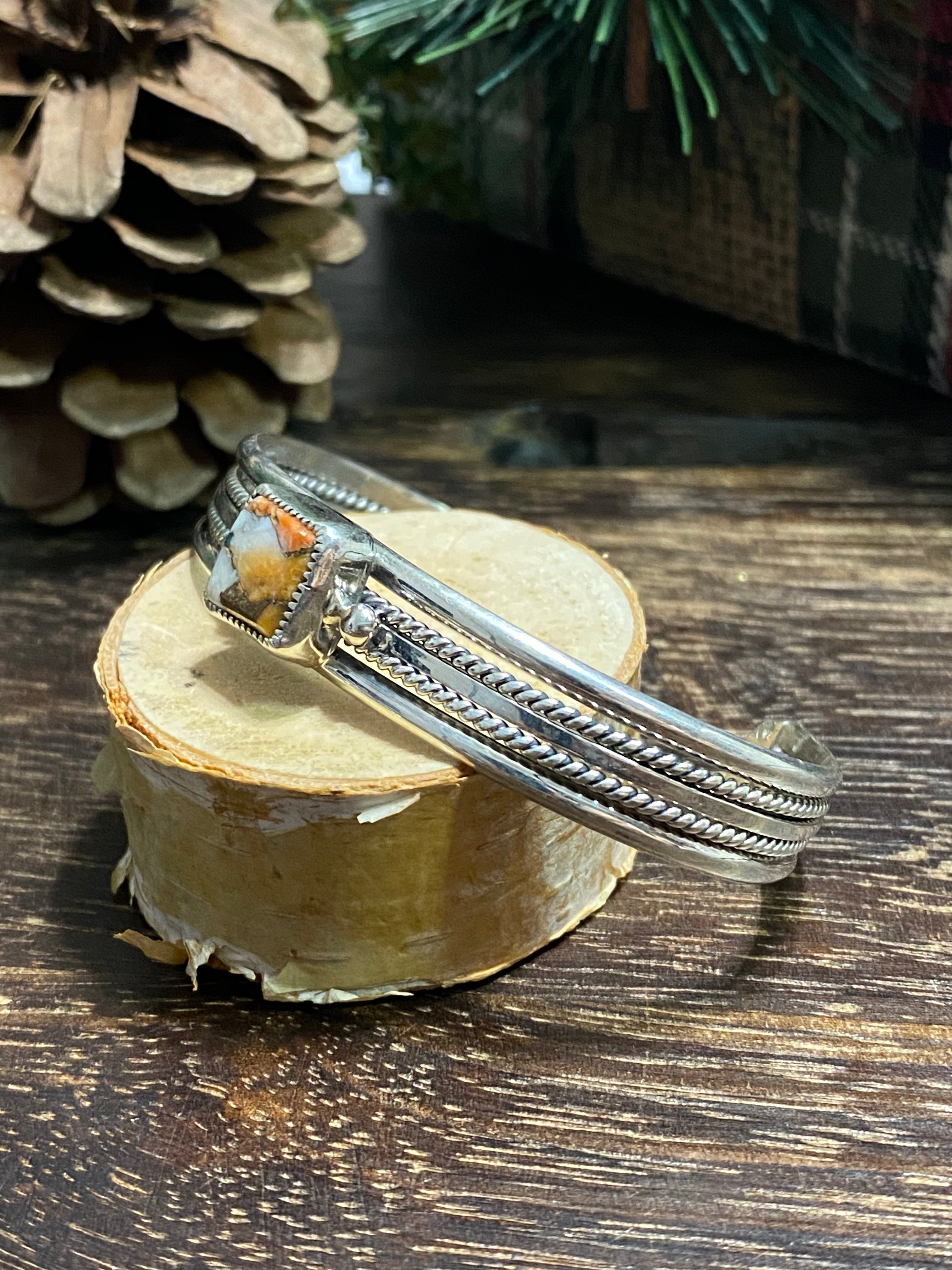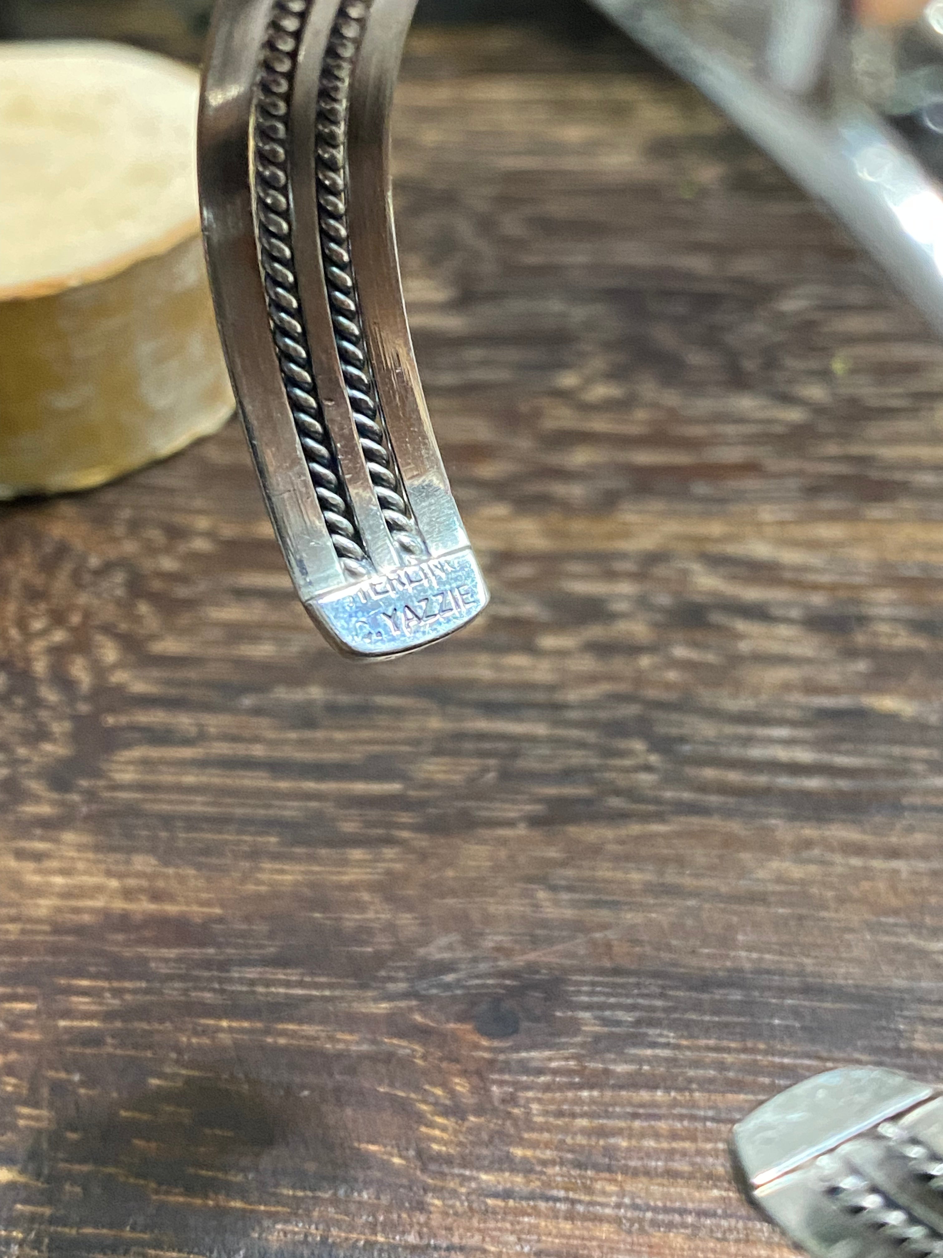 Navajo Made Mohave Turquoise & Sterling Silver Cuff Bracelet. It measures just under 1/2 of an inch wide with an inside circumference of 5 1/2 inches and a gap of 1 inch. Signed by the artist and stamped sterling silver.