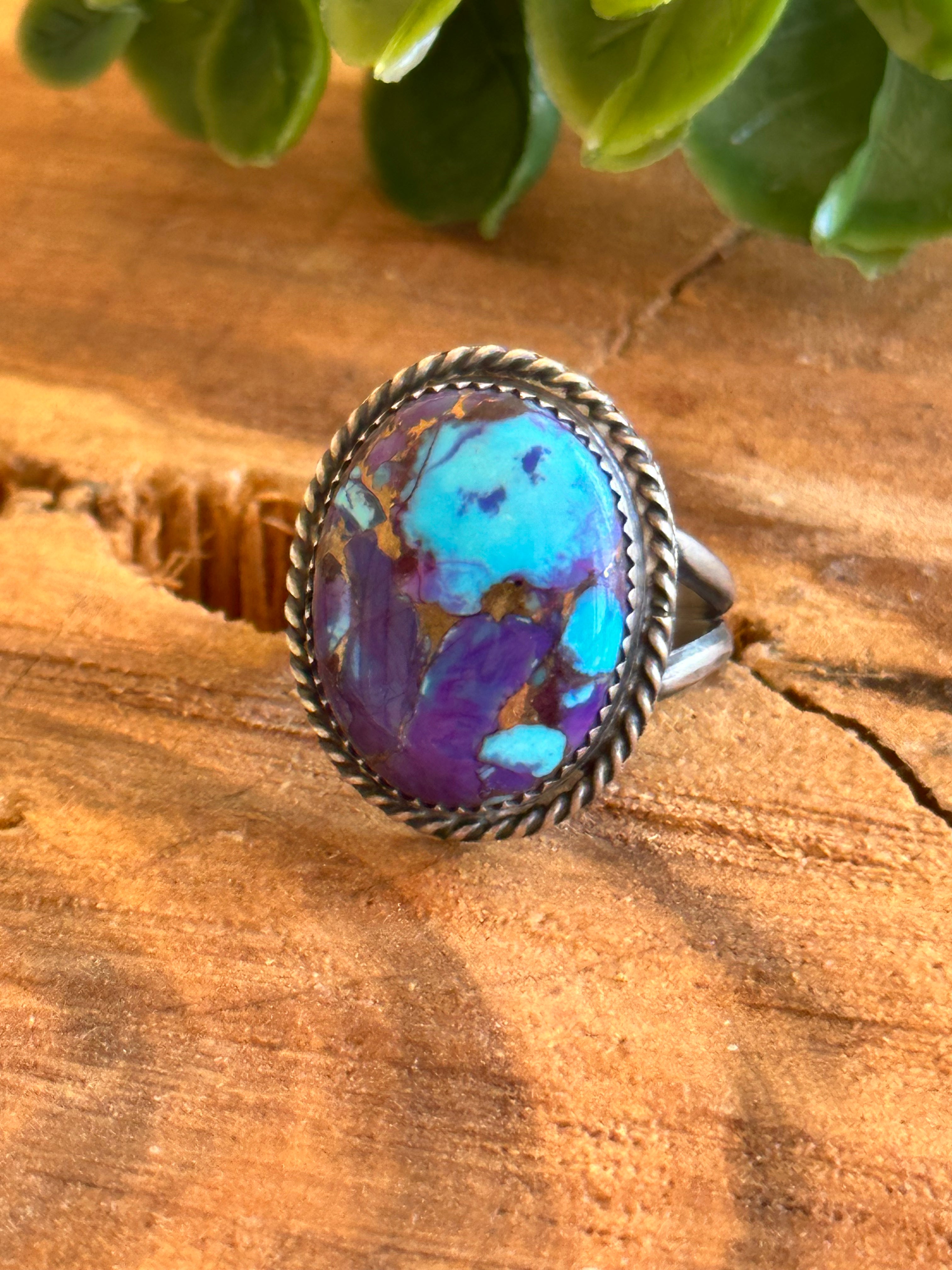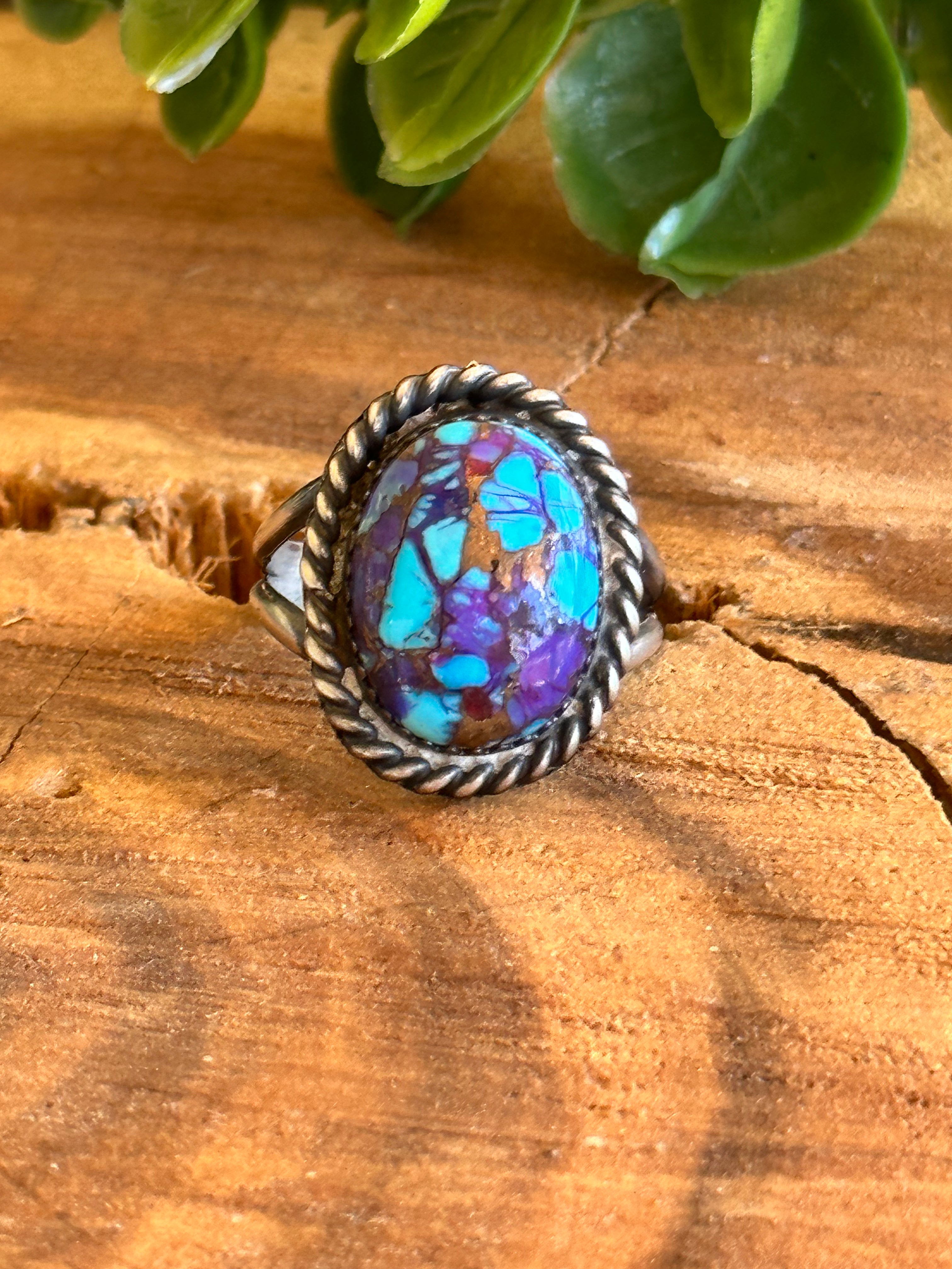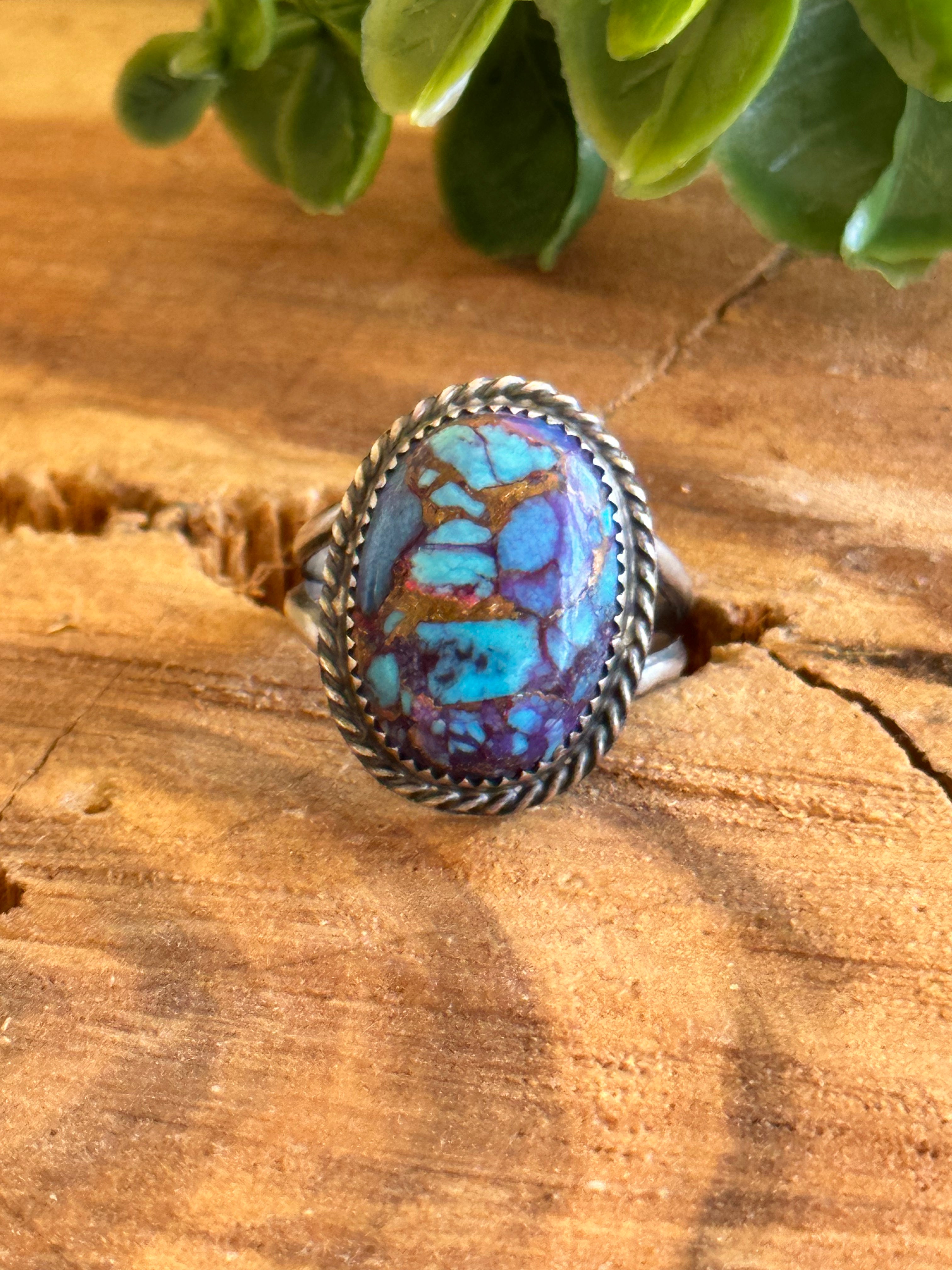 Beautiful ring Navajo Made Mohave Turquoise & Sterling Silver Ring. It measures 3/4 of an inch long and 5/8 of an inch wide. Signed by the artist and stamped sterling silver.