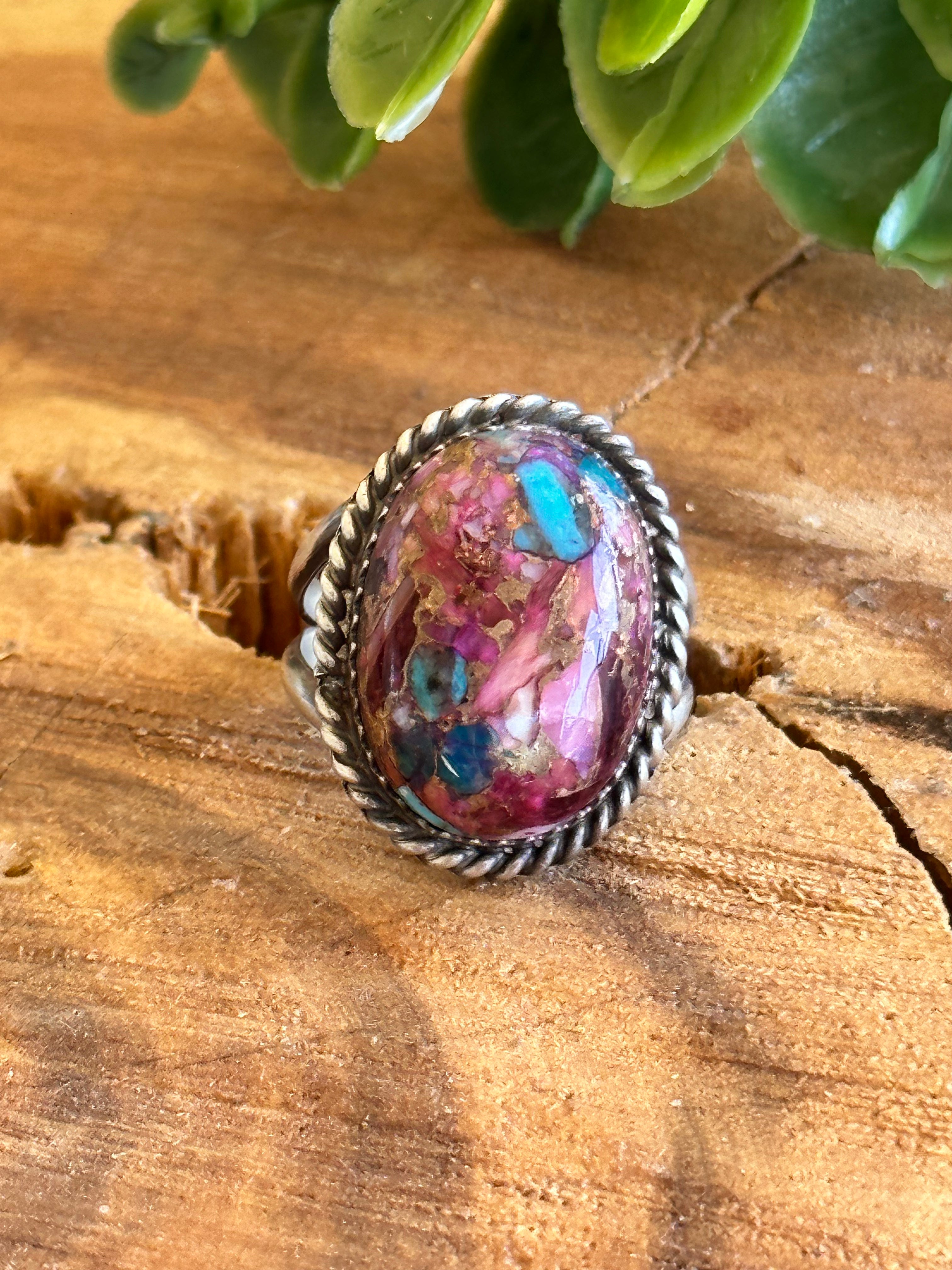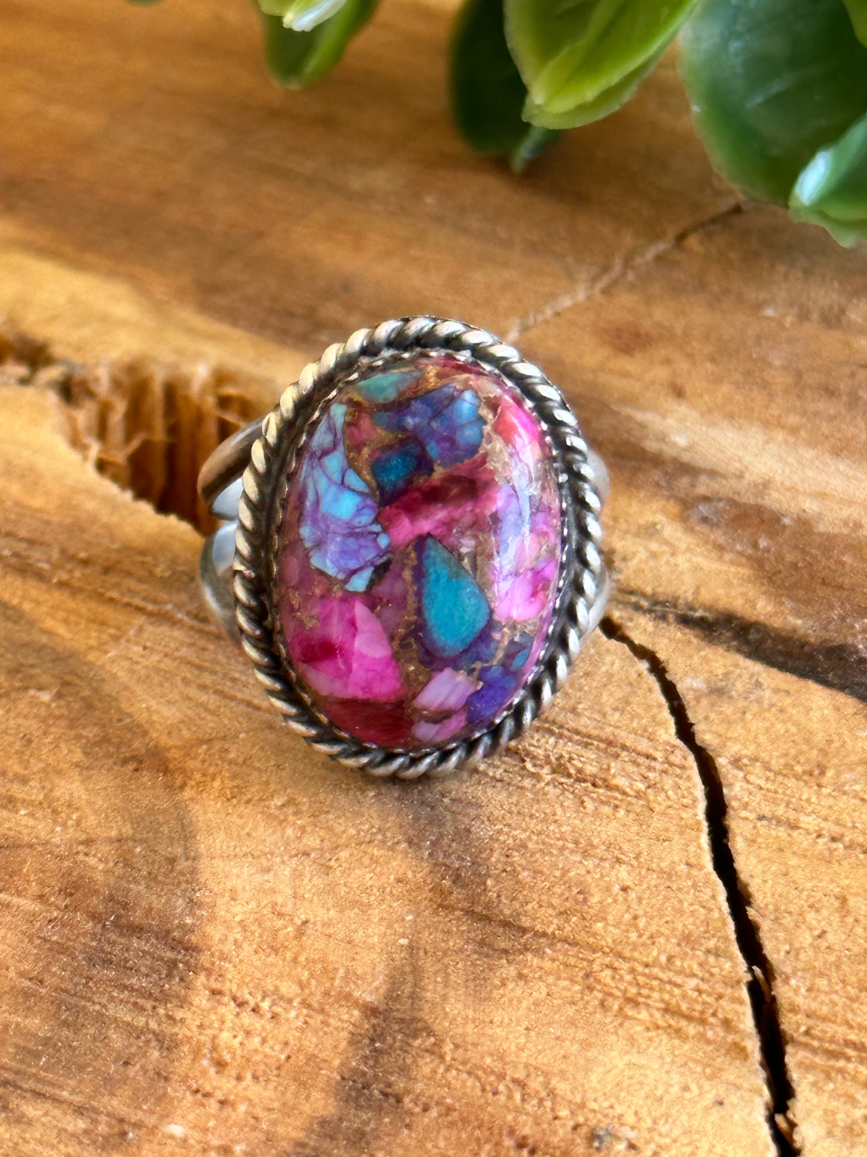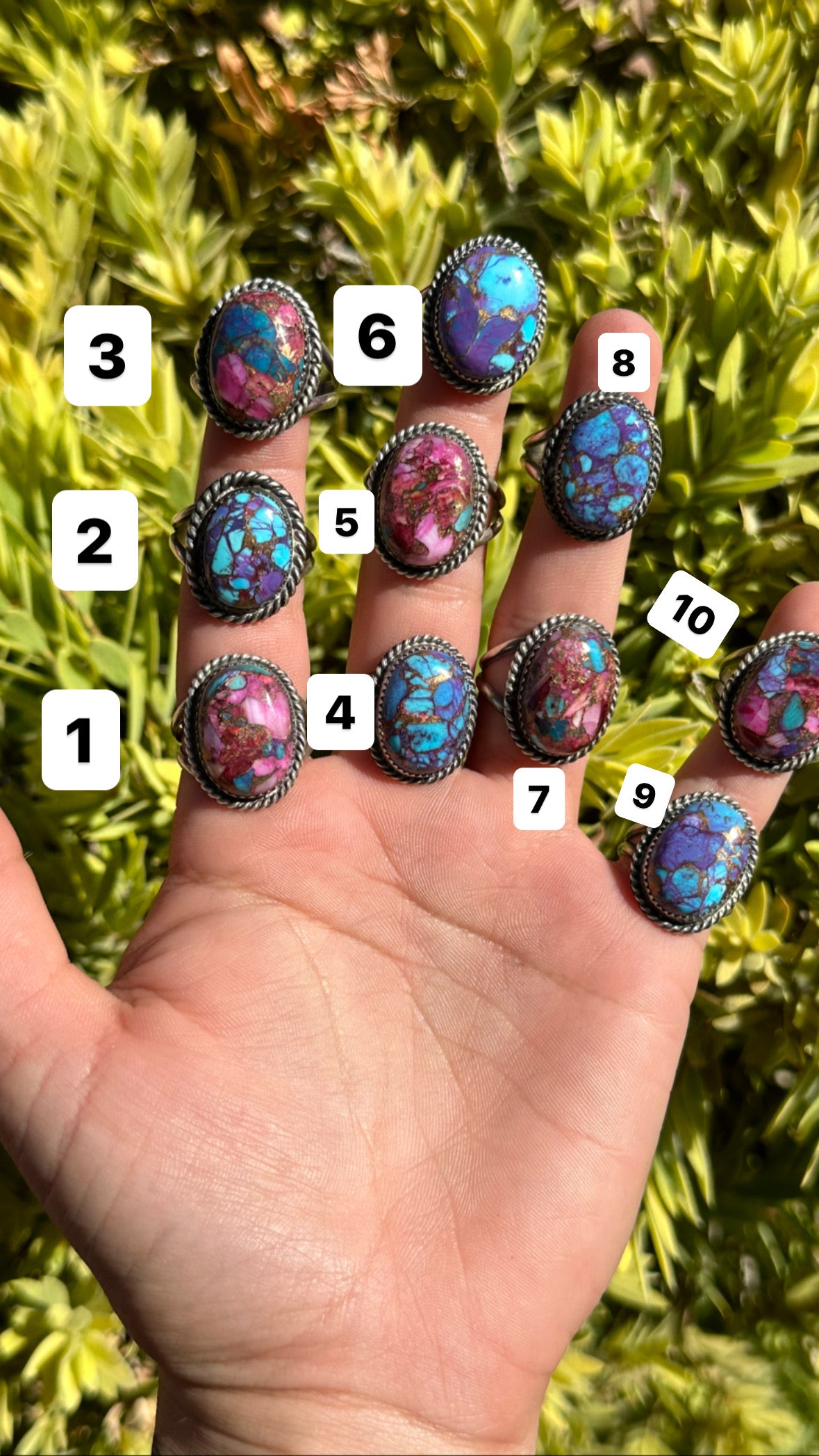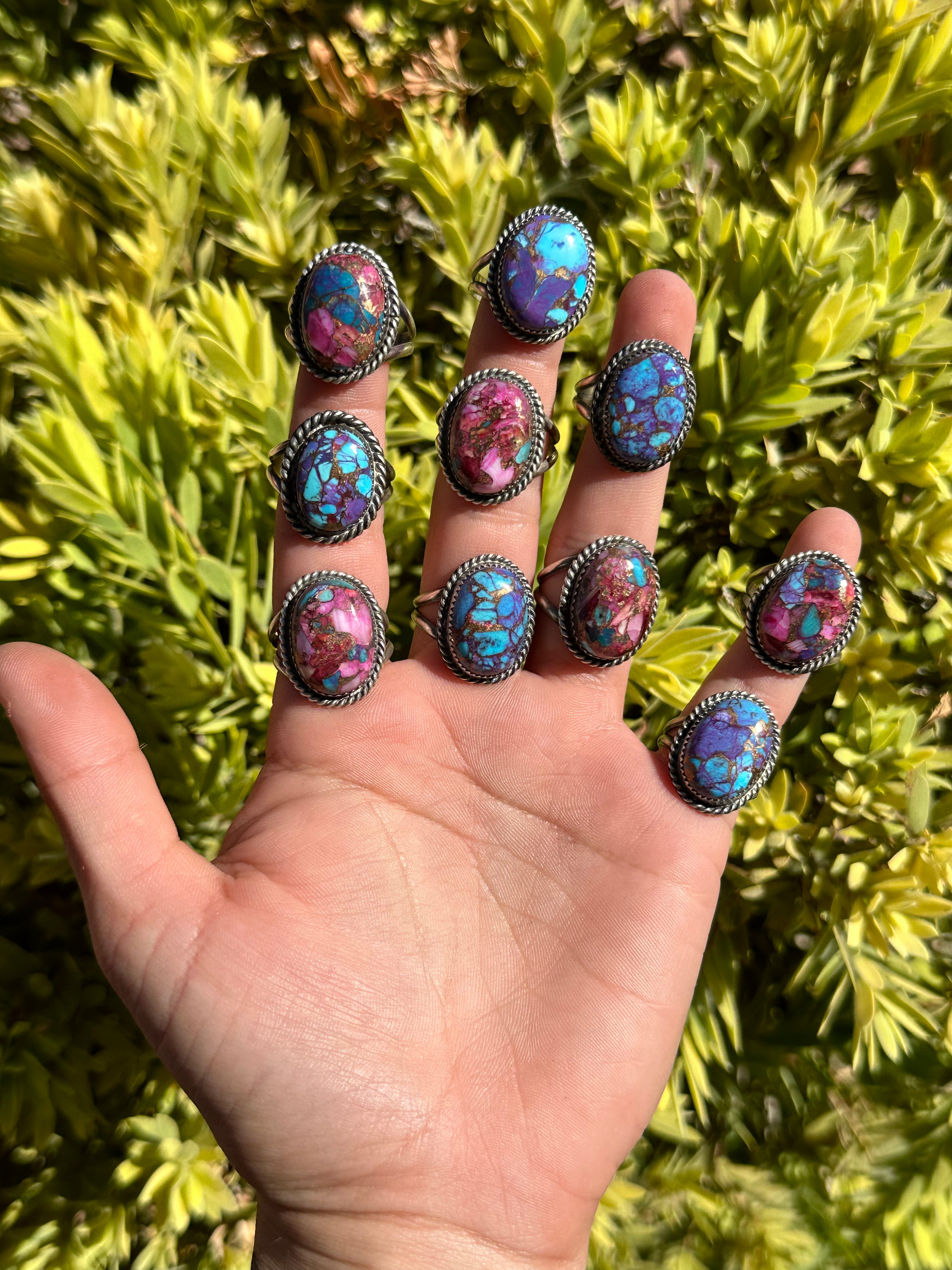 Beautiful ring Navajo Made Mohave Turquoise & Sterling Silver Ring. It measures 3/4 of an inch long and 5/8 of an inch wide. Signed by the artist and stamped sterling silver.