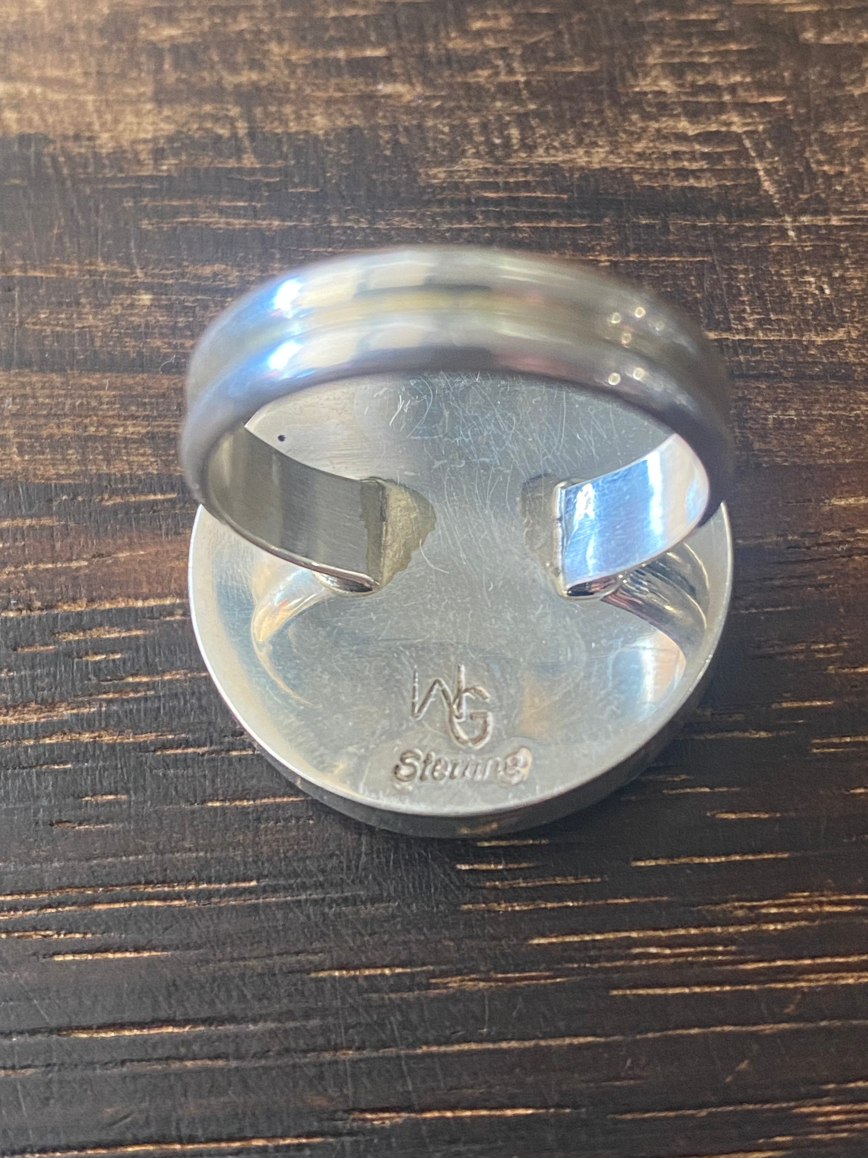 Navajo Made Mohave Turquoise & Sterling Silver Ring Size 9.5. It measures 1 inch round. Signed by the artist and stamped sterling silver.