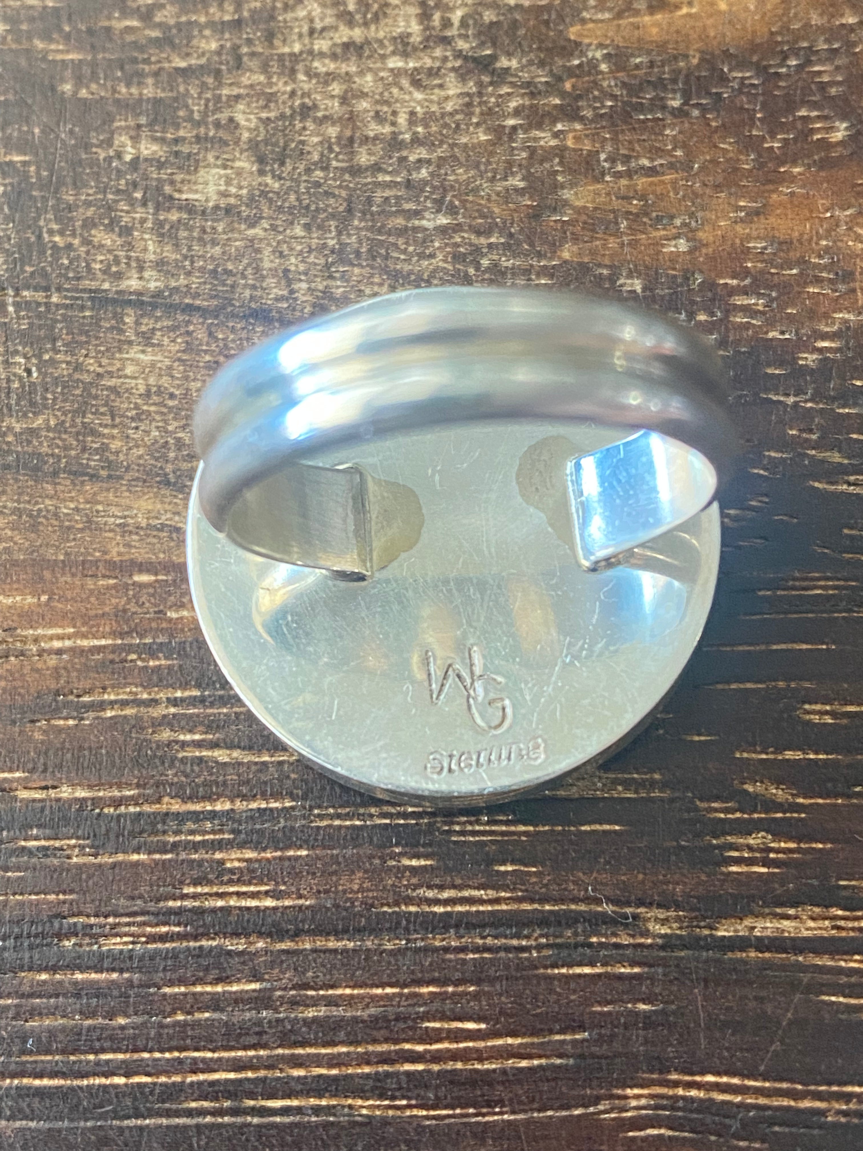 Navajo Made Mohave Turquoise & Sterling Silver Ring Size 9.5. It measures 1 inch round. Signed by the artist and stamped sterling silver.