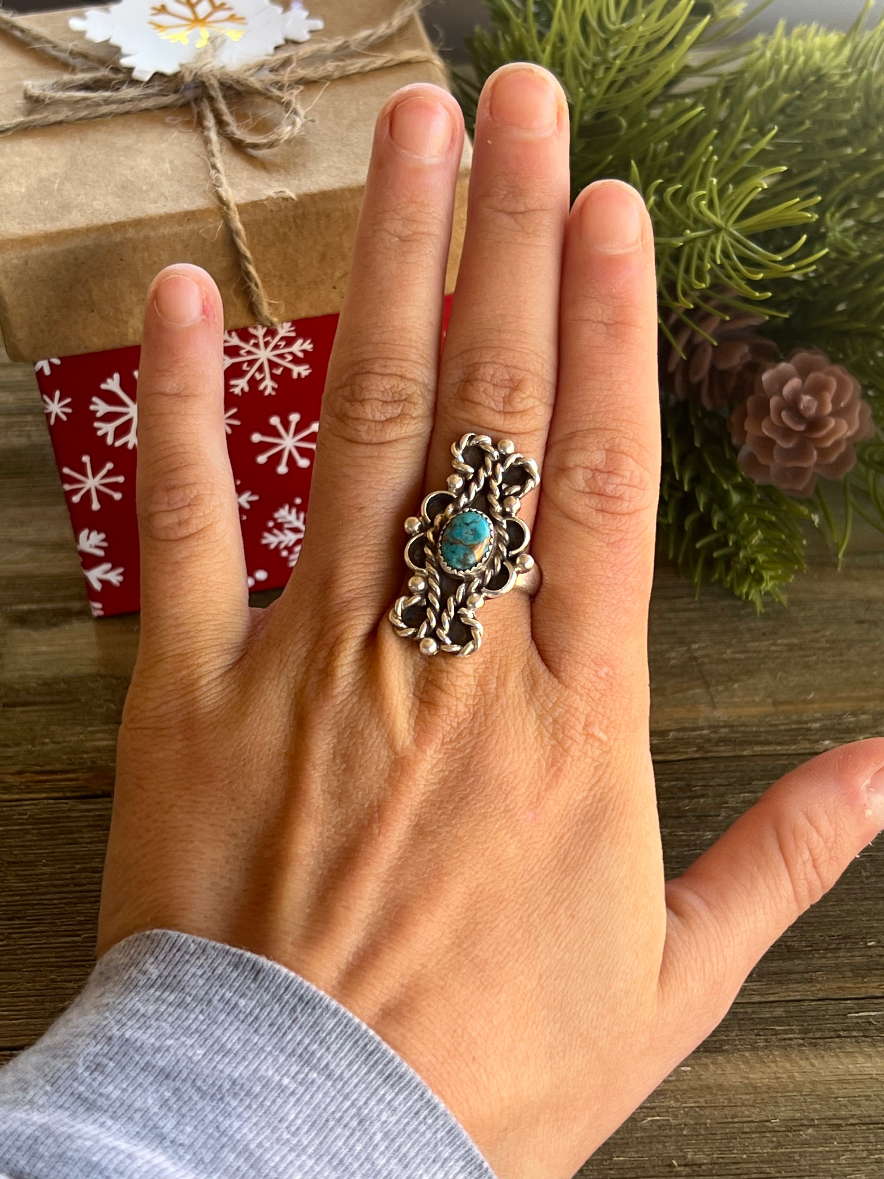 Navajo Made Mohave Turquoise & Sterling Silver Ring Size 9.5. It measures over 1 1/4 inches long and 3/4 of an inch wide. Signed by artist and stamped sterling silver.