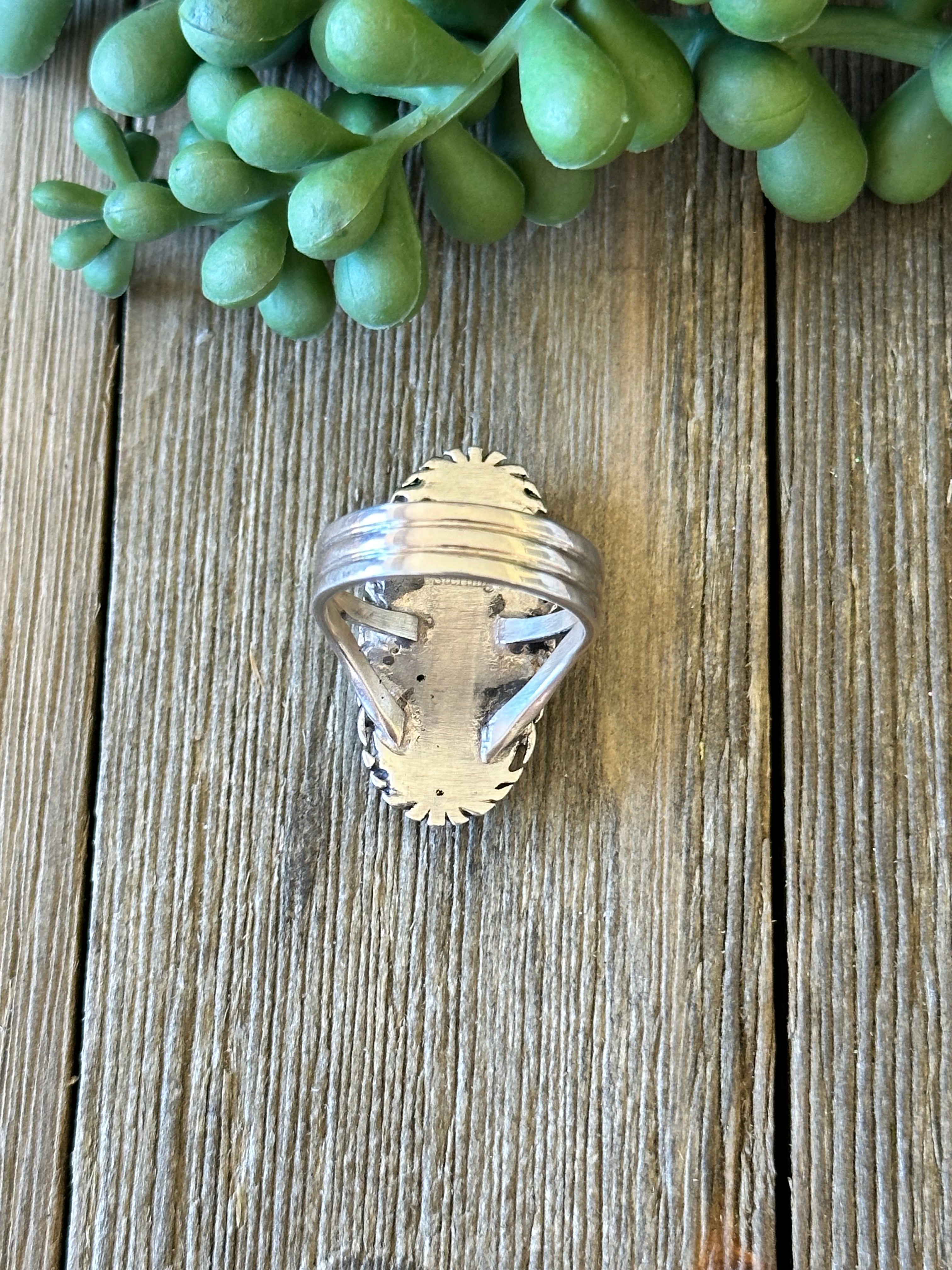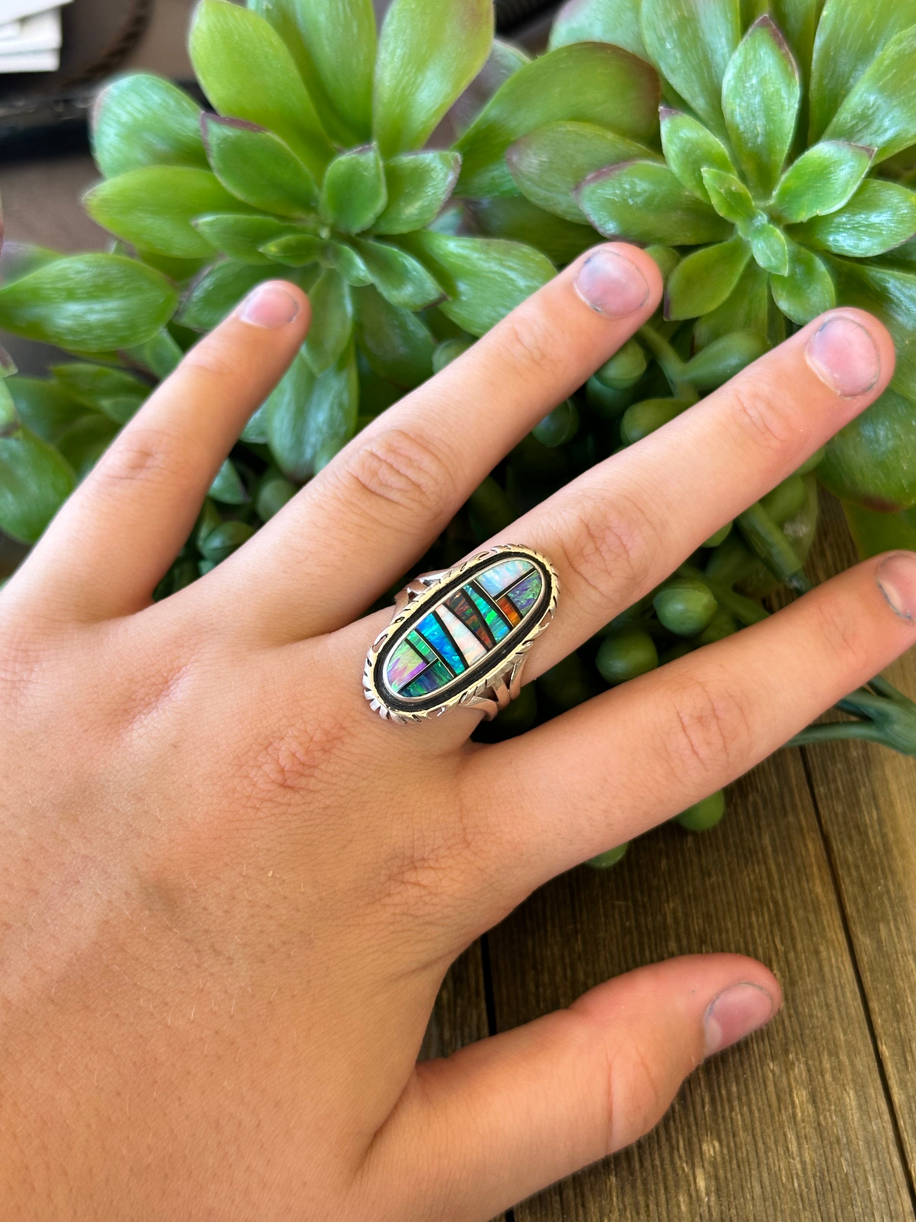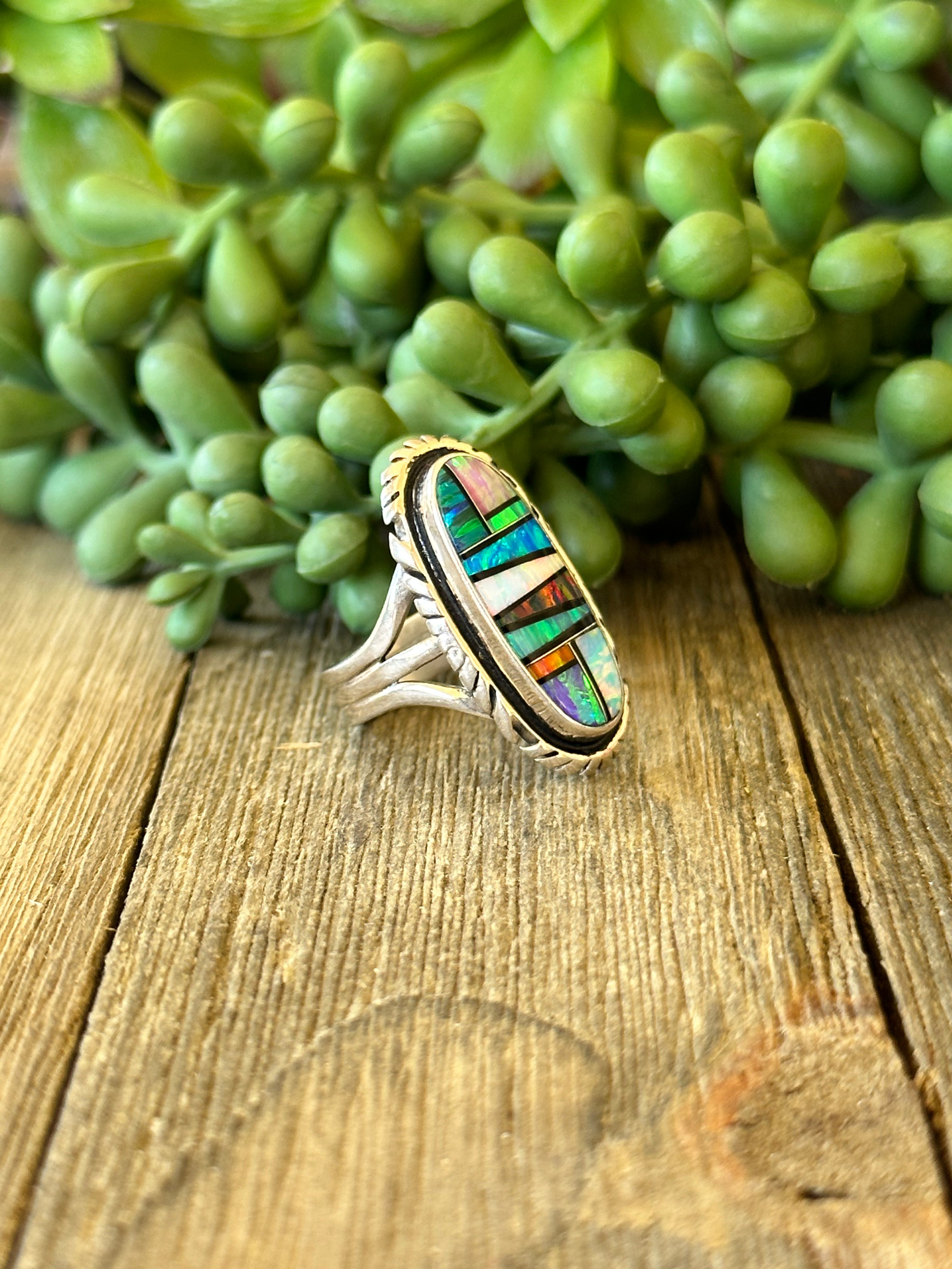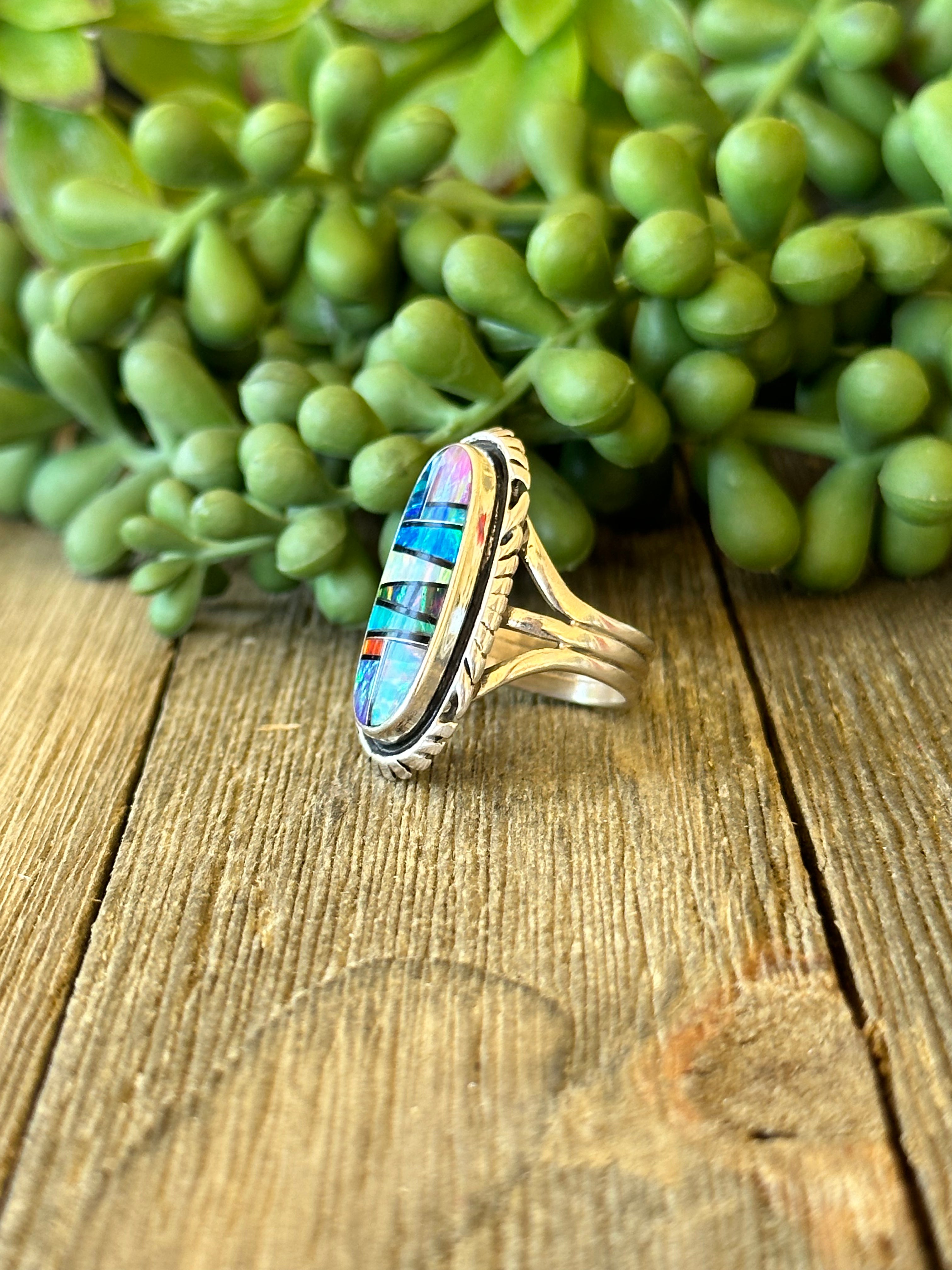 A beautiful Ring. Navajo Made Multi Stone Ring & Sterling Silver Inlay Ring Size 7. It measures 1 1/8 inches long. Signed by the artist and stamped sterling silver.