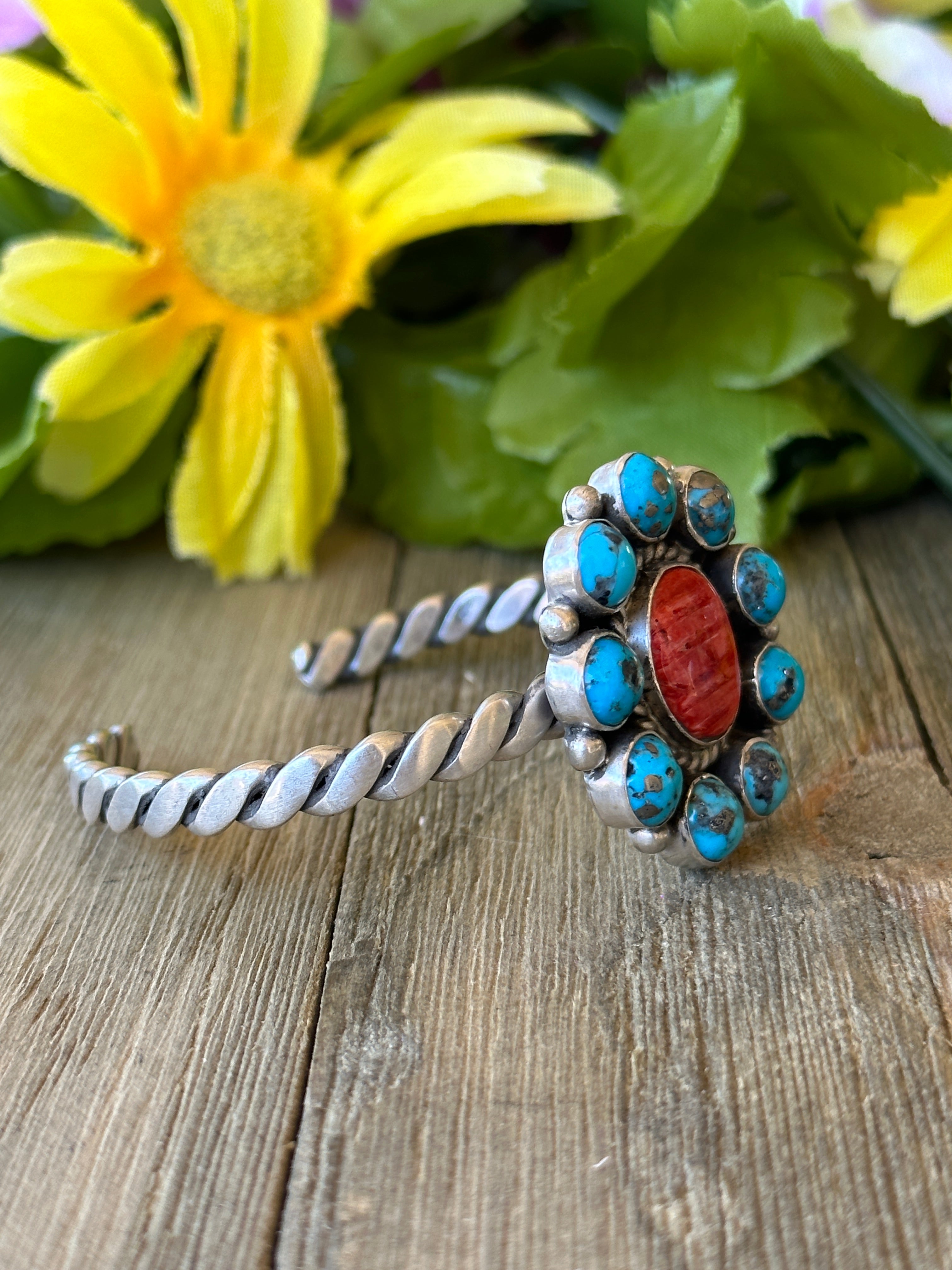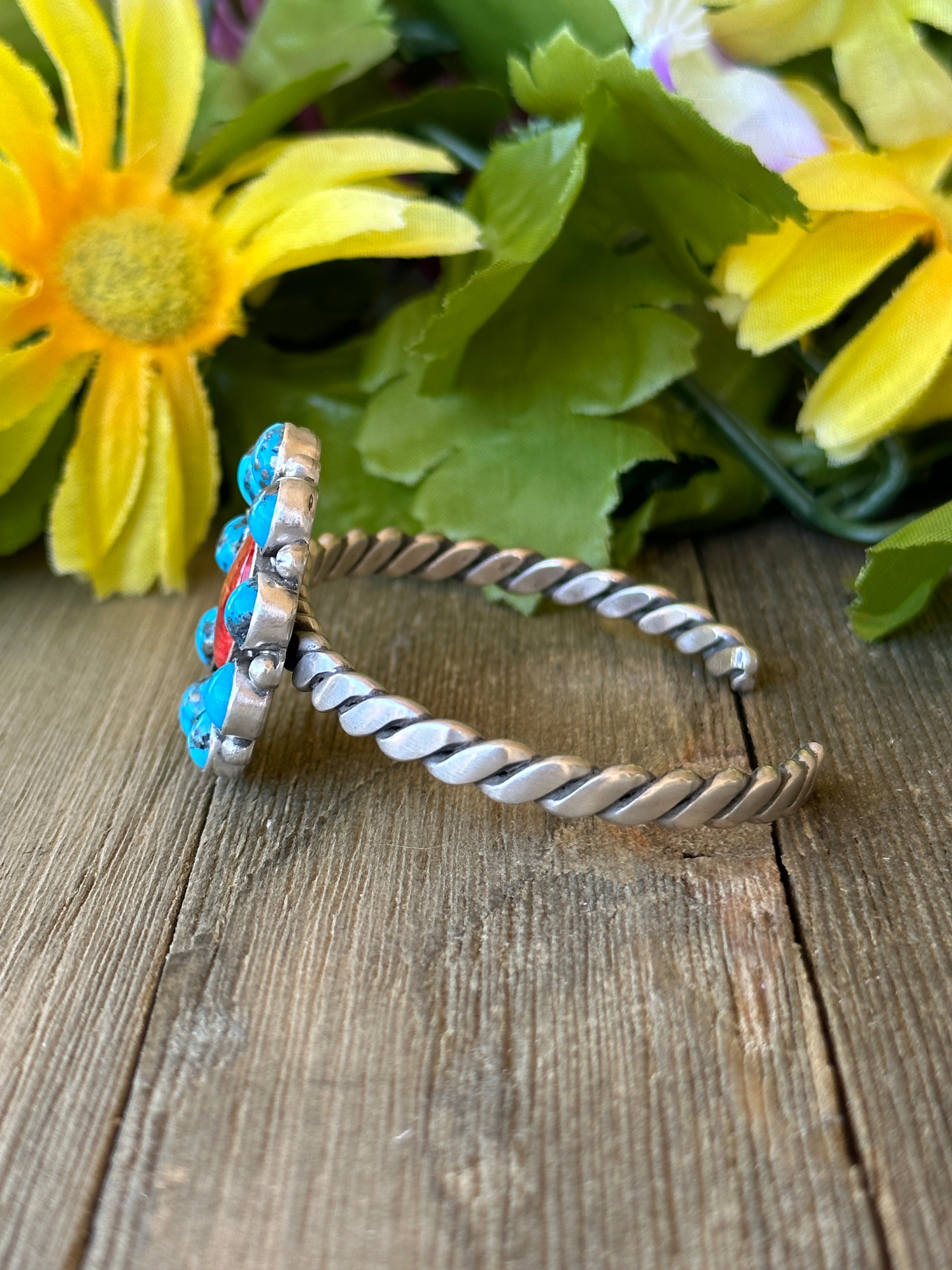 Navajo Made Multi Stone & Sterling Silver Cluster Cuff Bracelet