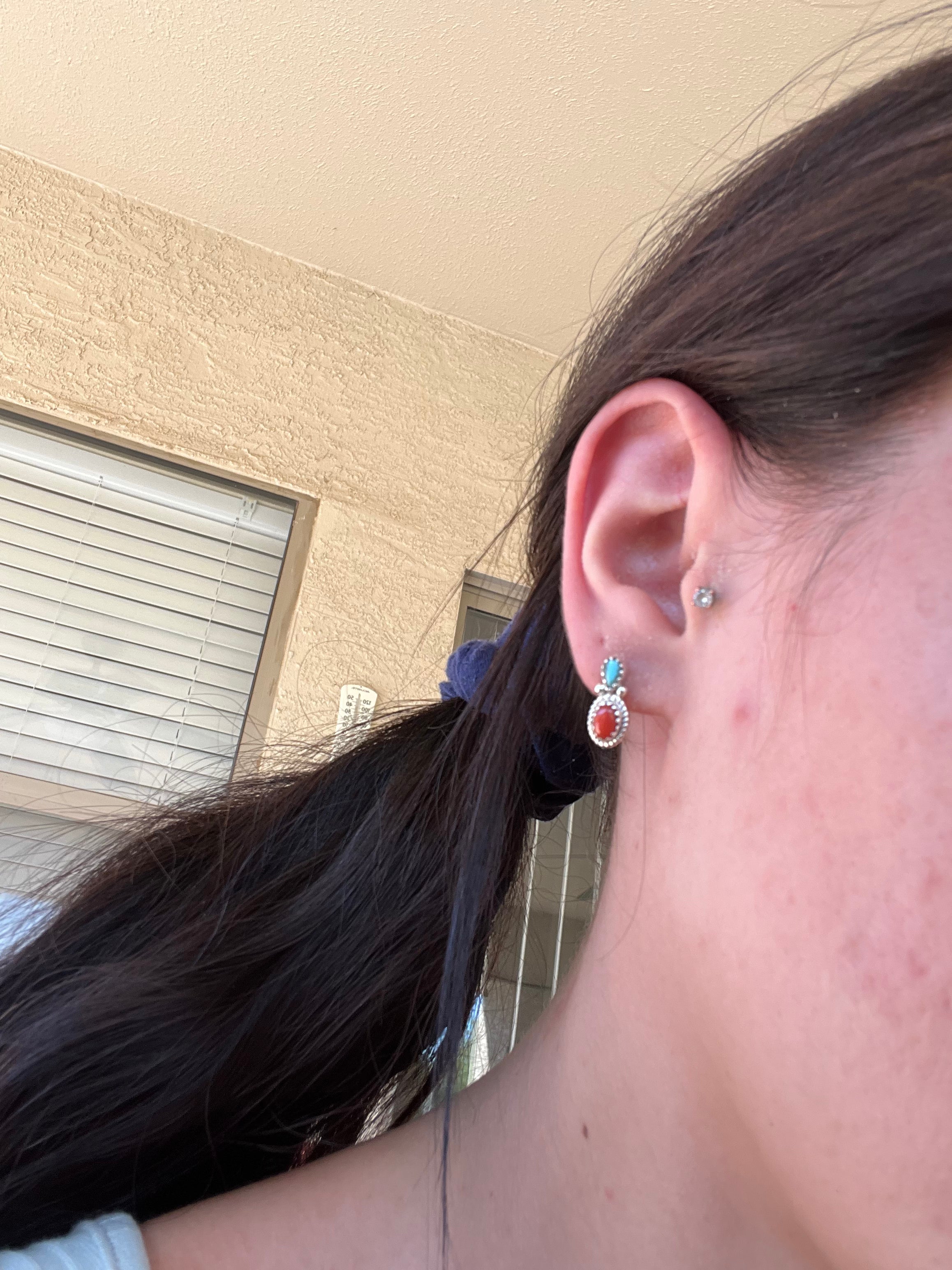 Navajo Made Multi Stone & Sterling Silver Earrings. It measures 5/8 of an inch long and just over 1/4 of an inch wide. Stones may differ due to natural stones.