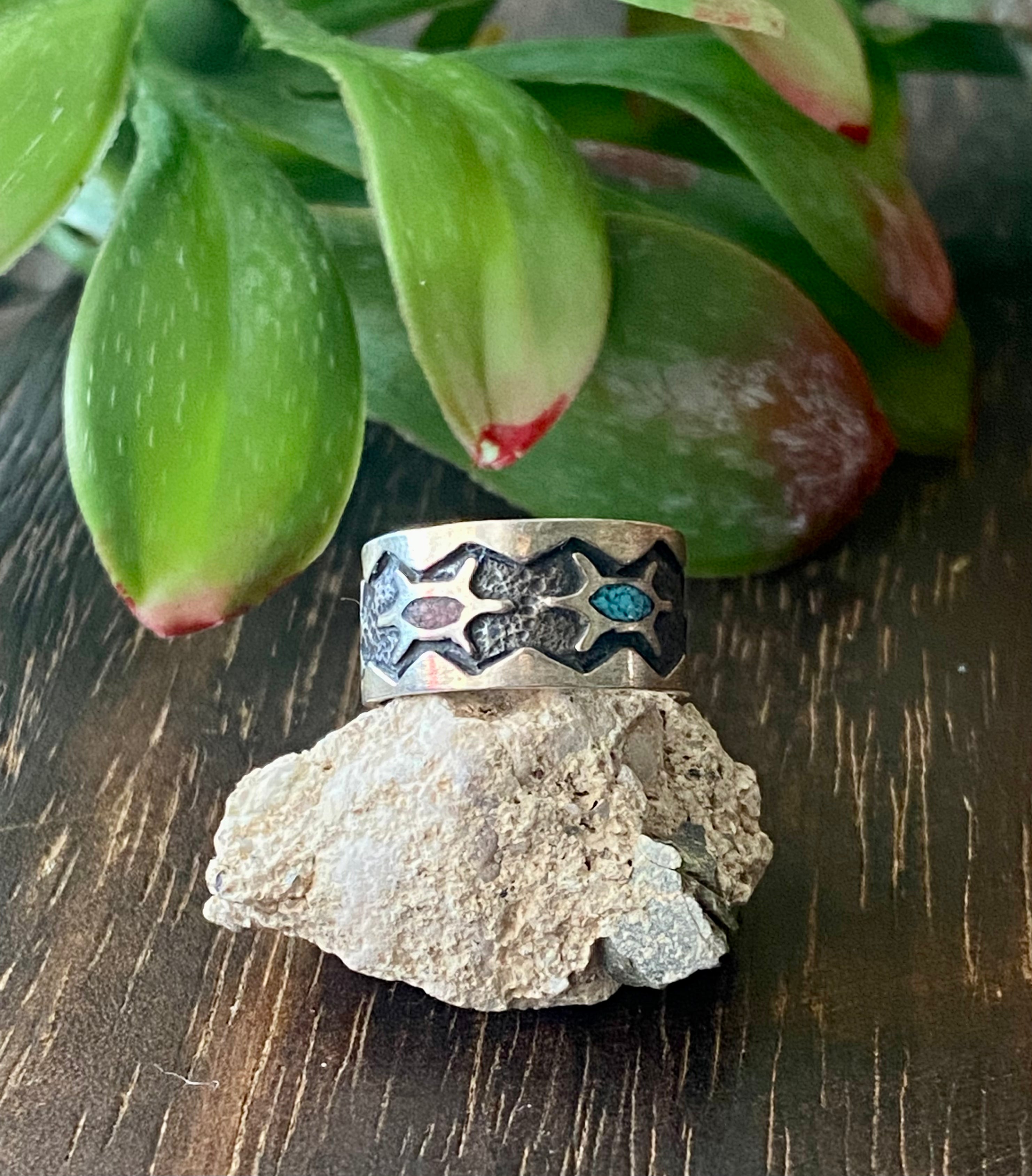 Navajo Made Multi Stone & Sterling Silver Flake Turtle Ring Size 4.5. It measures 3/8 of an inch long and 5/8 of an inch wide.