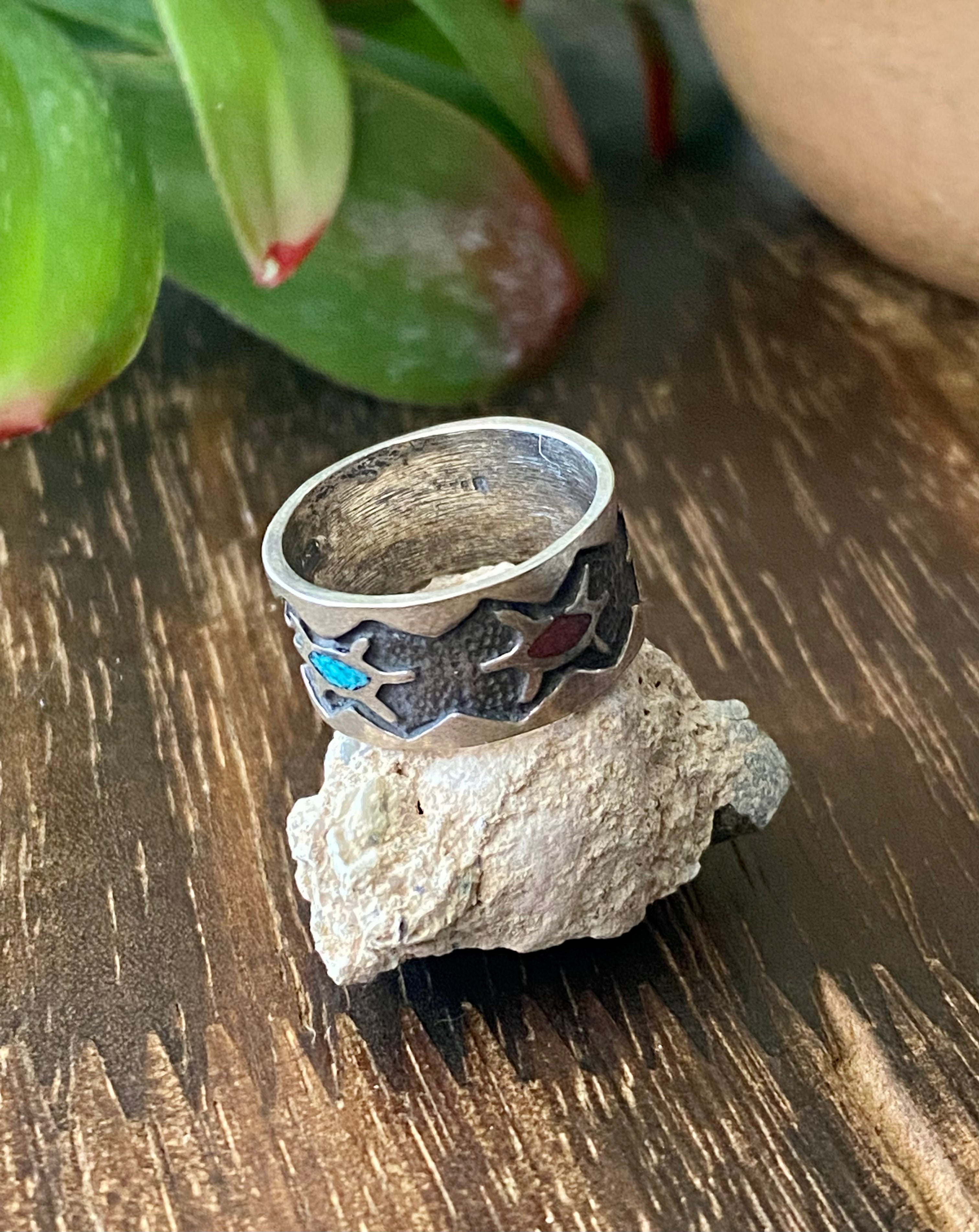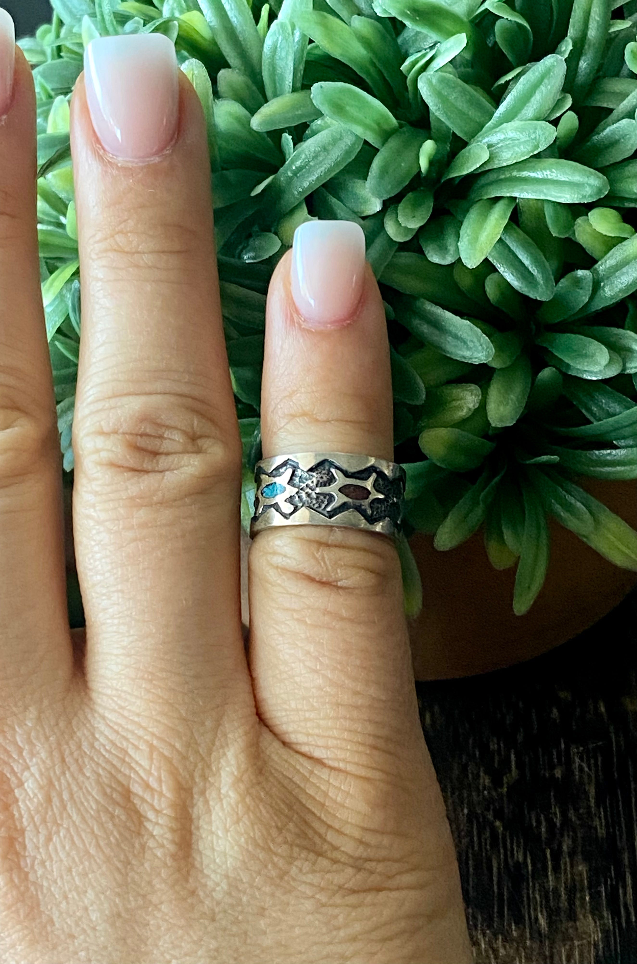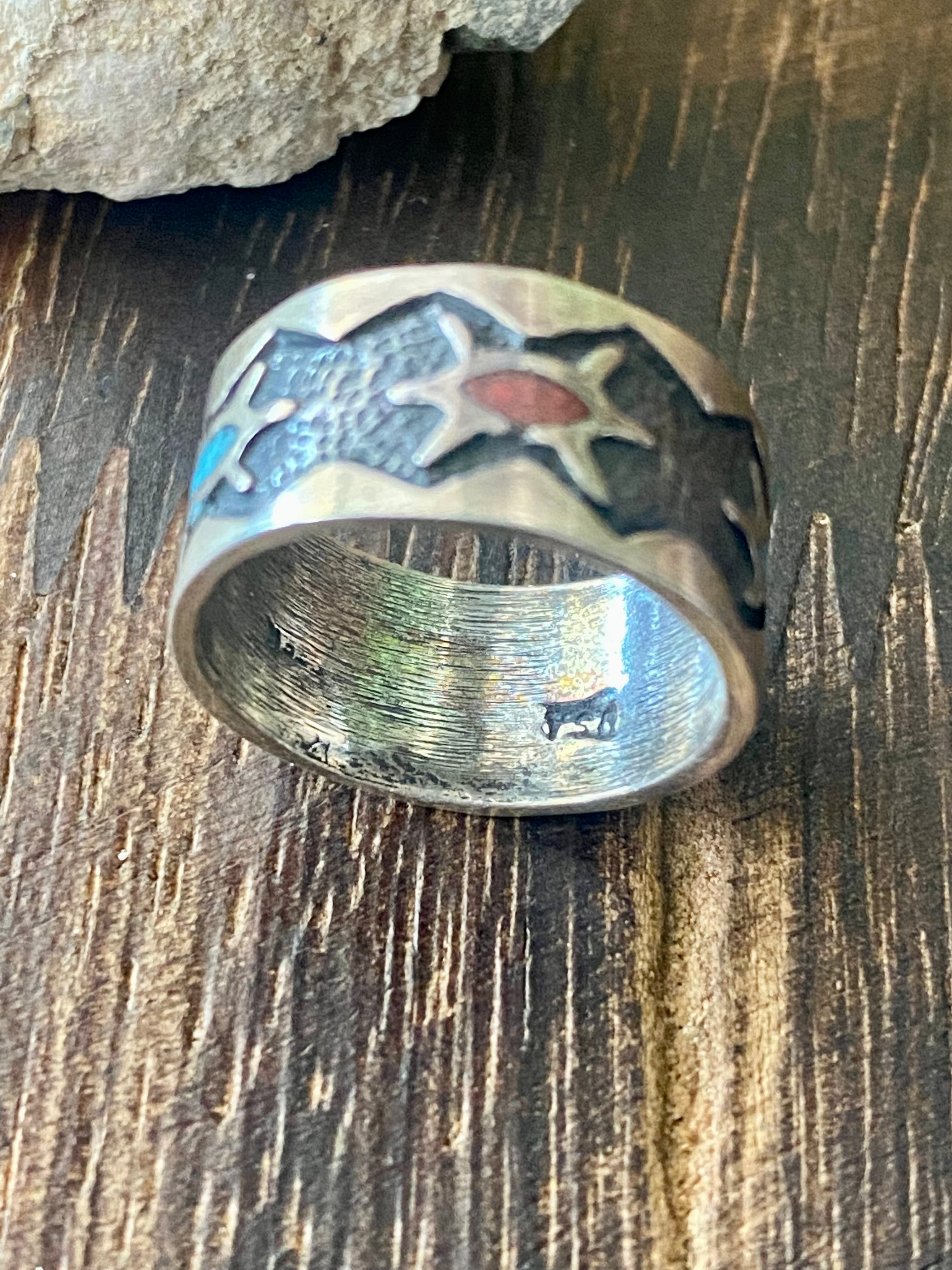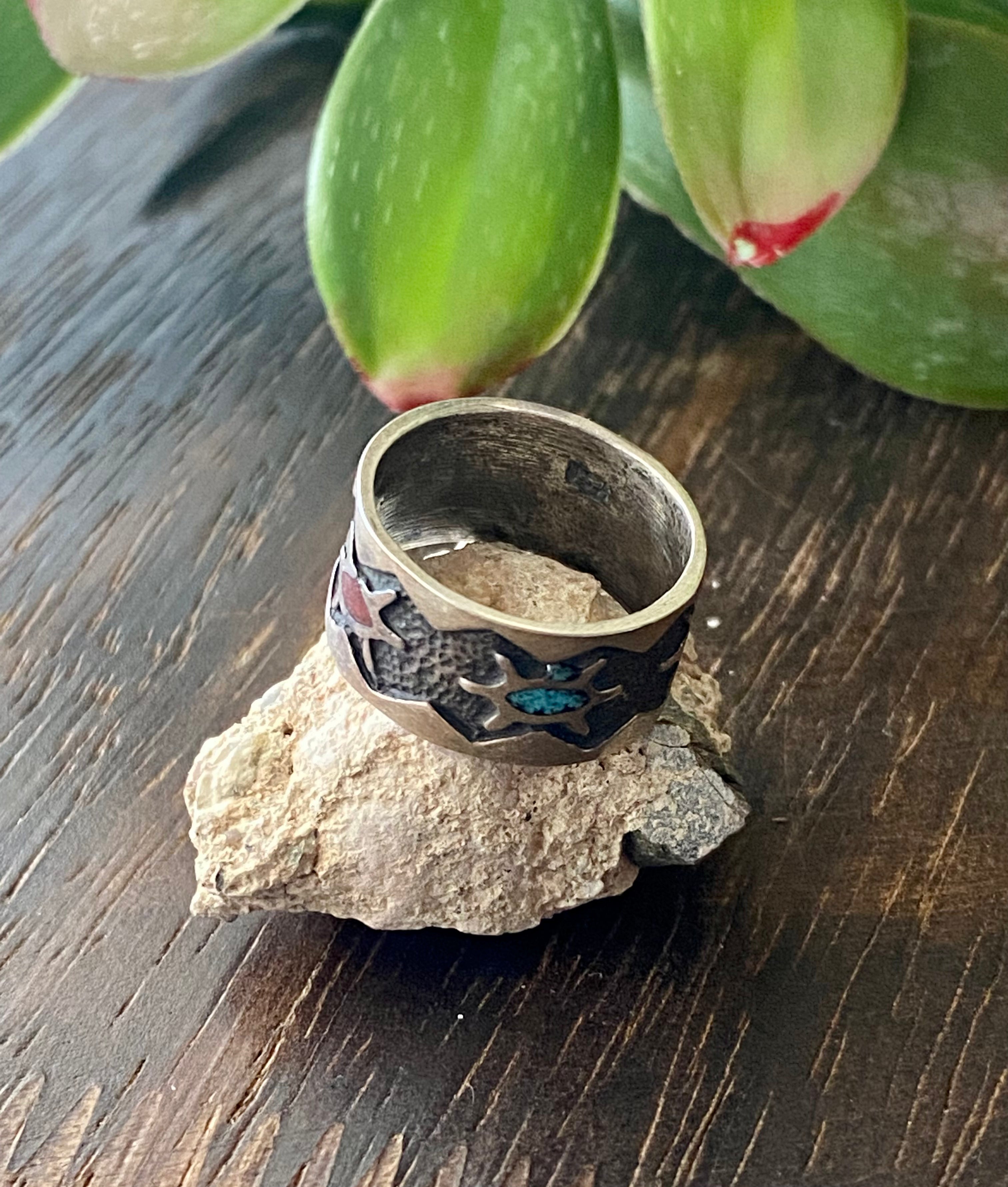 Navajo Made Multi Stone & Sterling Silver Flake Turtle Ring Size 4.5
