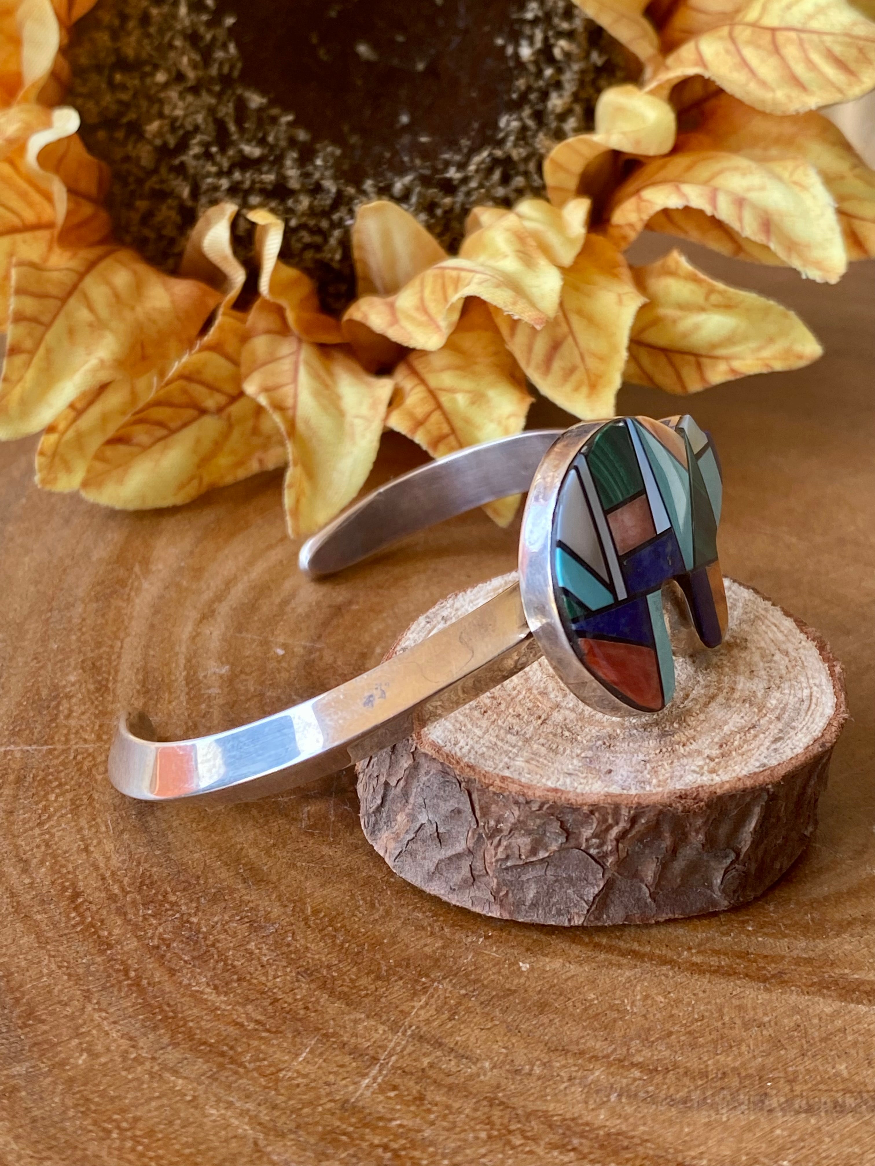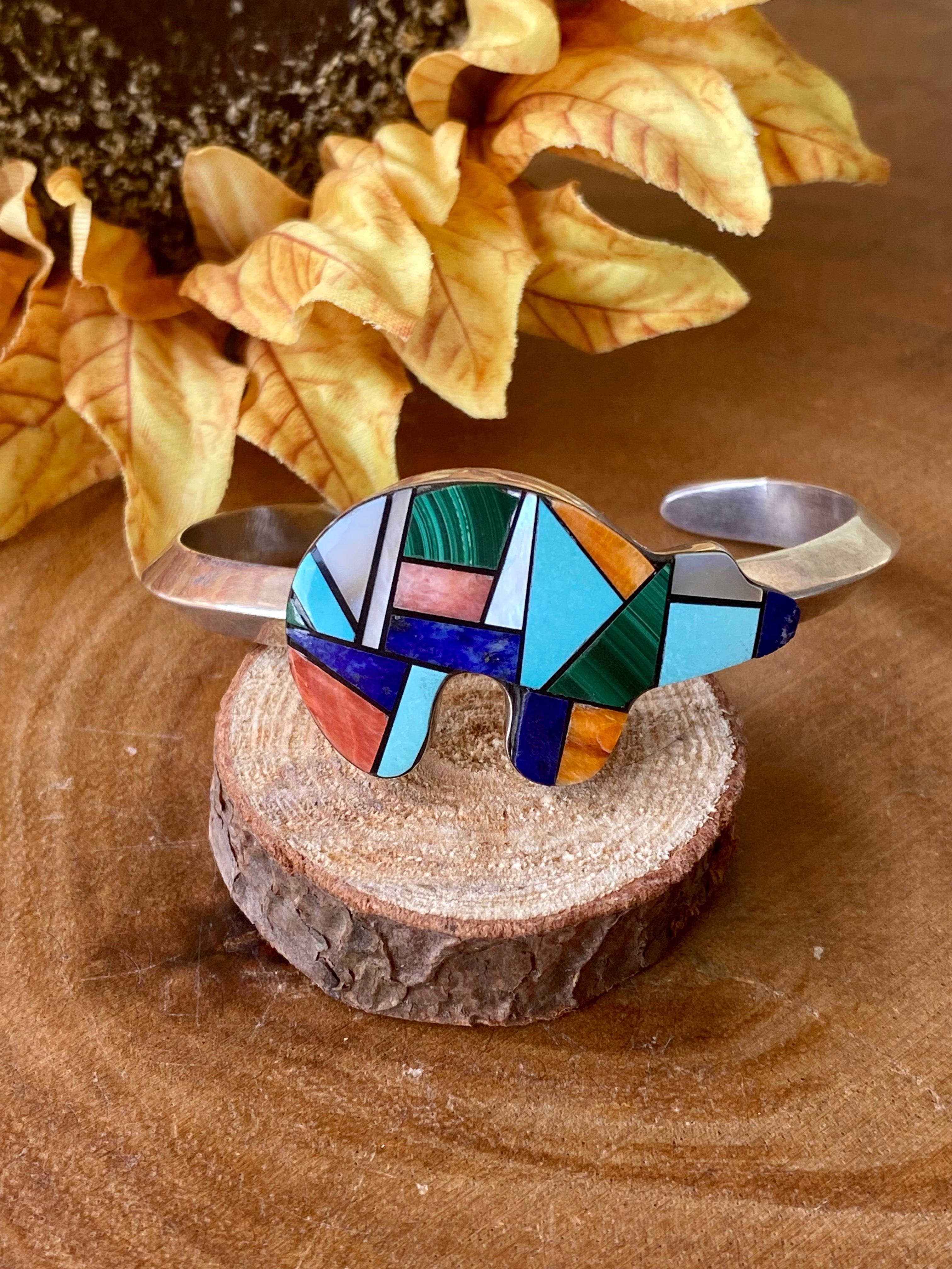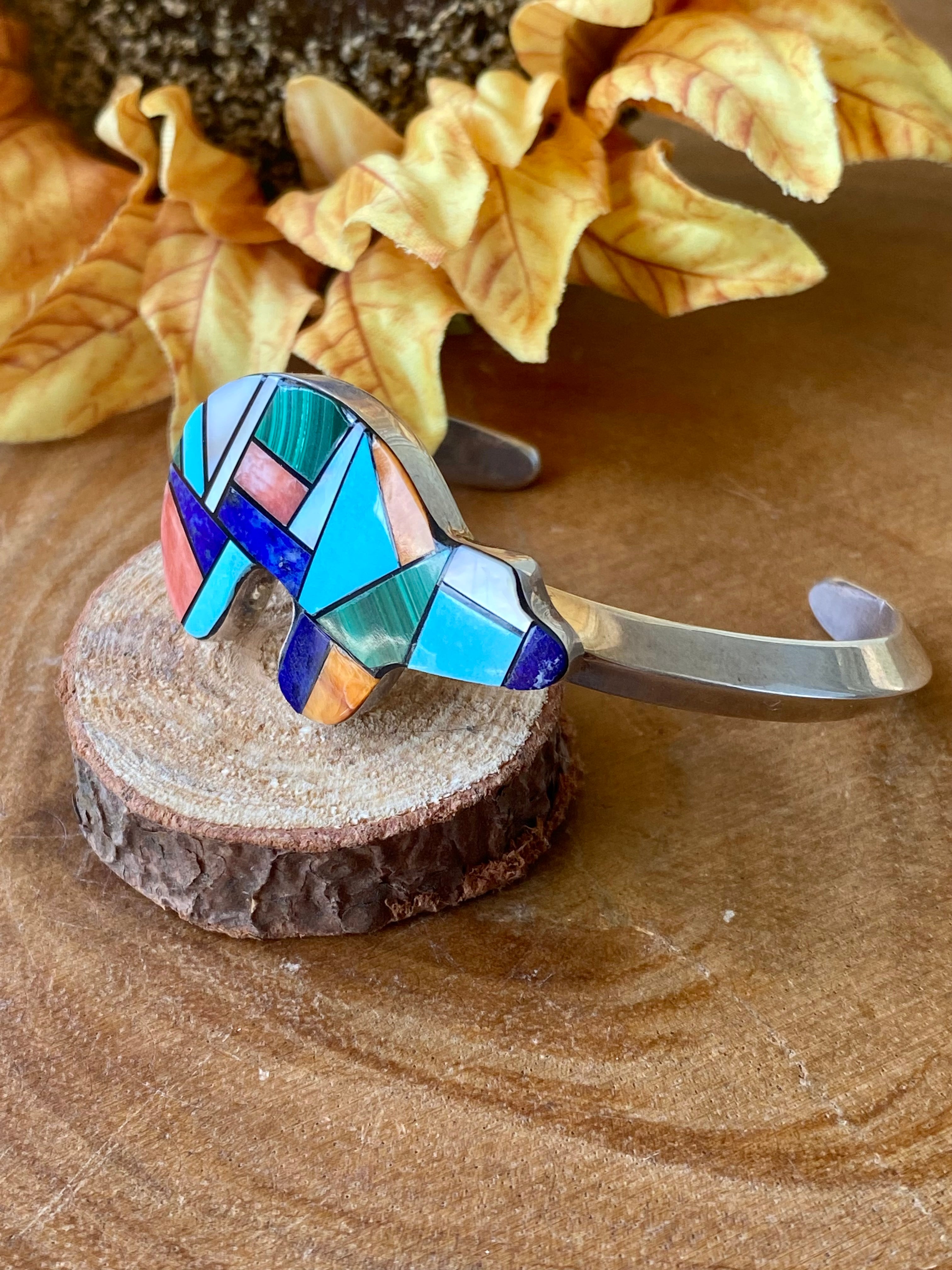 Navajo Made Multi Stone & Sterling Silver Inlay Bear Cuff Bracelet