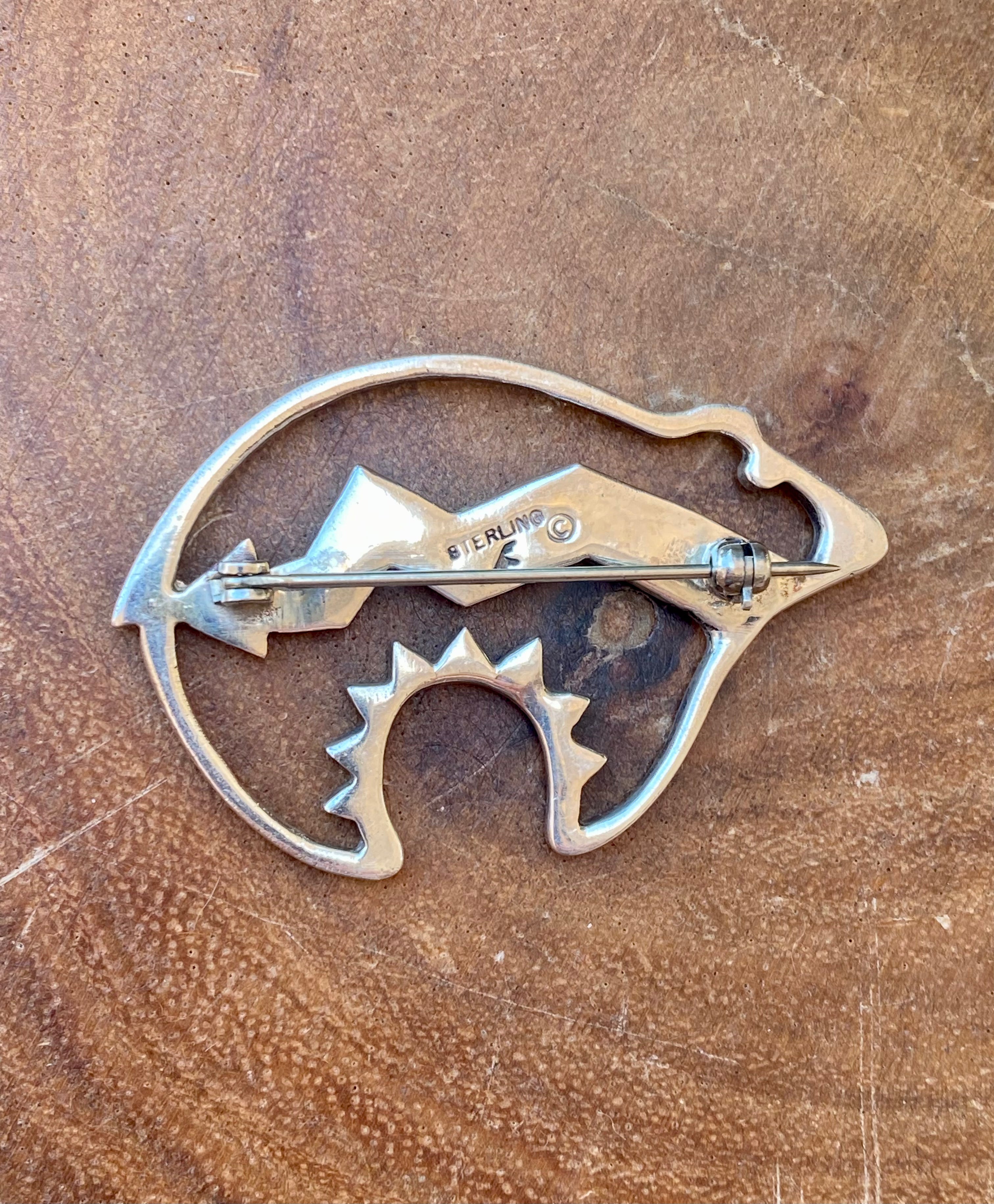 Navajo Made Multi Stone & Sterling Silver Inlay Bear Pin. It measures 1 1/4 inches long and 2 inches wide. Signed by the artist and stamped sterling silver.
