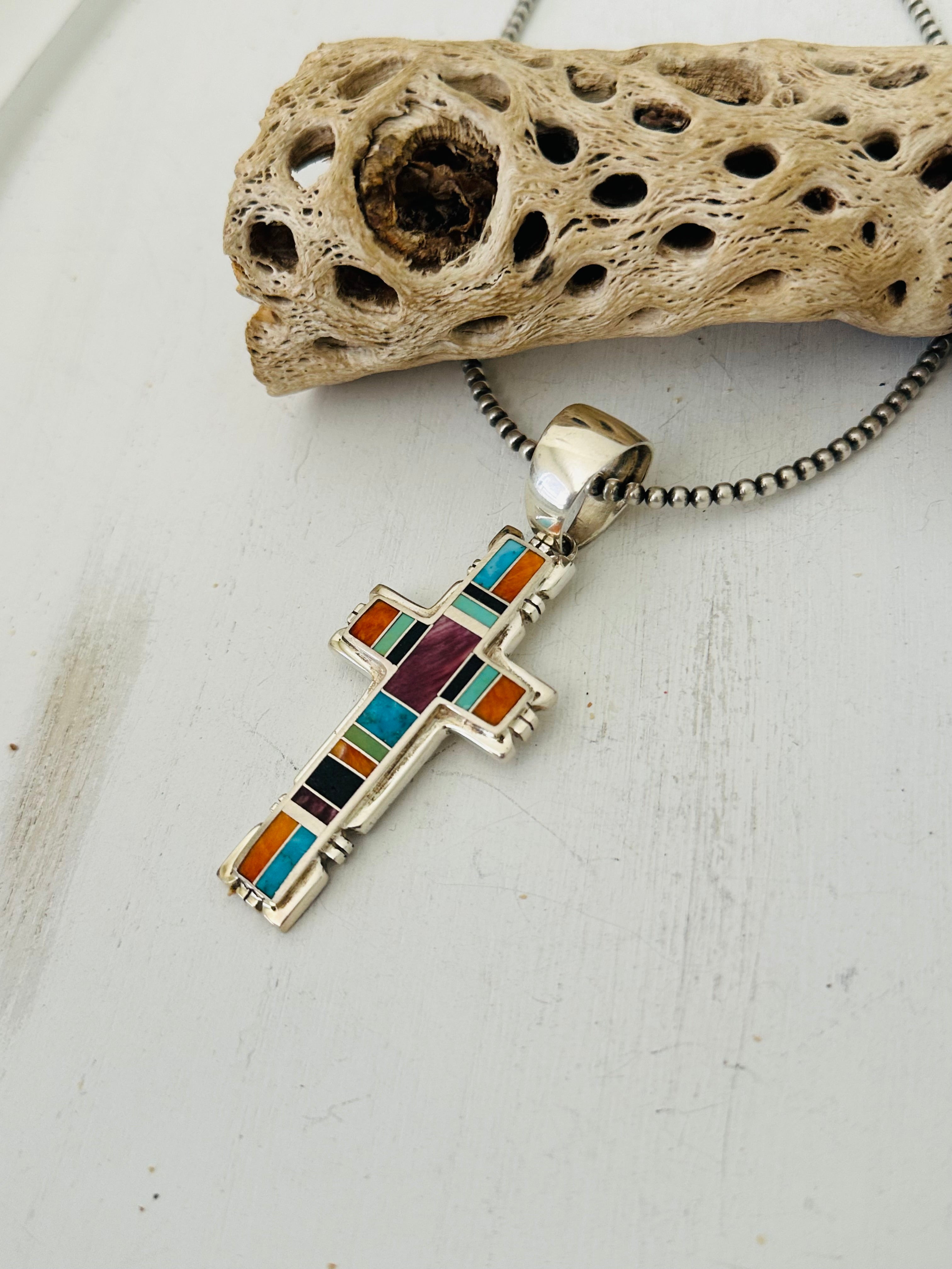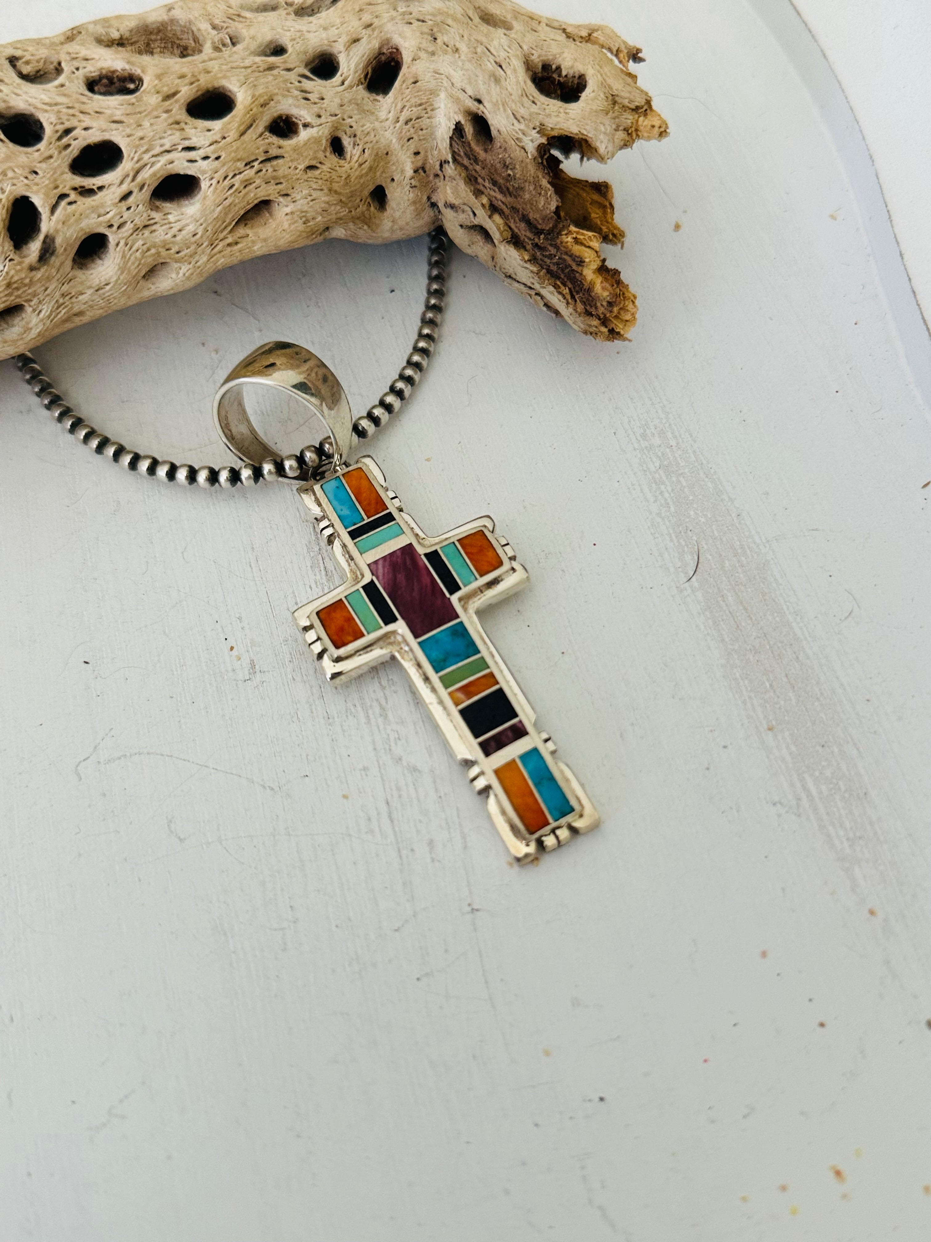 Navajo Made Multi Stone & Sterling Silver Inlay Cross Pendant