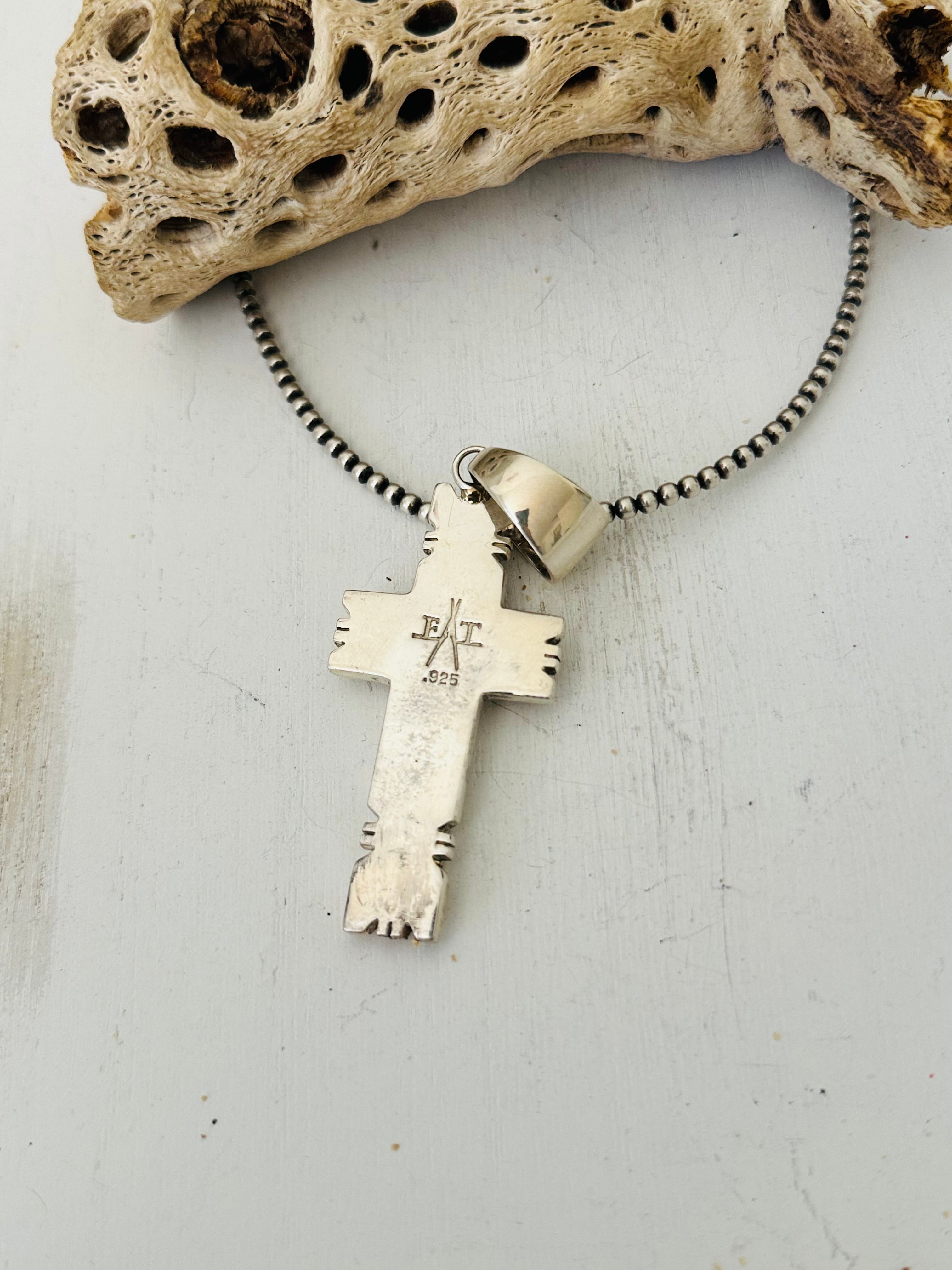 Navajo Made Multi Stone & Sterling Silver Inlay Cross Pendant. It measures 3 1/4 inches long and 1 1/4 inches wide. Pendant Only!! stamped and signed
