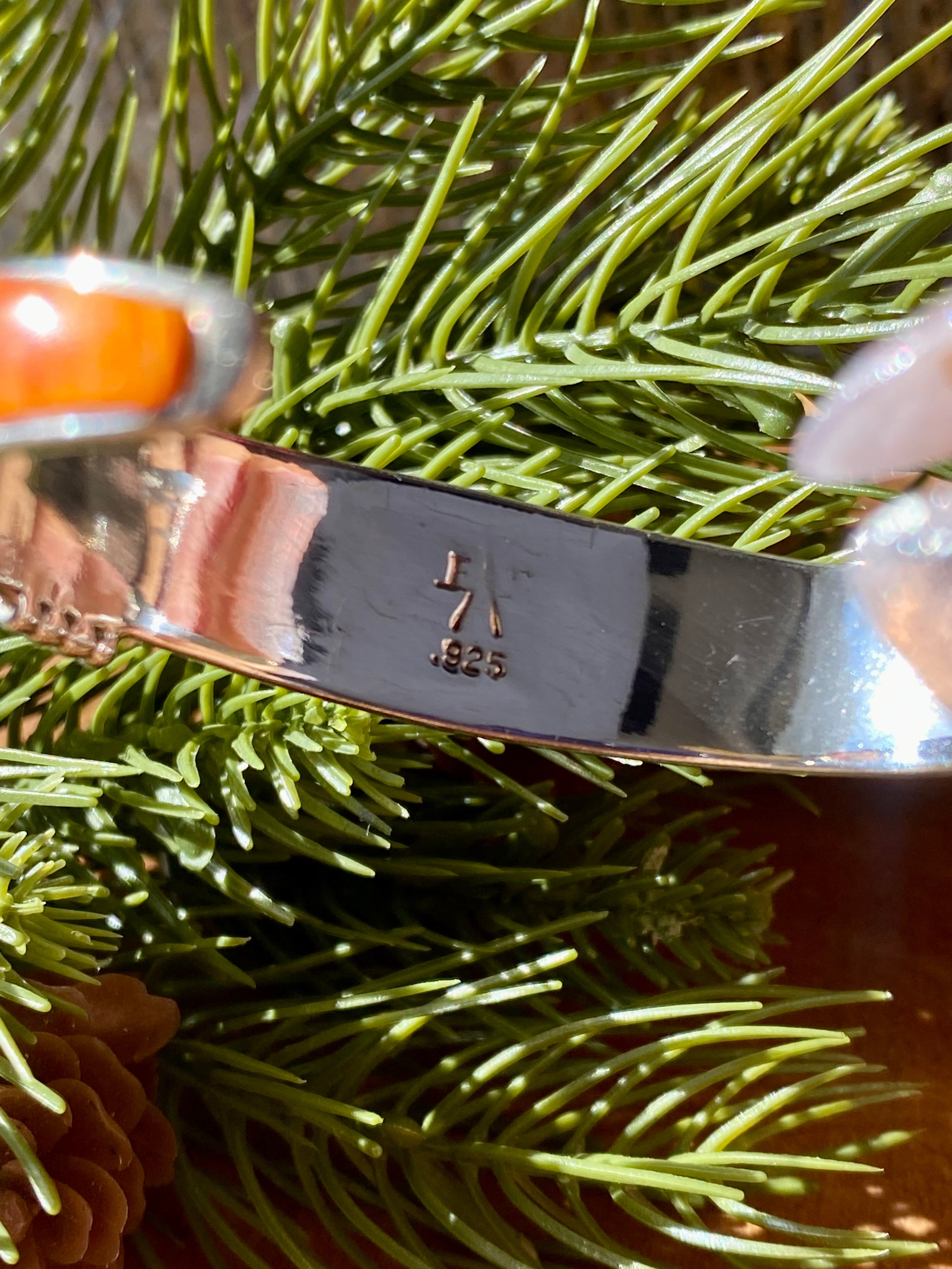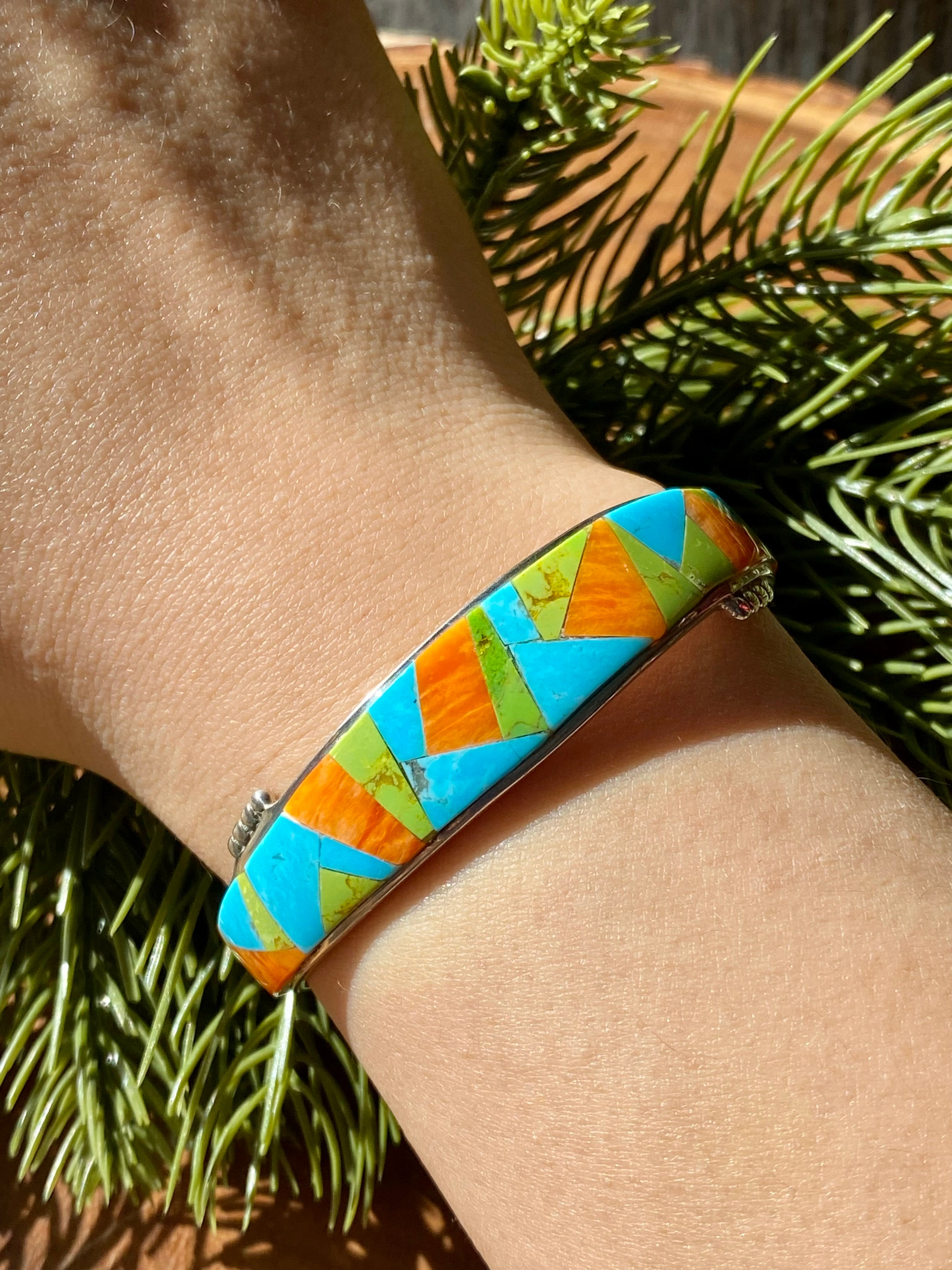 Navajo Made Multi Stone & Sterling Silver Inlay Cuff Bracelet. It measures just over 1/2 of an inch wide and has an inside circumference of 5 3/8 inches and a gap of 1 1/8 inches. Signed by the artist and stamped sterling silver.