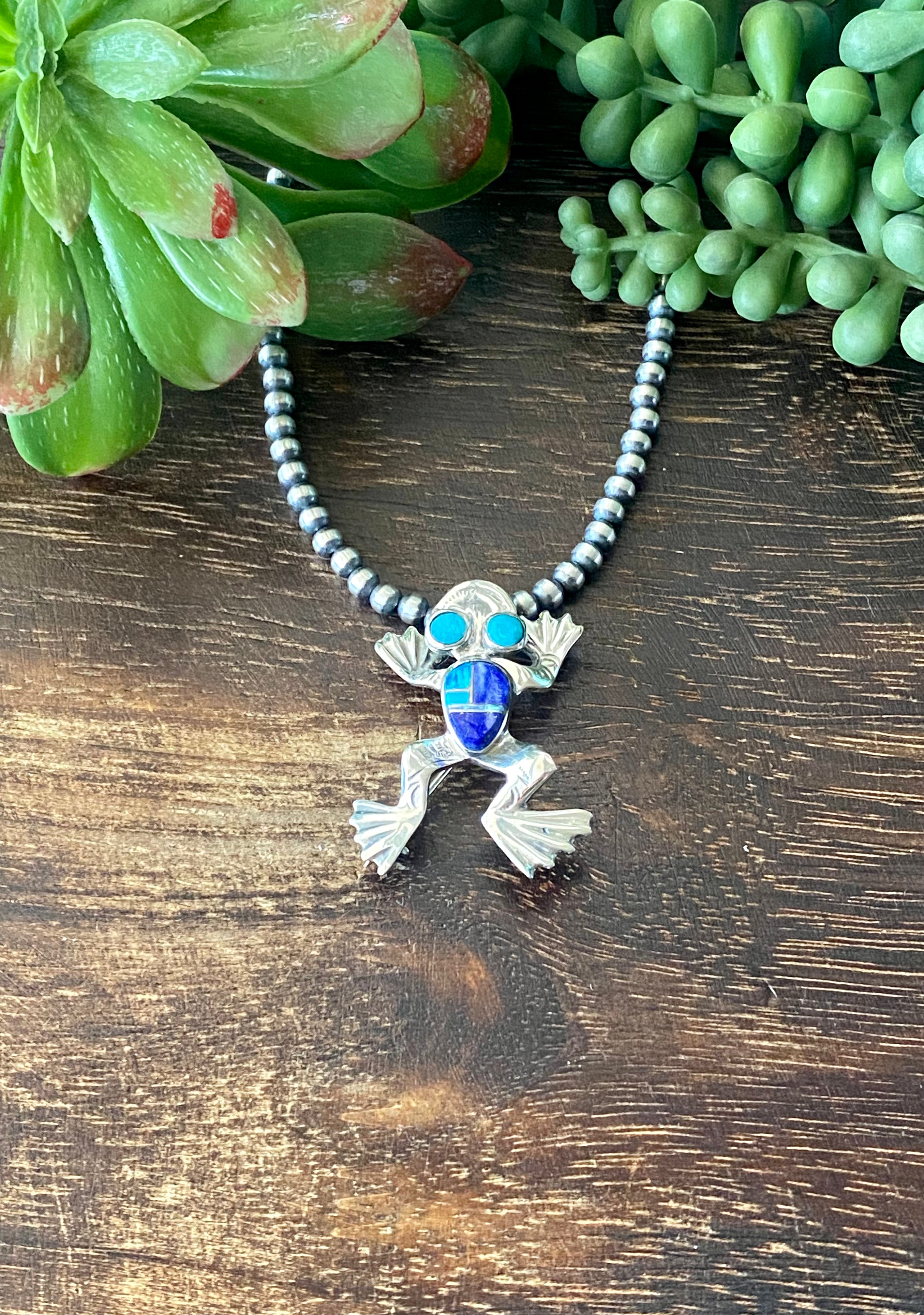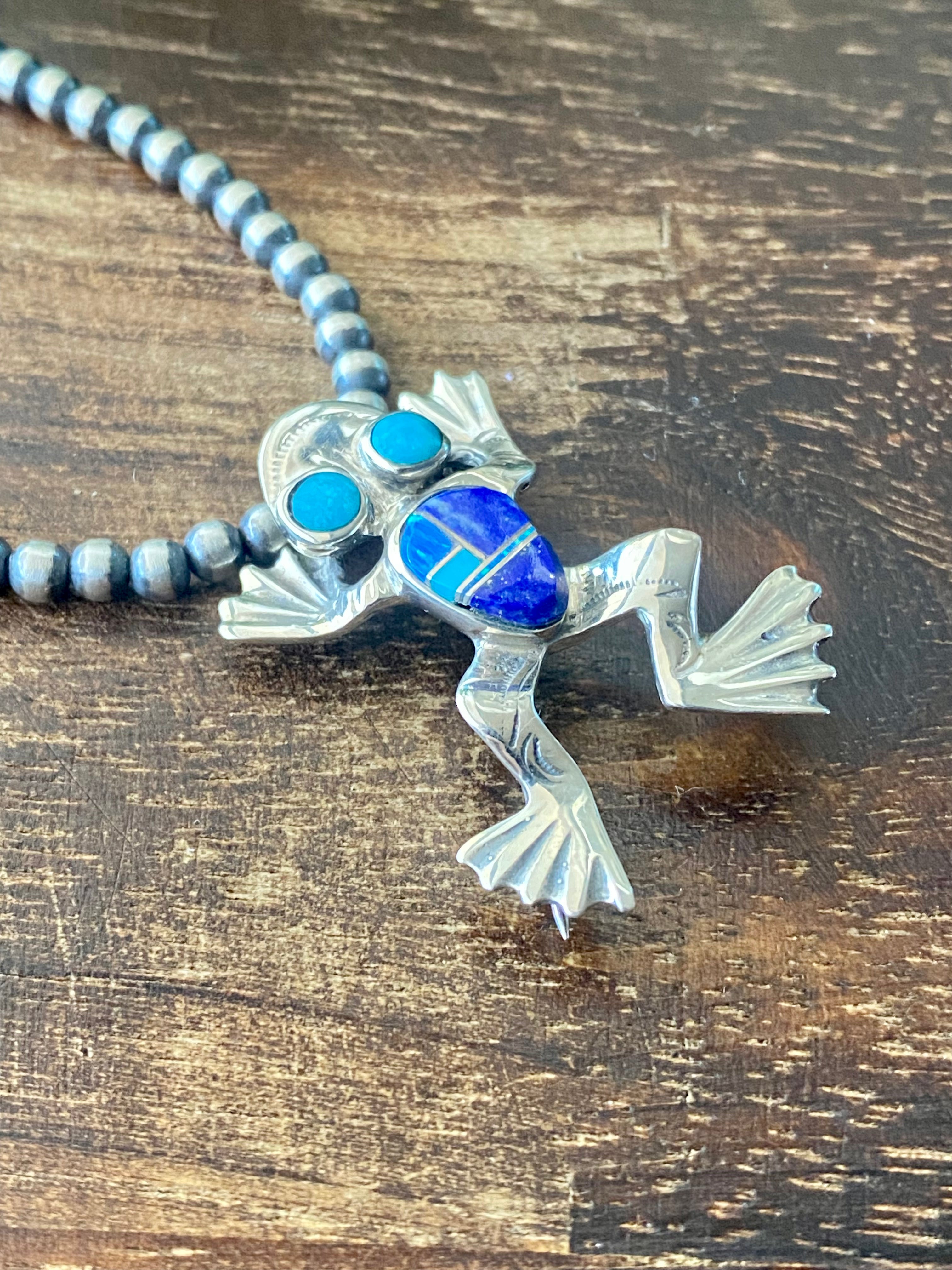 Navajo Made Multi Stone & Sterling Silver Inlay Frog Pin/Pendant. It measures 1 1/2 inches long and 1 1/8 inches wide. Pendant Only!! Stamped sterling silver.
