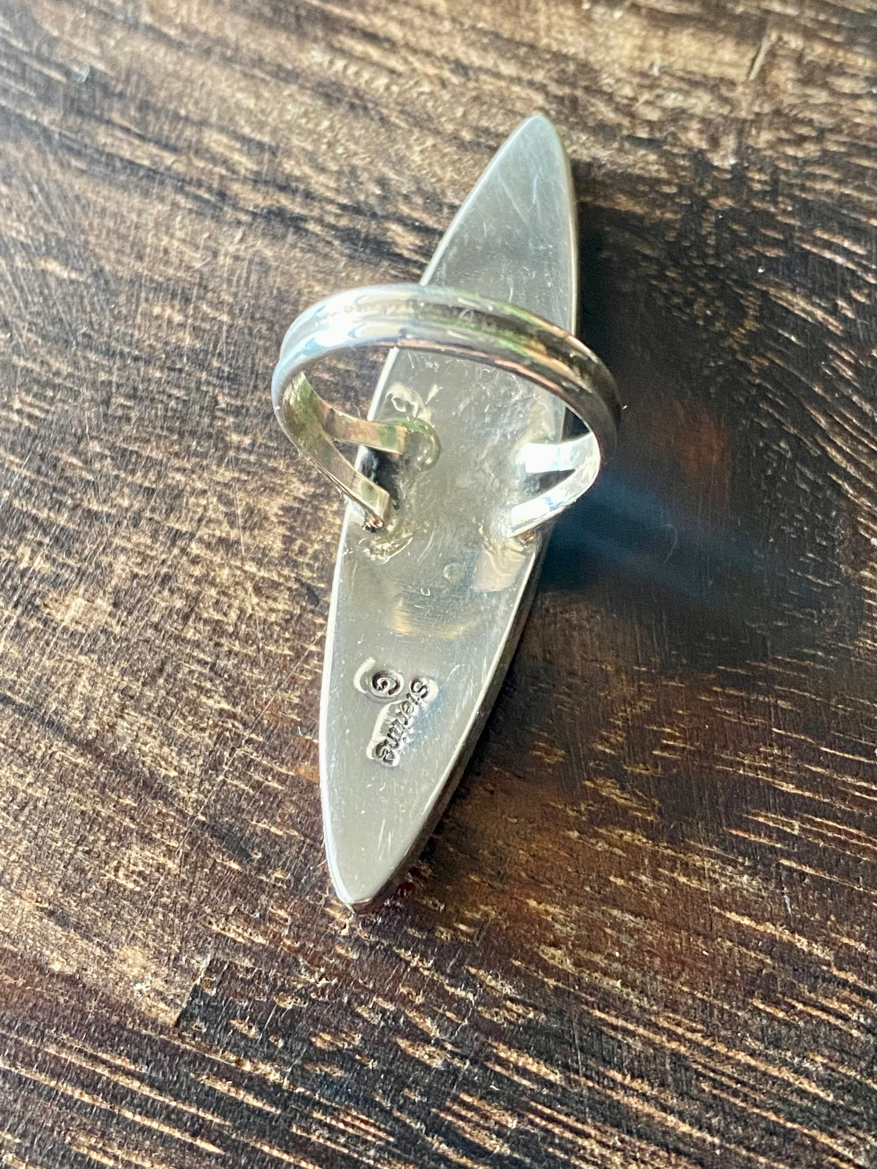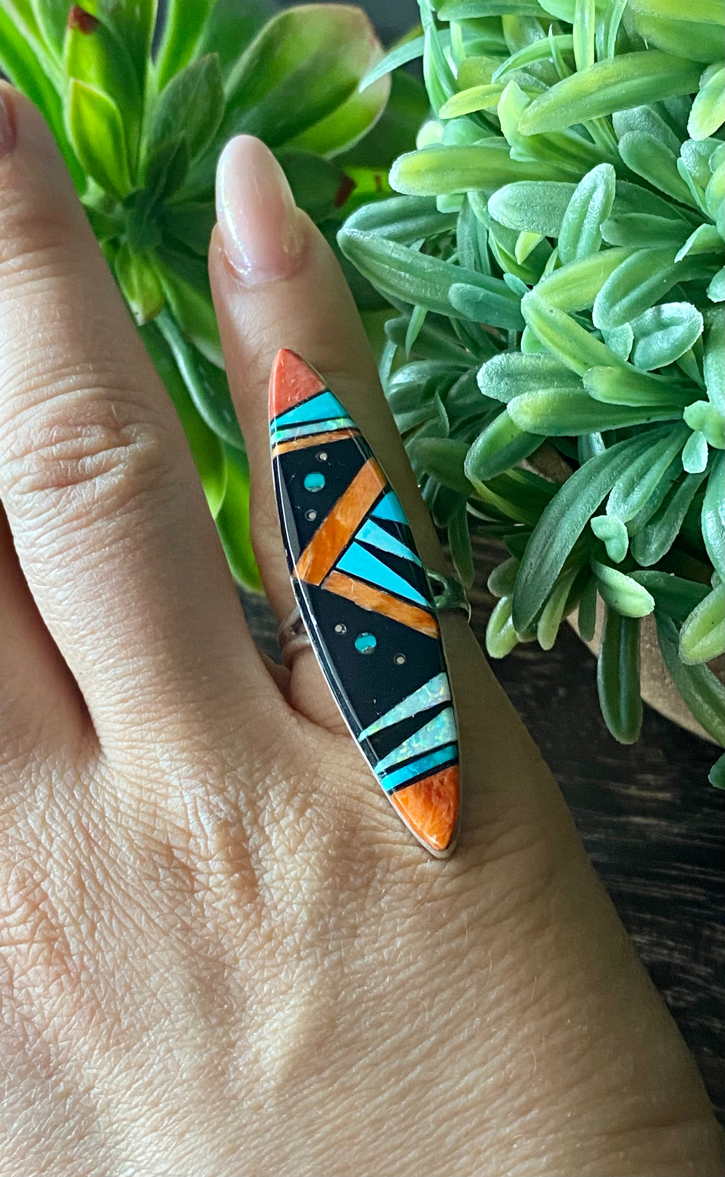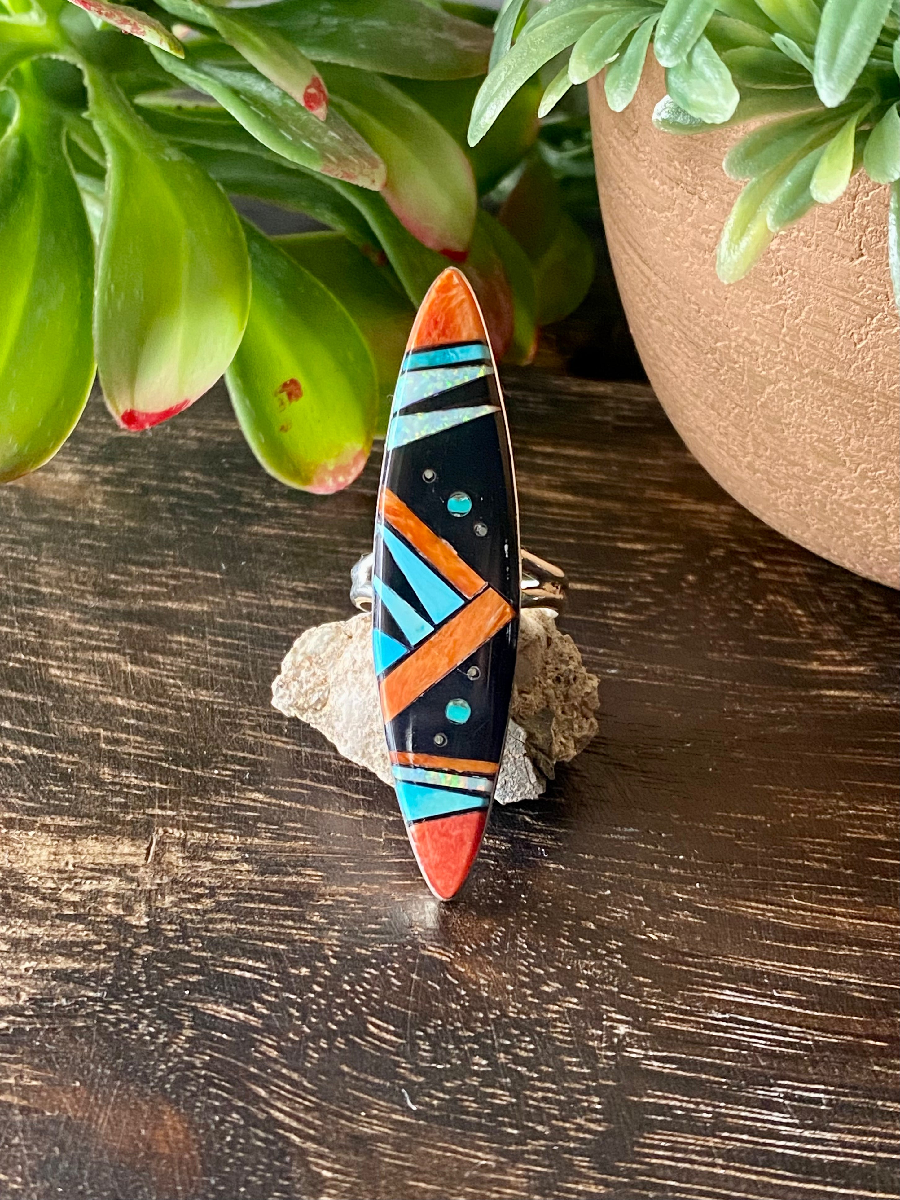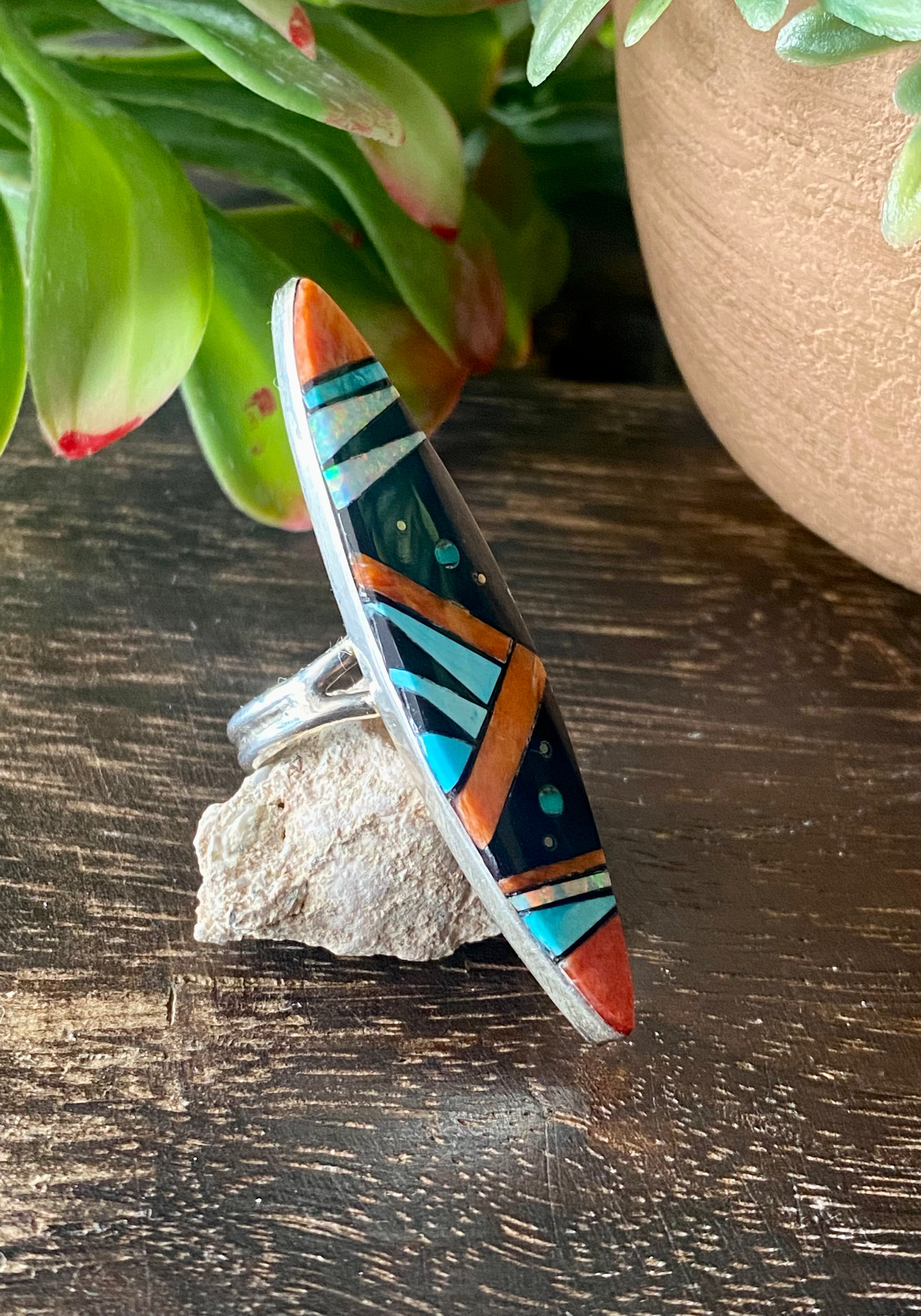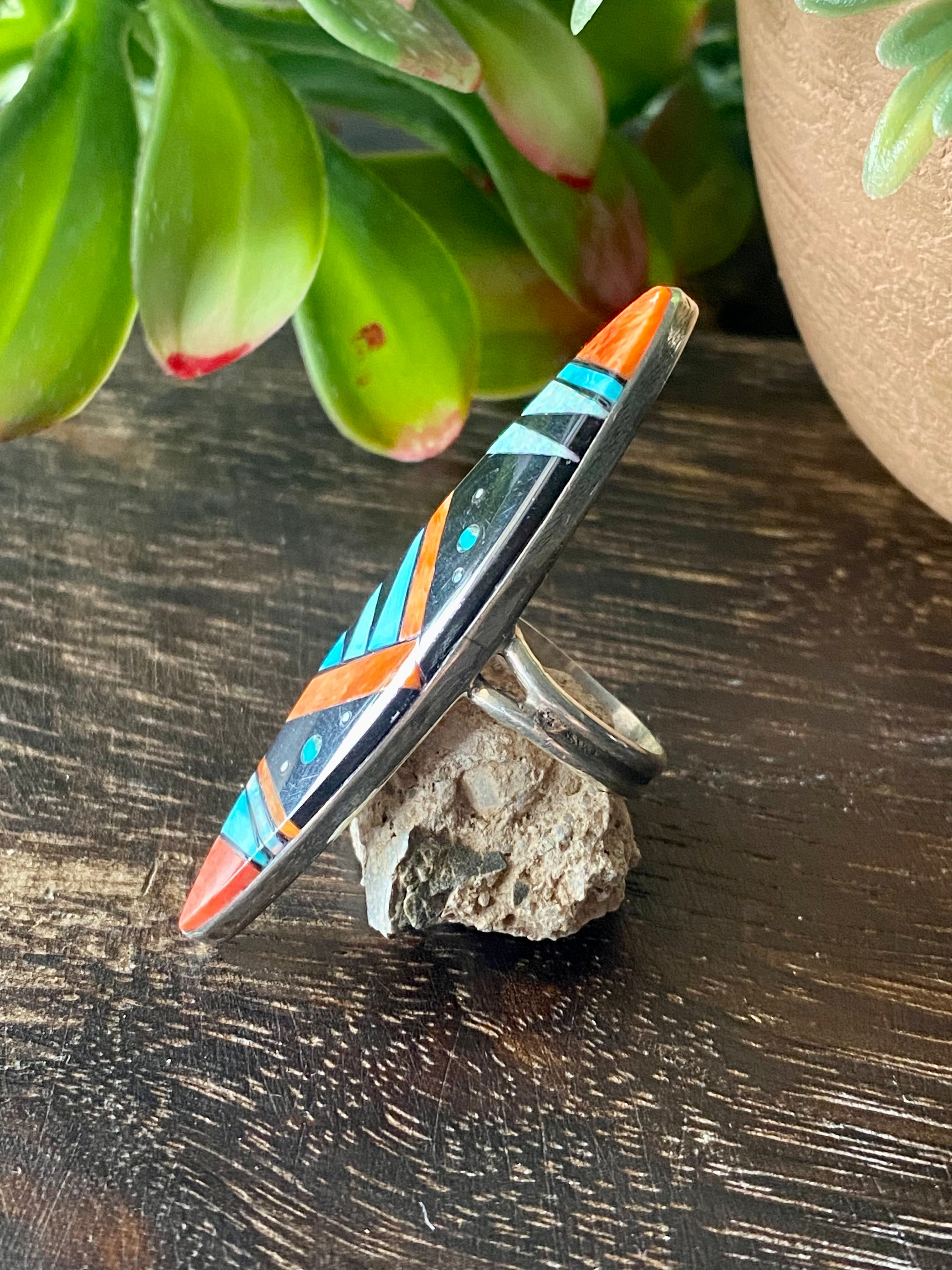 Navajo Made Multi Stone & Sterling Silver Inlay Galaxy Ring Size 7.75. It measures 2 1/8 inches long and 1/2 of an inch wide. Signed by the artist and stamped sterling silver.
