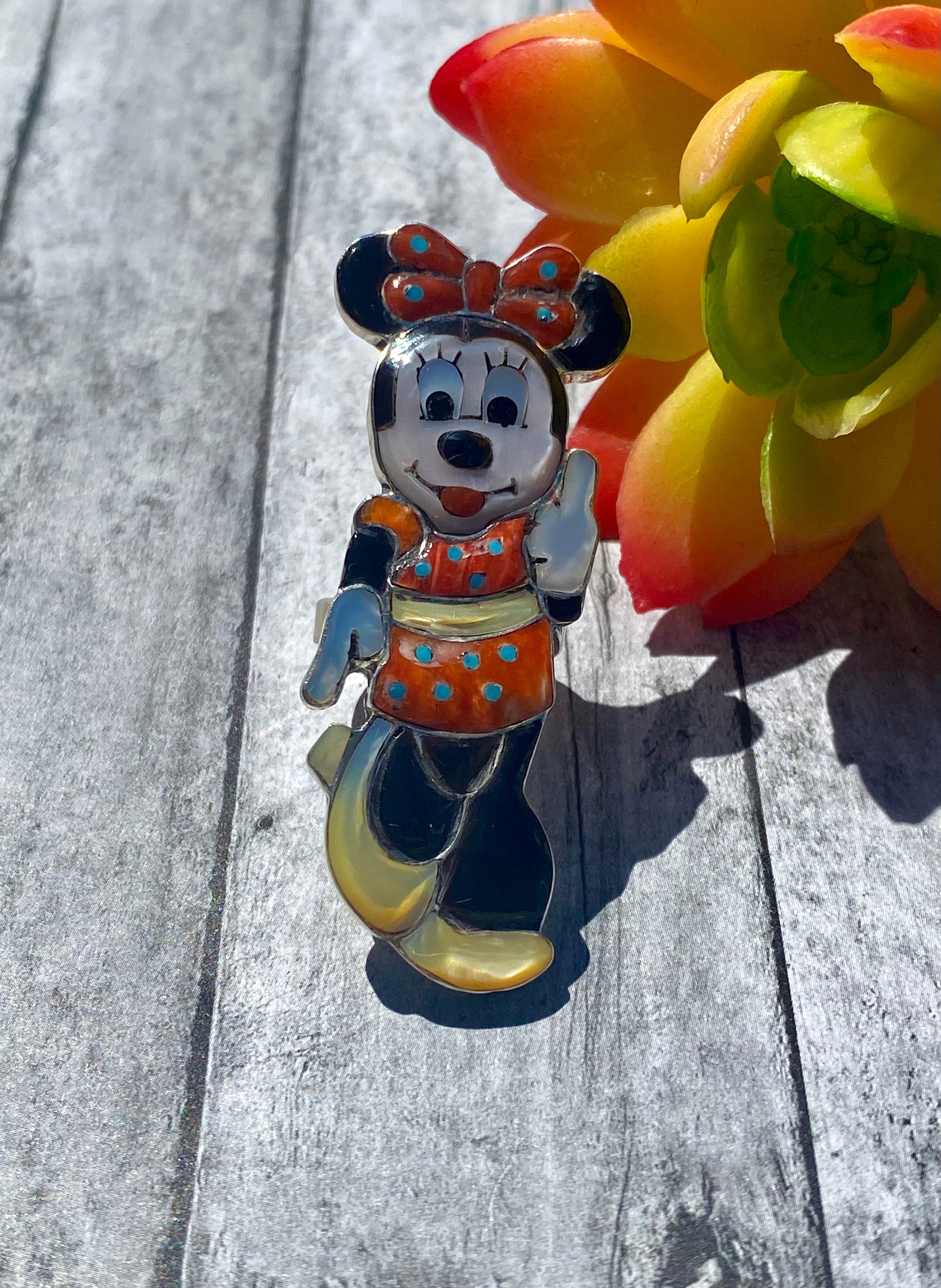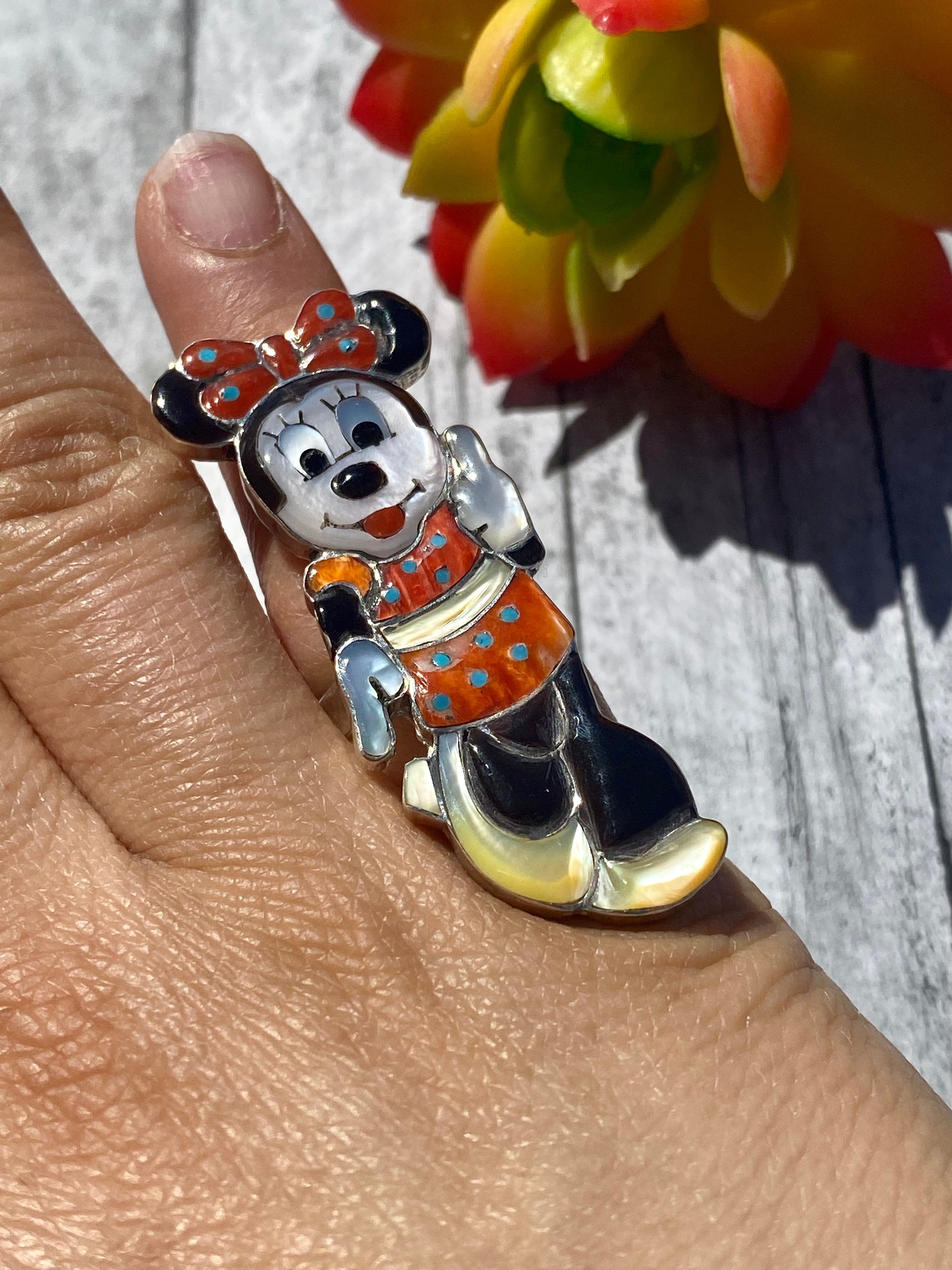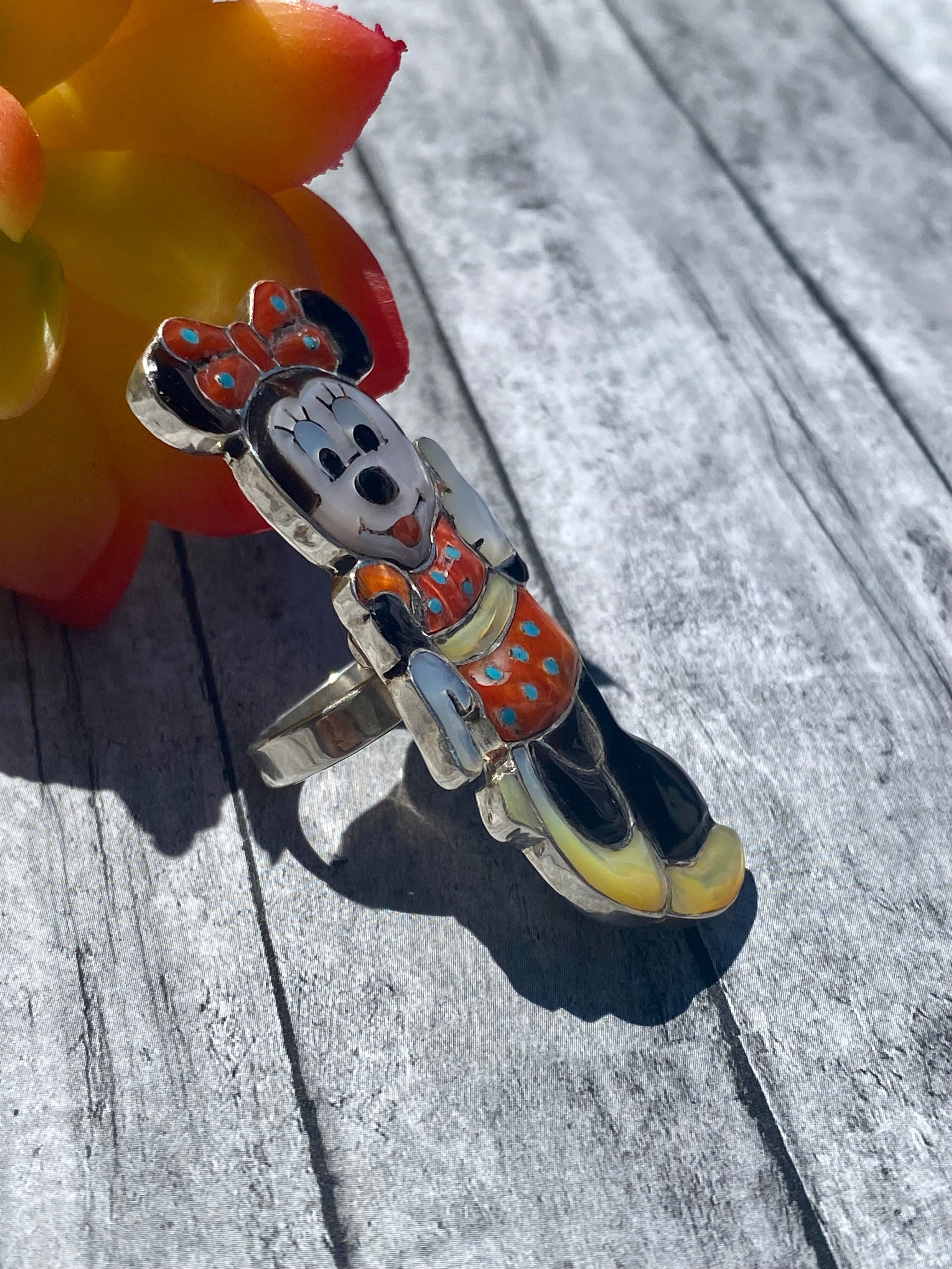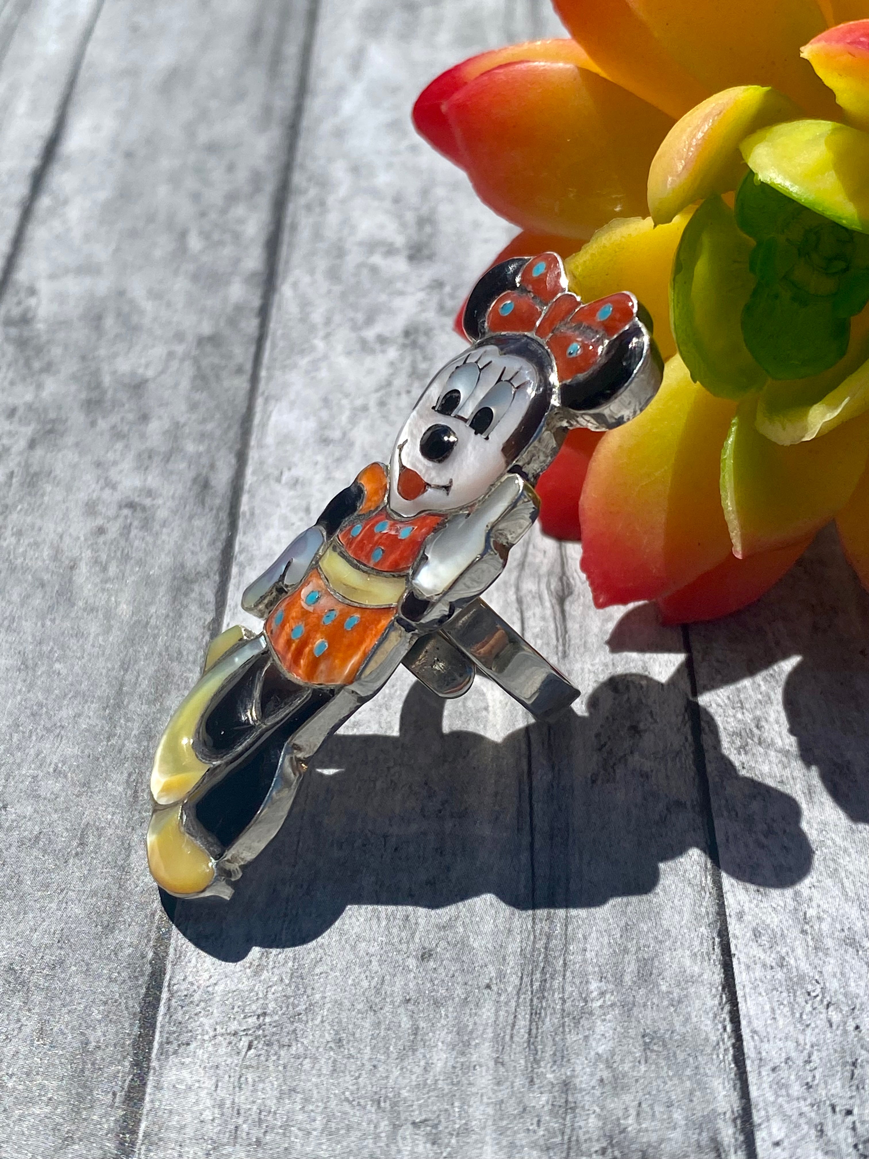Navajo Made Multi Stone & Sterling Silver Inlay Mouse Adjustable Ring Size 5. It measures 2 1/8 inches long and 7/8 of an inch wide. Signed by the artist and stamped sterling silver.