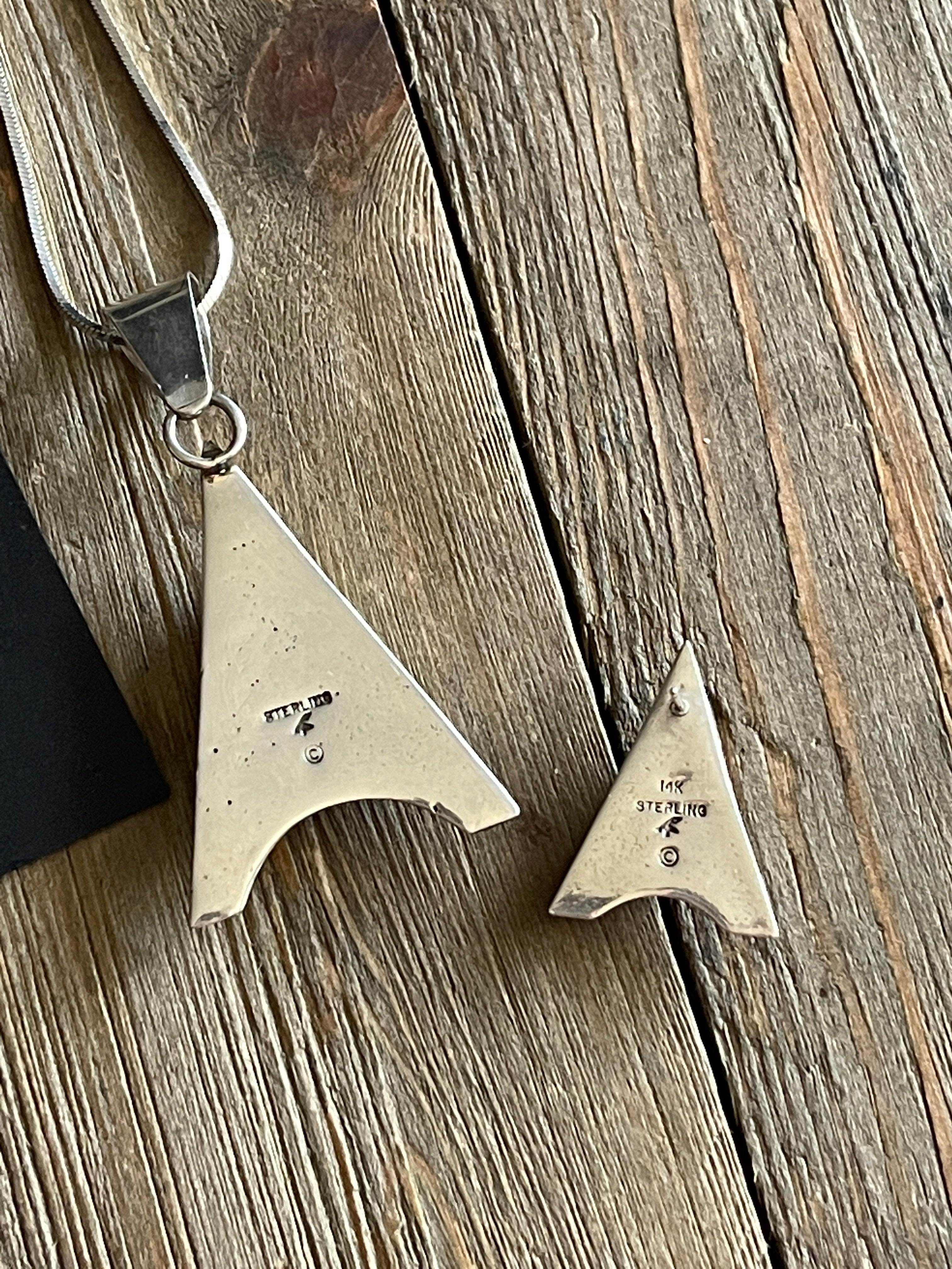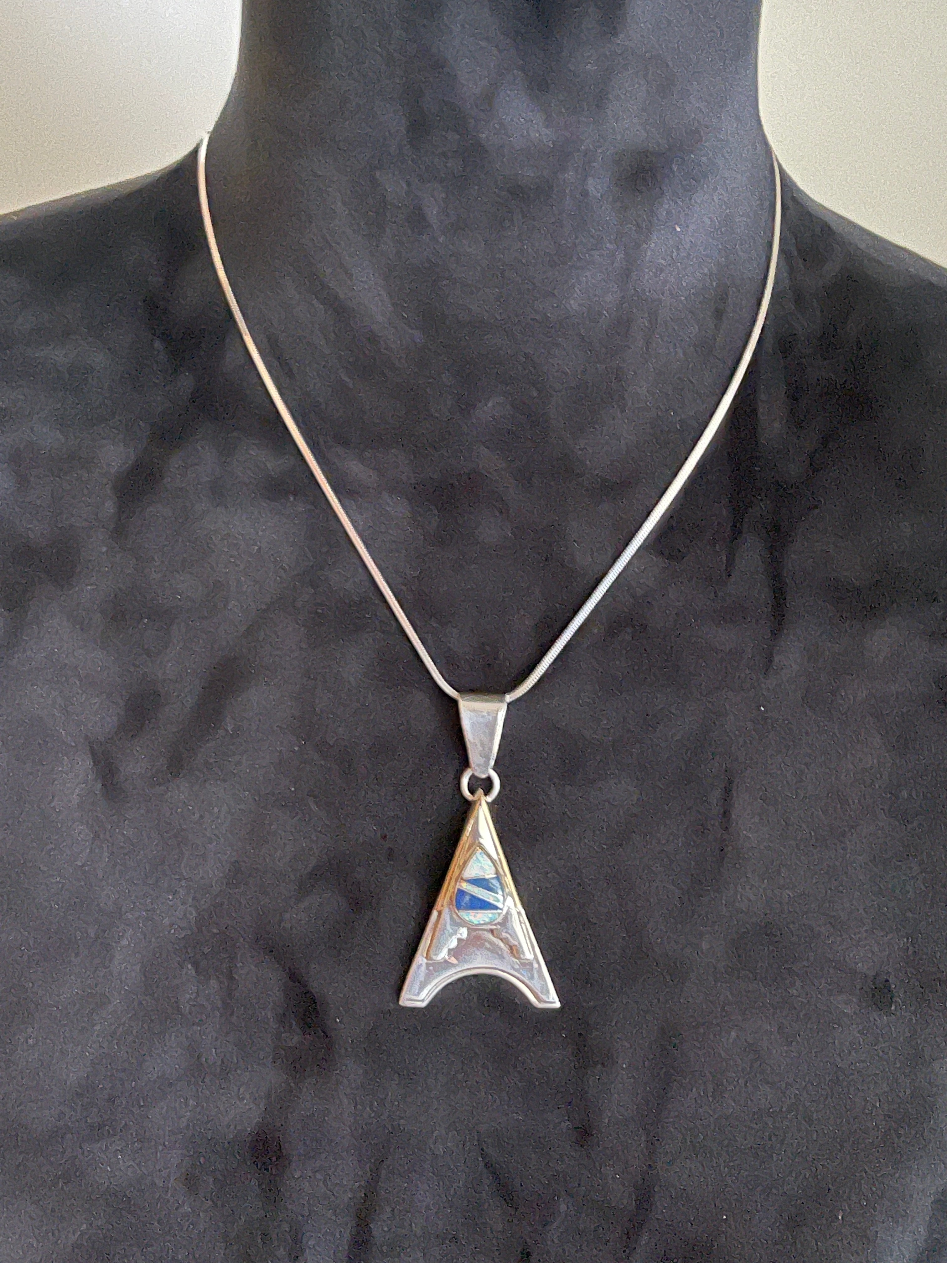 Navajo Made Multi Stone & Sterling Silver Inlay Necklace & Earring Set. The necklace measures just under 22 inches long with hang (Chain is 18 inches) while the earrings are 1 1/8 inches long & just under 7/8 of an inch wide. Signed by the artist and stamped sterling silver.