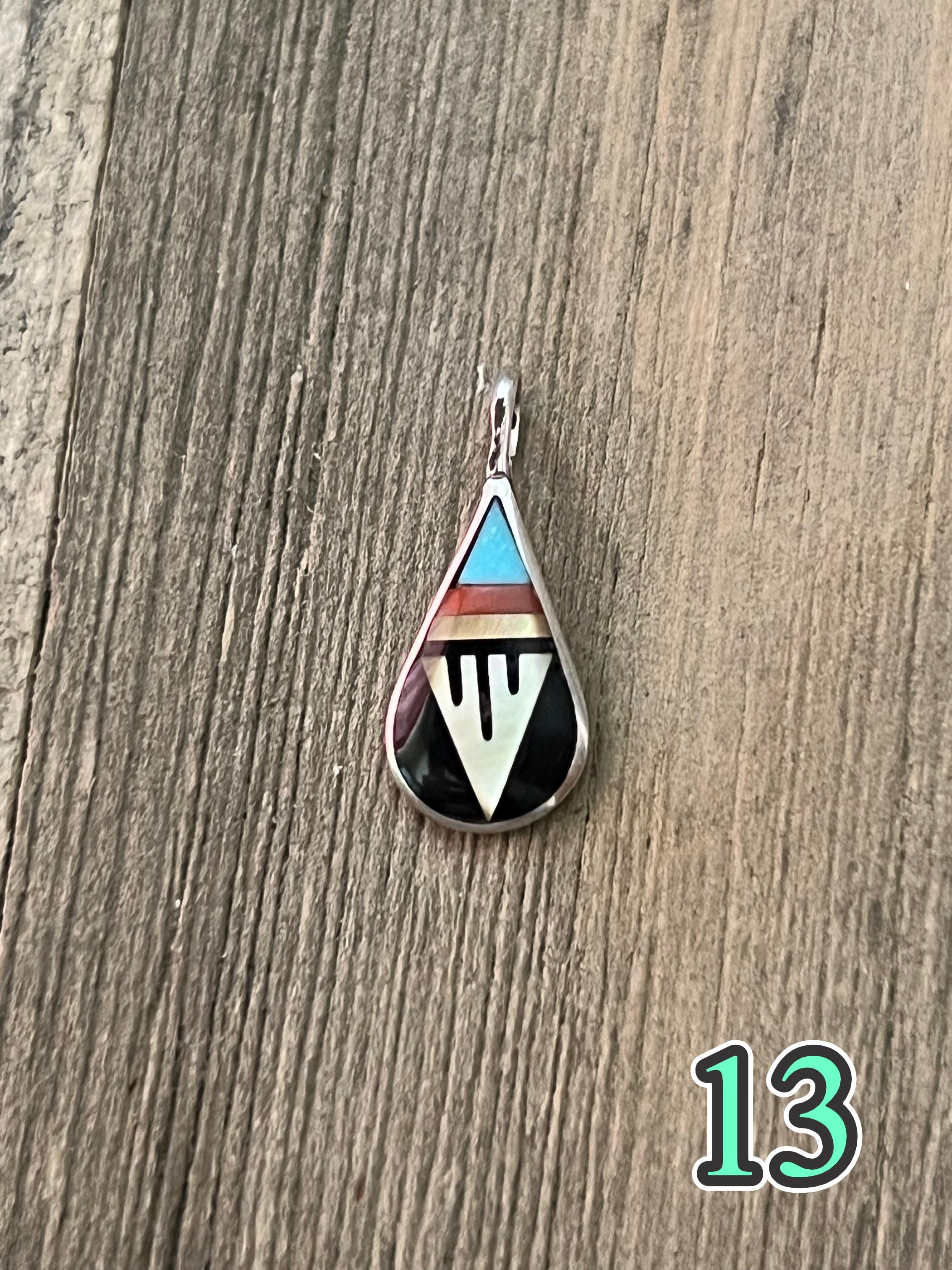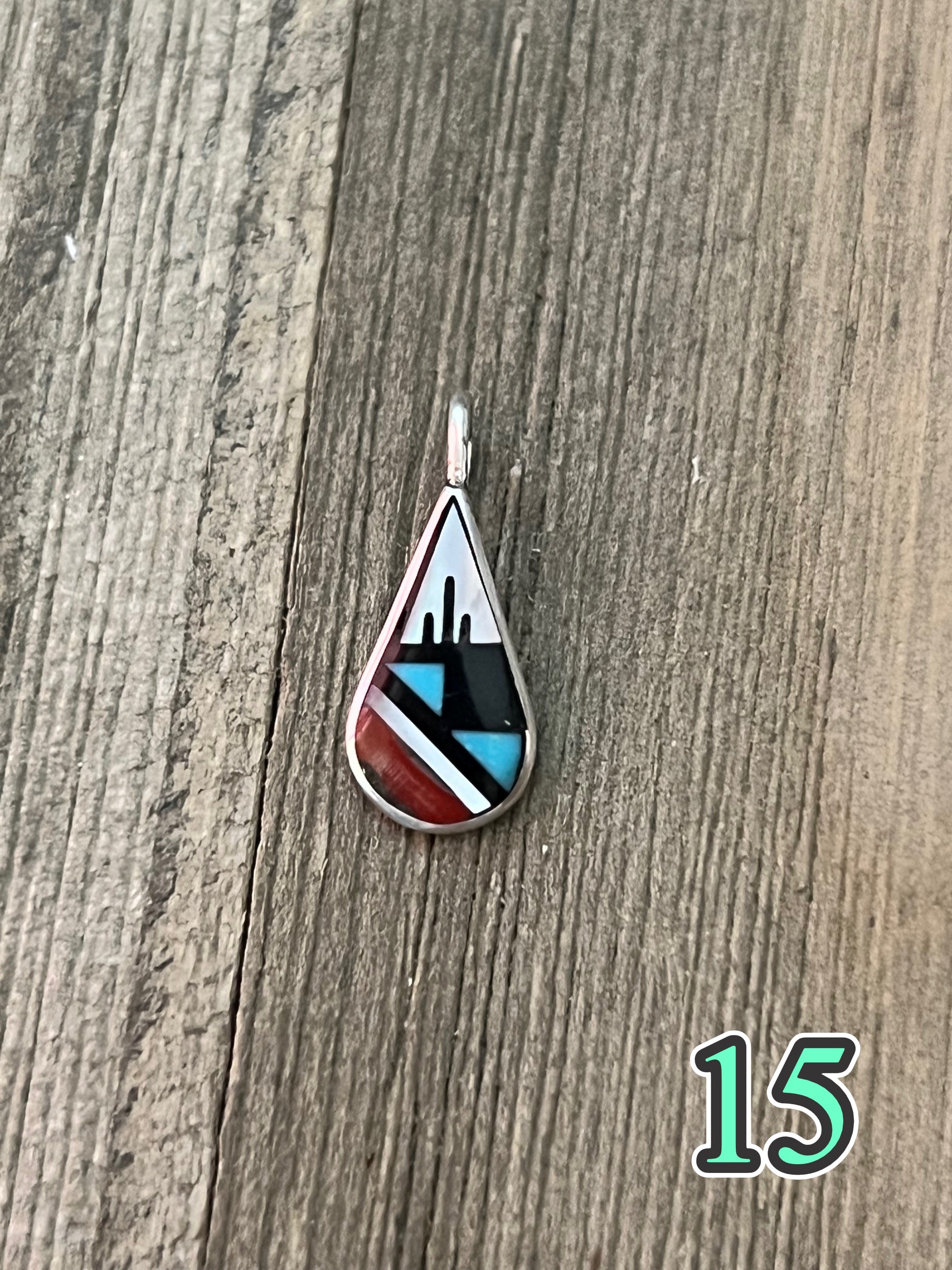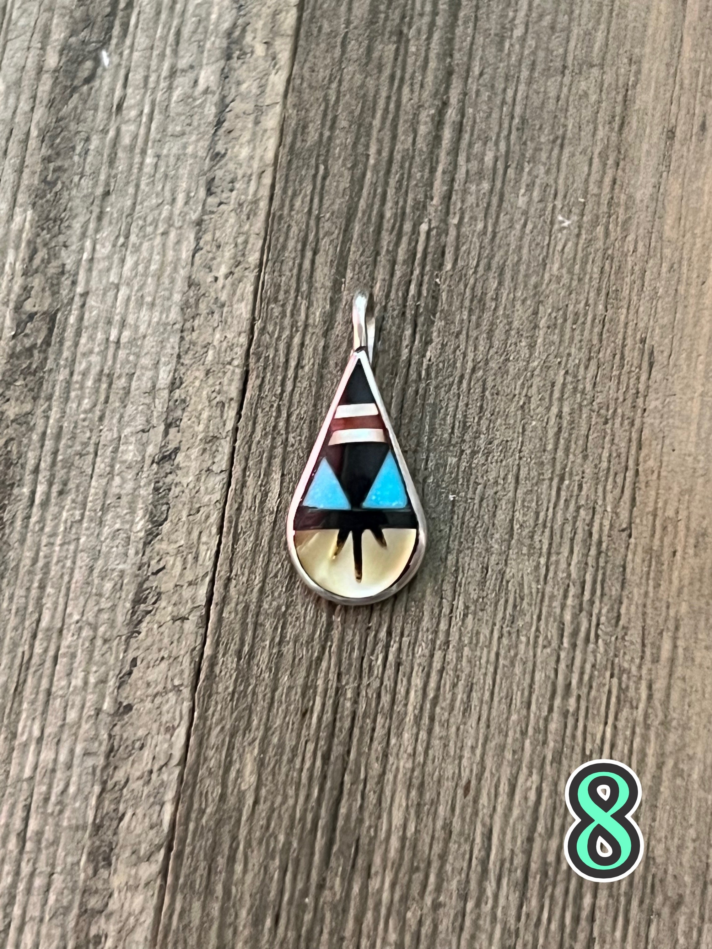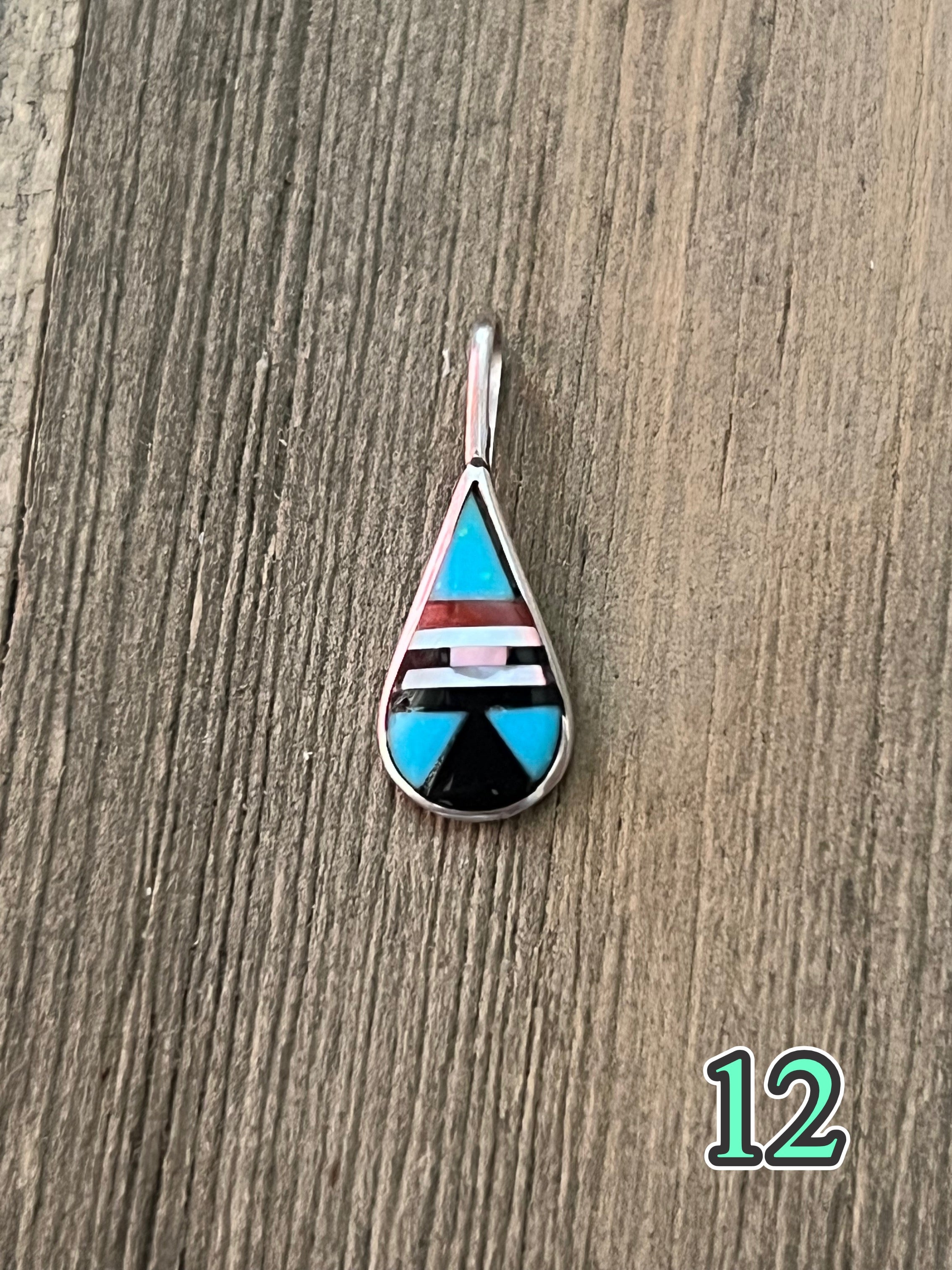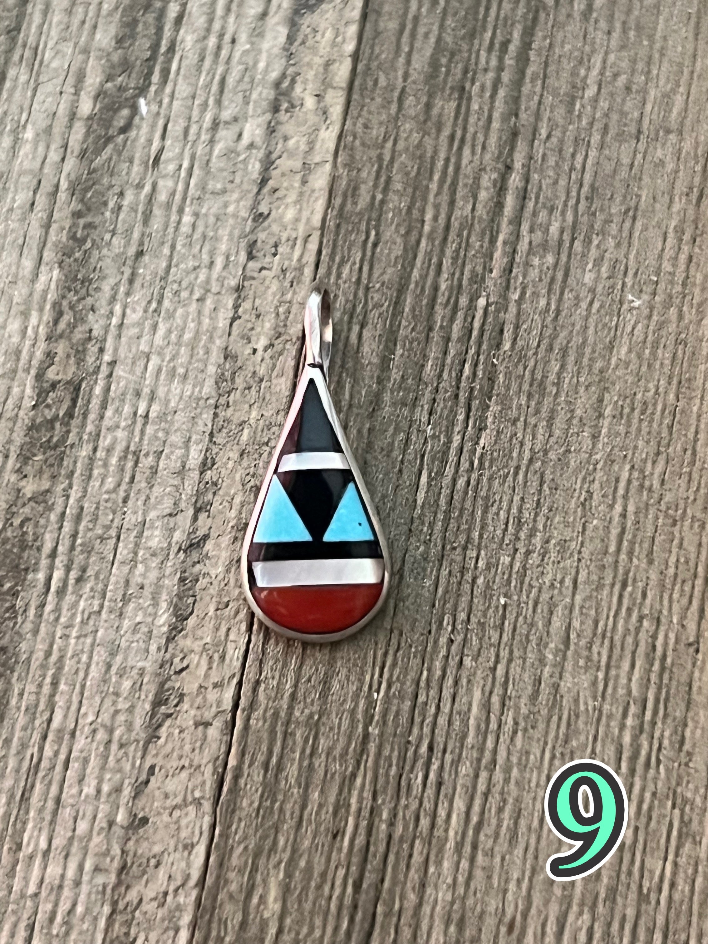 Navajo Made Multi Stone & Sterling Silver Inlay Pendant. It measures just under 7/8 of an inch long and just over 1/4 of an inch wide. Pendant Only!! Signed by the artist and stamped sterling silver.