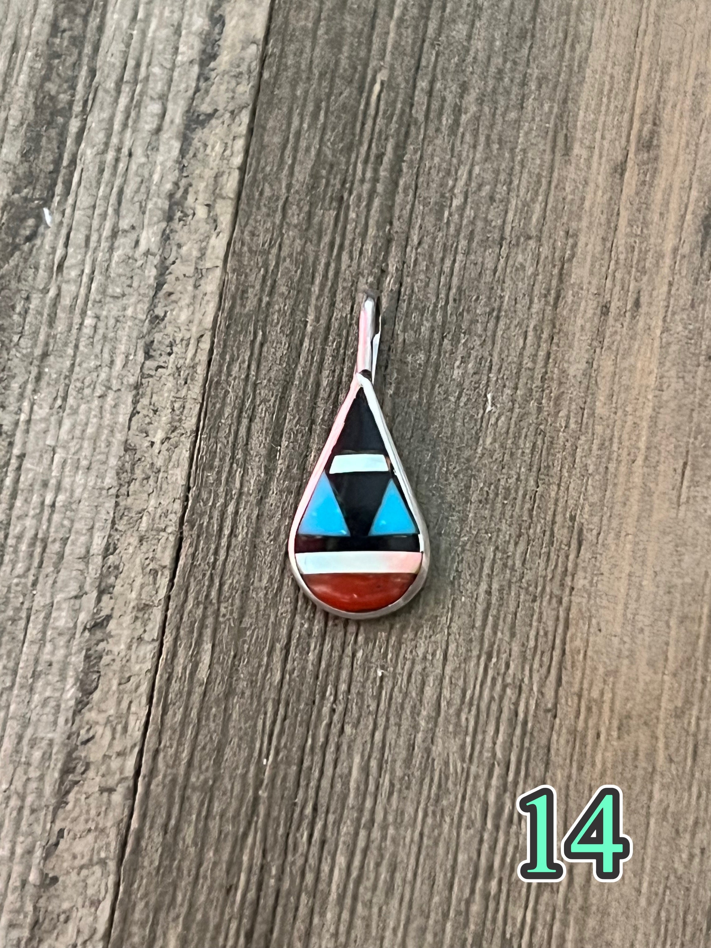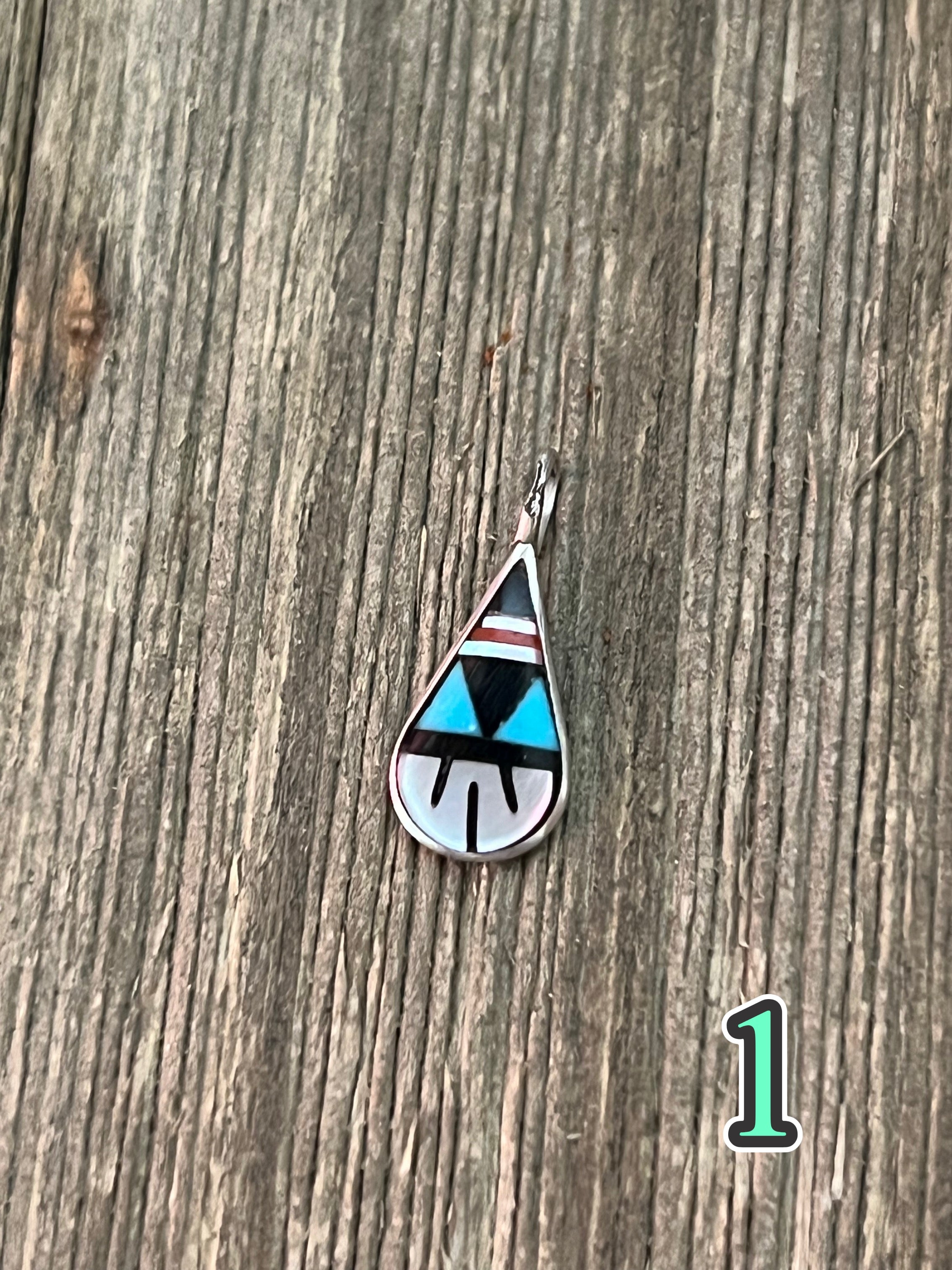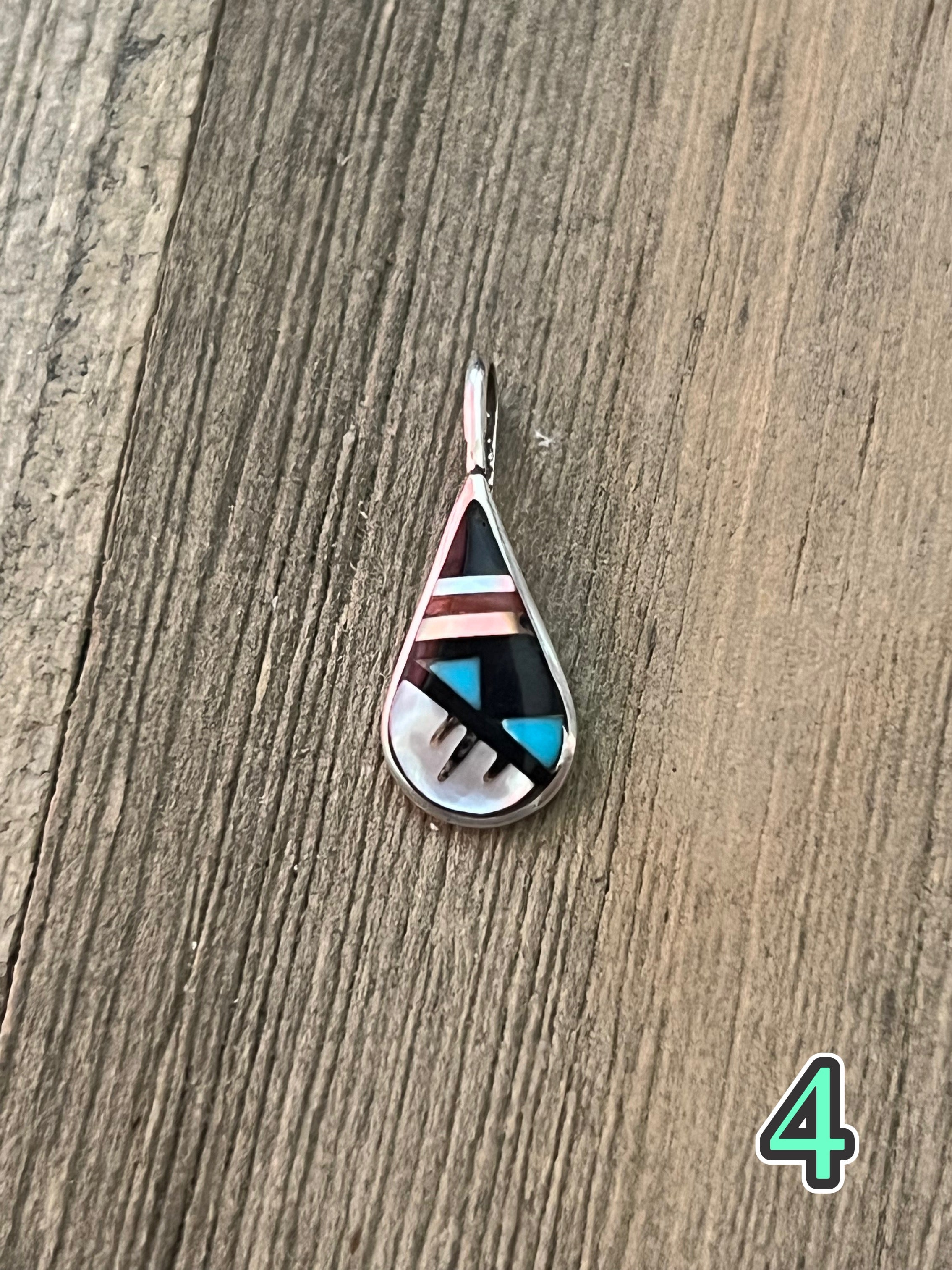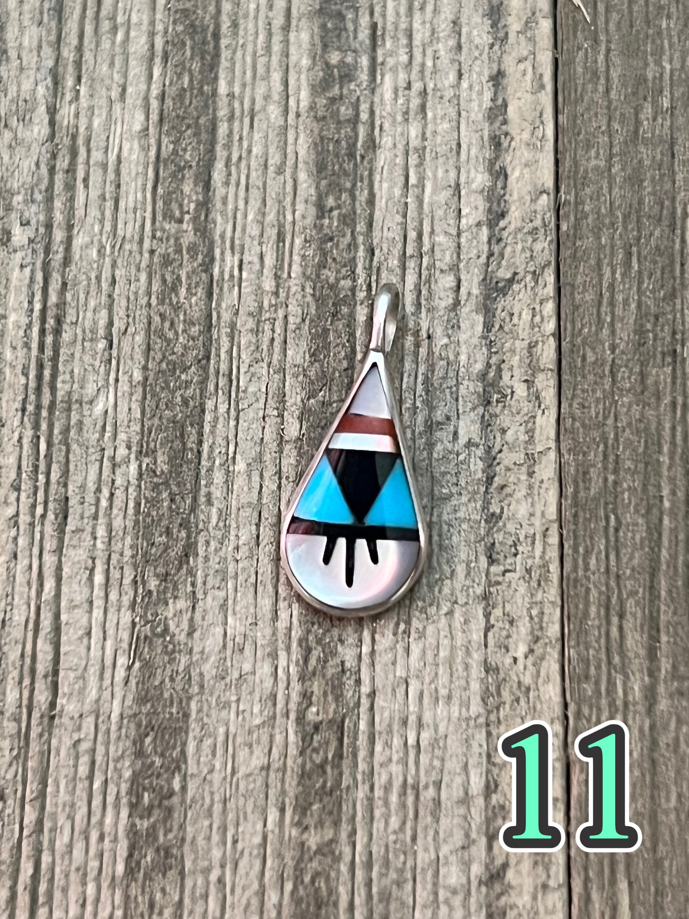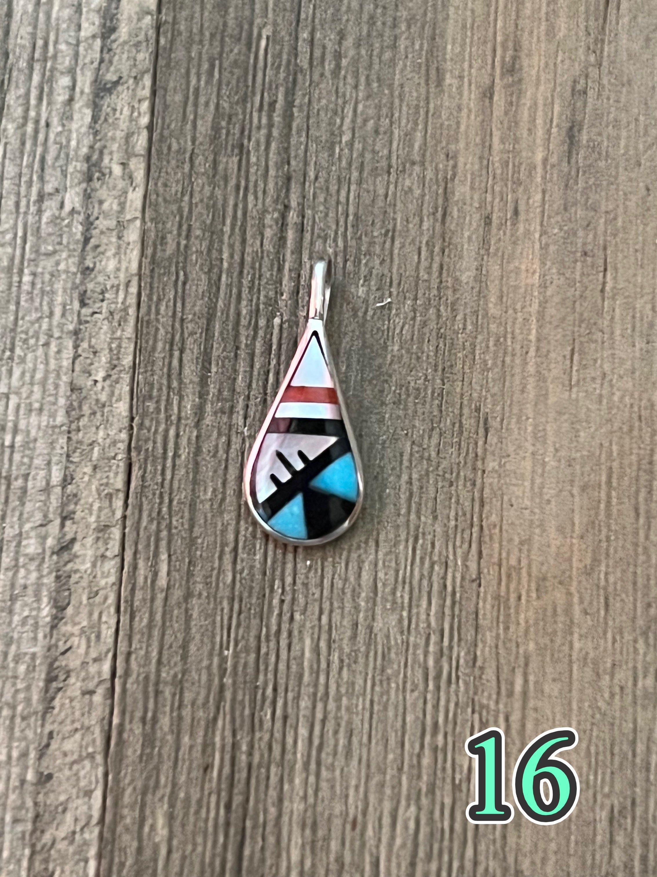 Navajo Made Multi Stone & Sterling Silver Inlay Pendant. It measures just under 7/8 of an inch long and just over 1/4 of an inch wide. Pendant Only!! Signed by the artist and stamped sterling silver.