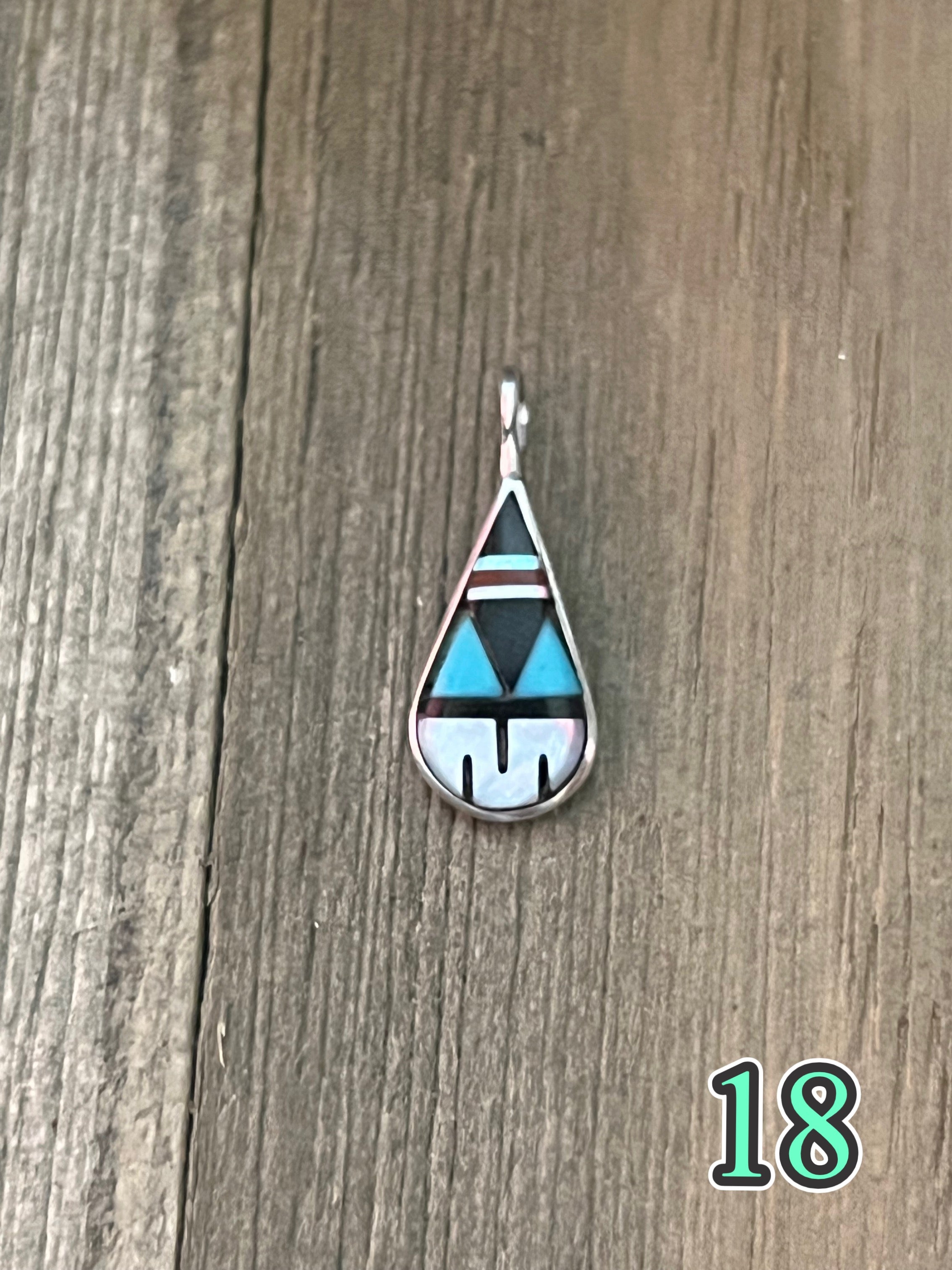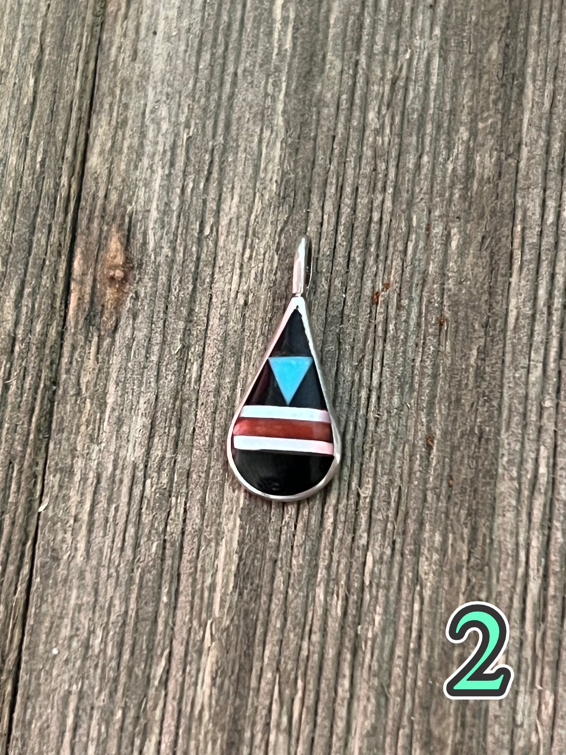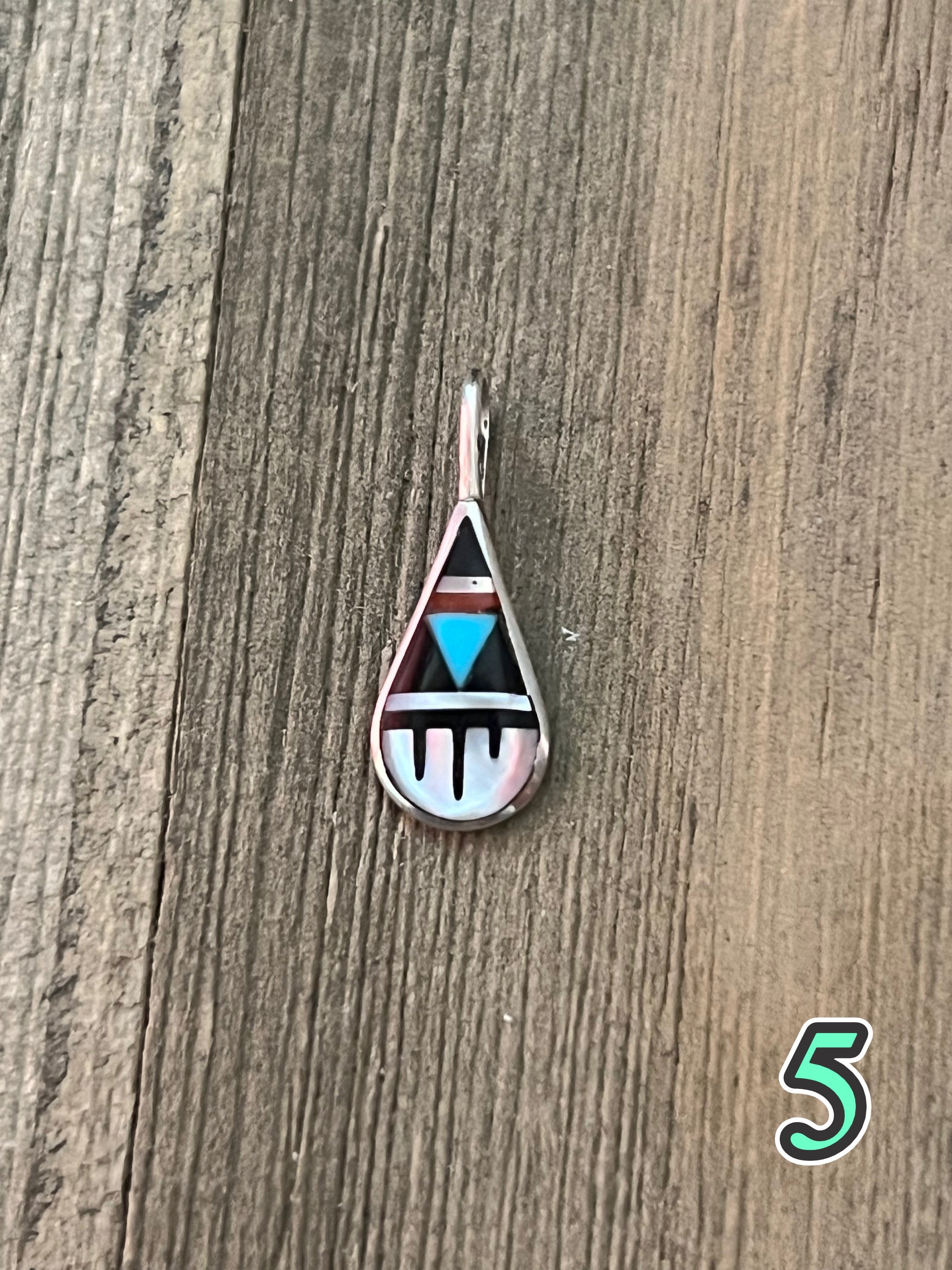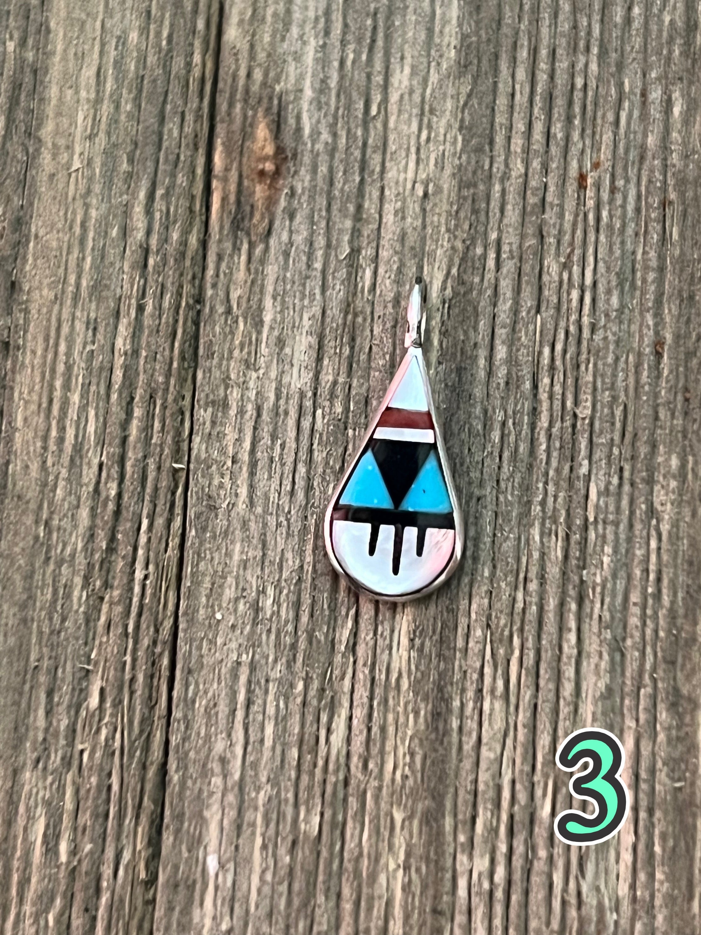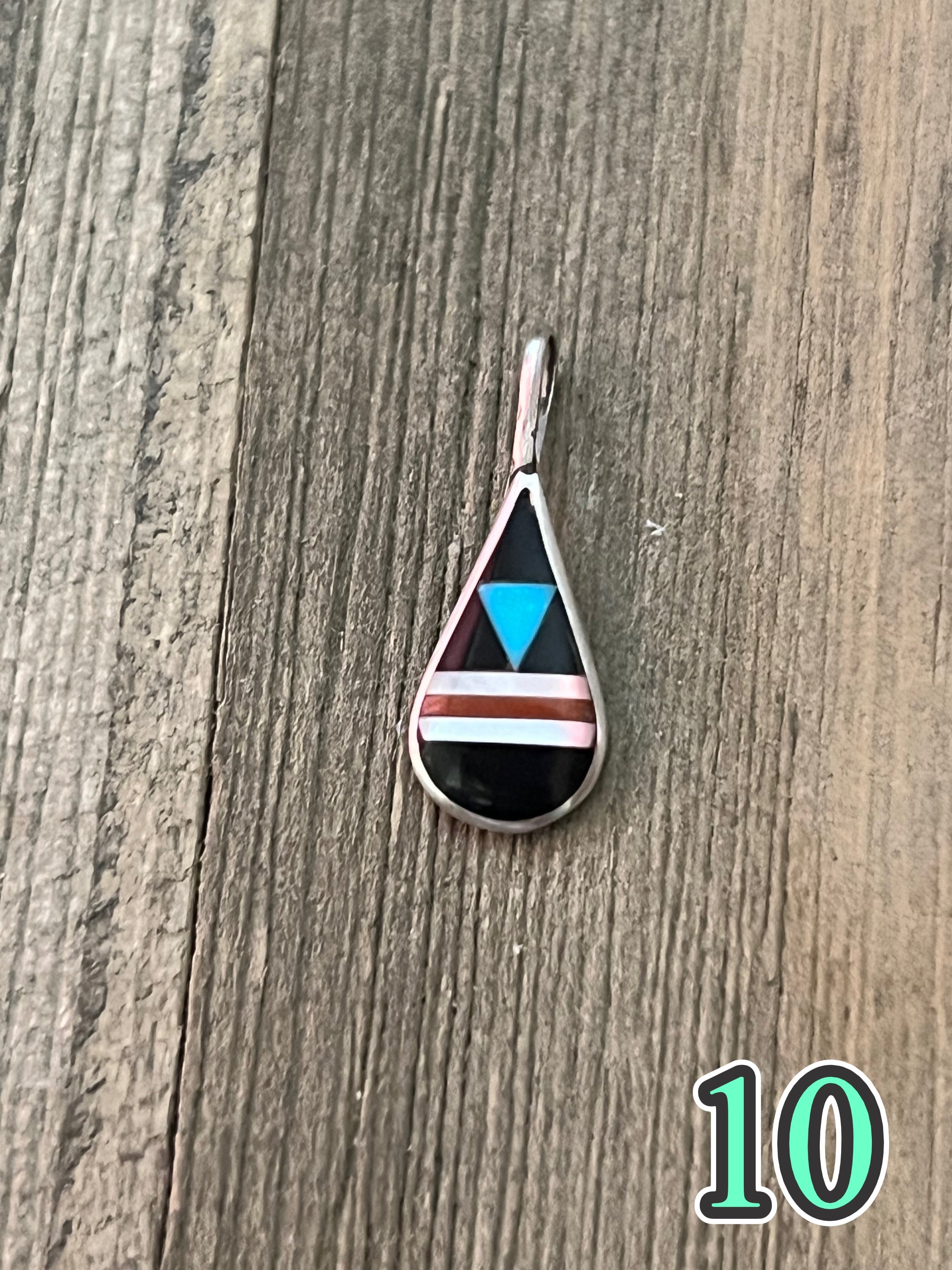 Navajo Made Multi Stone & Sterling Silver Inlay Pendant. It measures just under 7/8 of an inch long and just over 1/4 of an inch wide. Pendant Only!! Signed by the artist and stamped sterling silver.