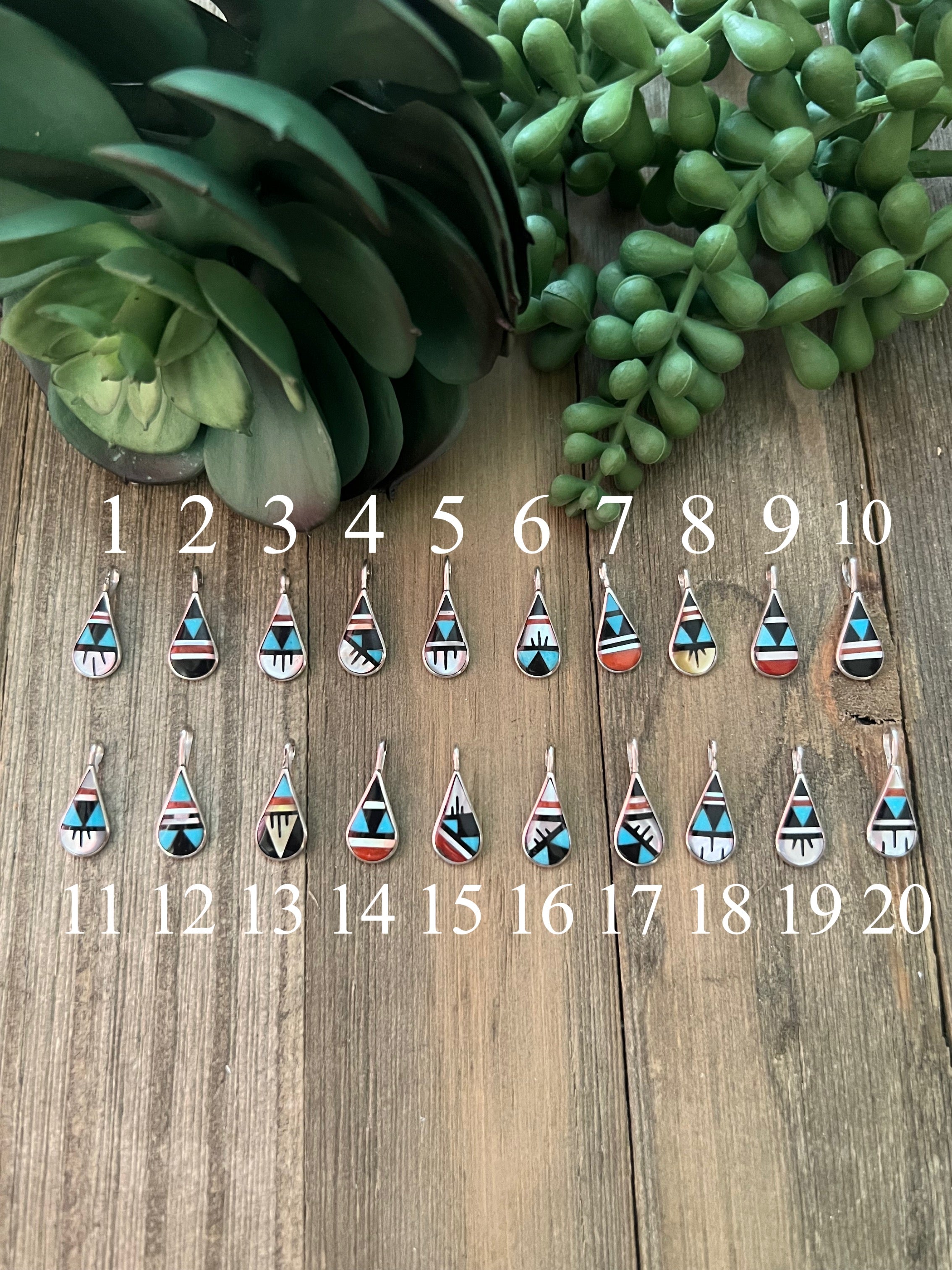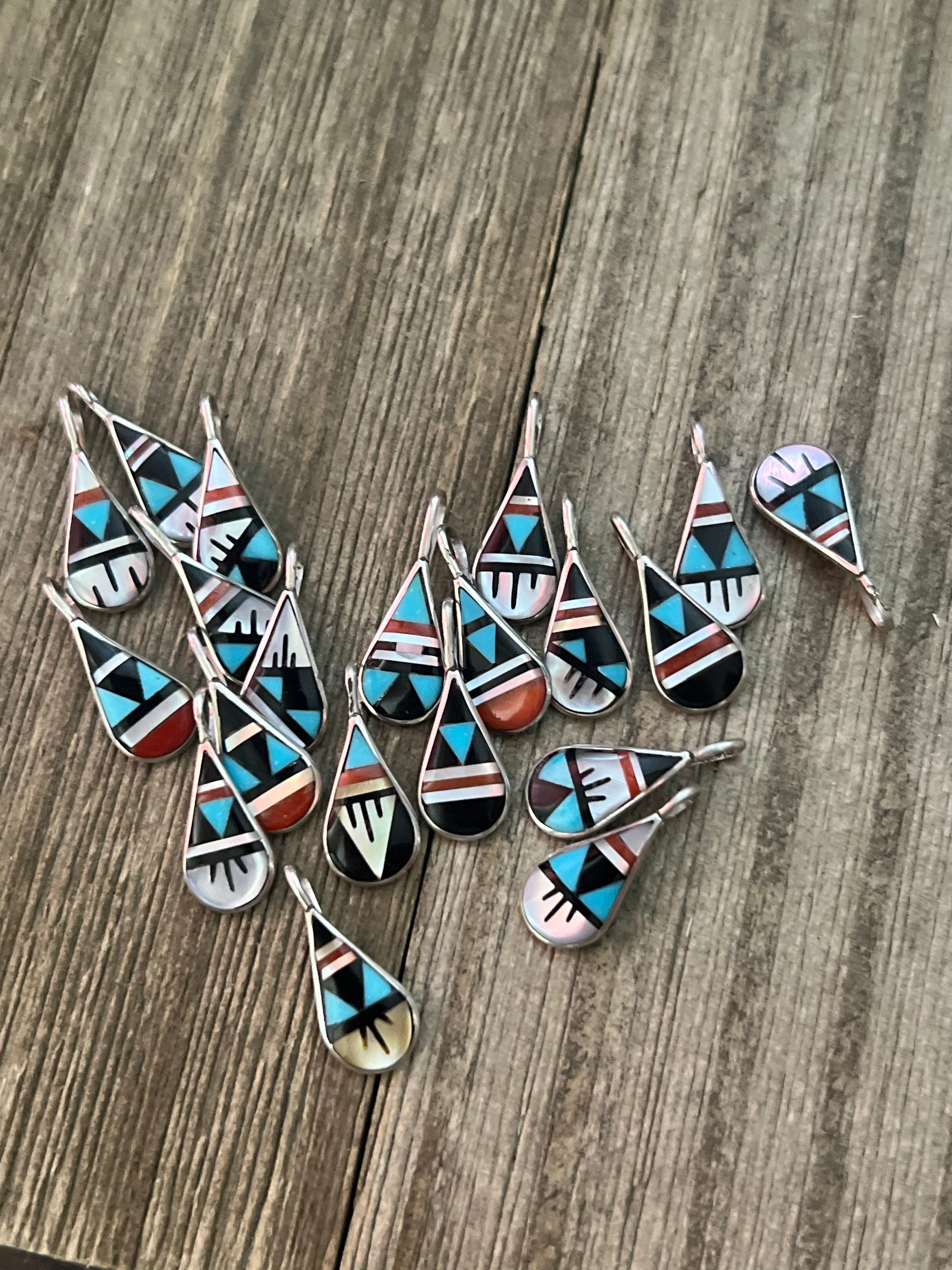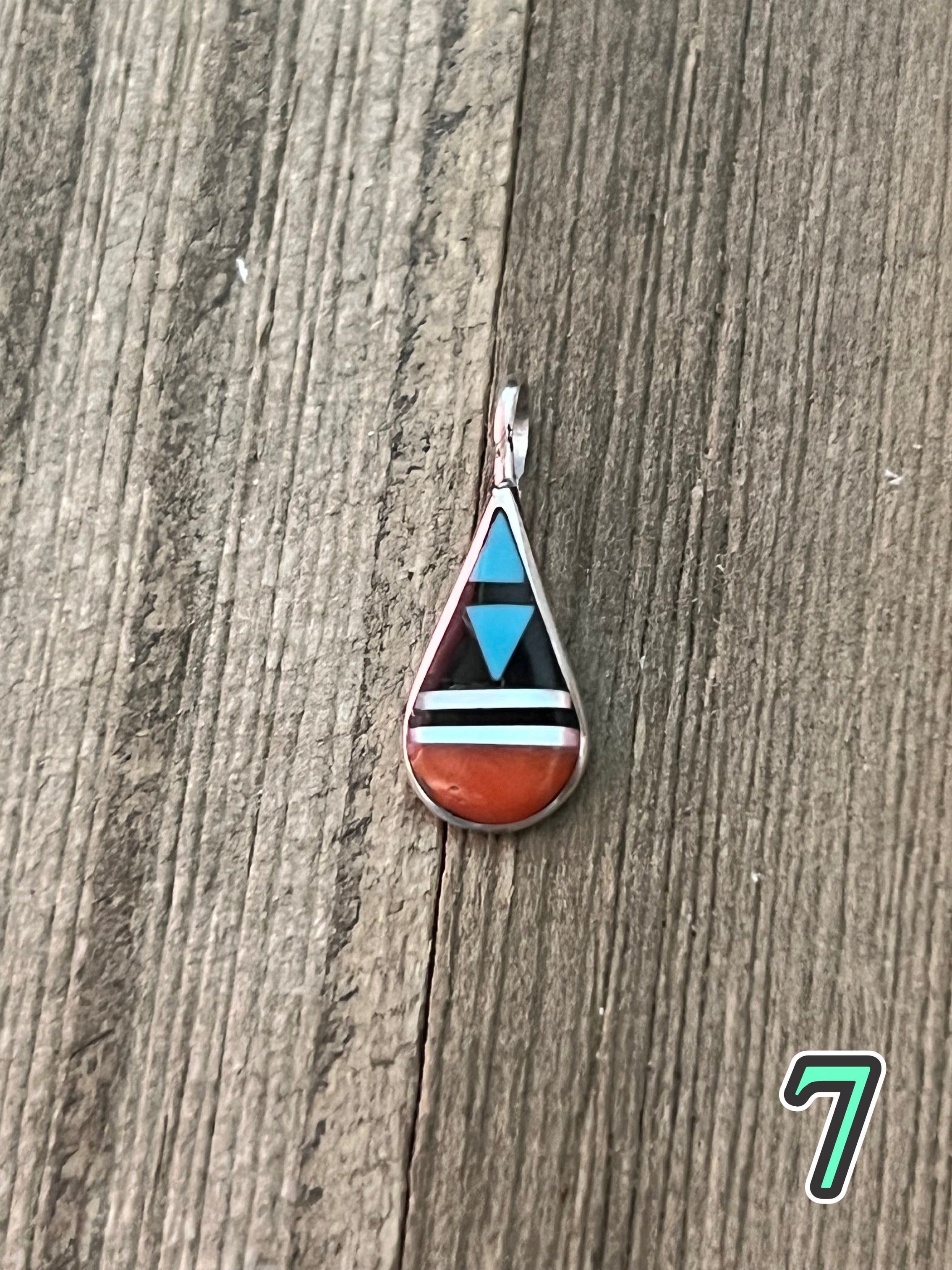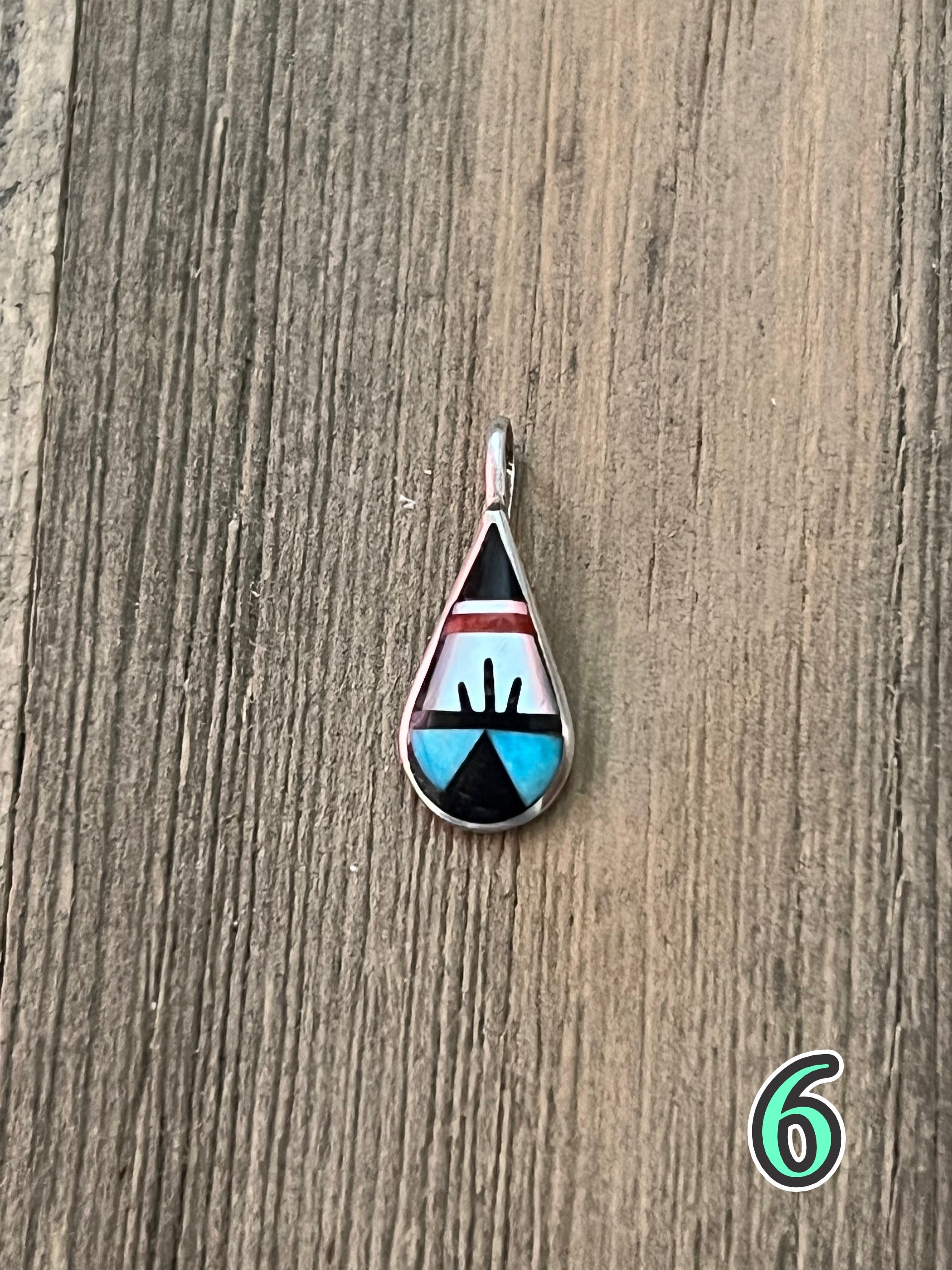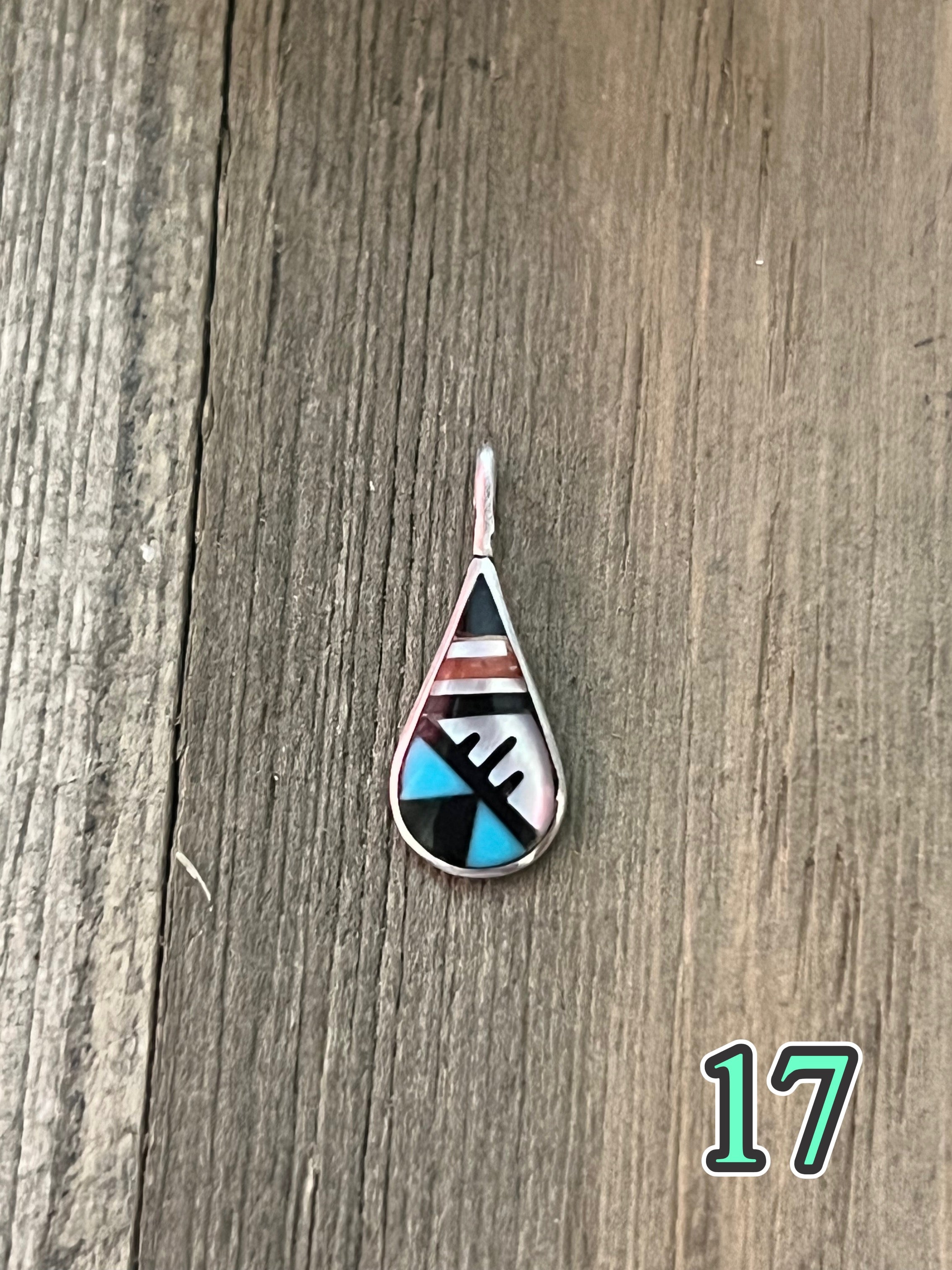 Navajo Made Multi Stone & Sterling Silver Inlay Pendant. It measures just under 7/8 of an inch long and just over 1/4 of an inch wide. Pendant Only!! Signed by the artist and stamped sterling silver.