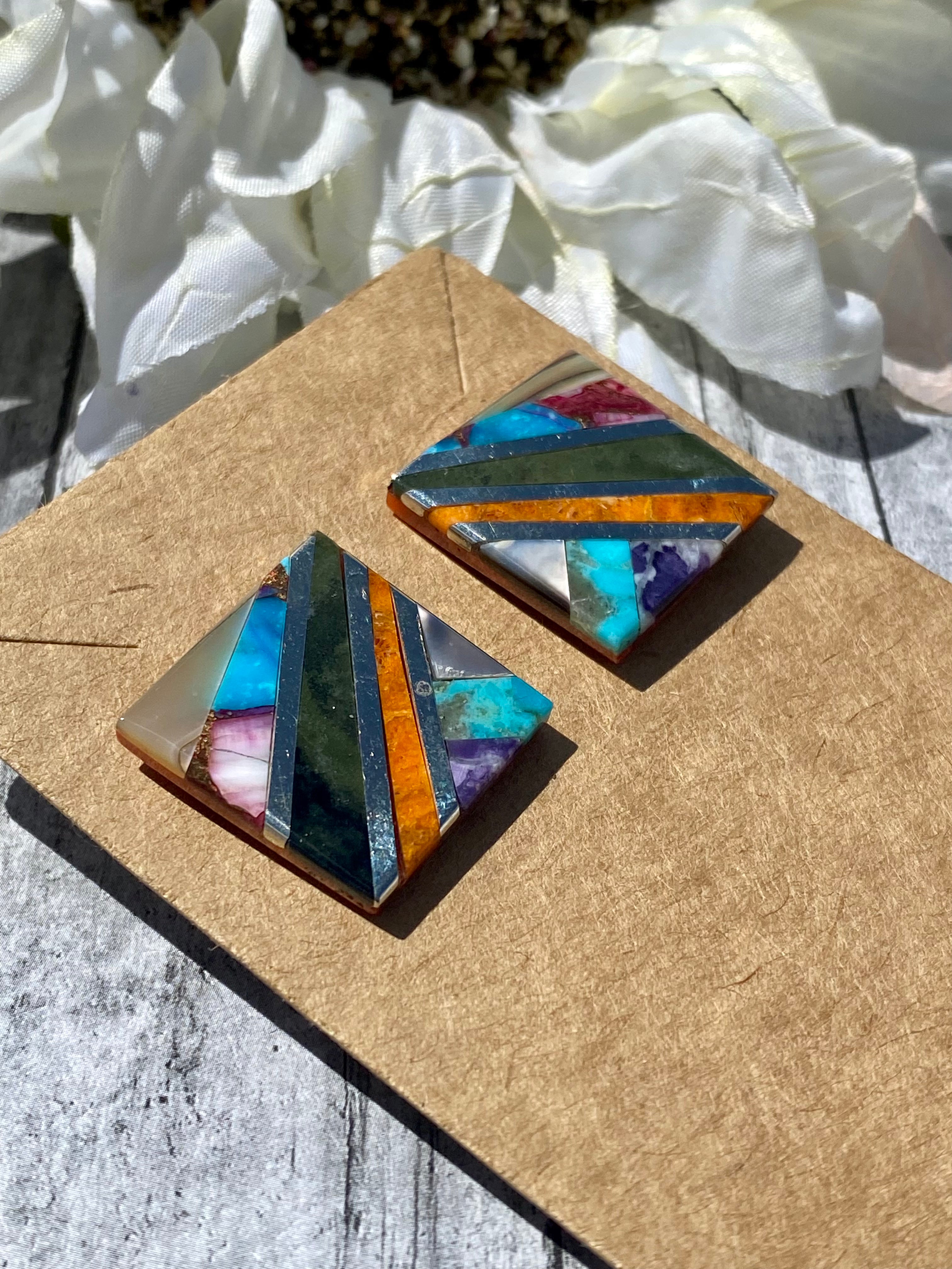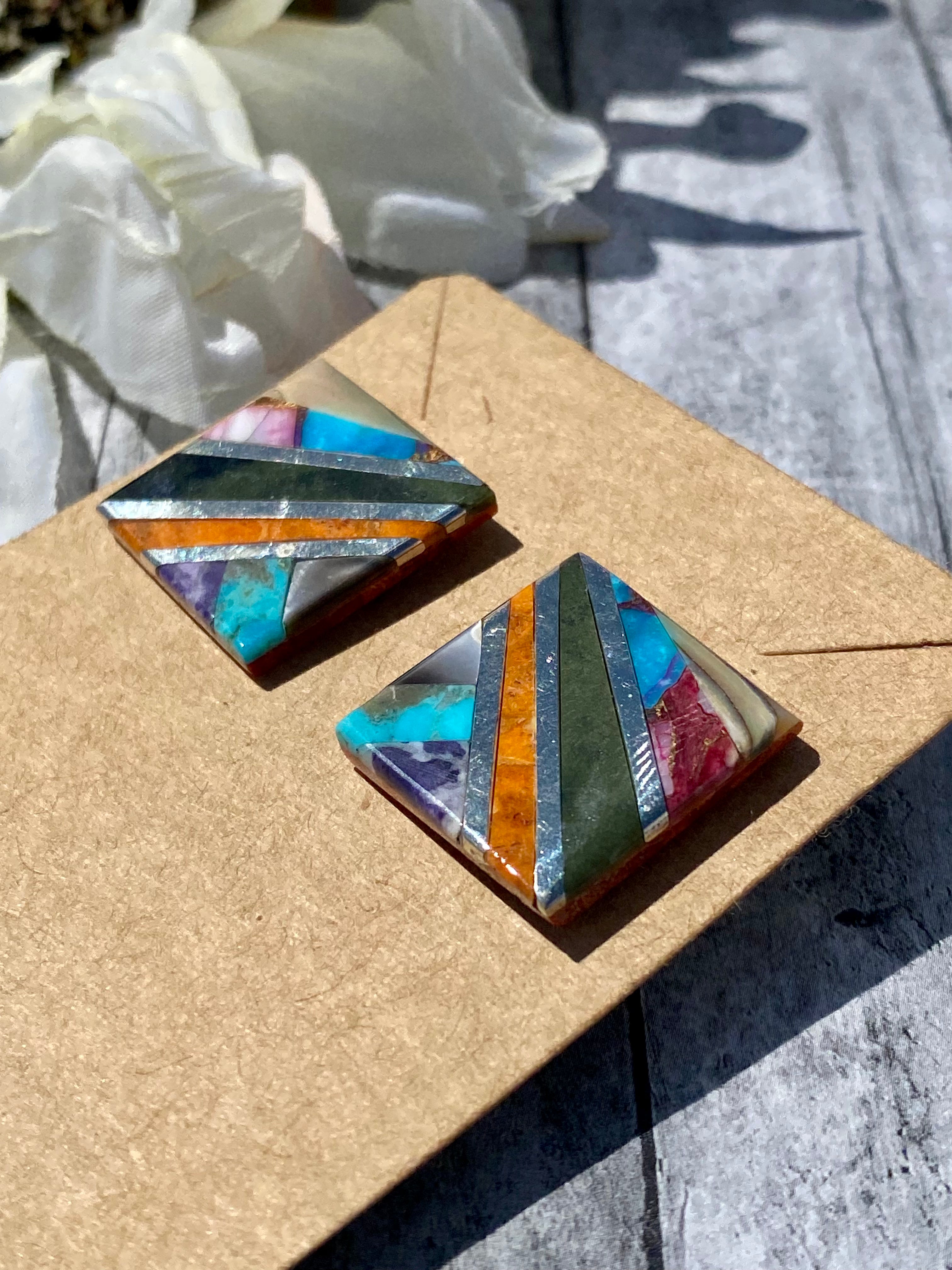 Navajo Made Multi Stone & Sterling Silver Inlay Post Earrings. They measure 7/8 of an inch long and just over 3/4 of an inch wide.