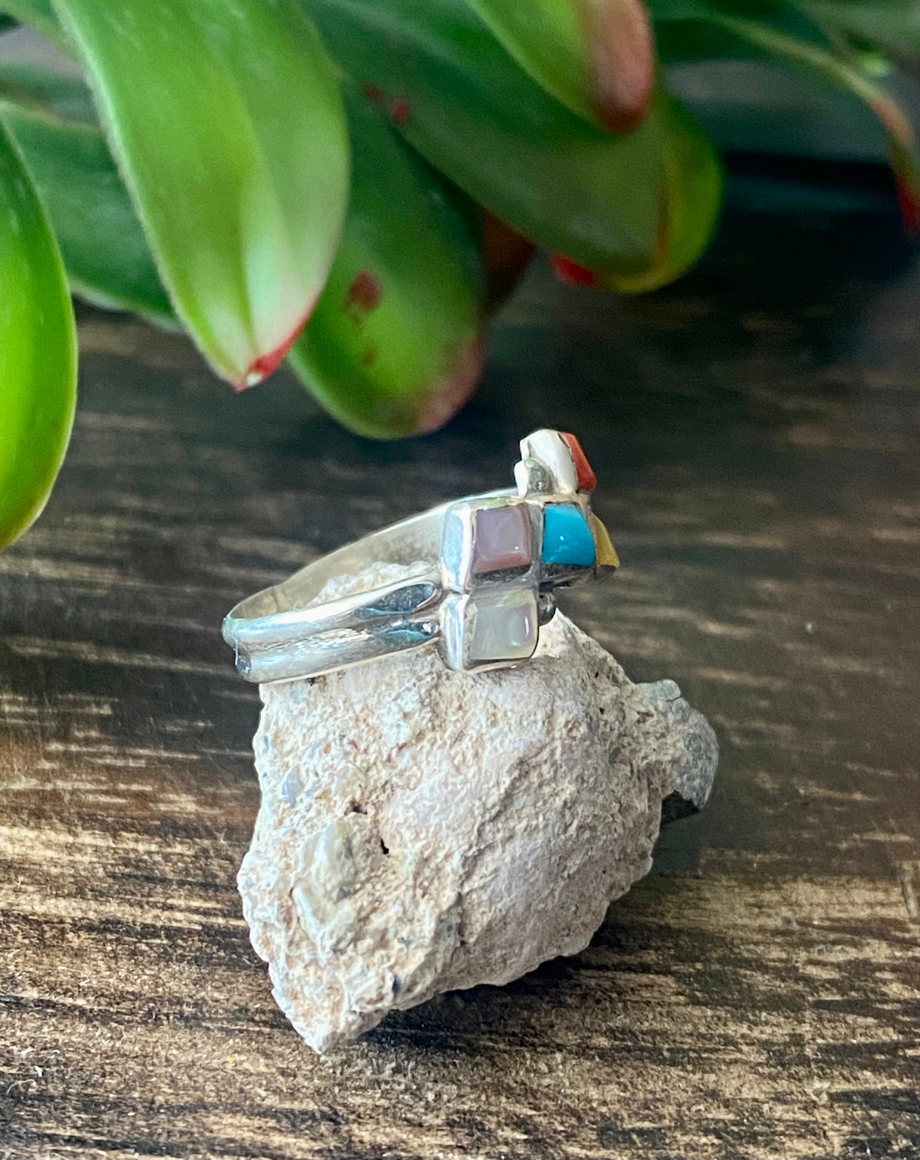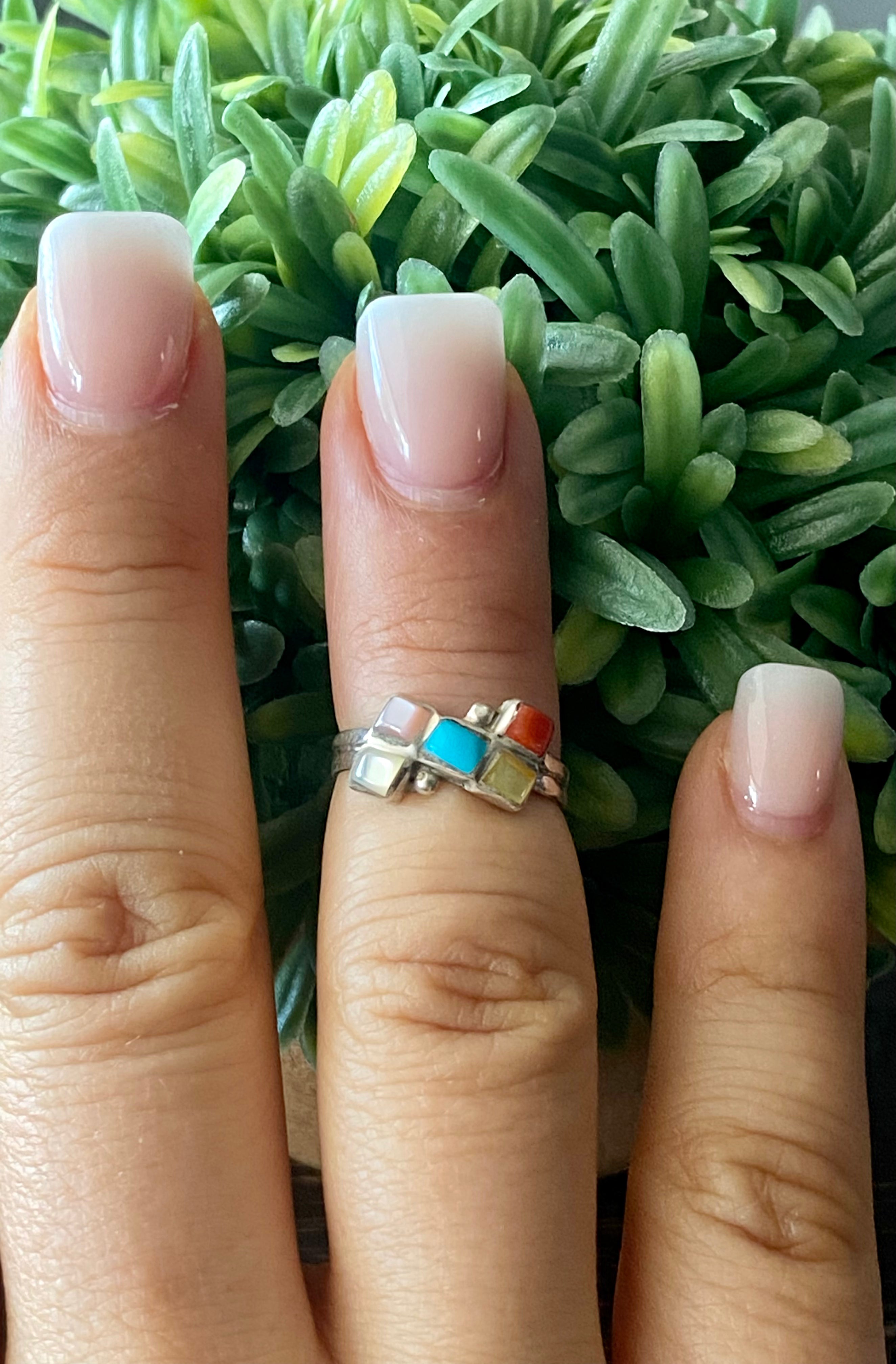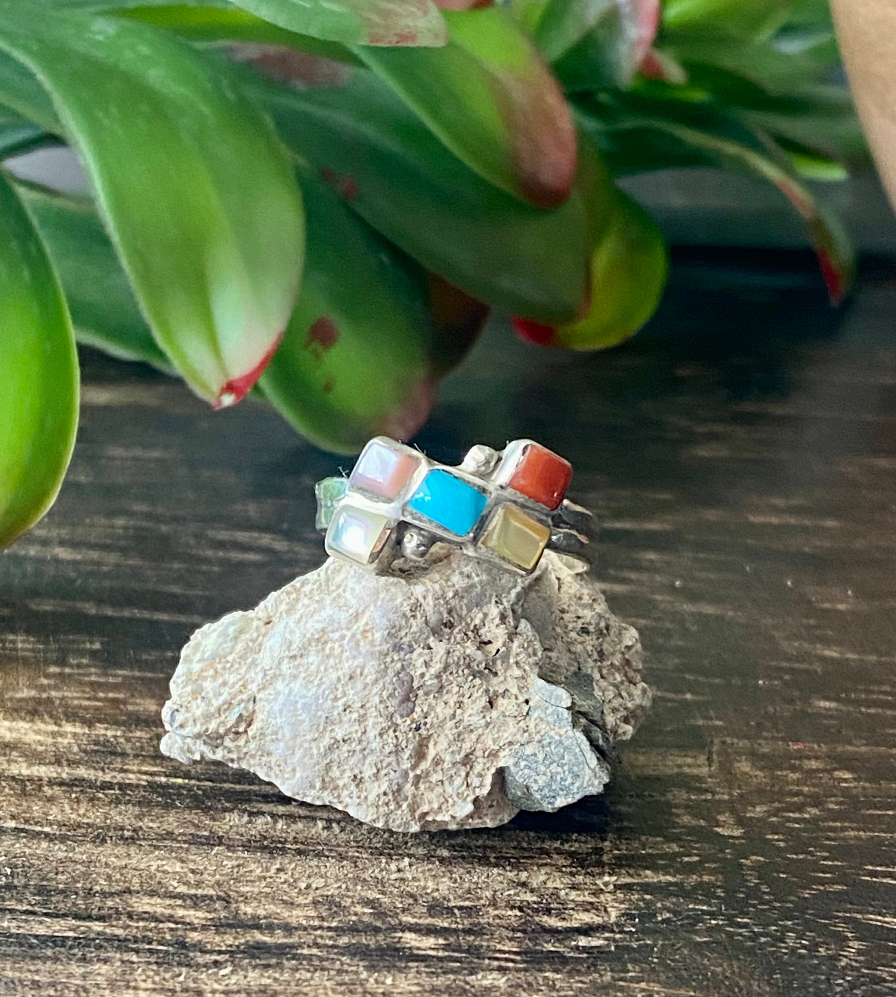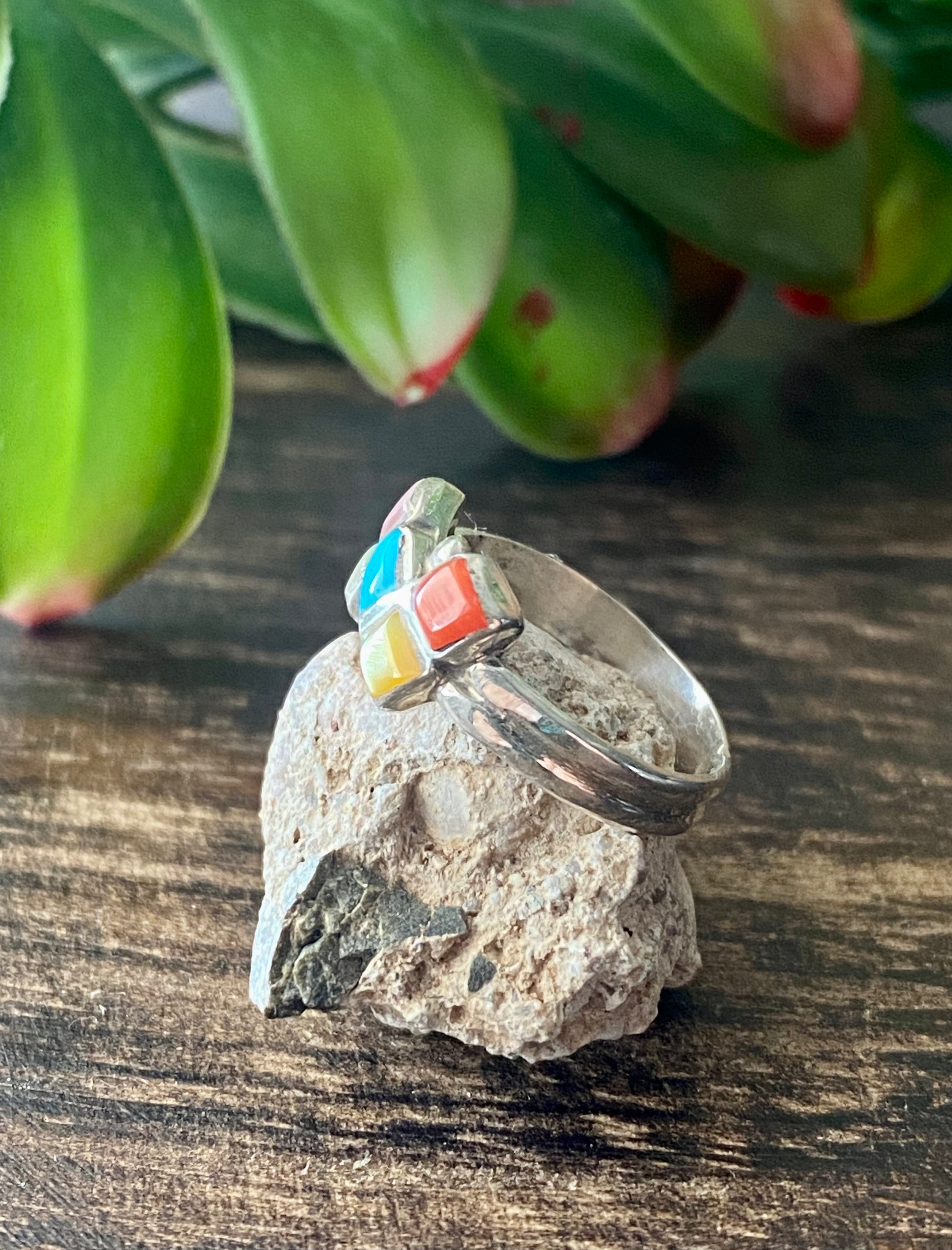 Navajo Made Multi Stone & Sterling Silver Inlay Ring Size 5