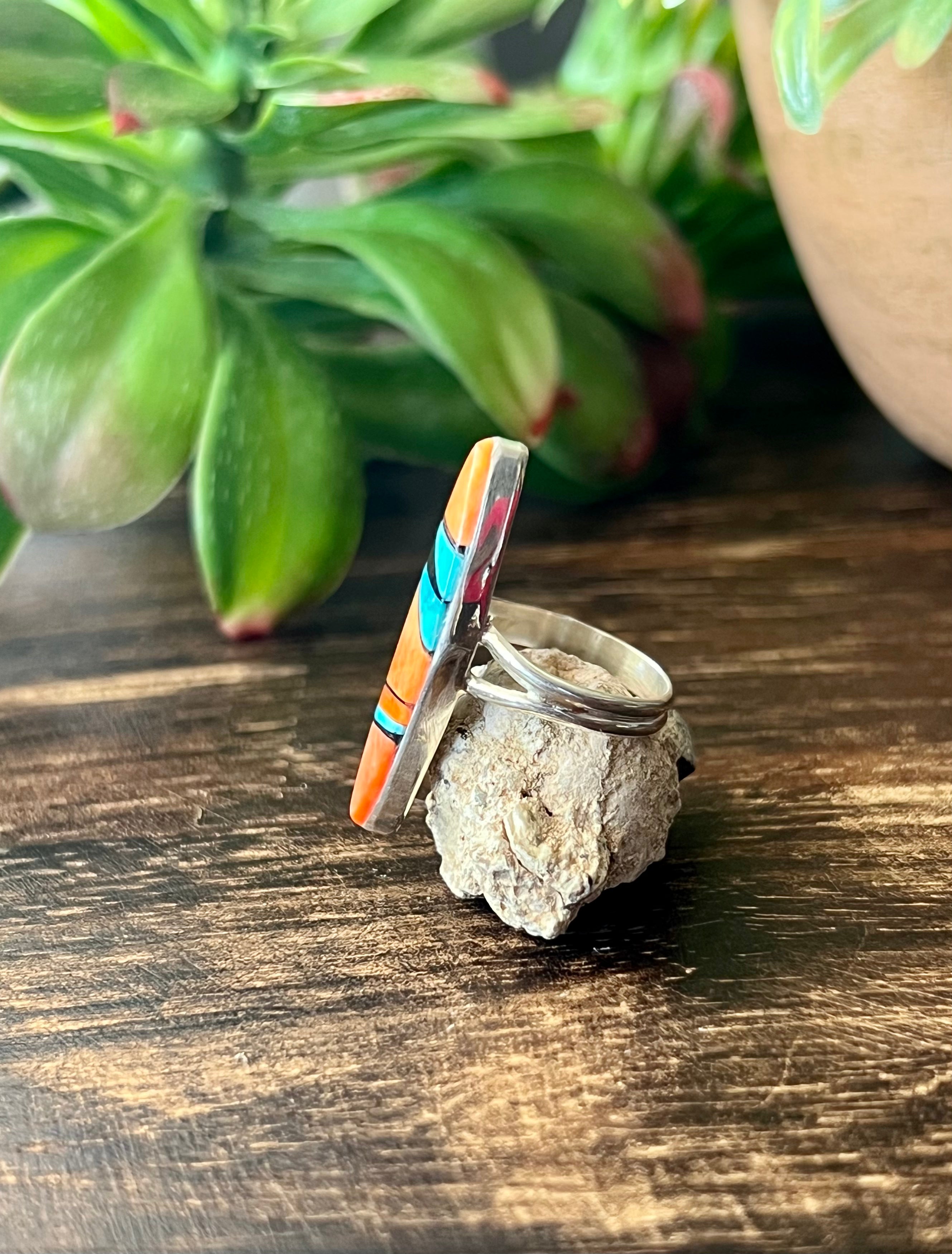 Navajo Made Multi Stone & Sterling Silver Inlay Ring Size 5.25. It measures 1 1/4 inches long and just over 1/4 of an inch wide. Signed by the artist and stamped sterling silver.