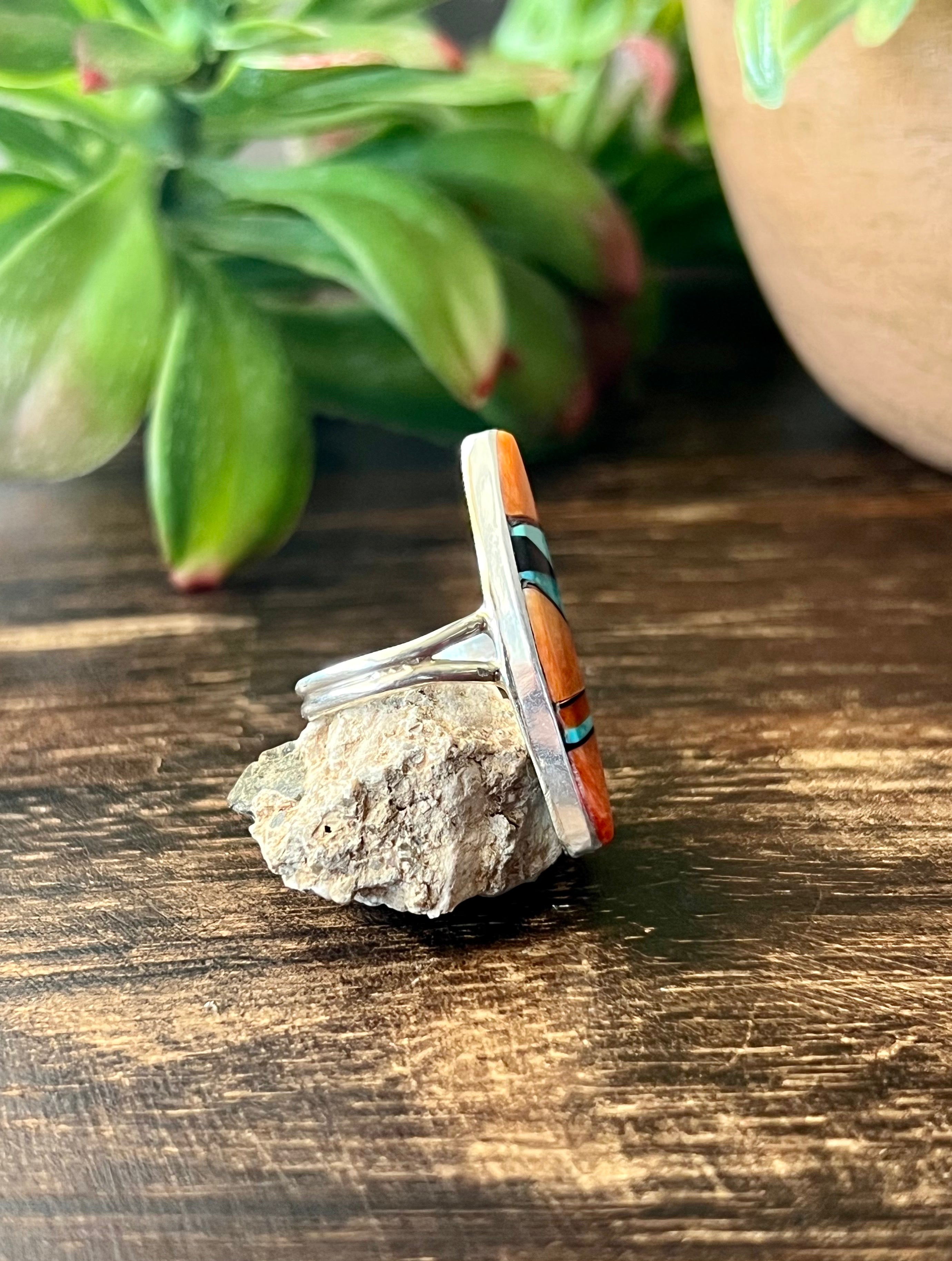 Navajo Made Multi Stone & Sterling Silver Inlay Ring Size 5.25