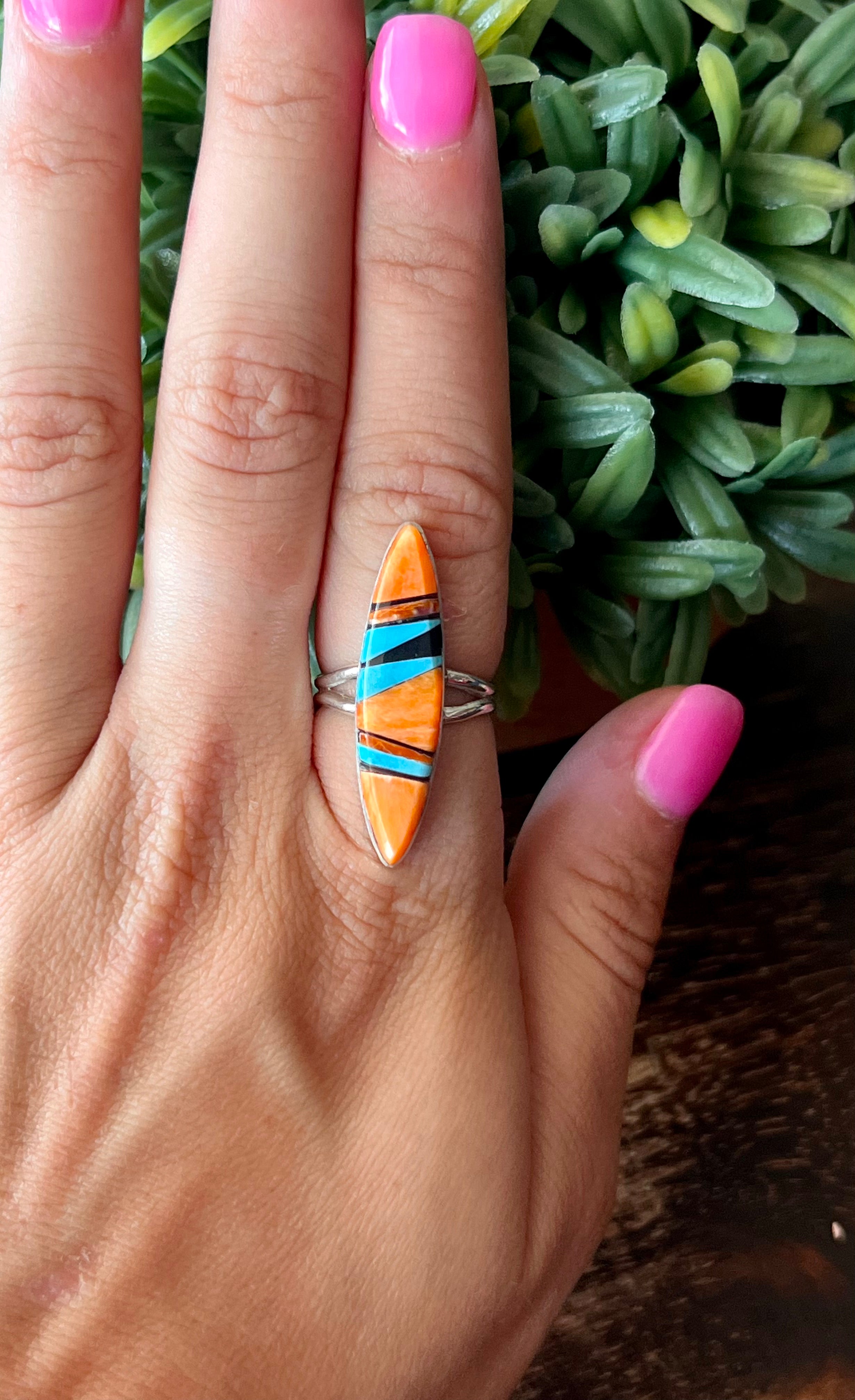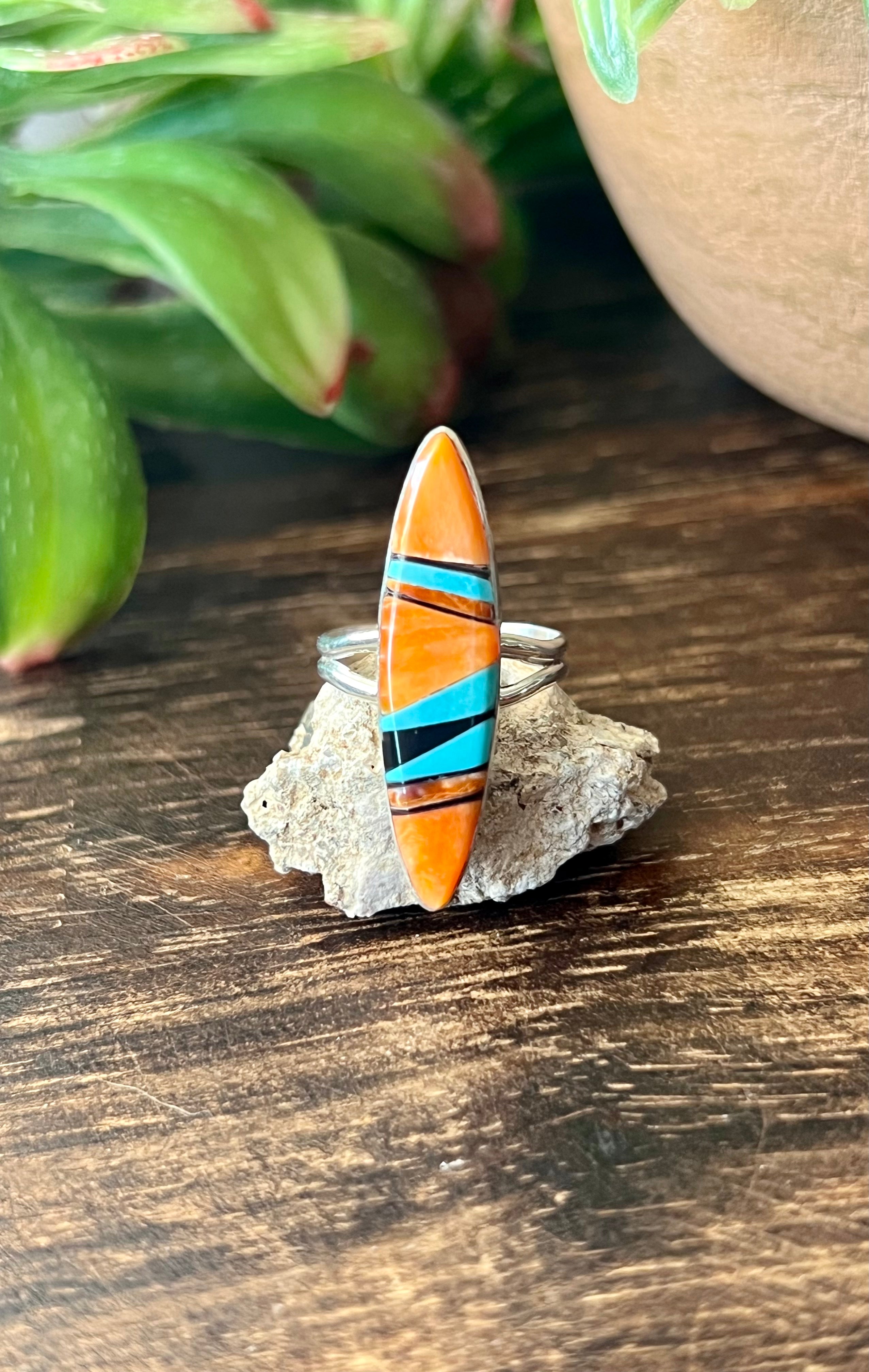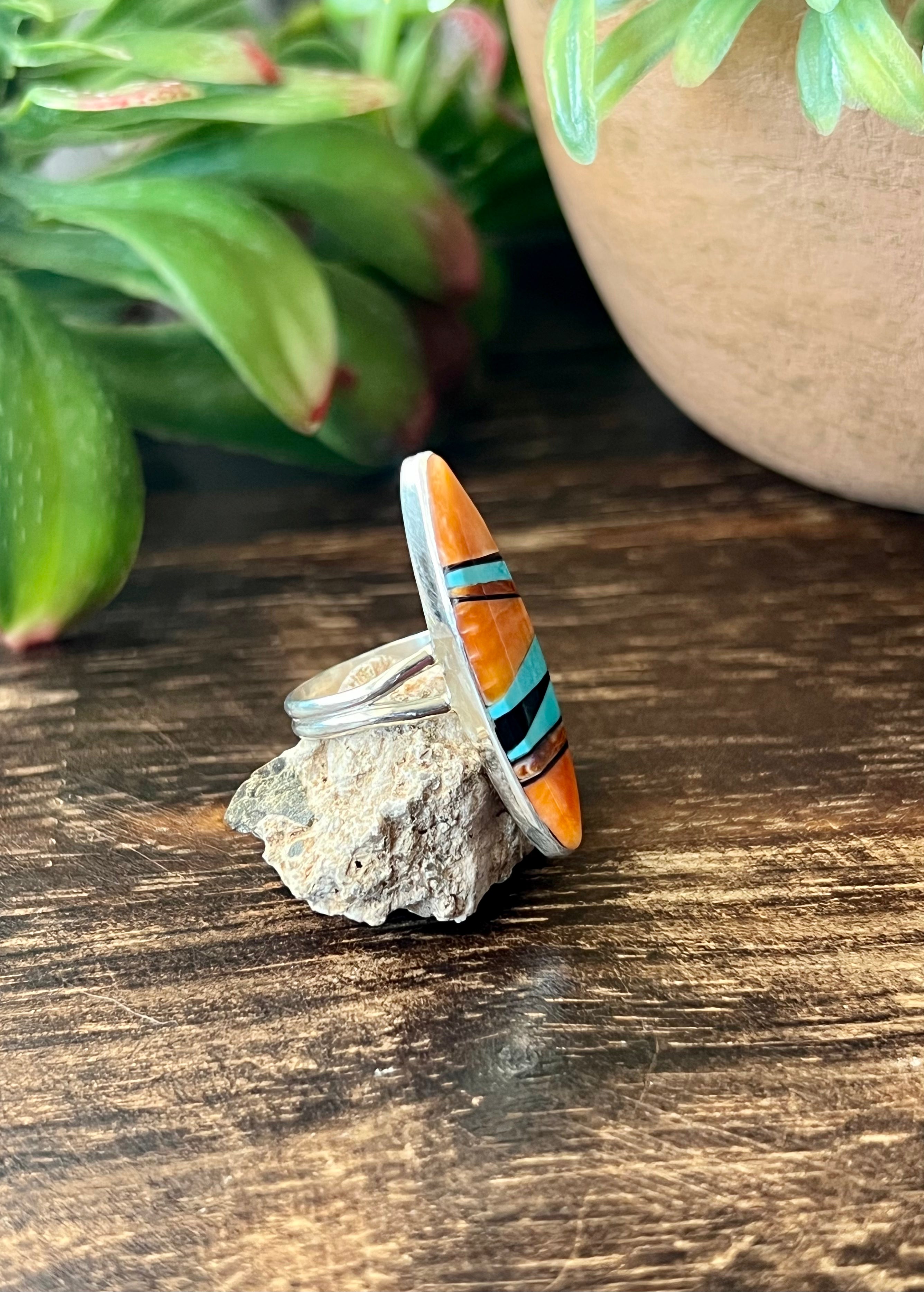 Navajo Made Multi Stone & Sterling Silver Inlay Ring Size 5.5. It measures 1 1/4 inches long and just over 1/4 of an inch wide. Signed by the artist and stamped sterling silver.