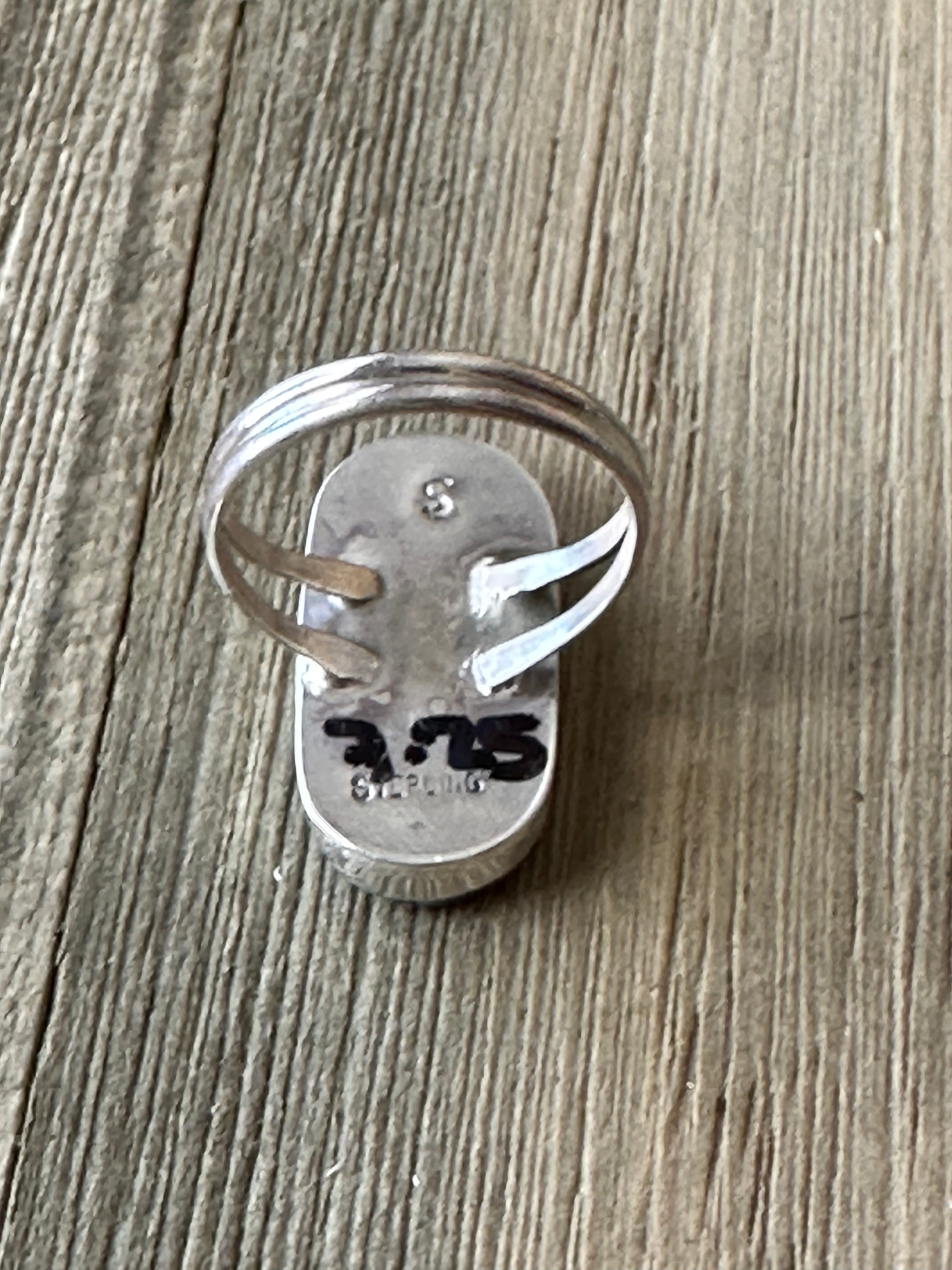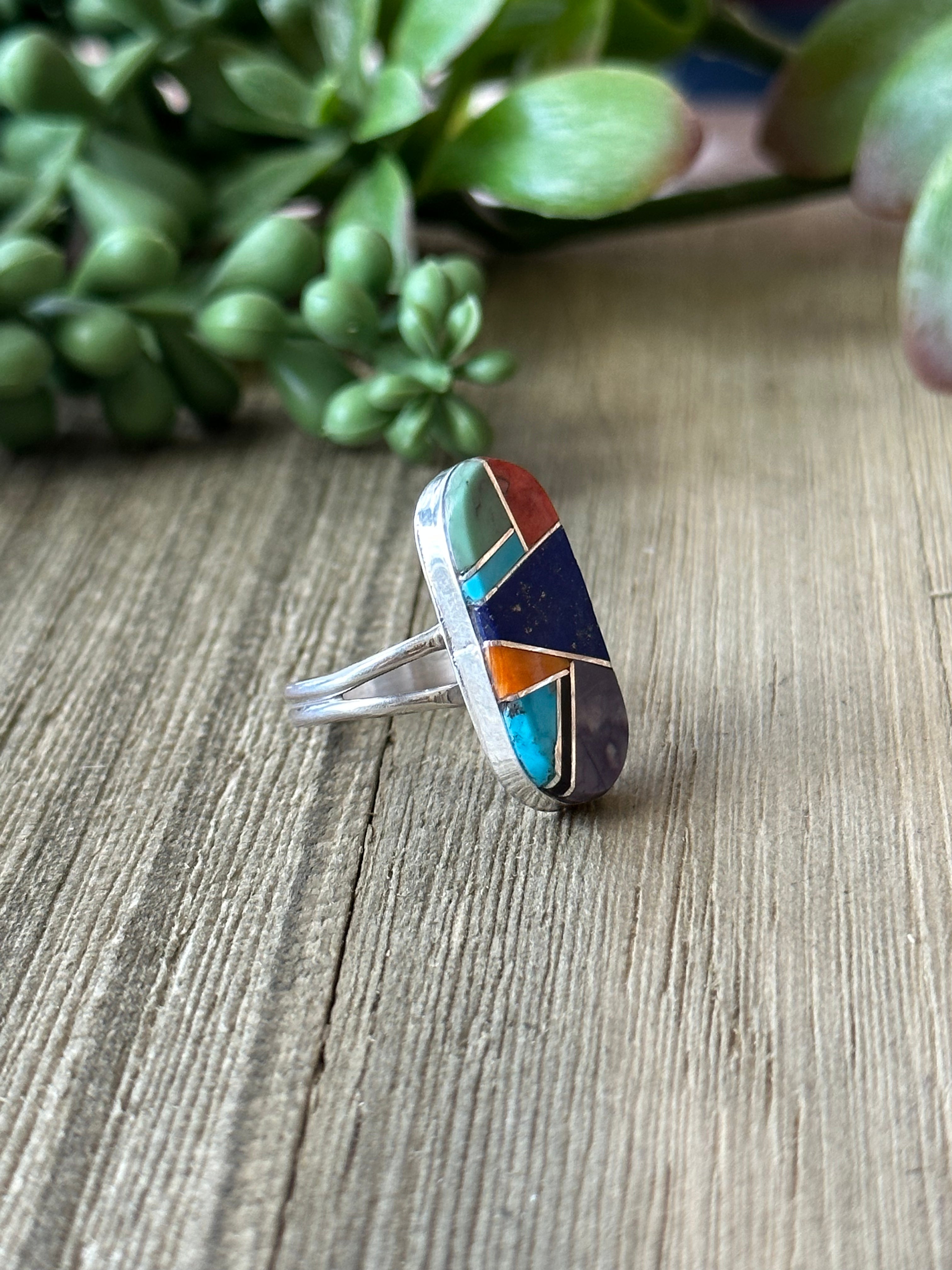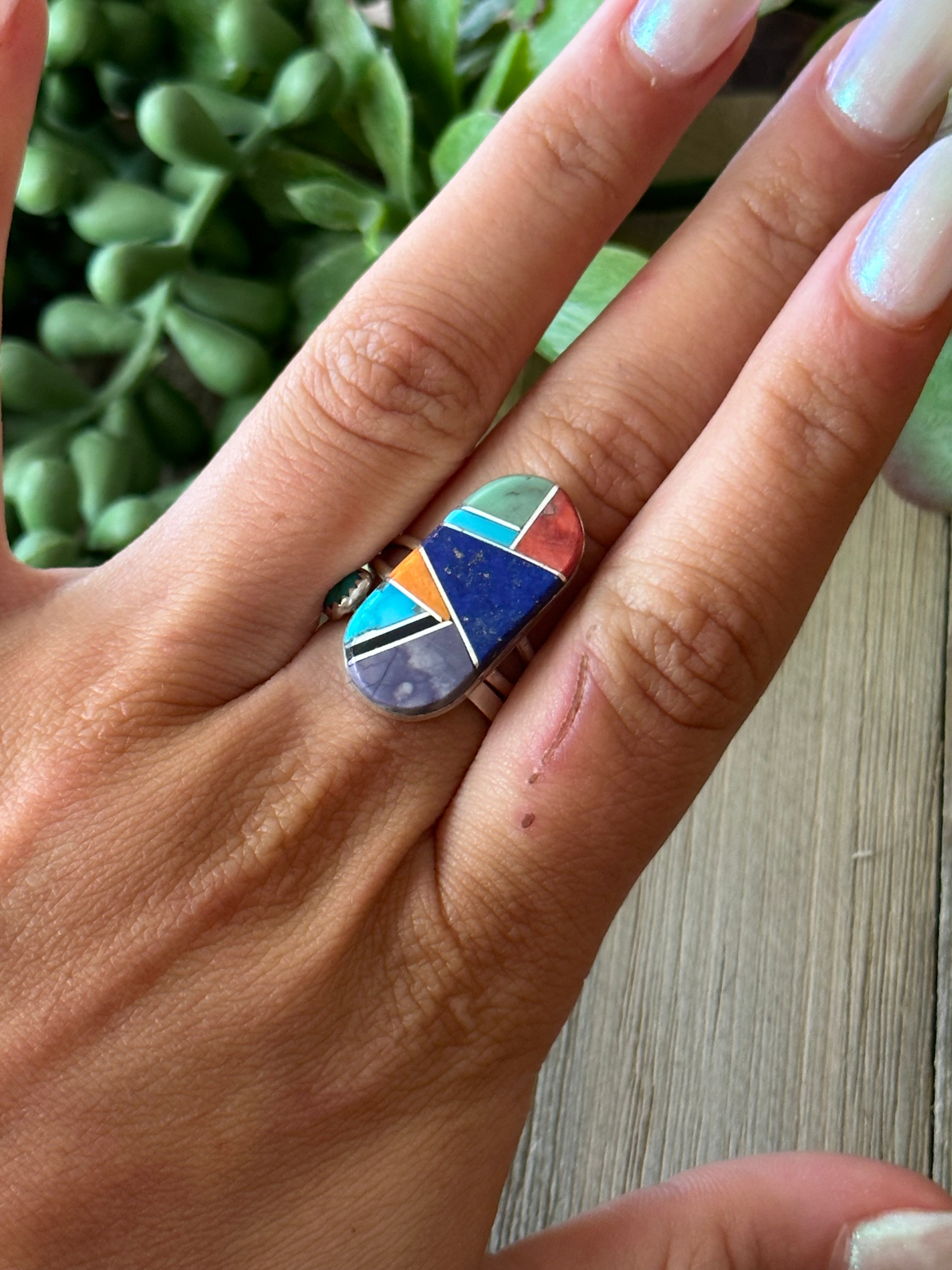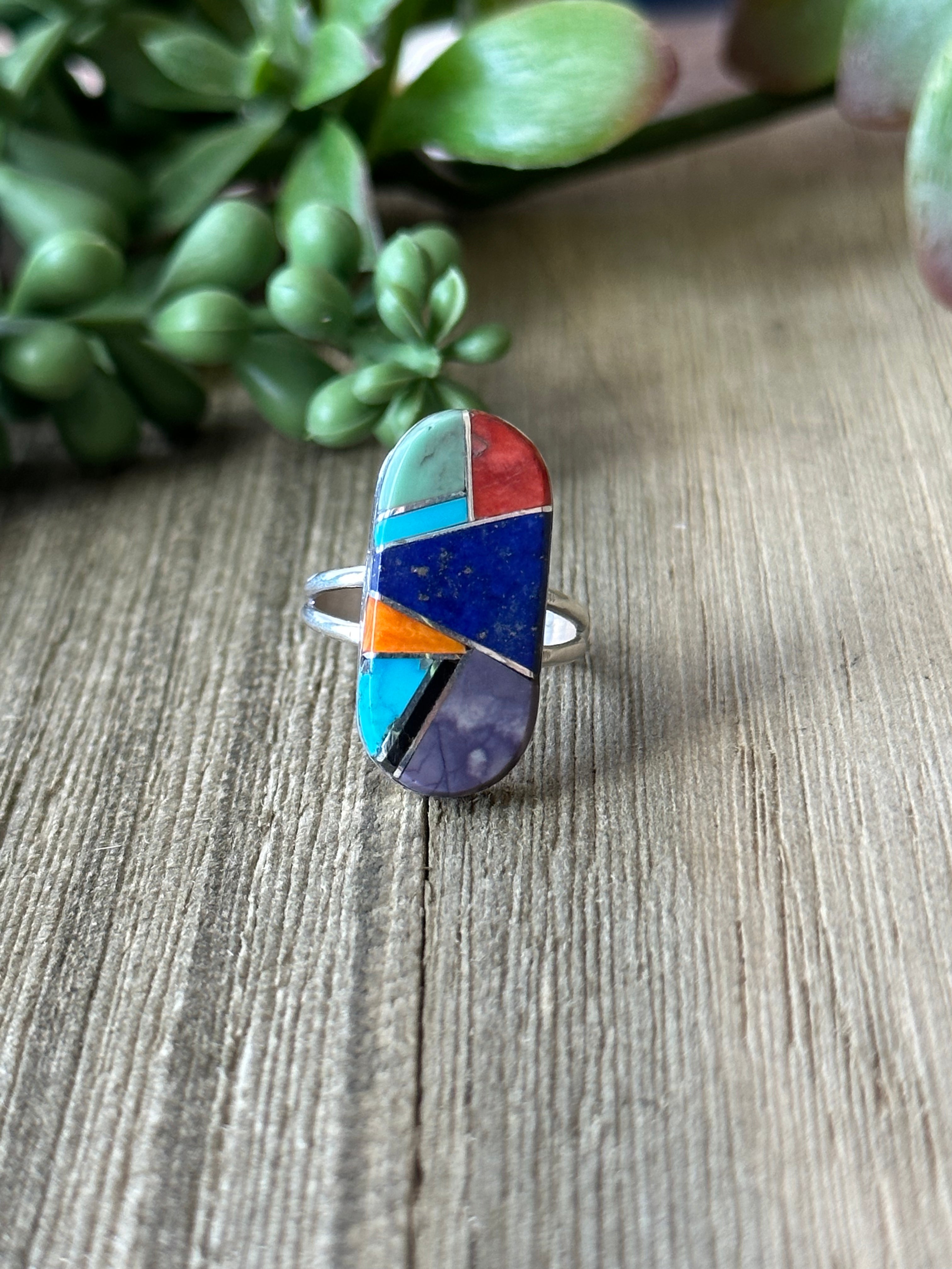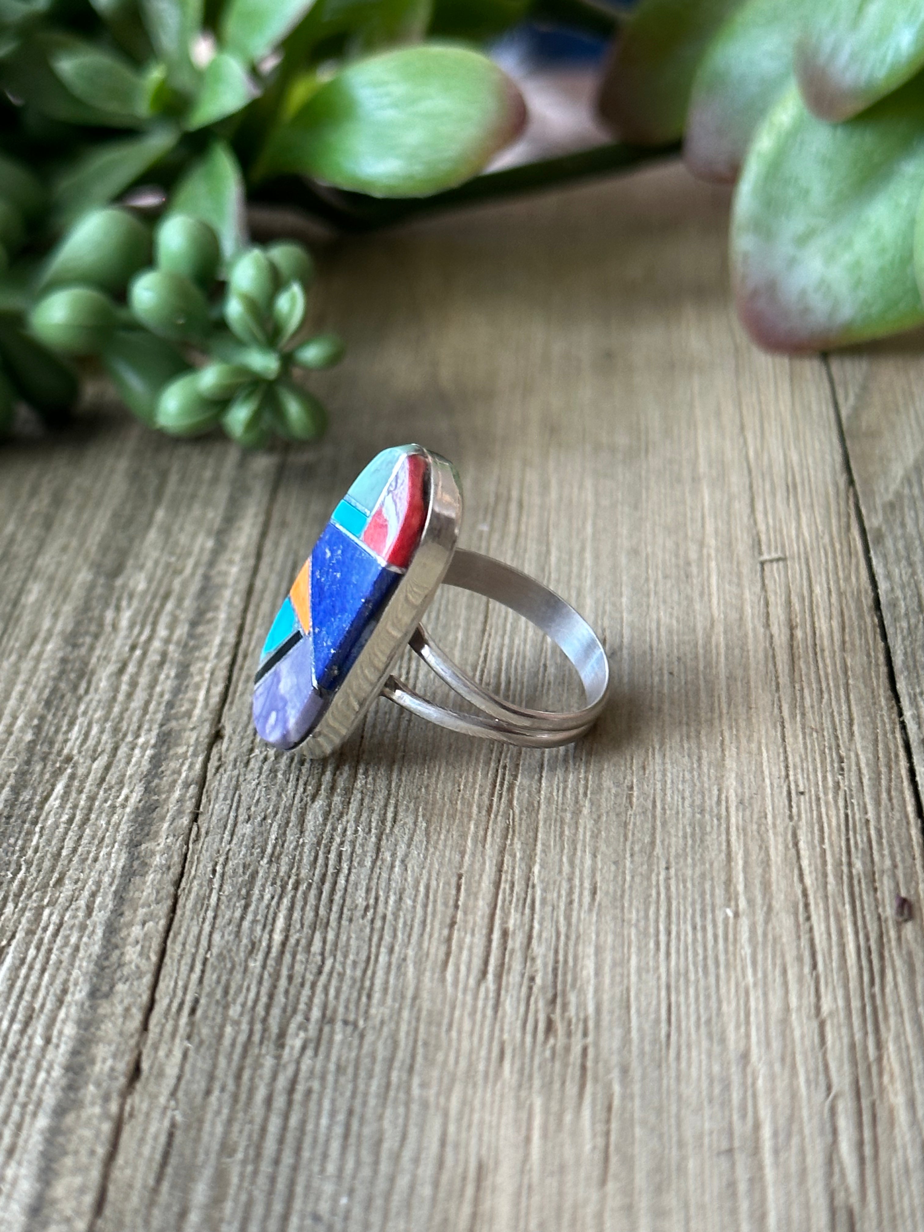 Navajo Made Multi Stone & Sterling Silver Inlay Ring Size 7.25