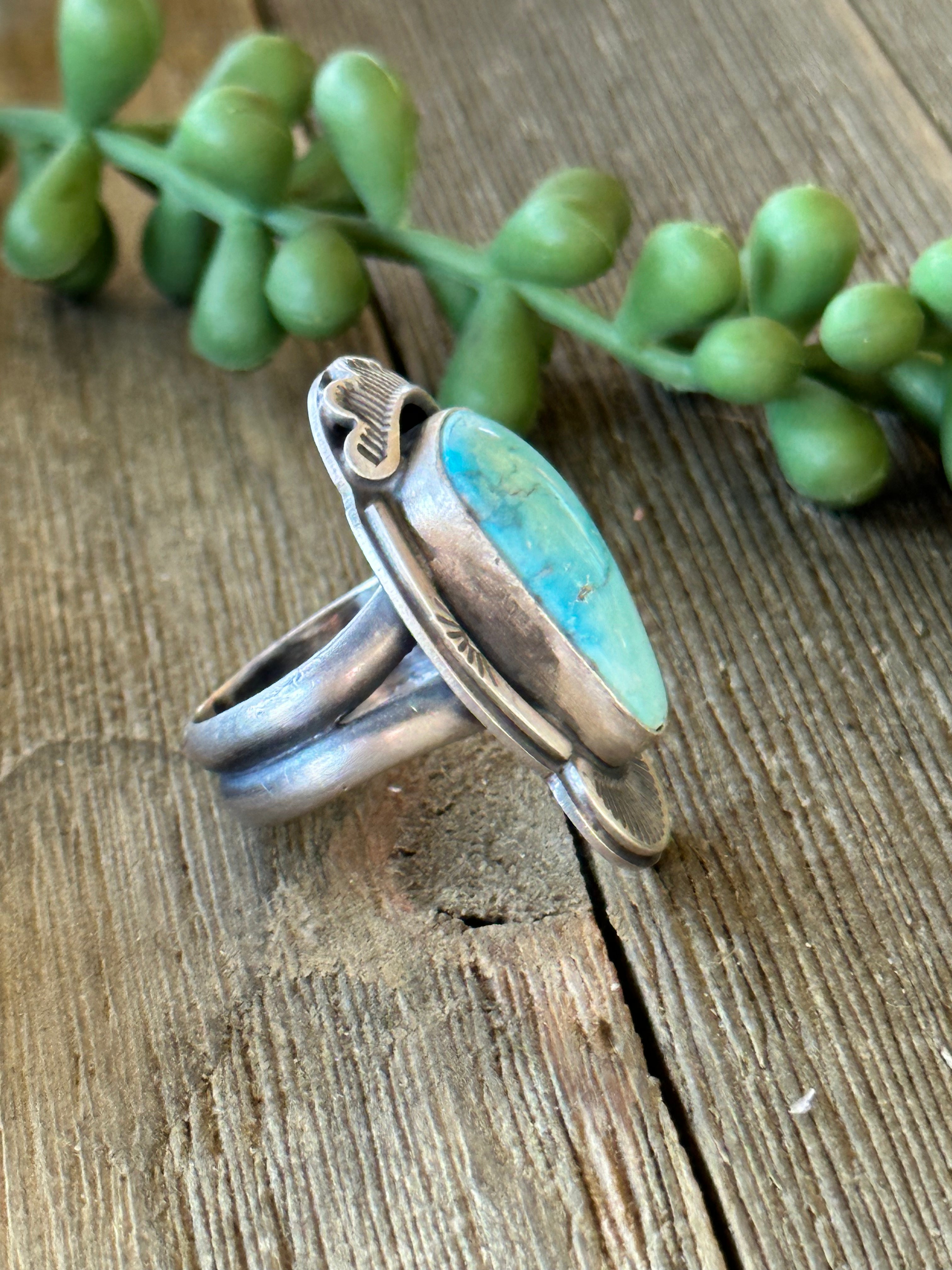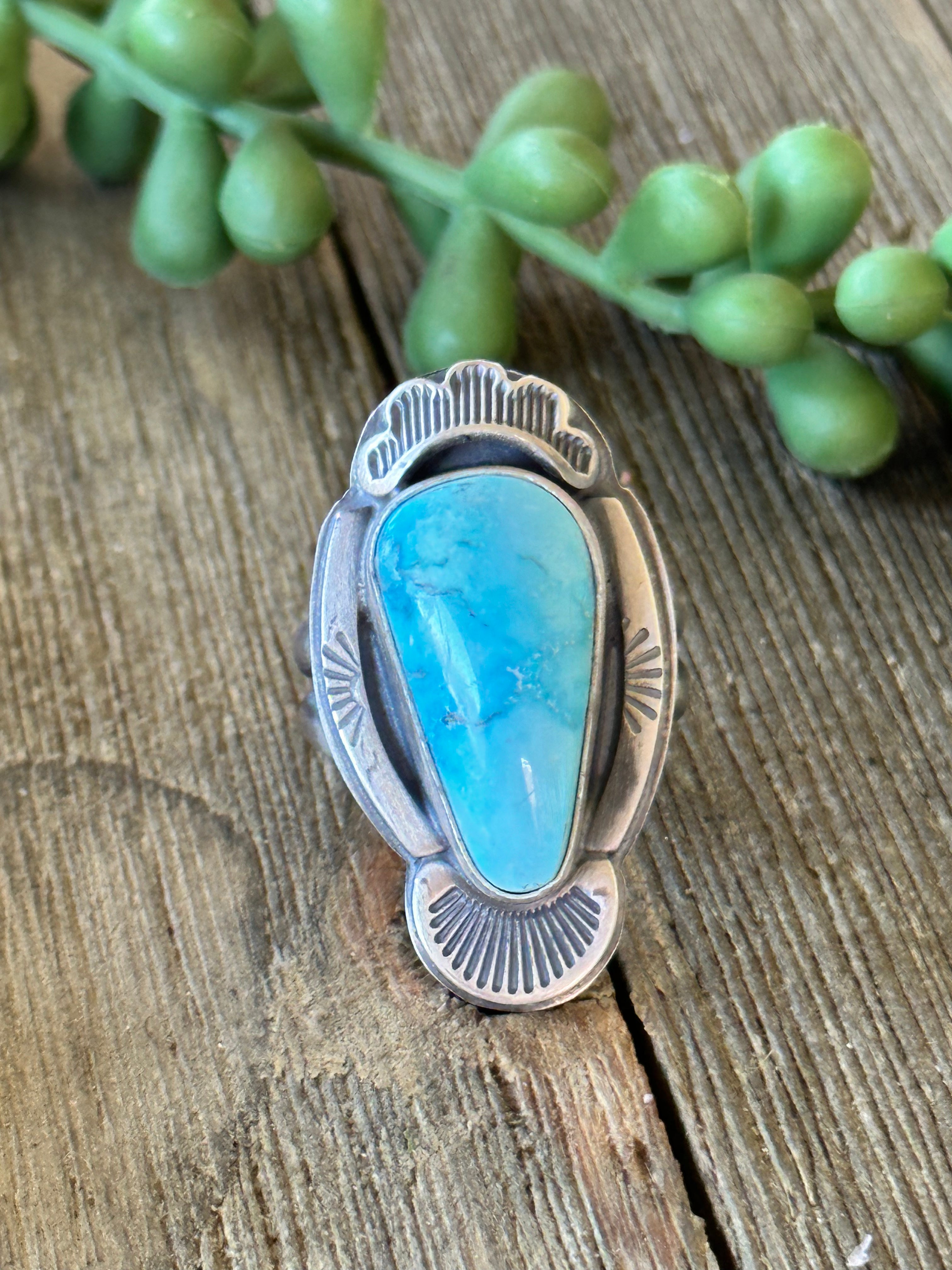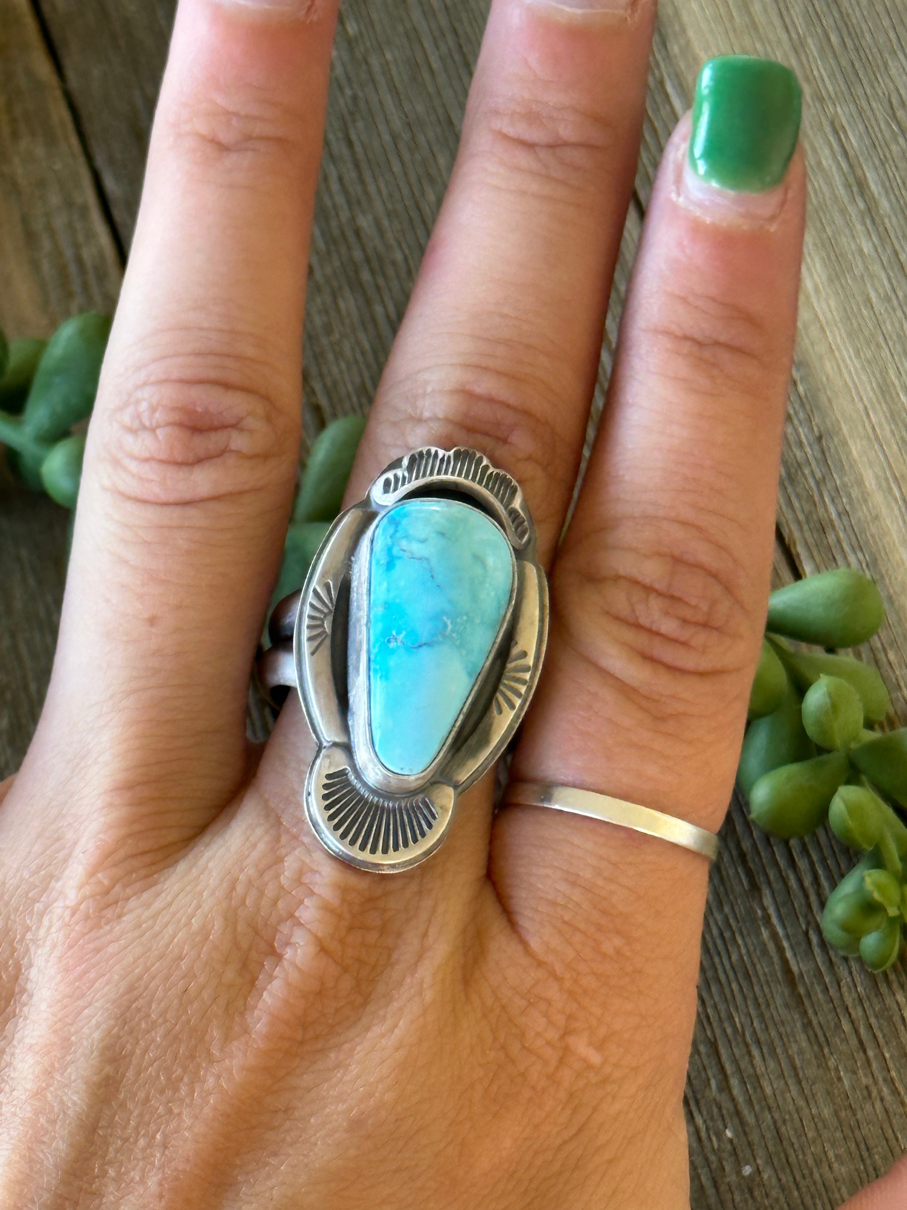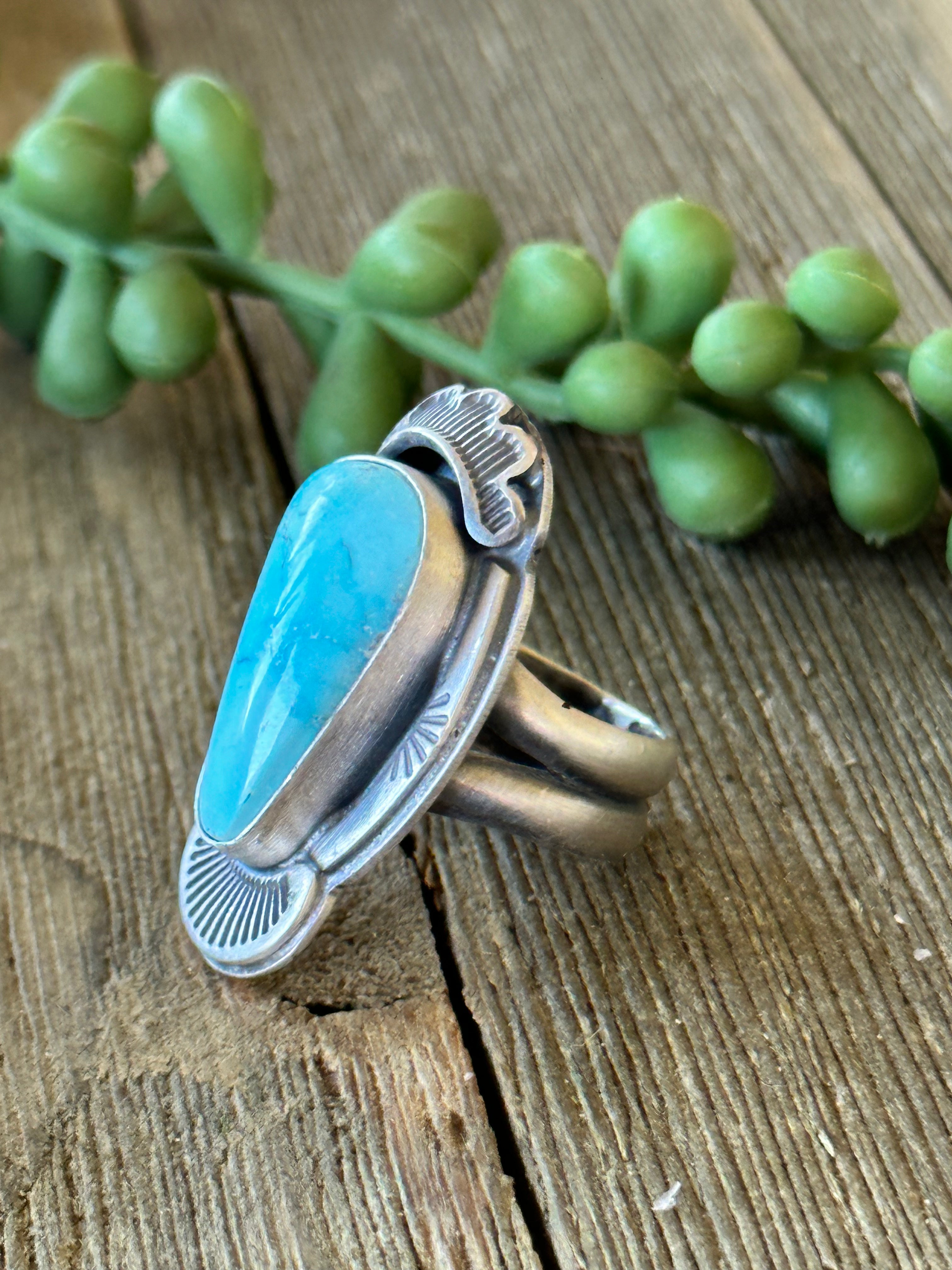 Tony Yazzie Blue Gem Turquoise & Sterling Silver Ring Size 8.5