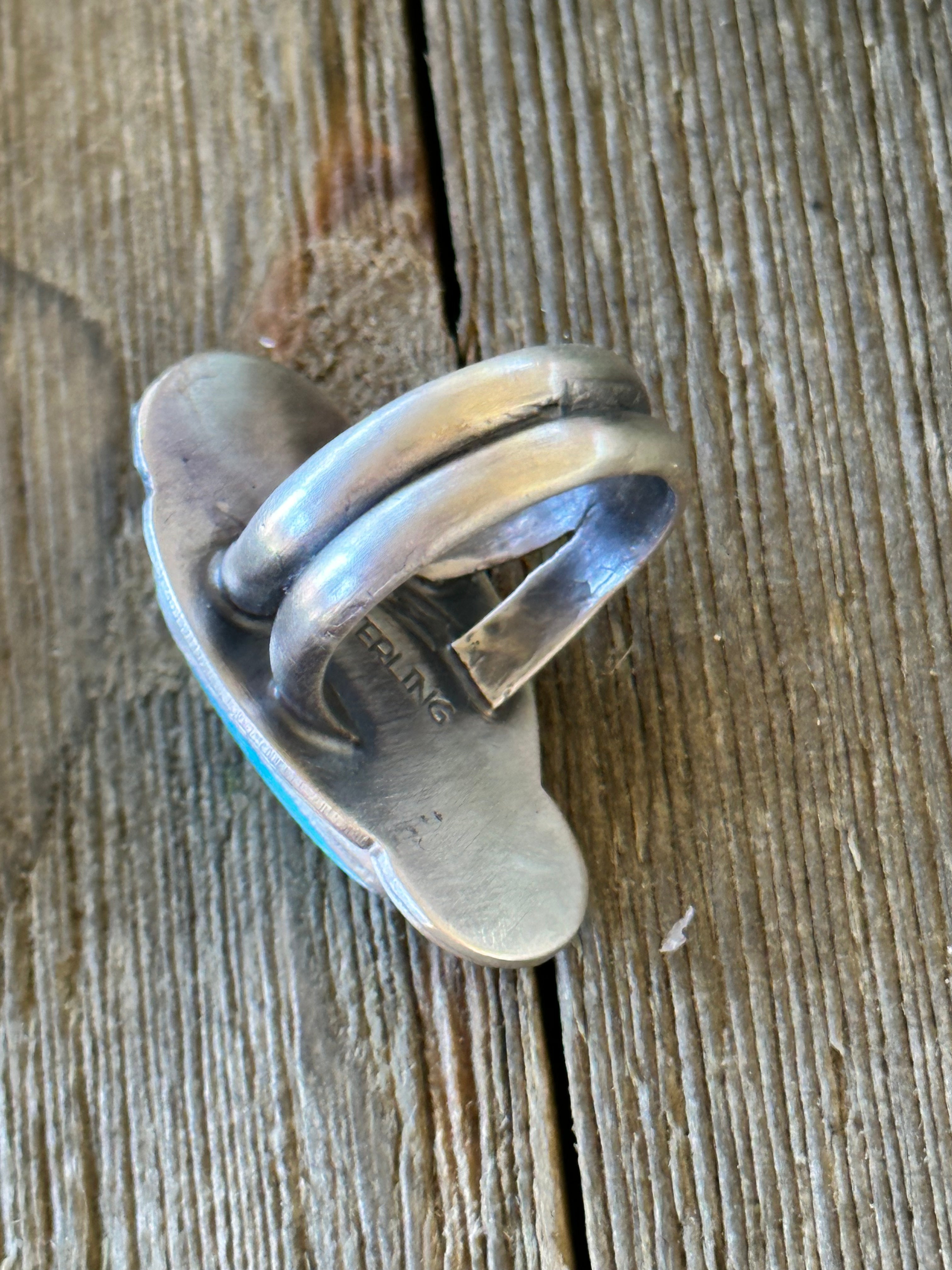 A beautiful Ring. Tony Yazzie Blue Gem Turquoise & Sterling Silver Ring Size 8.5. It measures 1 1/2 inches long and 3/4 of an inch wide. Signed by the artist and stamped sterling silver.