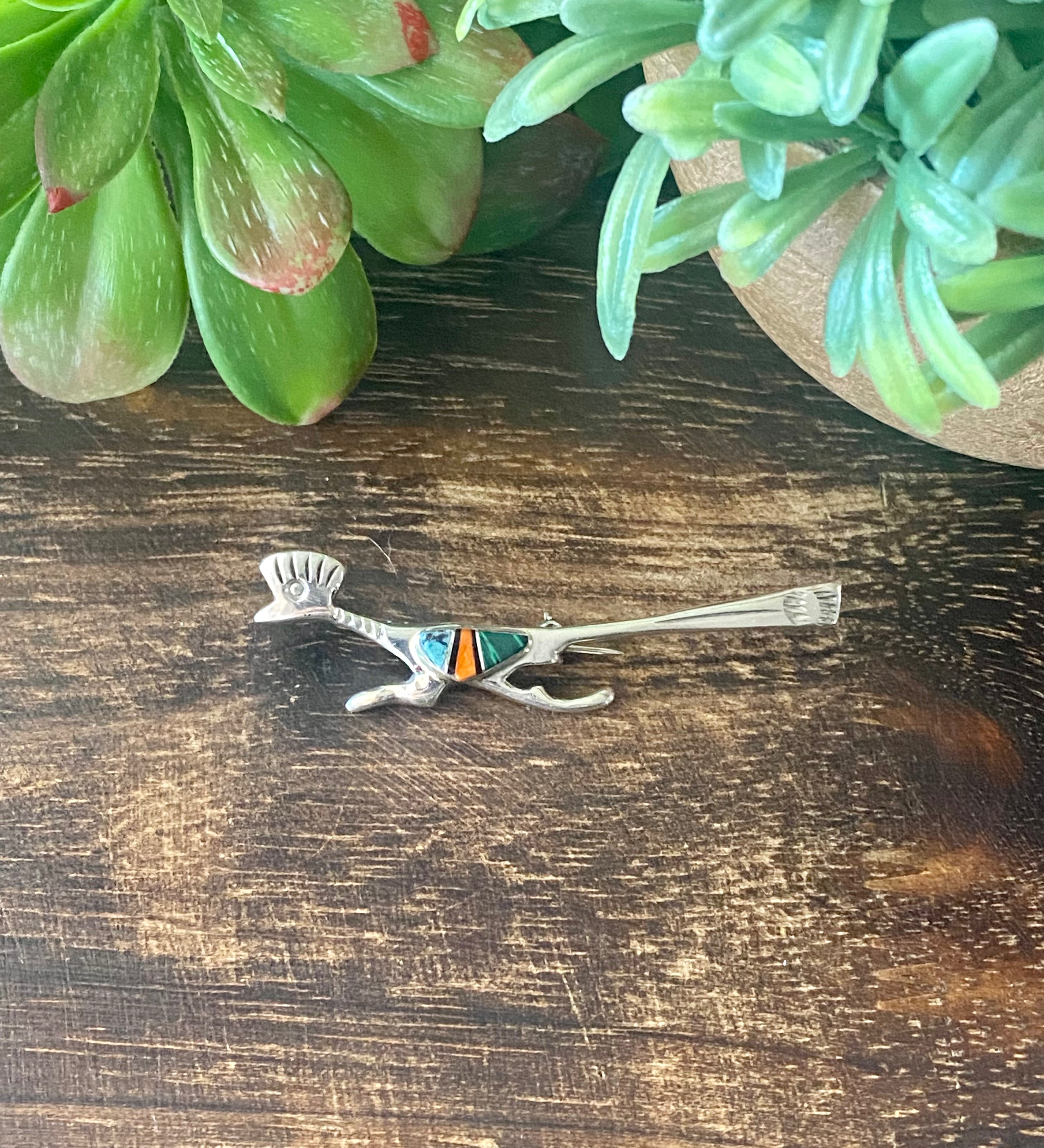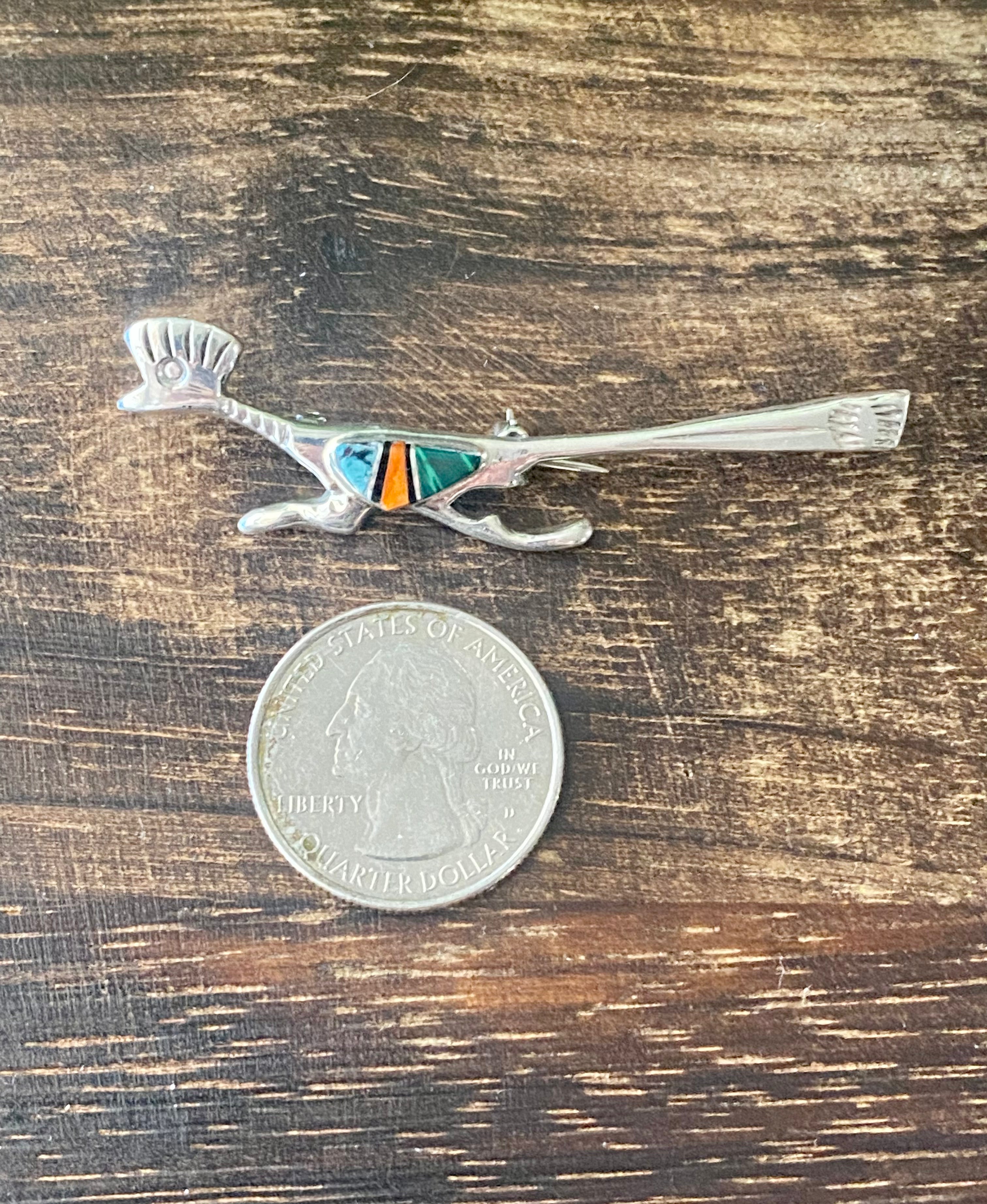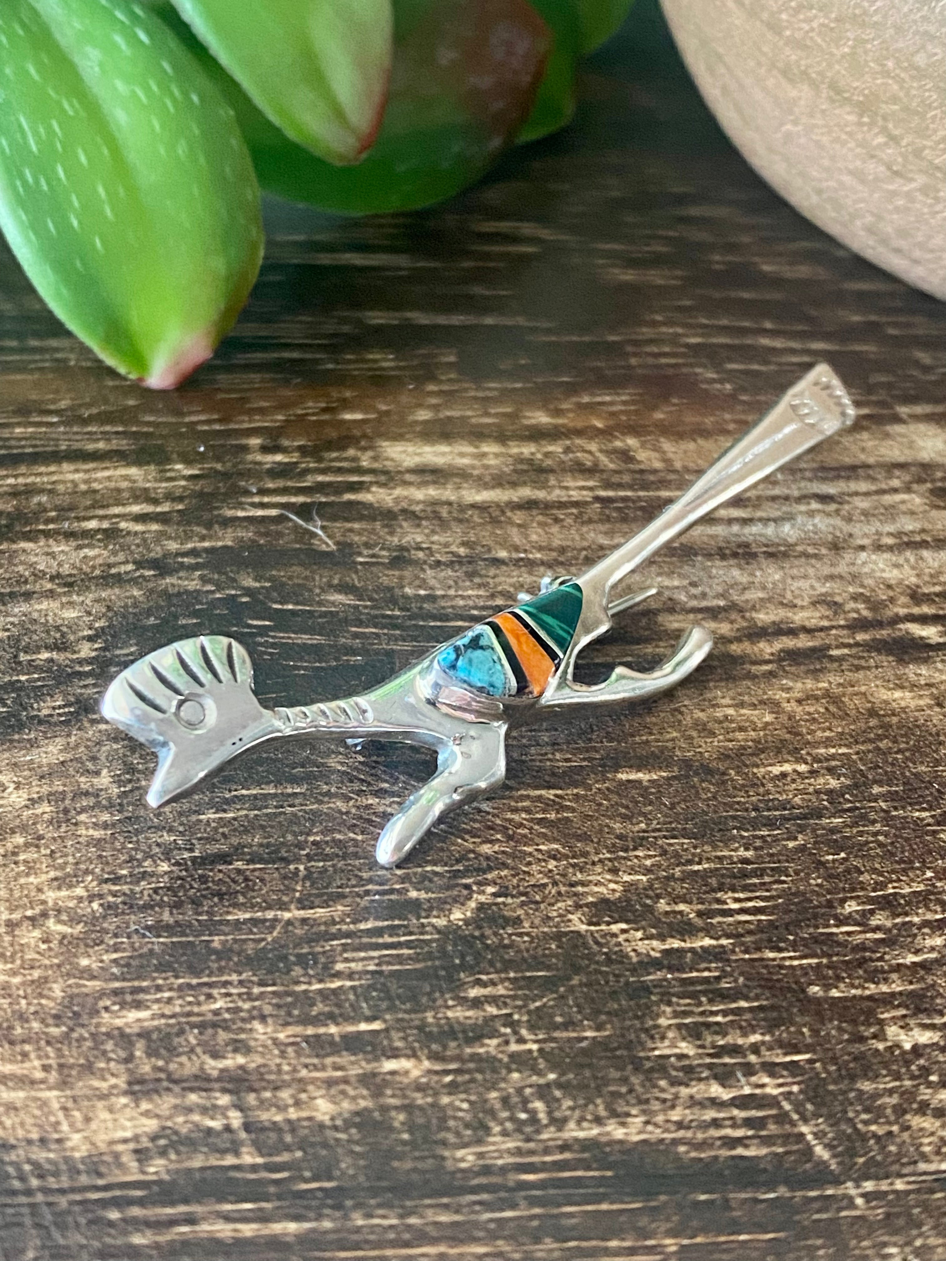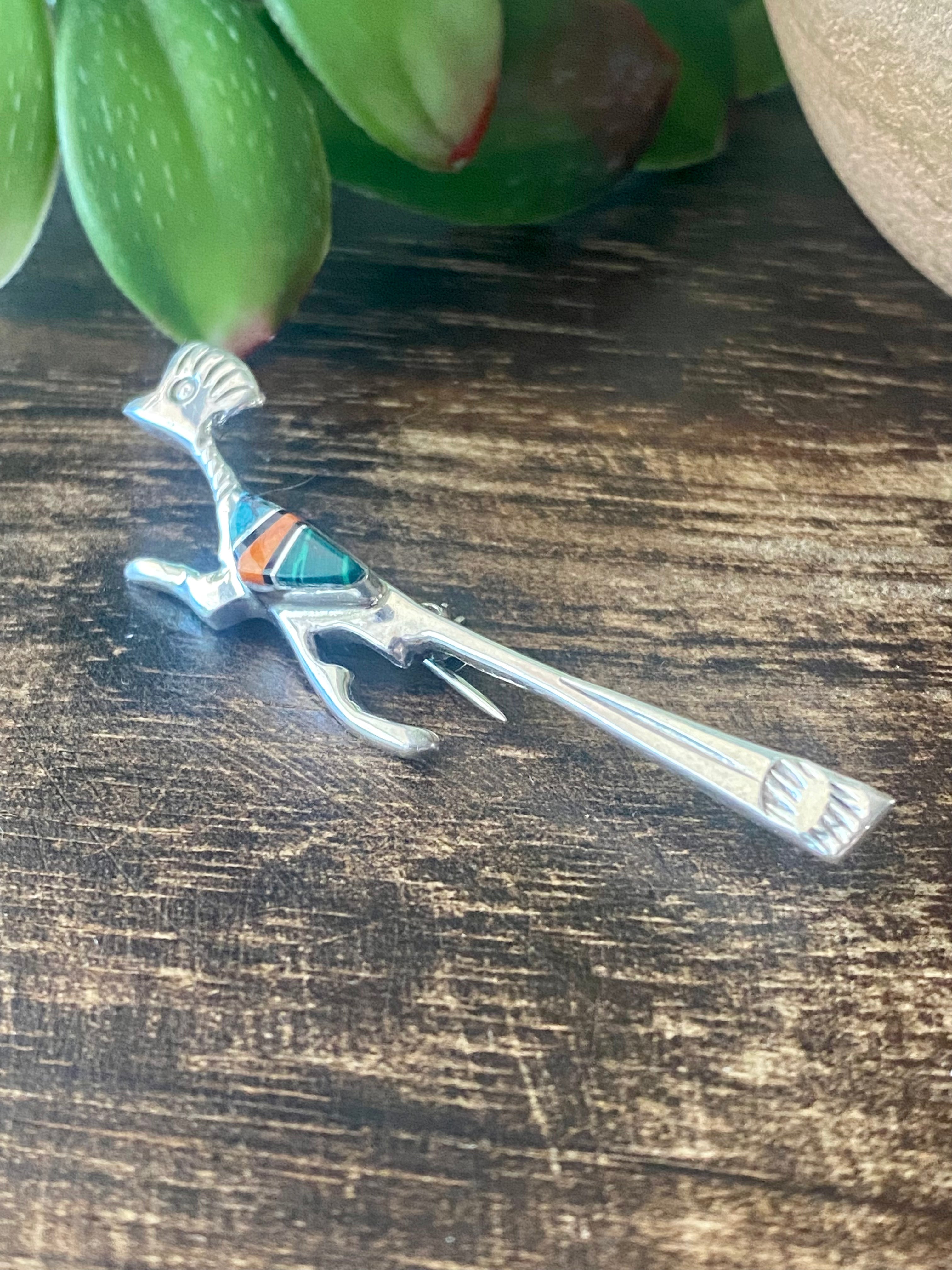 Navajo Made Multi Stone & Sterling Silver Inlay Roadrunner Pin