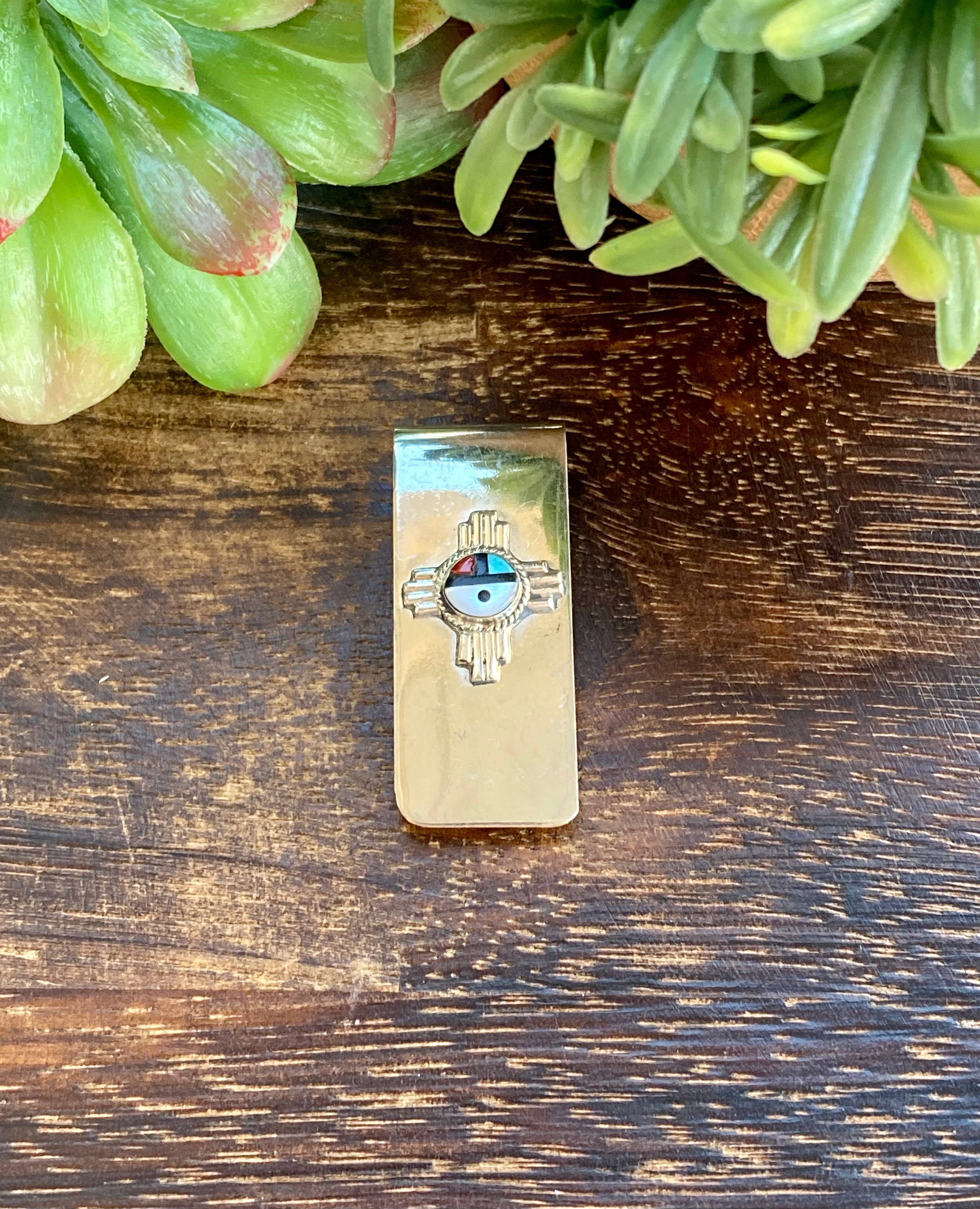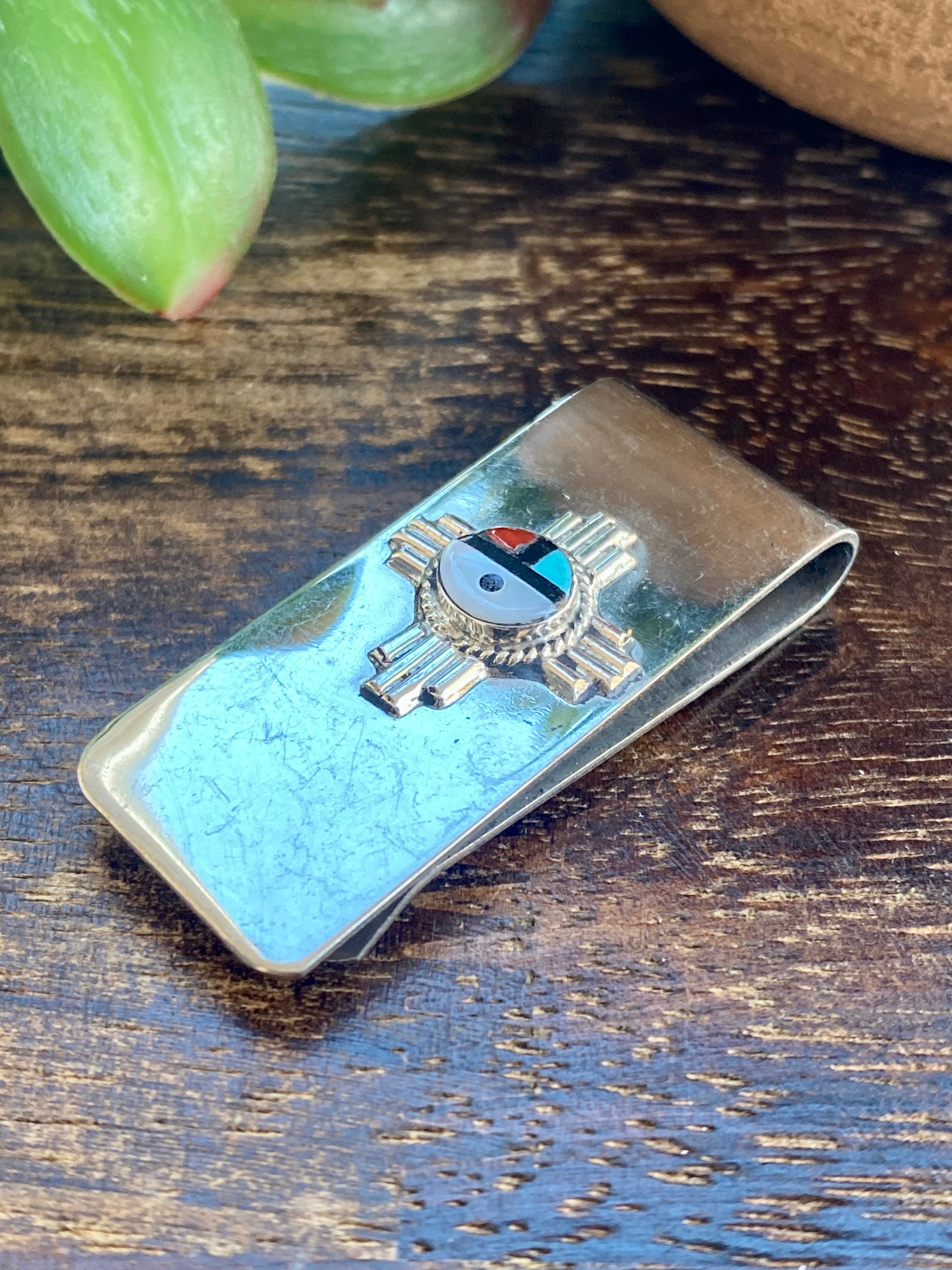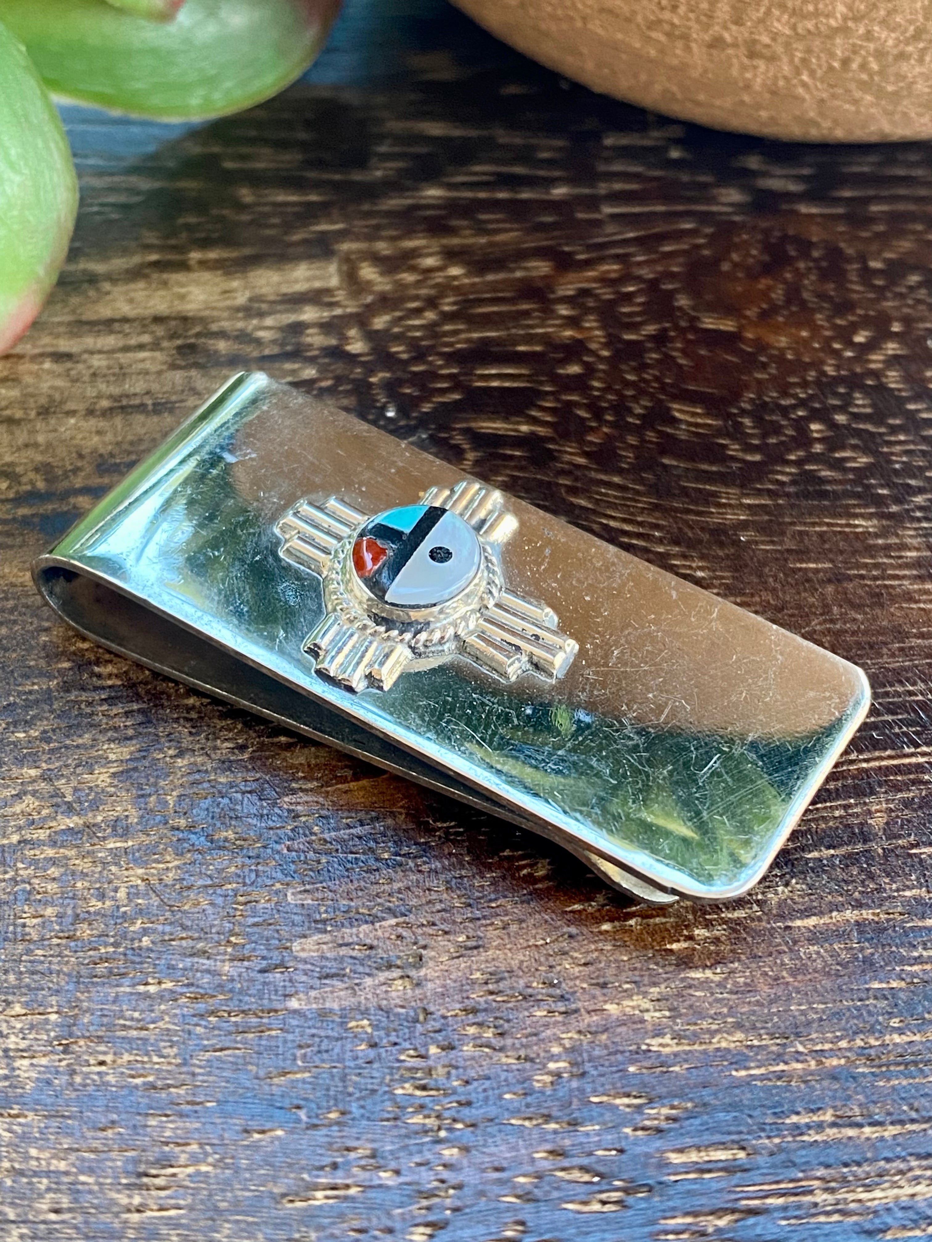 Navajo Made Multi Stone & Sterling Silver Inlay Sunface Zia MoneyClip